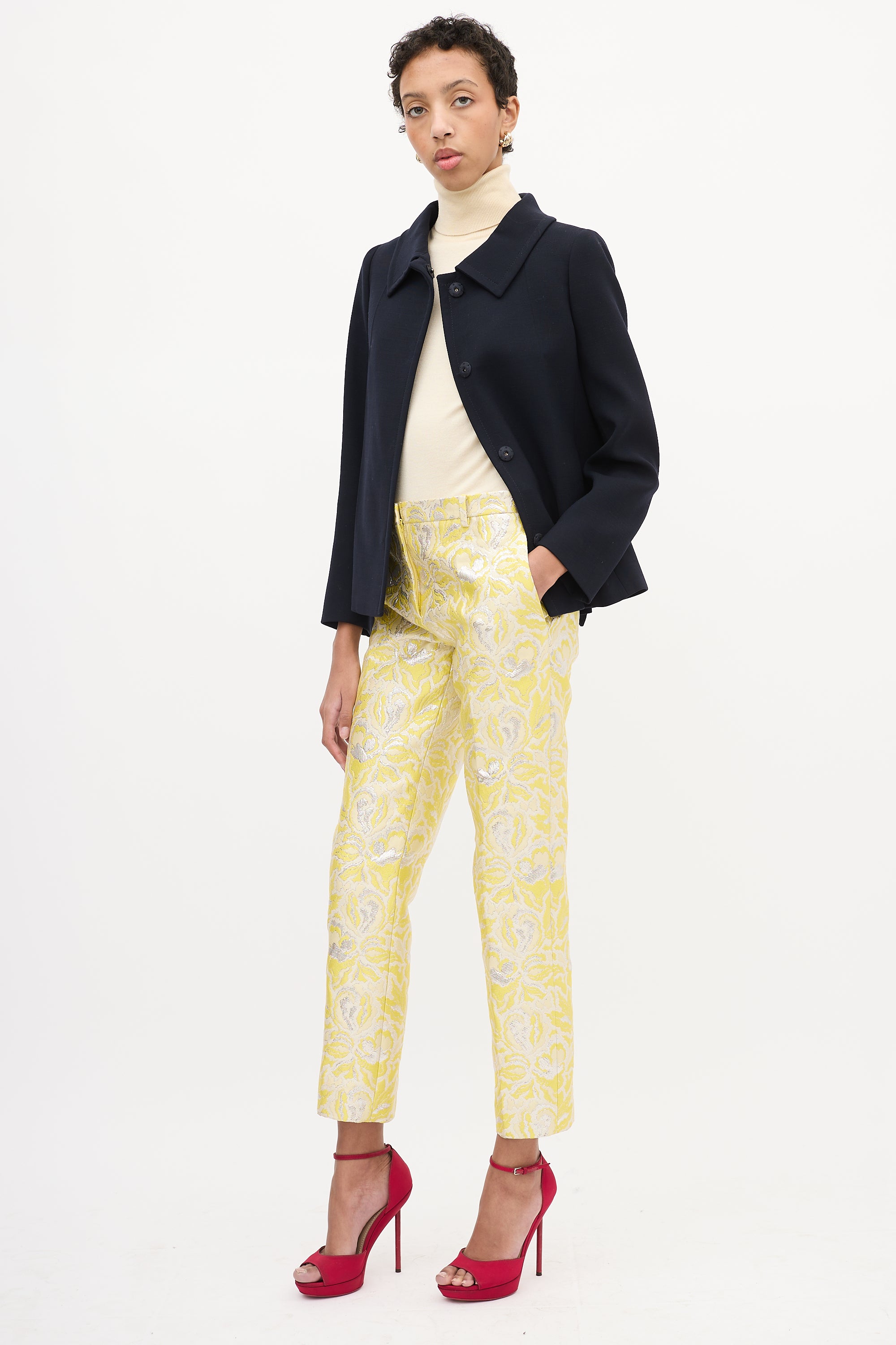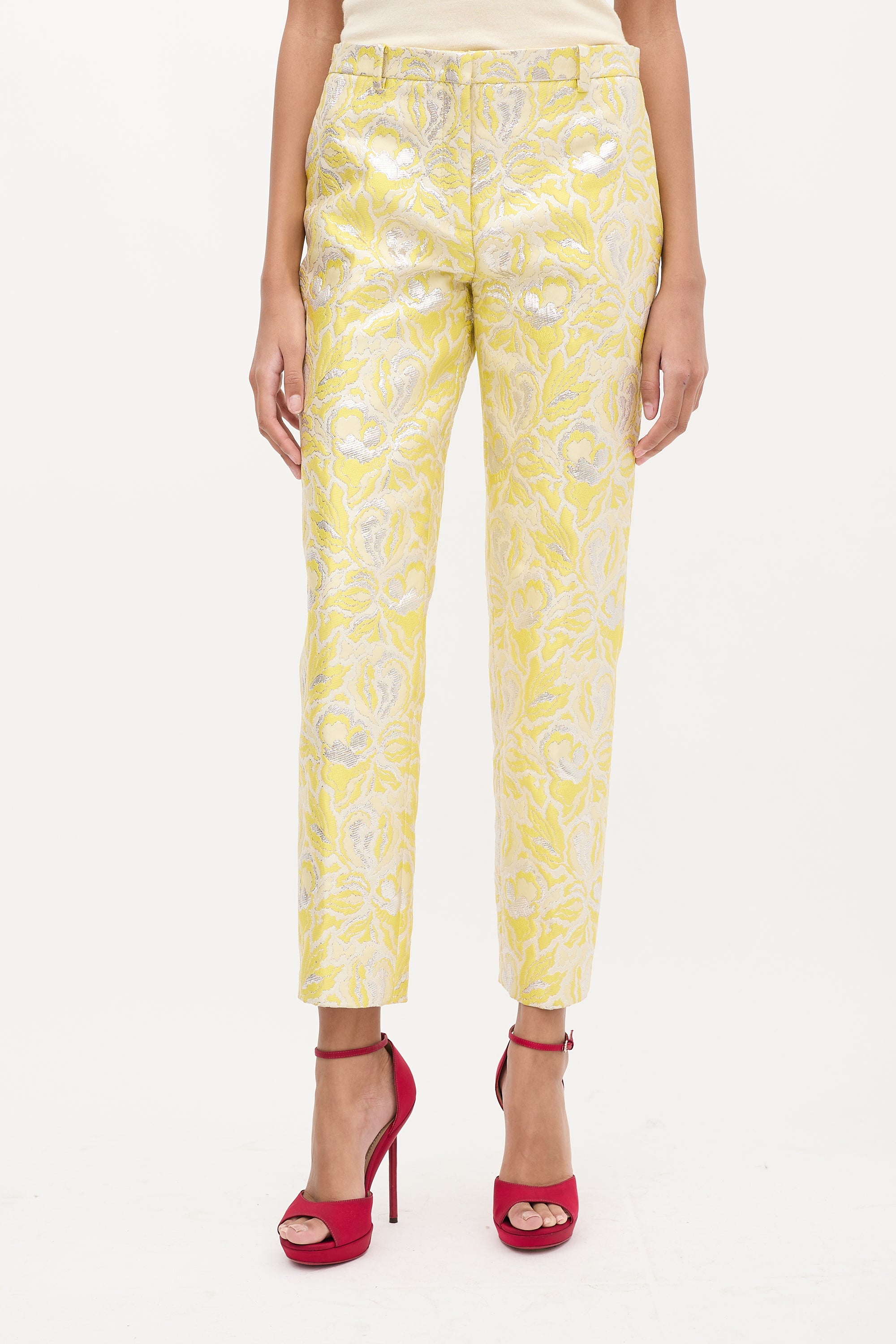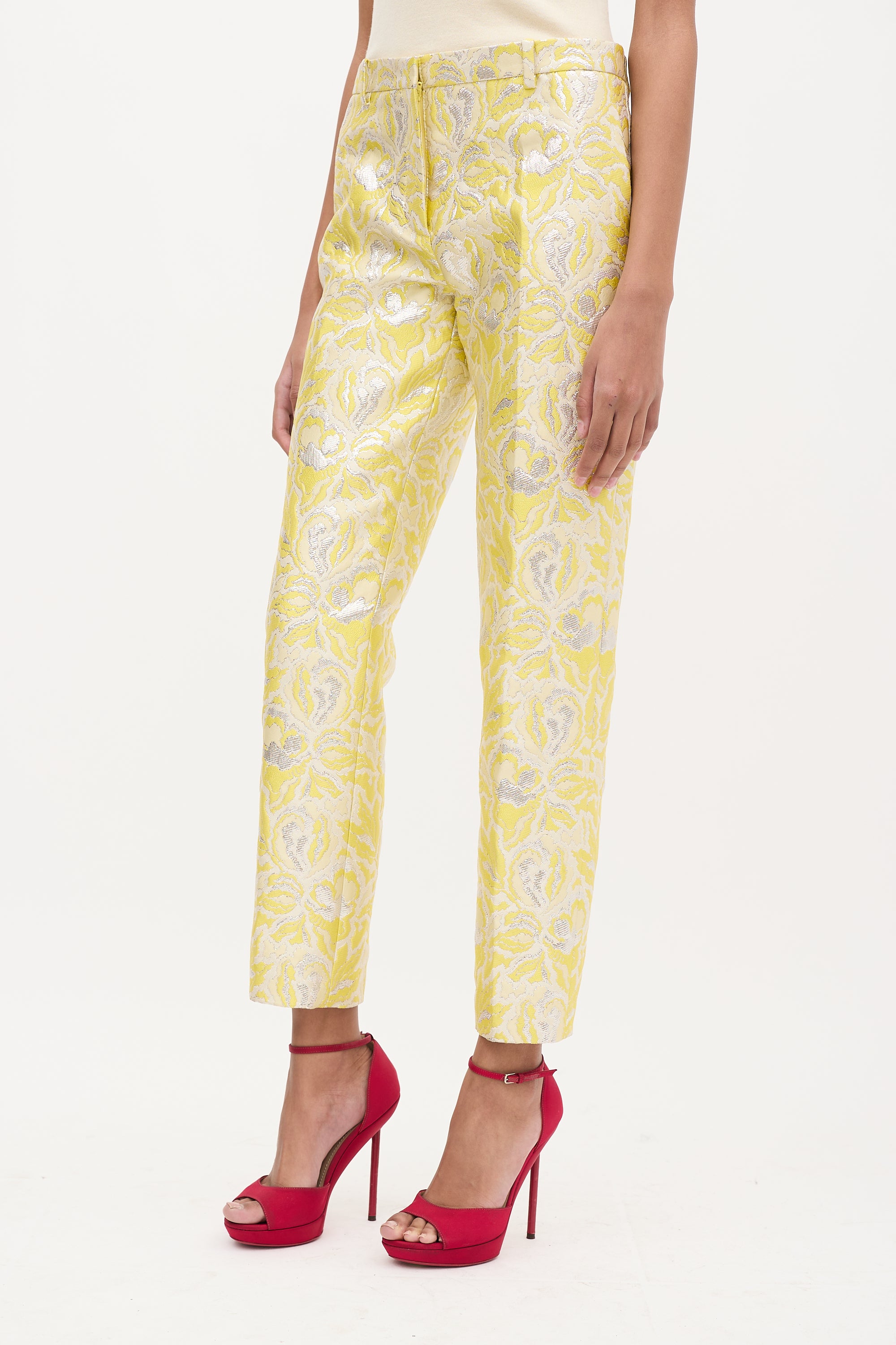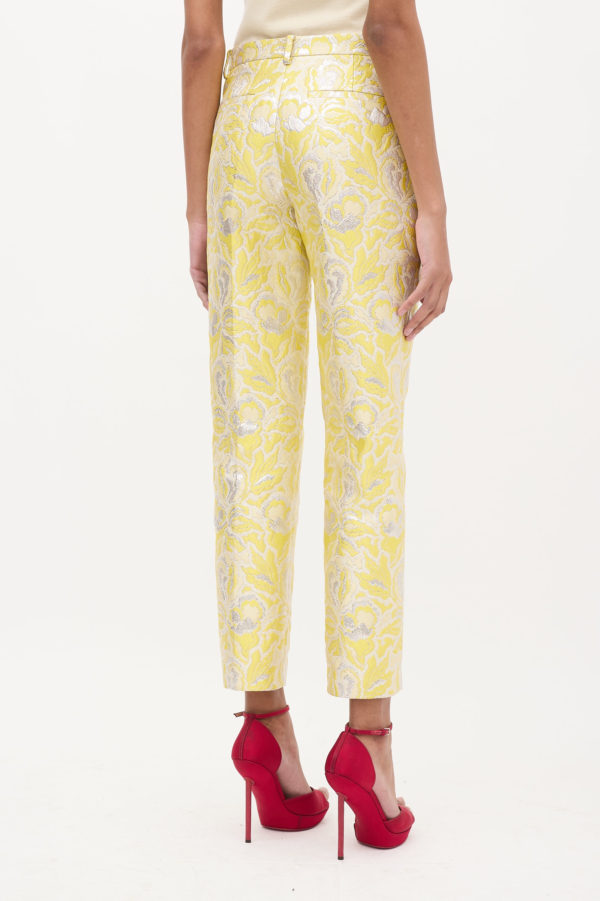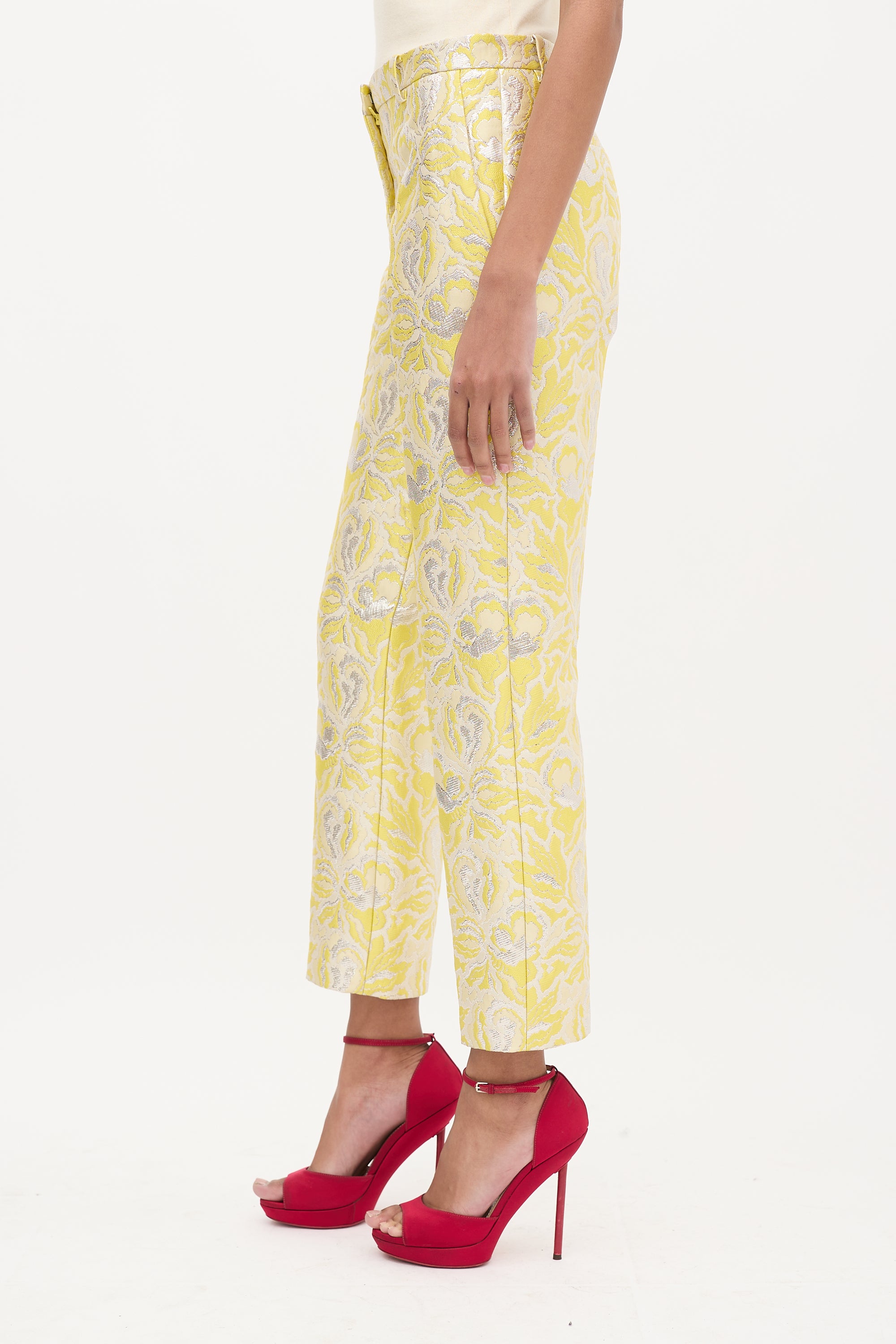Pre-owned Valentino yellow and silver tone trousers featuring a high waist, tapered leg with creases, four pocket waist styling, zip fly, and floral jacquard with silver tone metallic threading throughout. Lined.