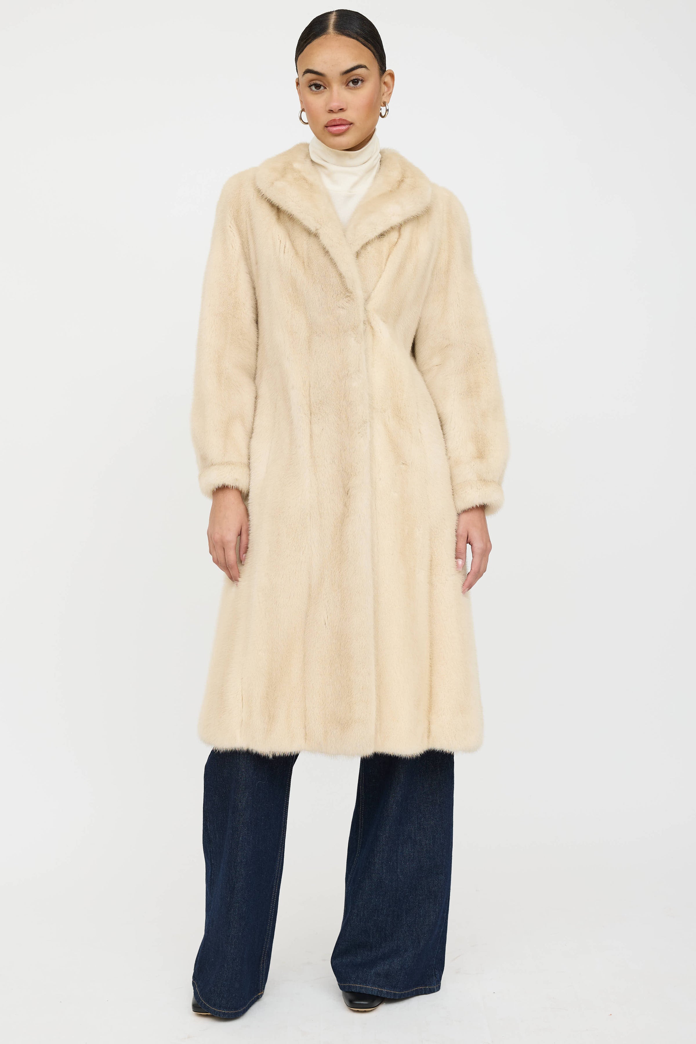 Pre-owned Charlebois cream mink fur coat featuring a pointed collar, long sleeves, two slip pockets at hip, and hook and eye closure. Lined.