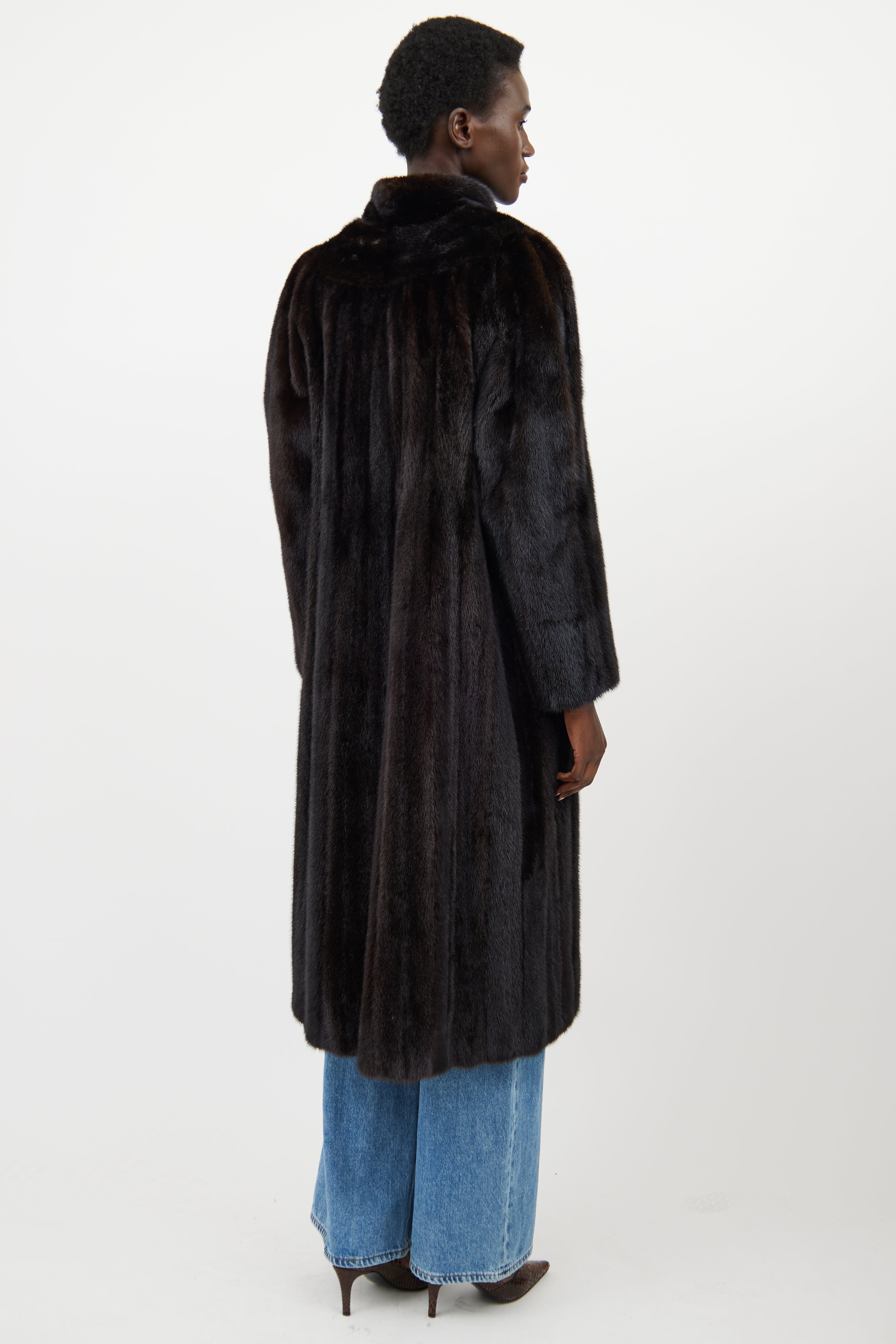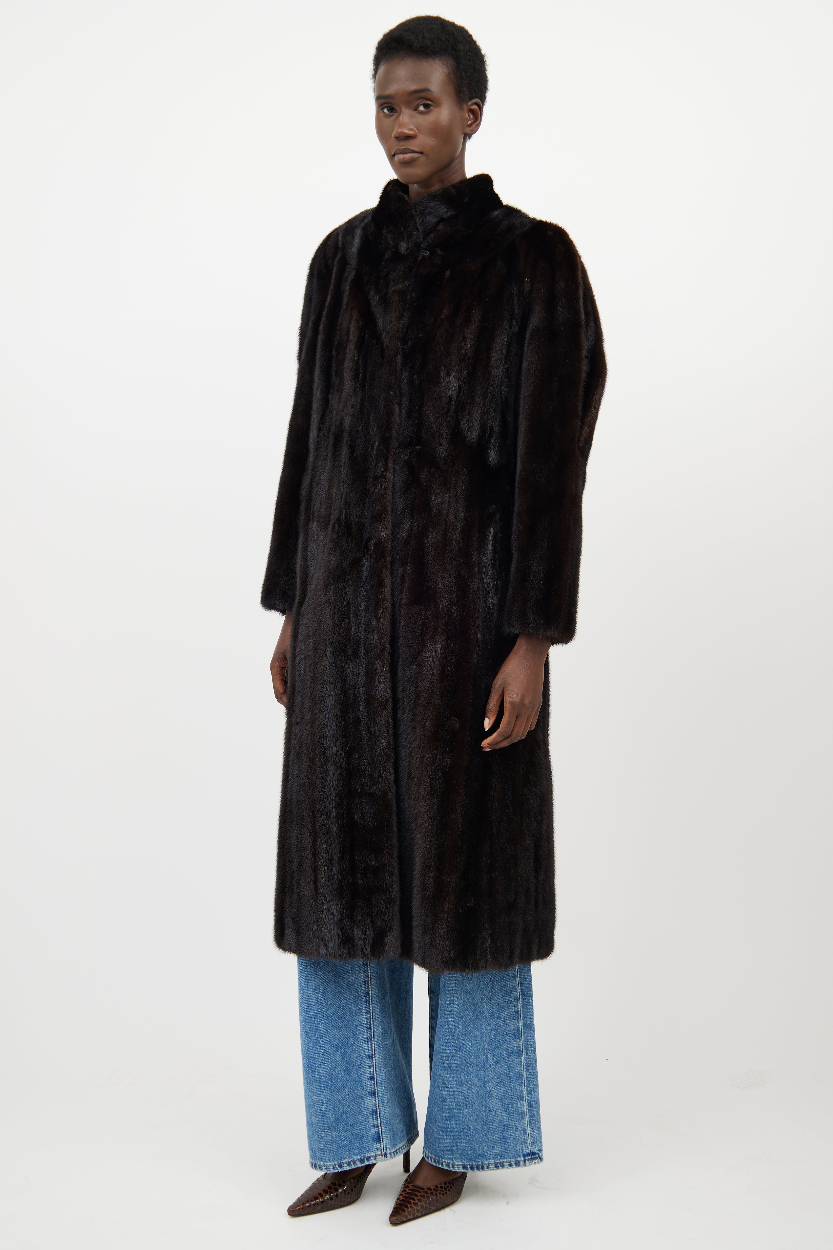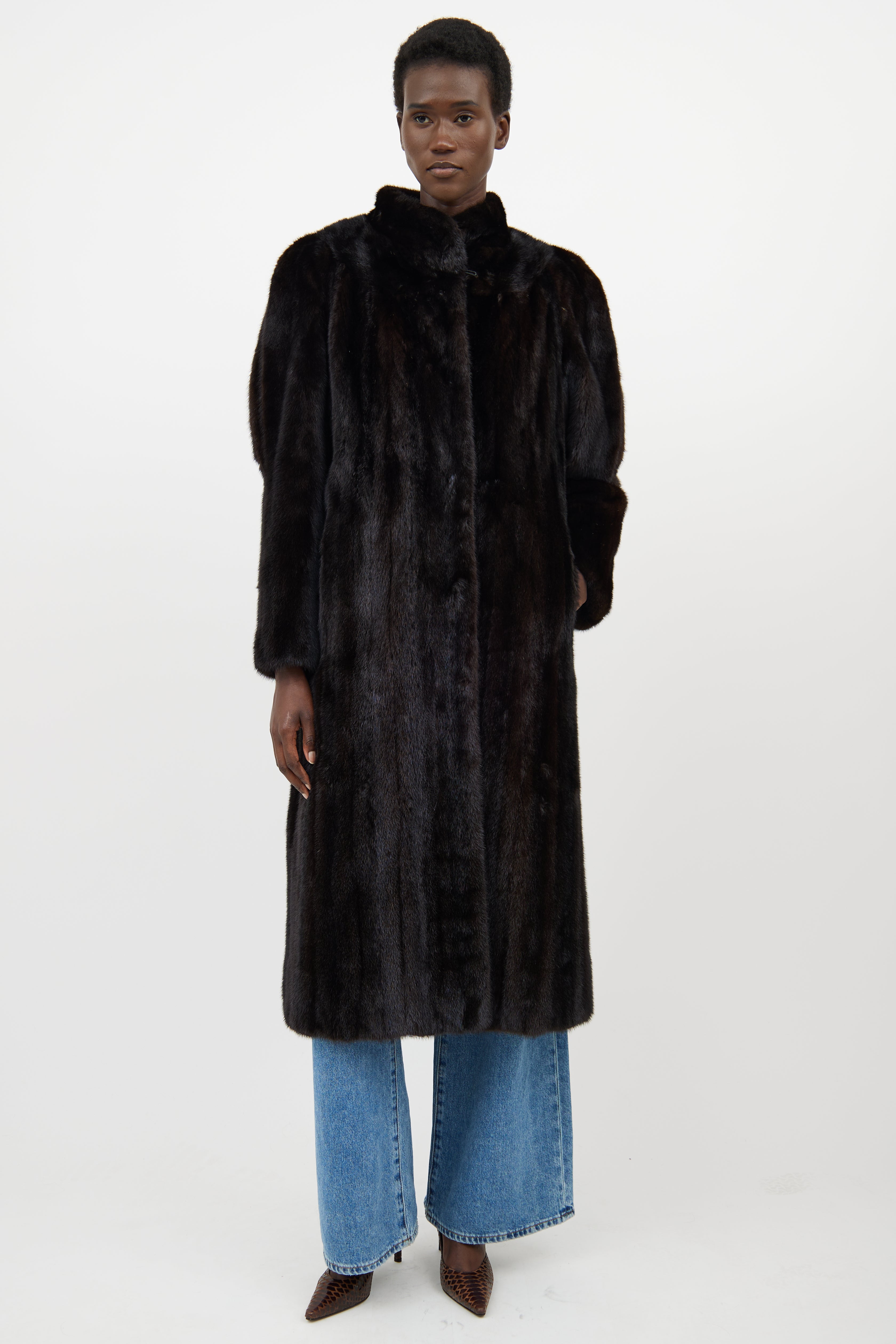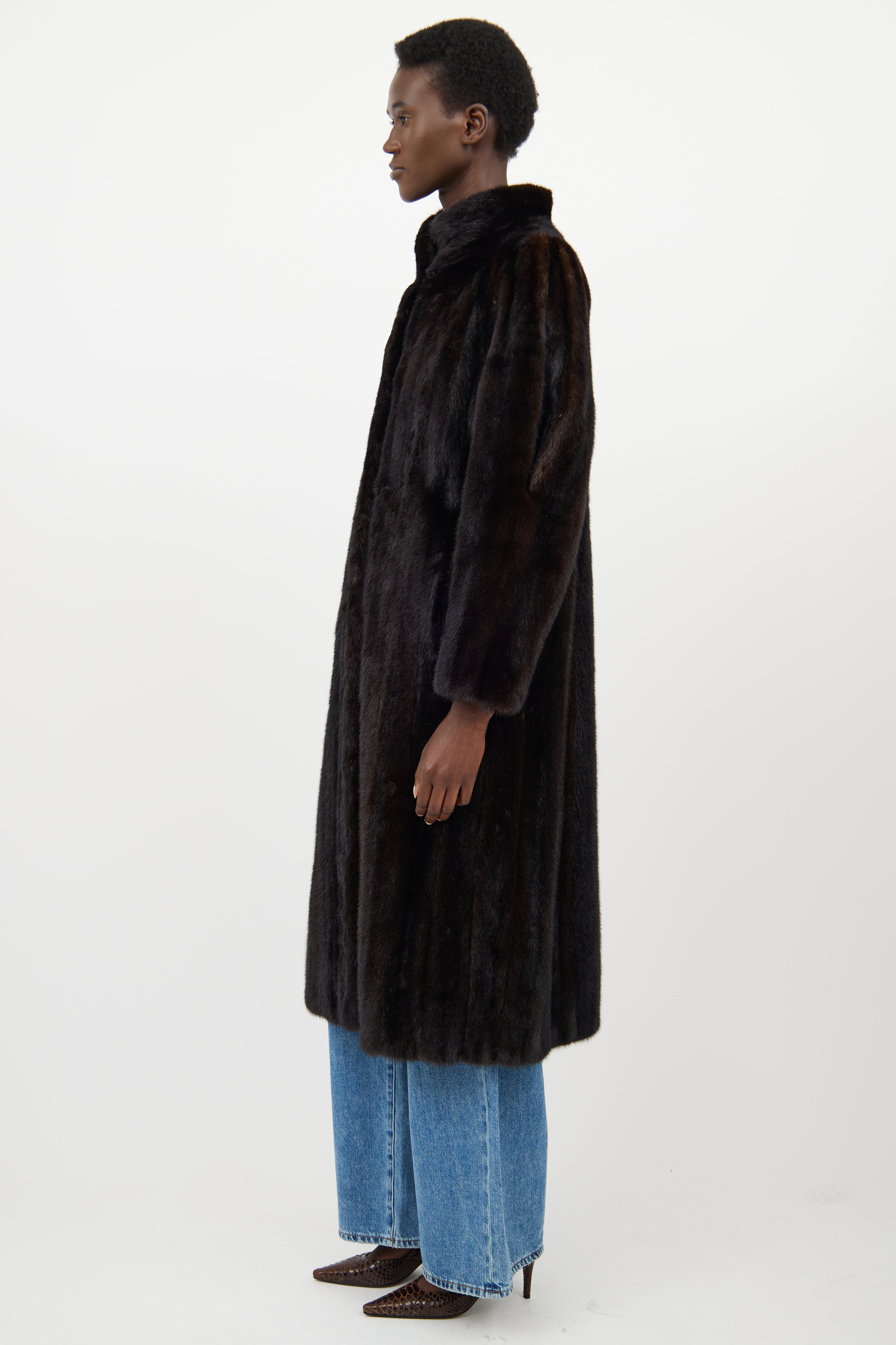 Pre-owned Furs by Michel dark brown mink fur coat featuring a spread collar, long sleeves, two slip pockets at hip, paneled seams, and hook and eye closure. Lined.