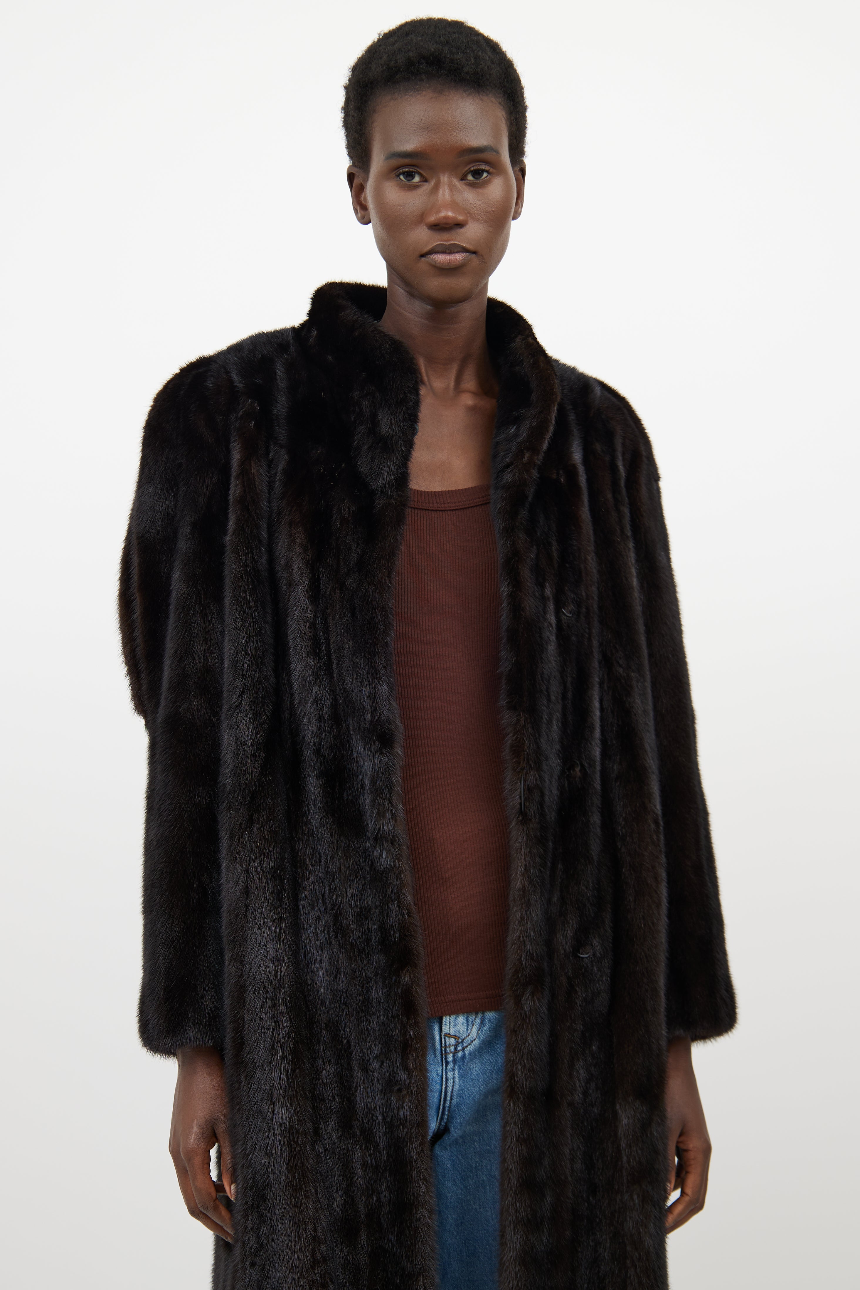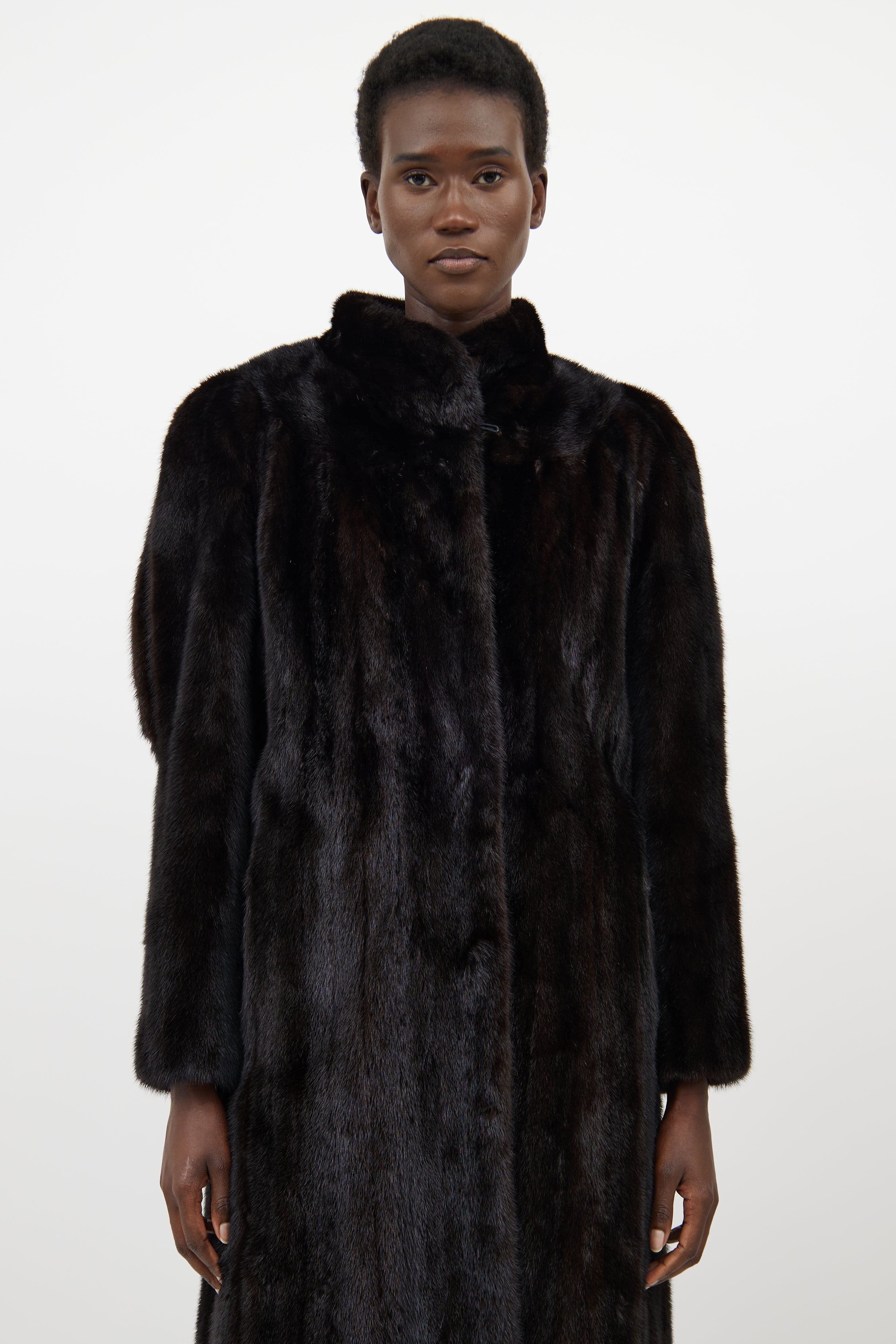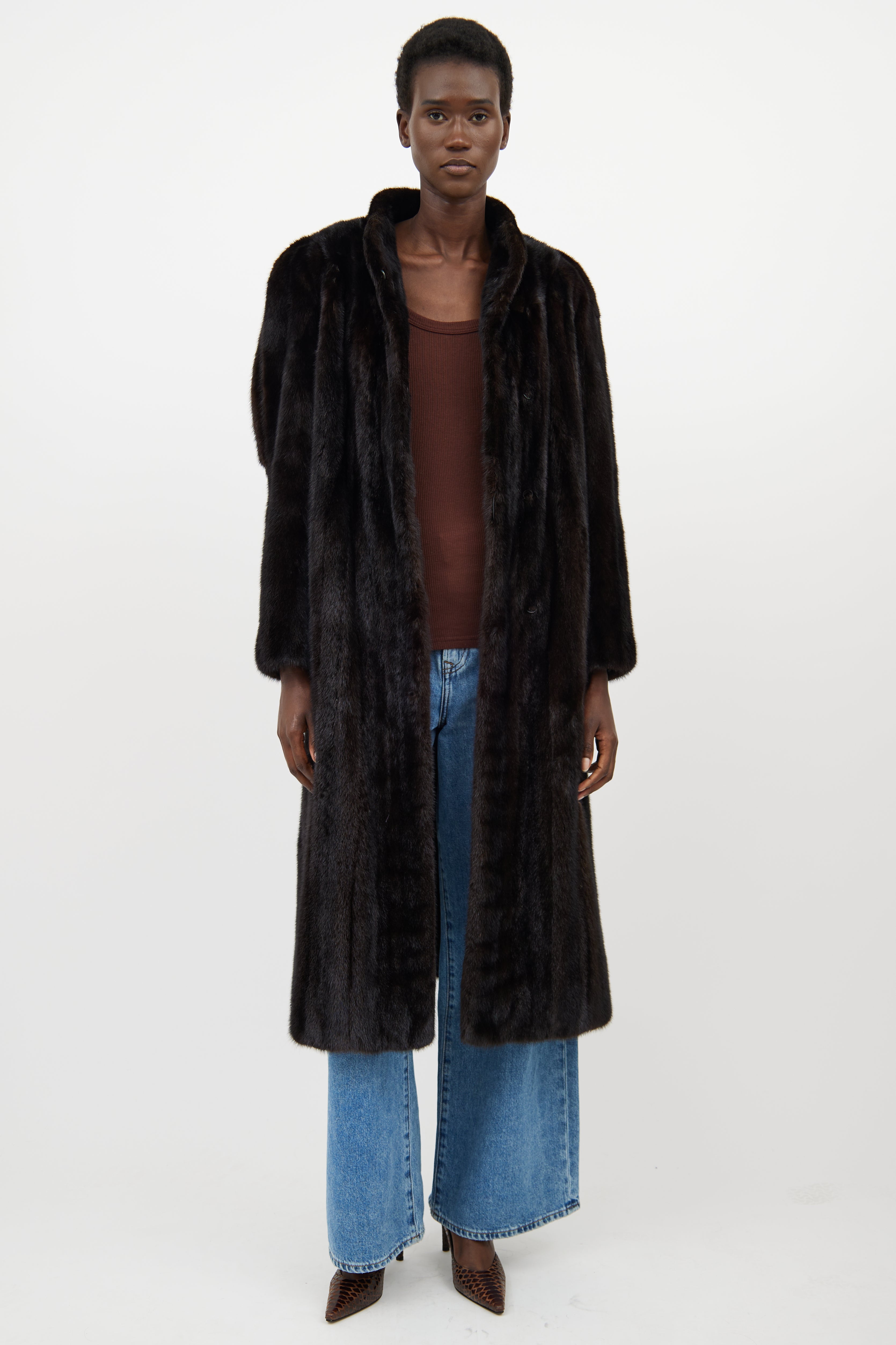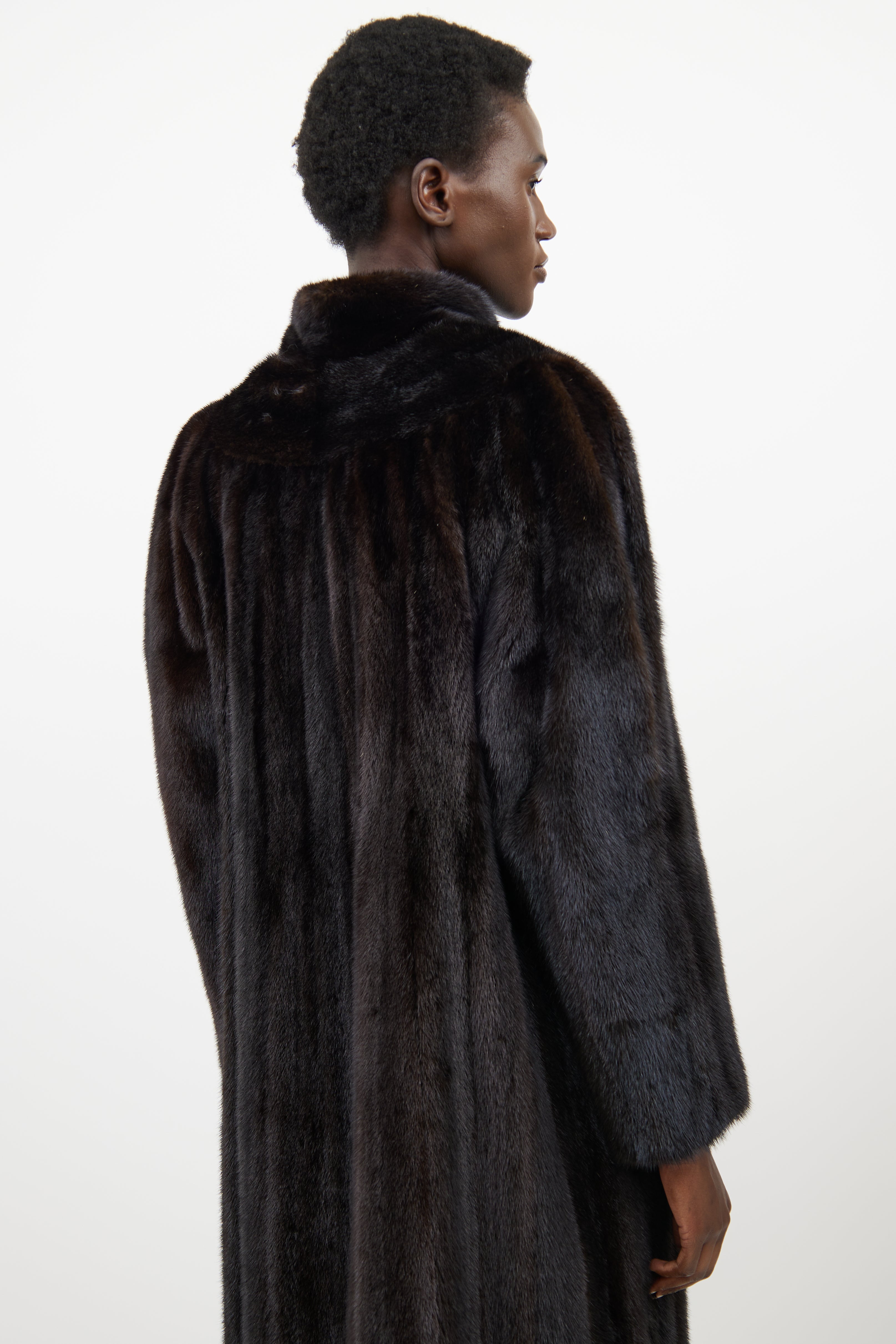 Pre-owned Furs by Michel dark brown mink fur coat featuring a spread collar, long sleeves, two slip pockets at hip, paneled seams, and hook and eye closure. Lined.
