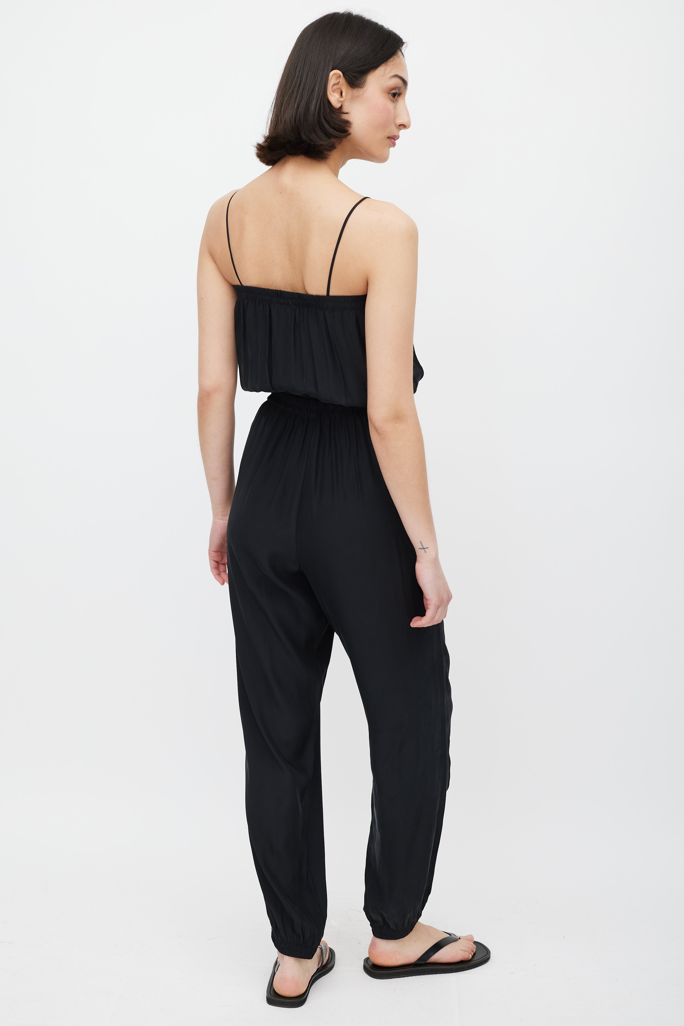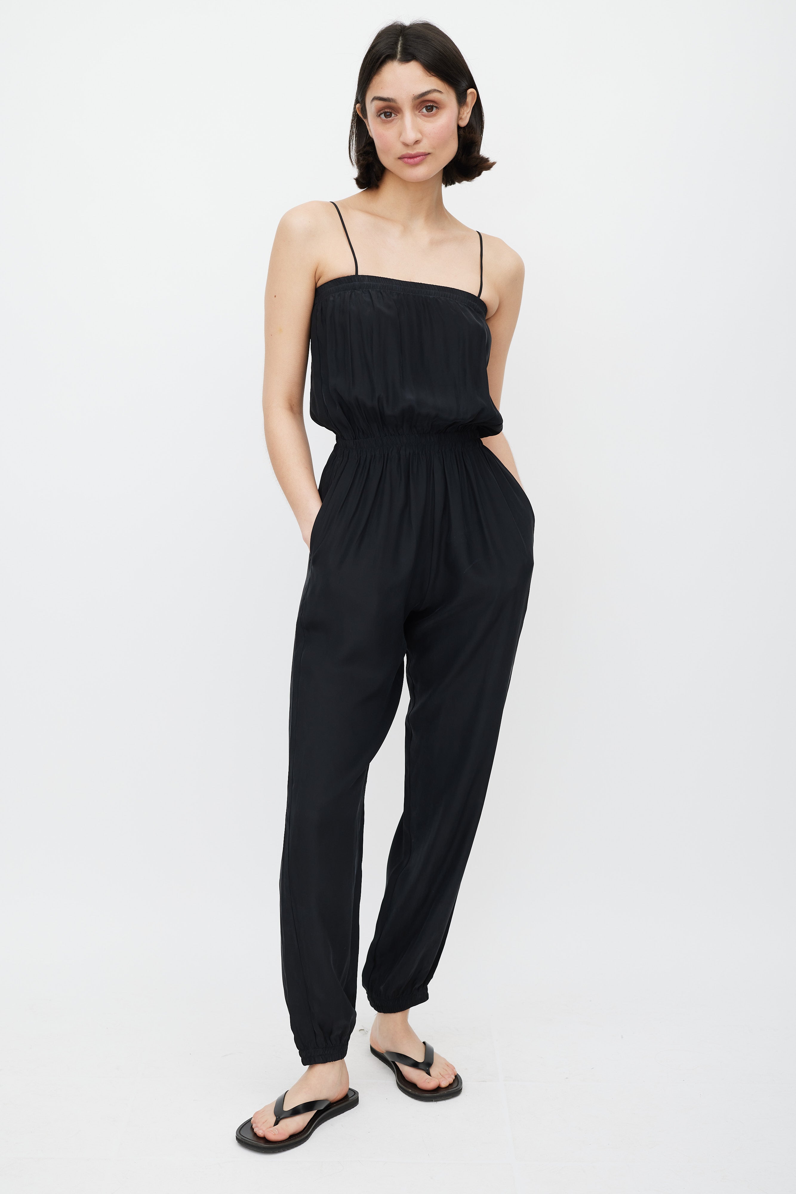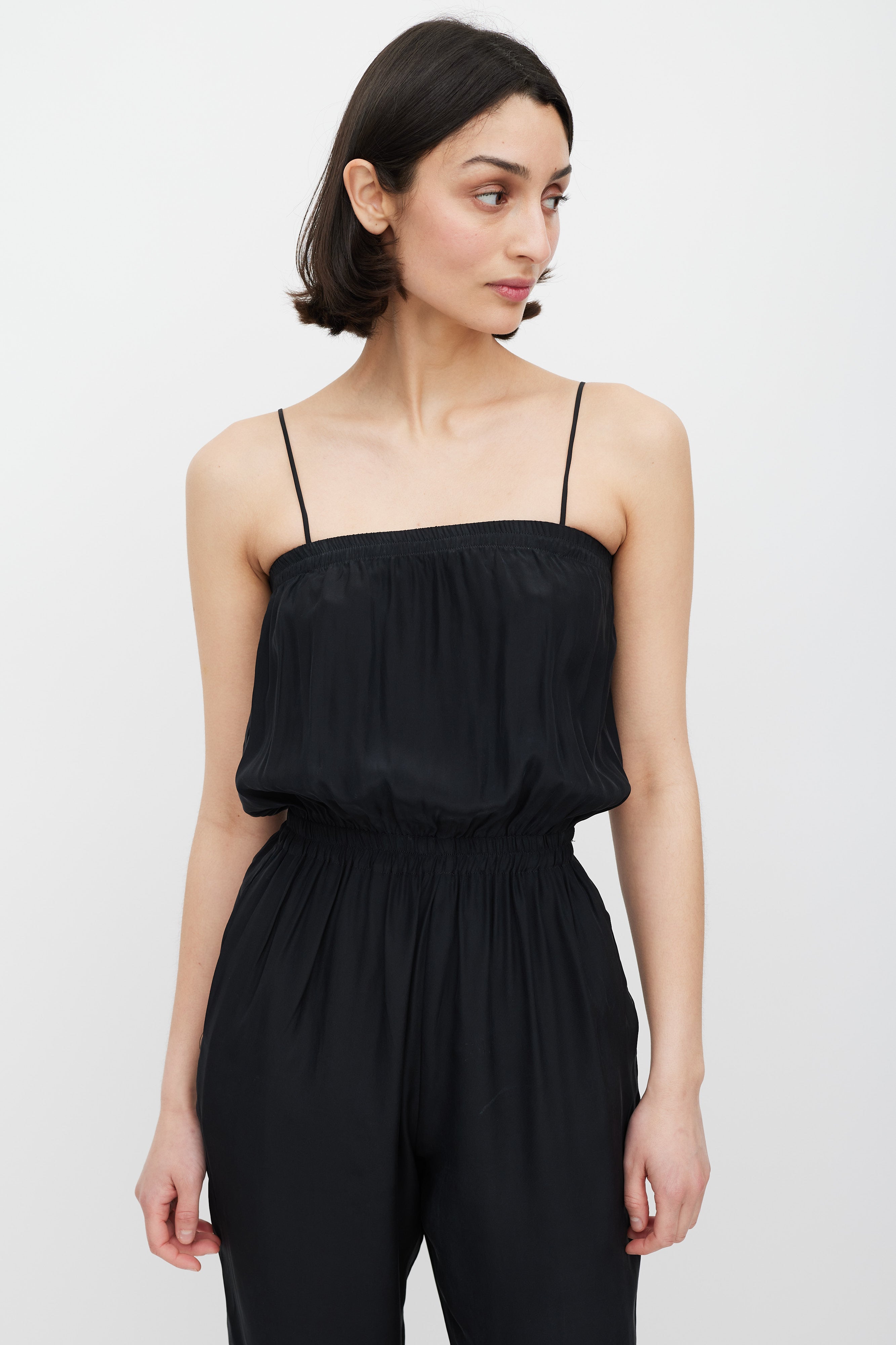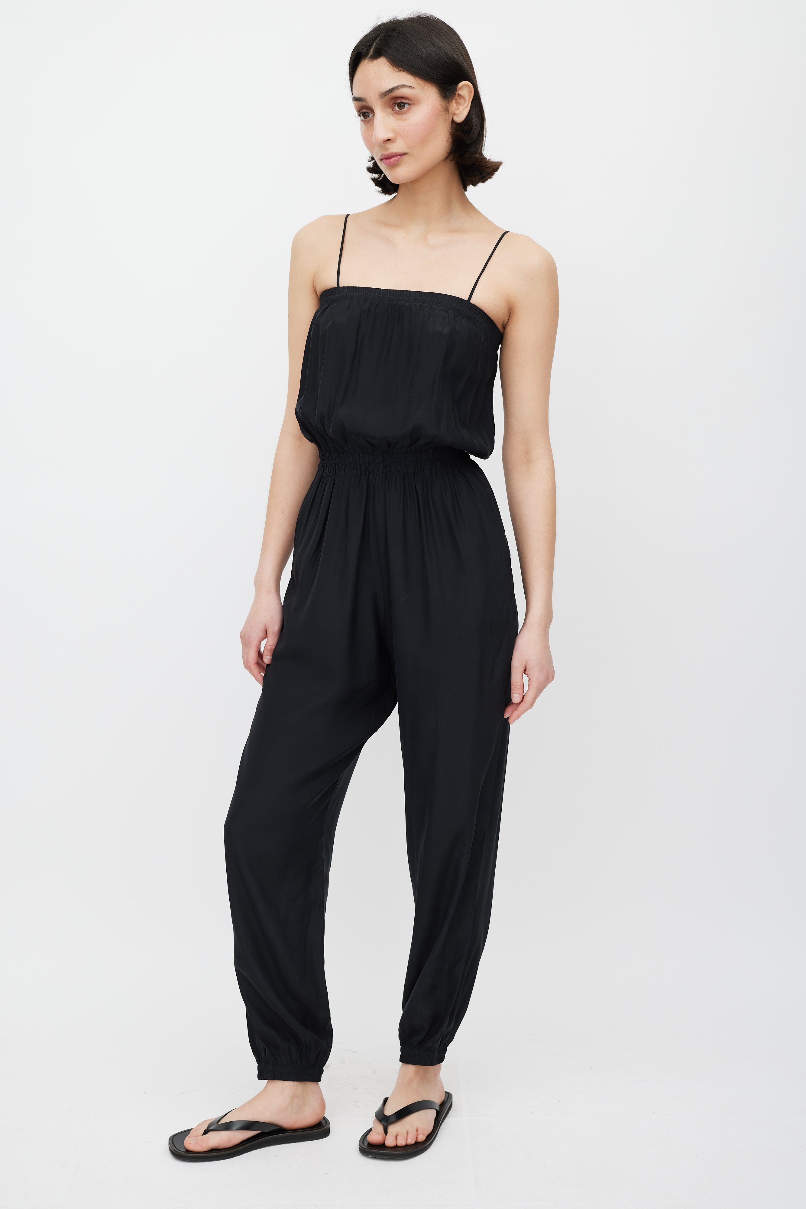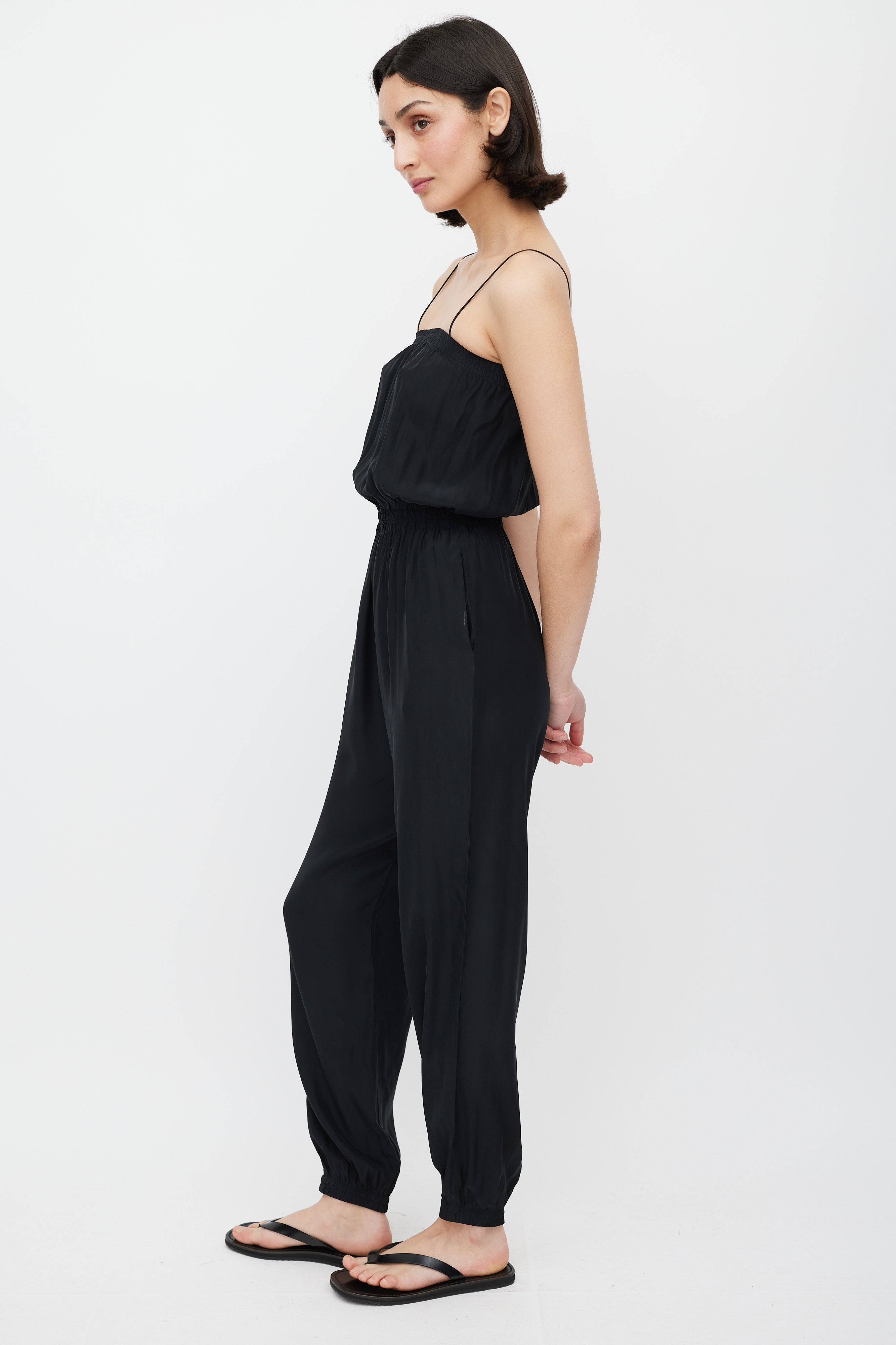 Pre-owned Horses Atelier black satin sleeveless jumpsuit featuring thin straps, tapered leg, in seam pockets, and elasticized top edge, waist, and cuffs.
