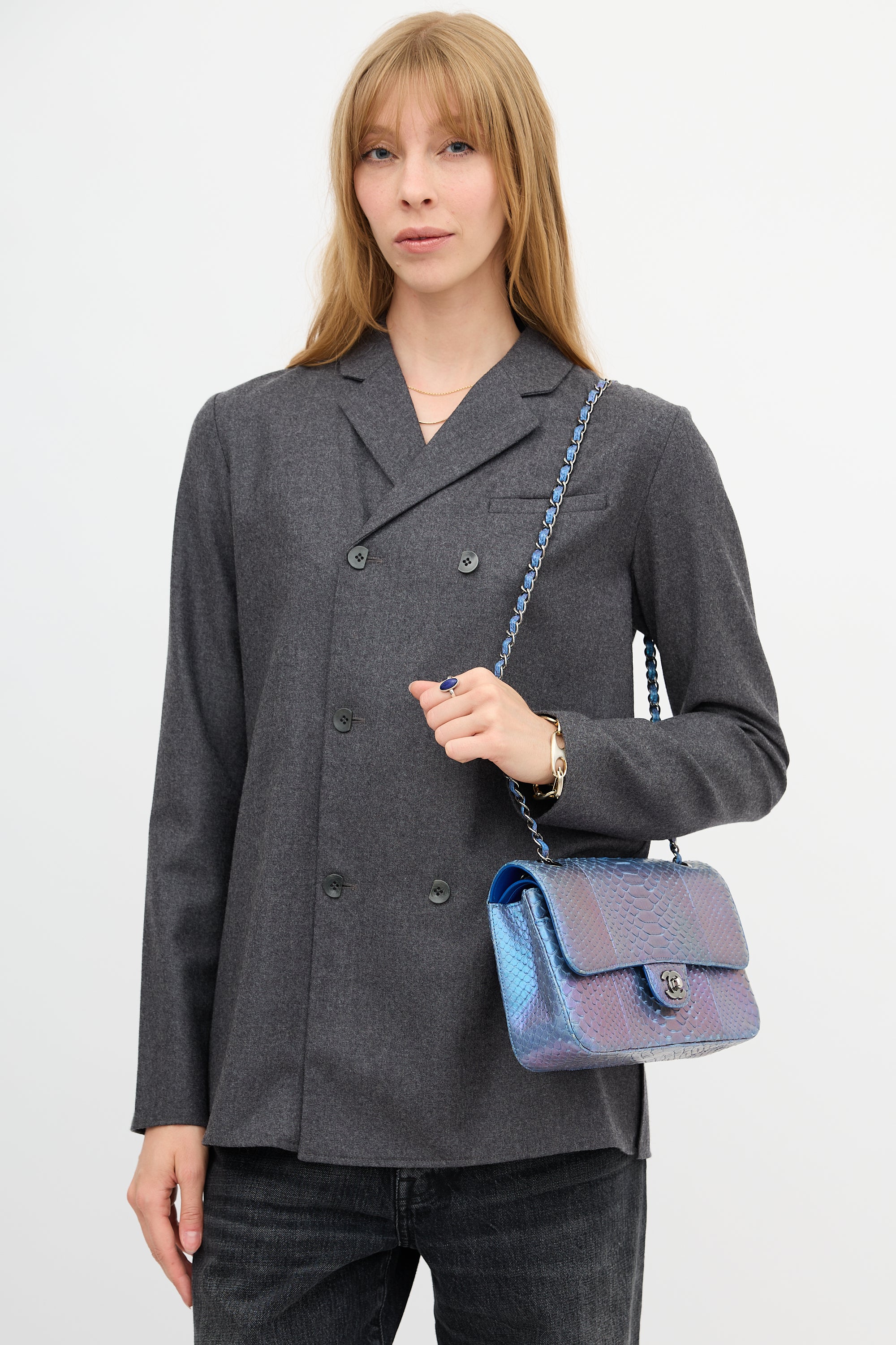 Pre-owned Chanel 2015-2016 blue and purple iridescent classic Double Flap bag featuring python leather, gunmetal hardware, interlocking CC turn lock closure, braided leather and chain strap, one slip pocket at back, blue leather lining, one slip pocket under first flap, second flap includes embroidered CC logo, and interior compartments include one slip pocket under second flap and main pocket with two slip pockets and one zip pocket. Includes original dust bag and brand authentication card.