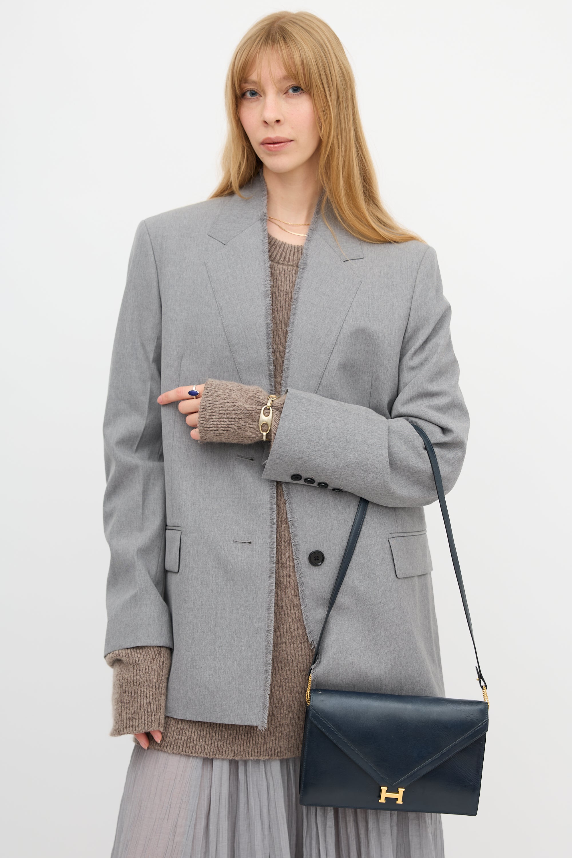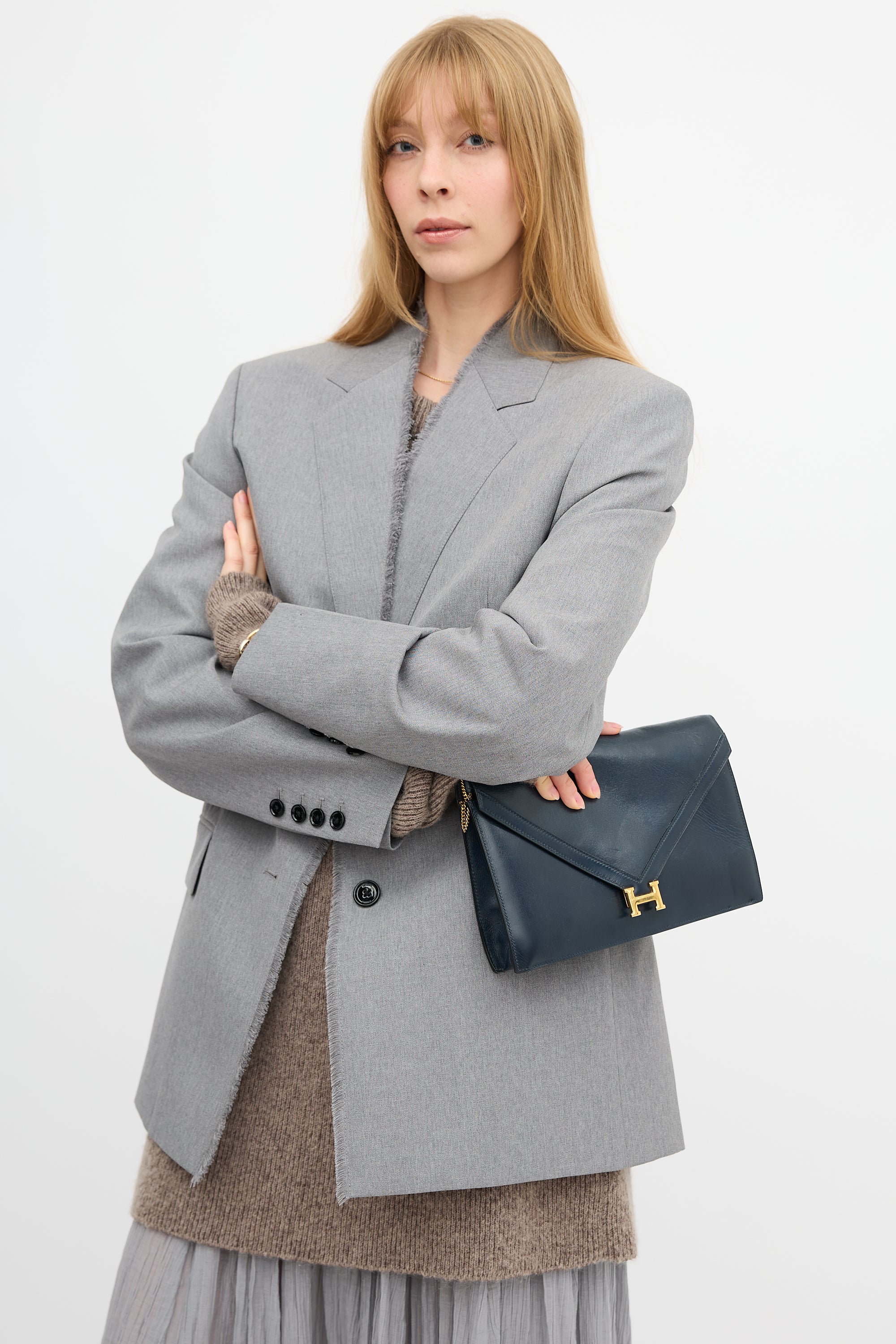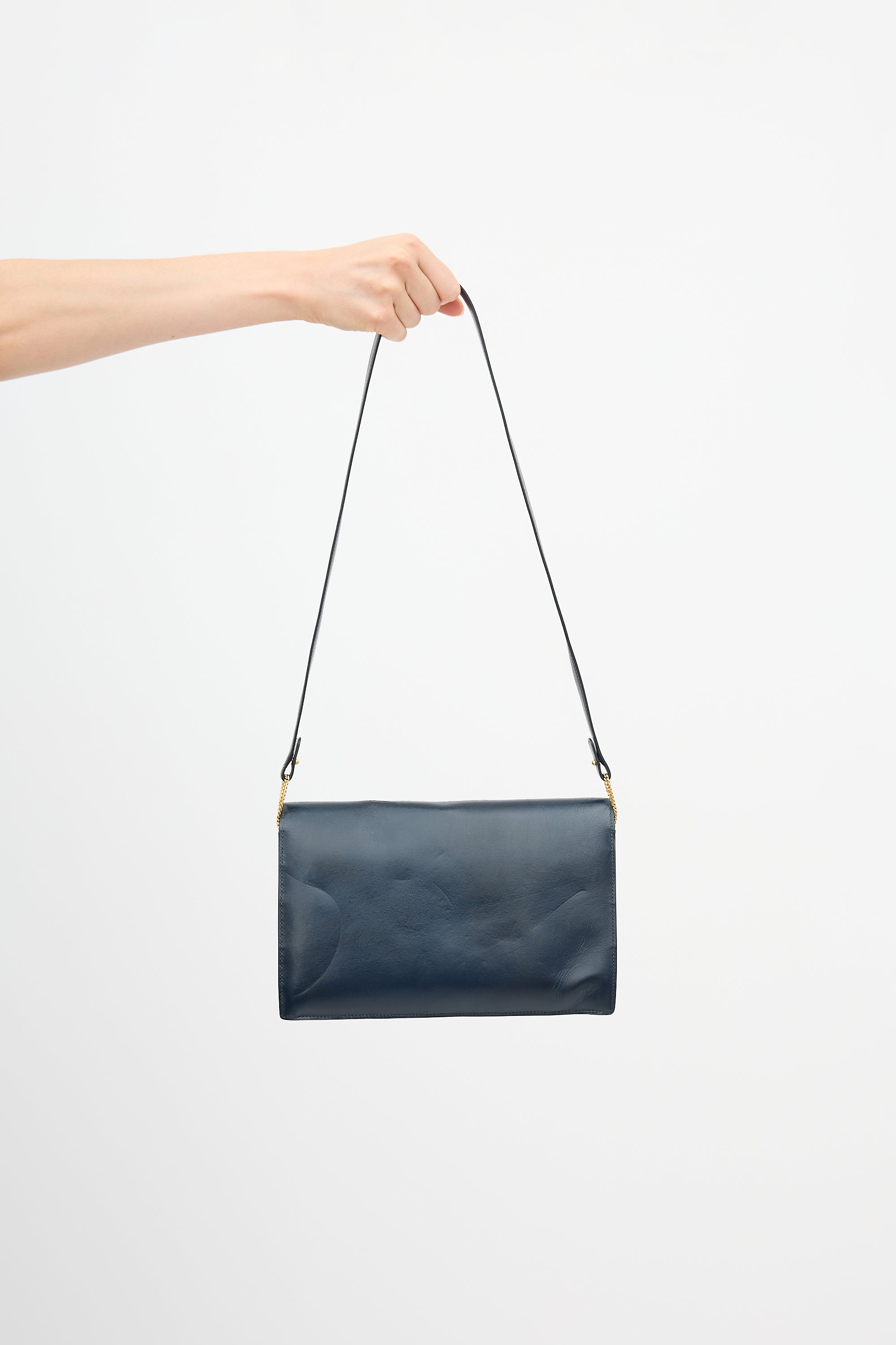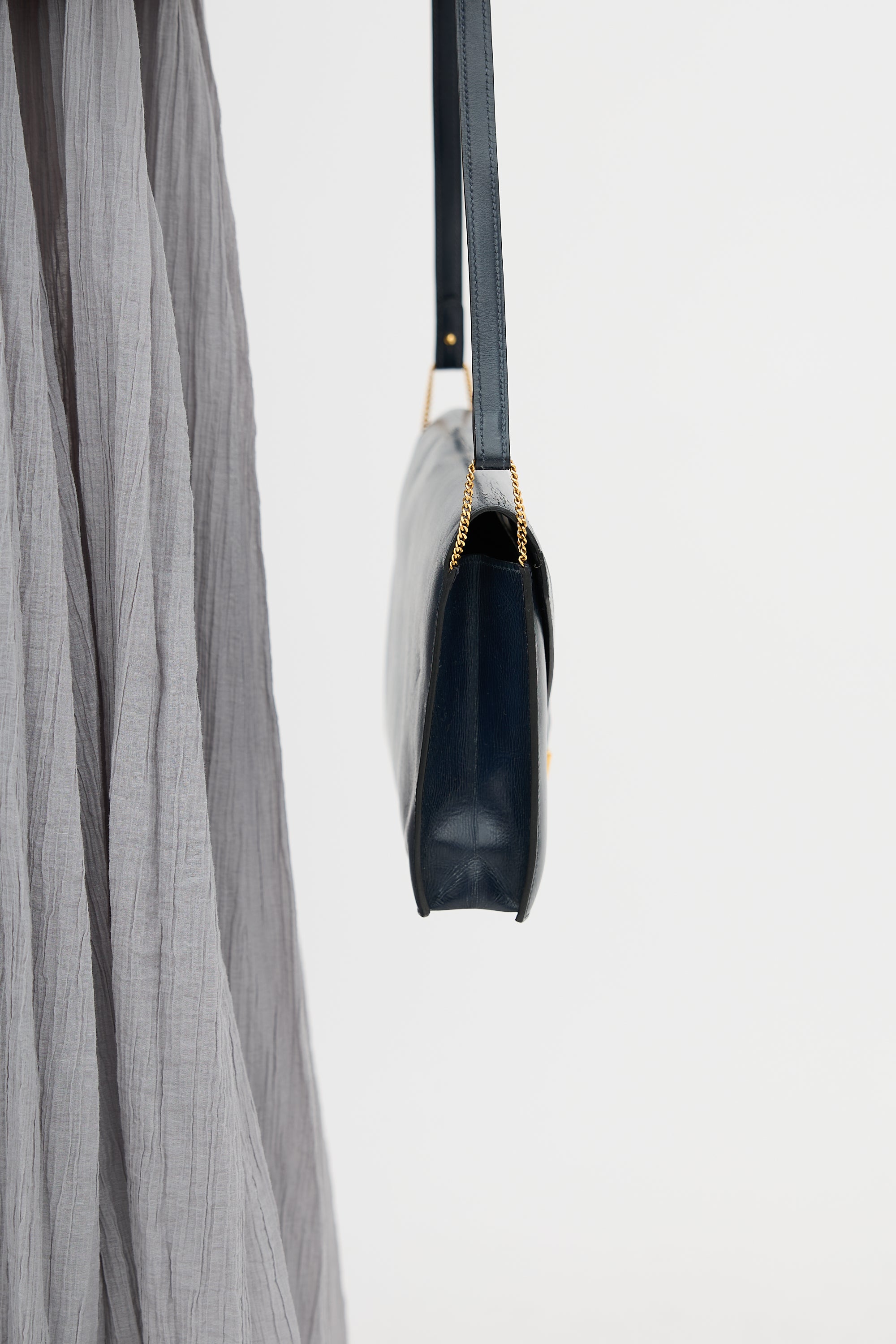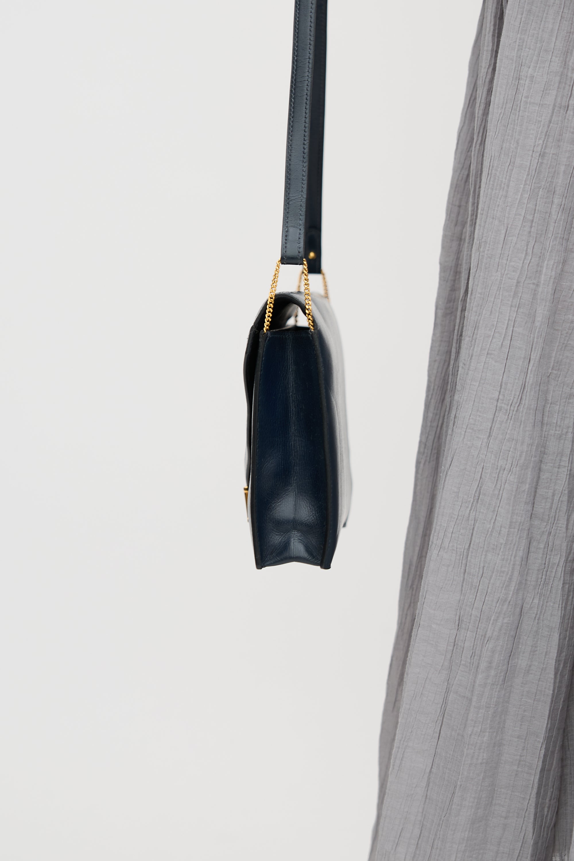 Pre-owned Hermès vintage Lydie bag in Navy Box leather featuring gold tone H buckle at front, detachable fixed shoulder strap, one slip pocket under top flap with gold stamped logo, one main compartment, and one slip and one zip pocket inside. Includes original dust bag.