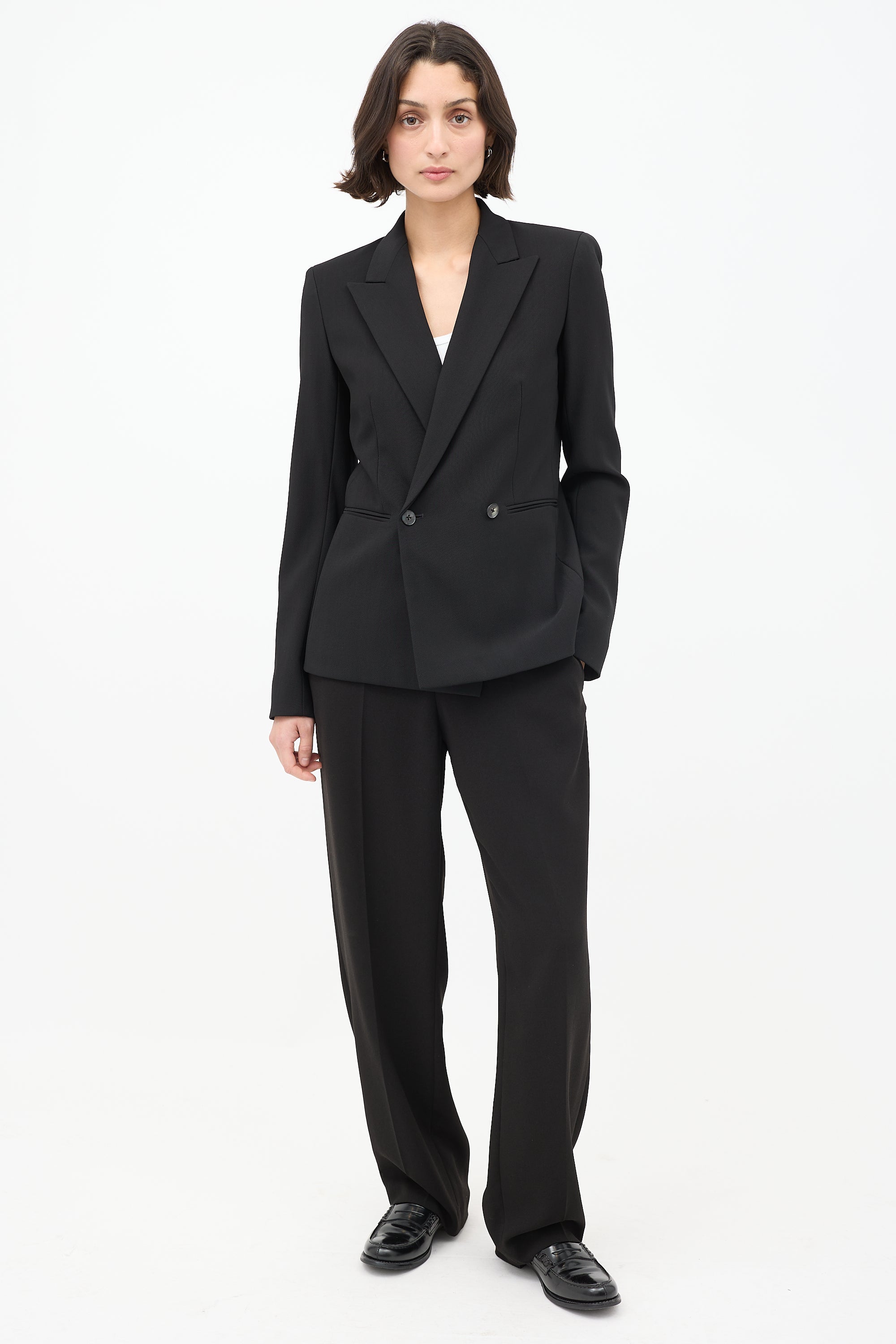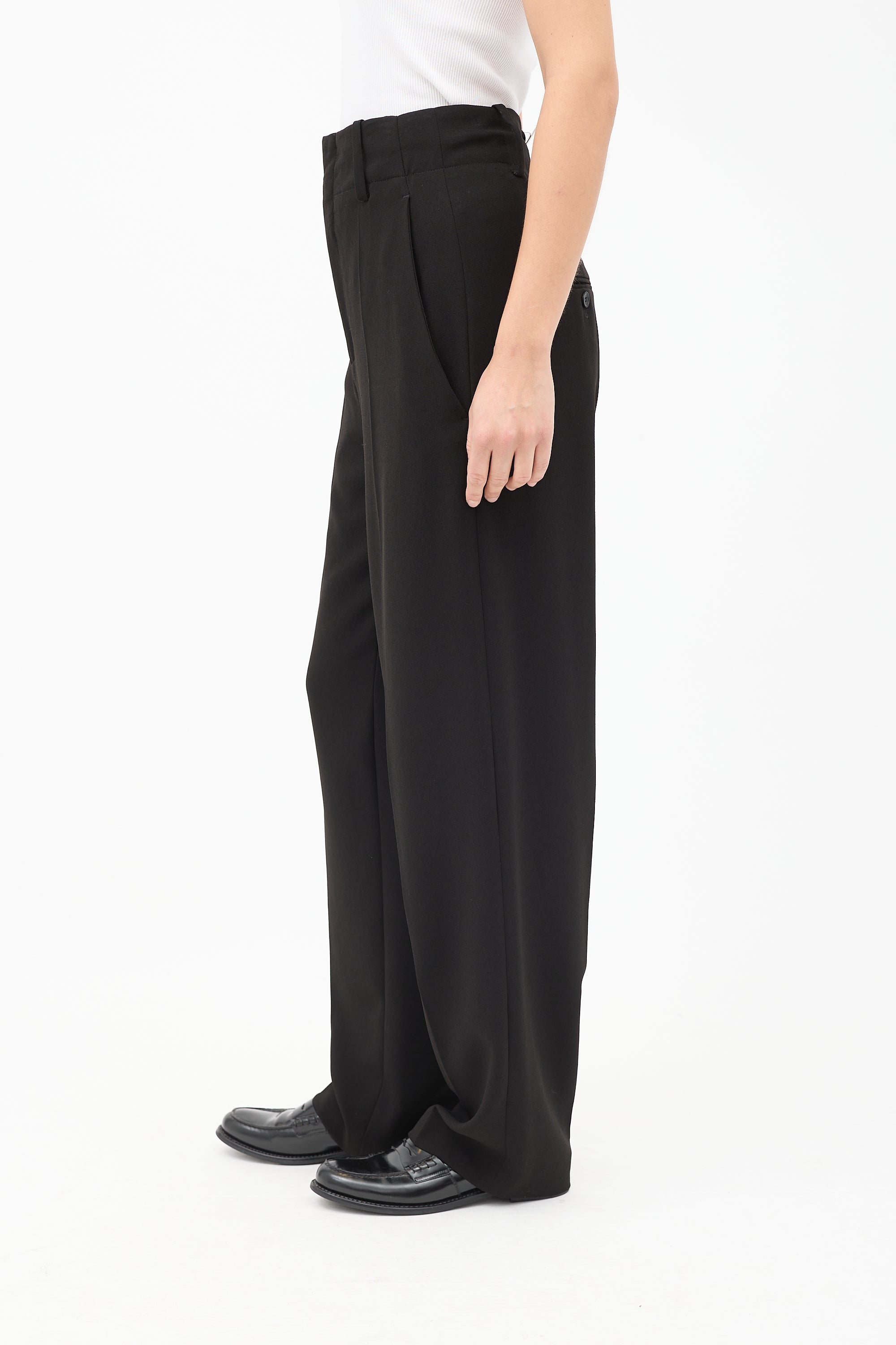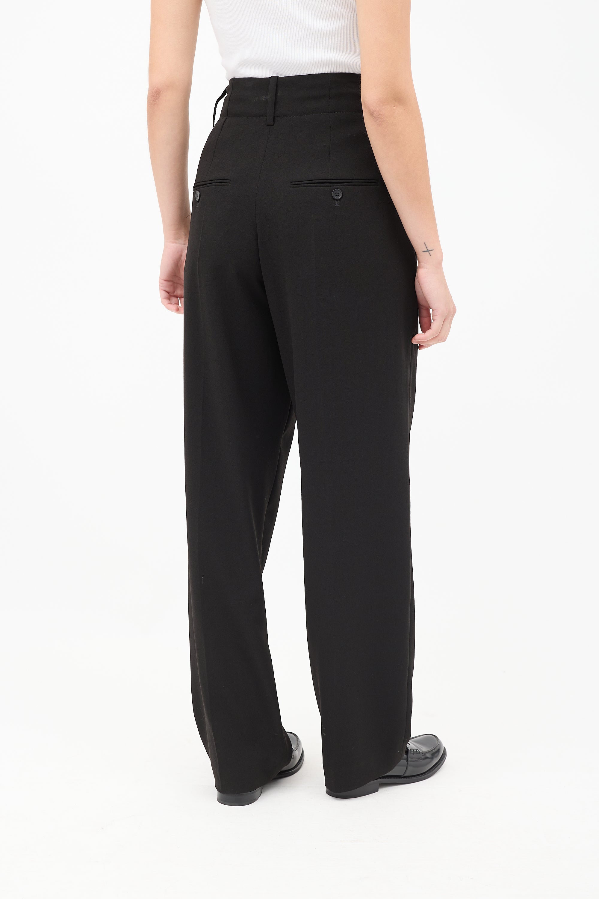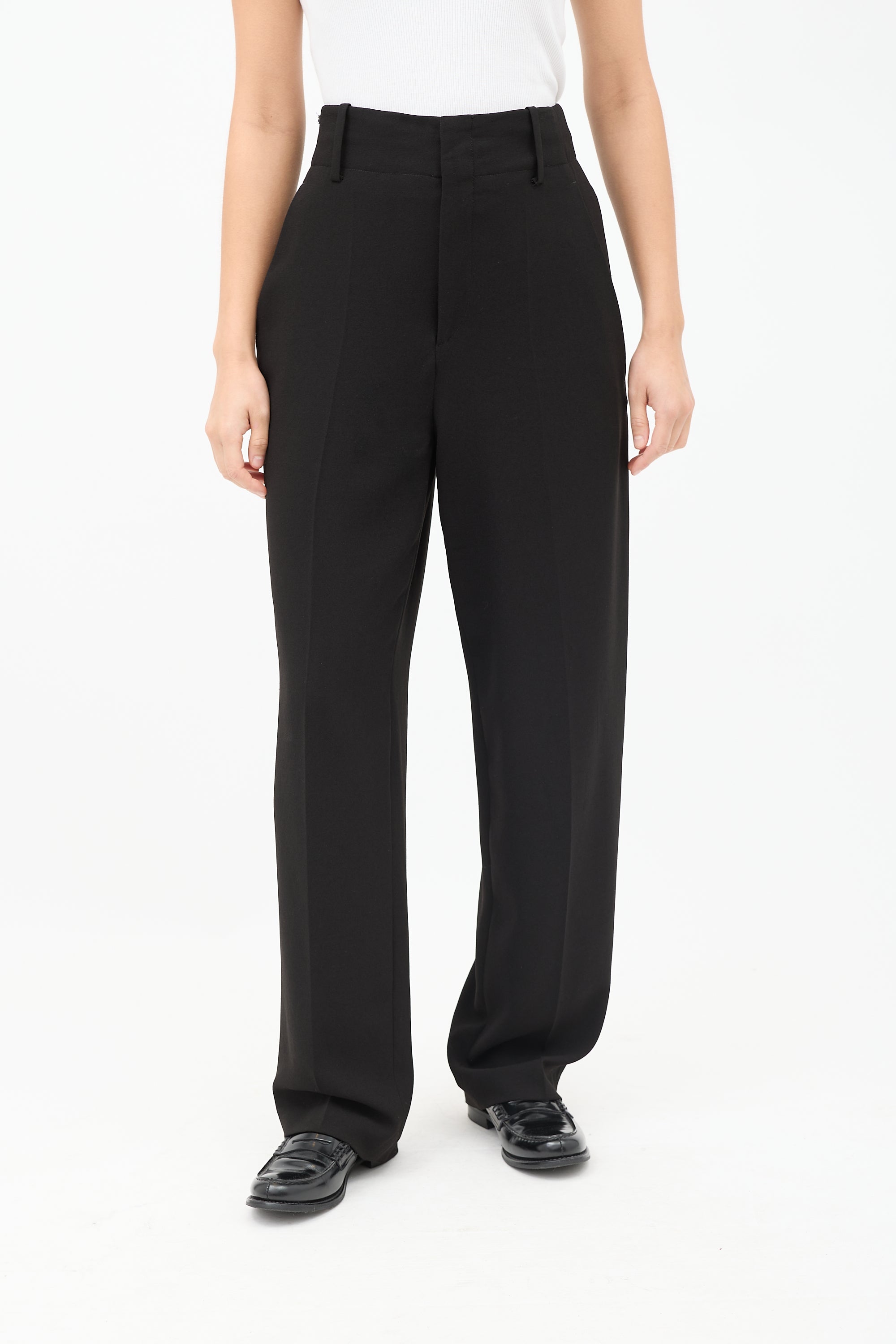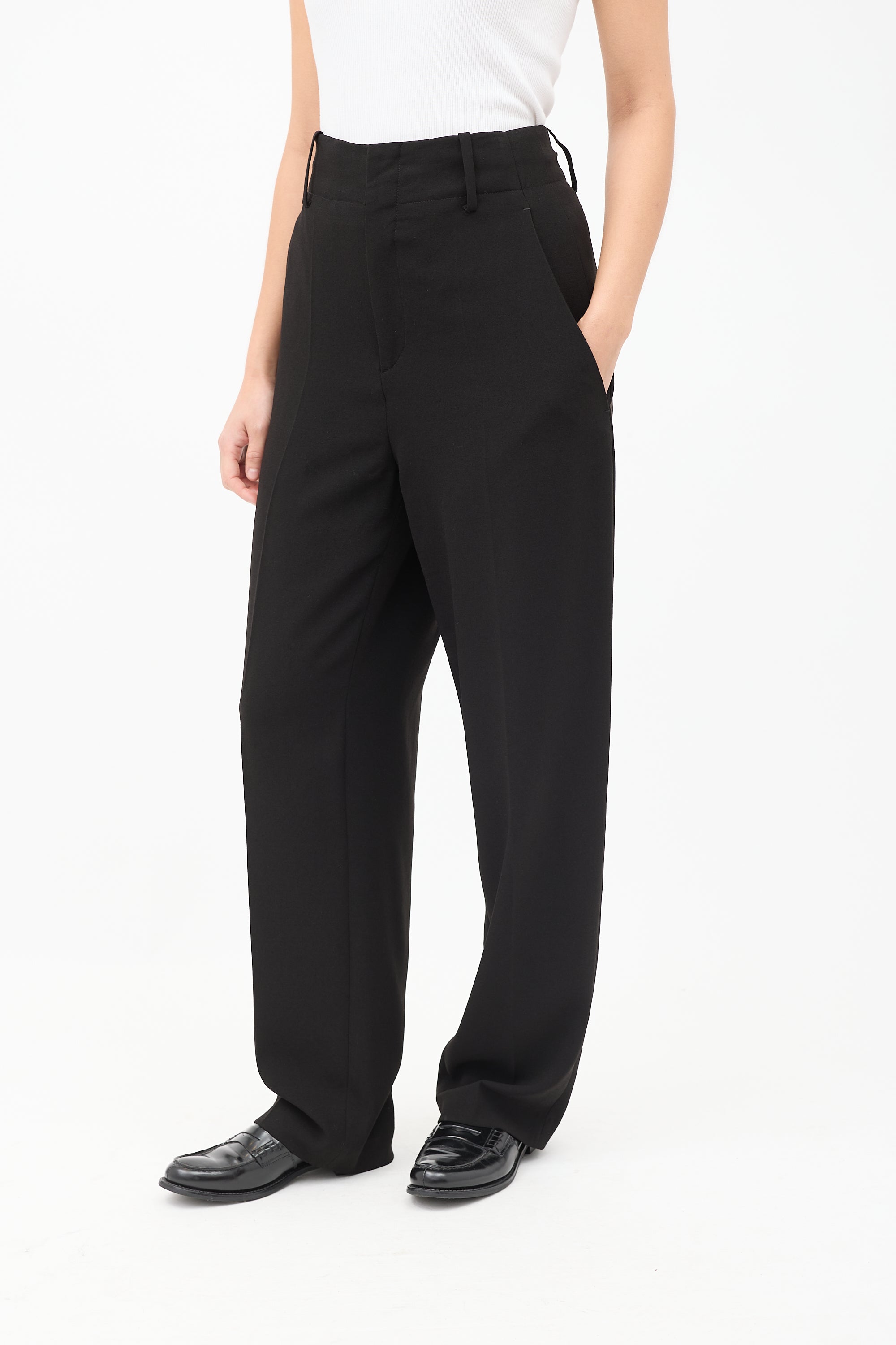 Pre-owned Isabel Marant black trousers featuring a high waist, dropped seat, straight leg with creases, four pocket styling, and zip fly. Clipped to fit model.