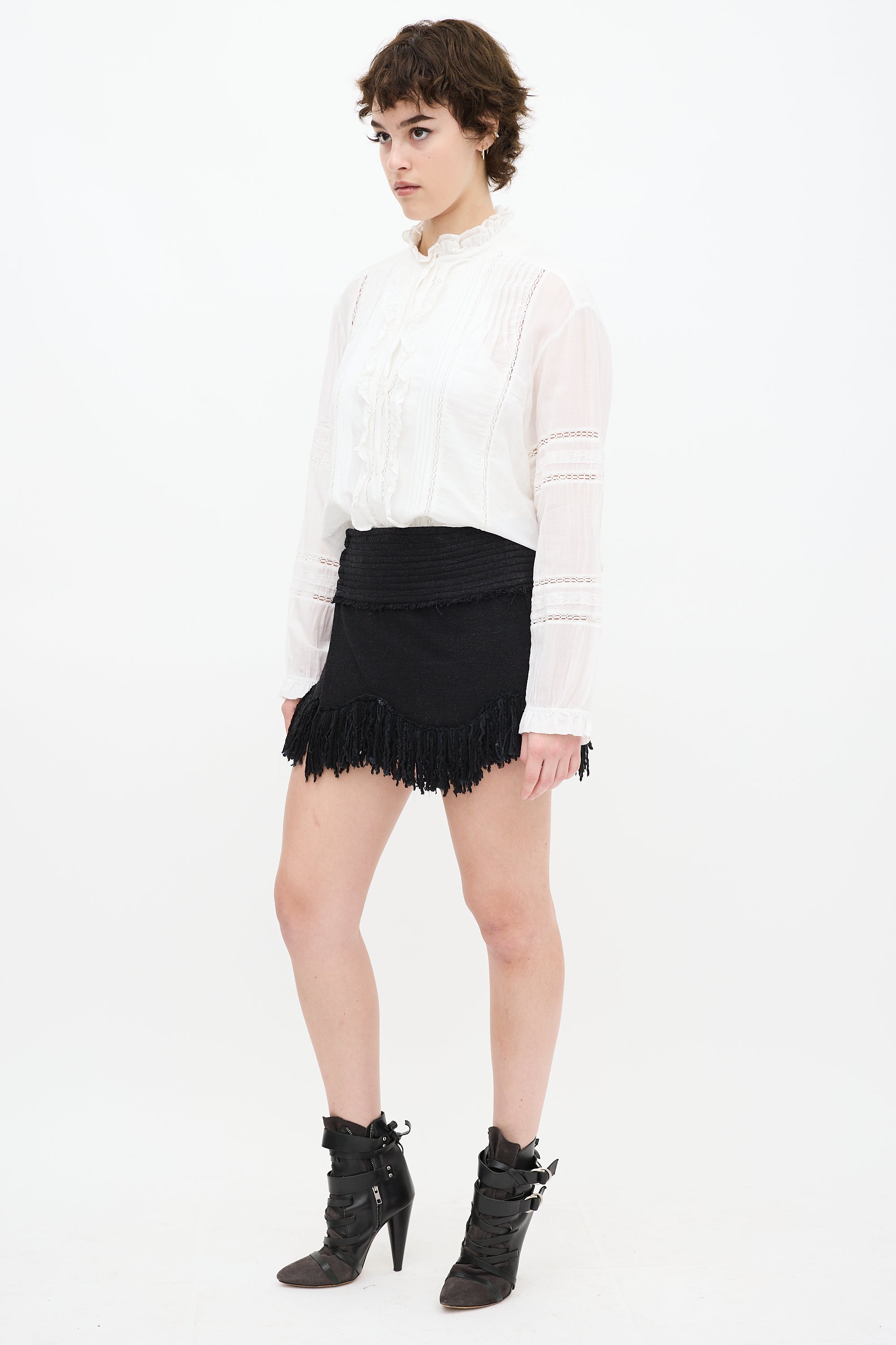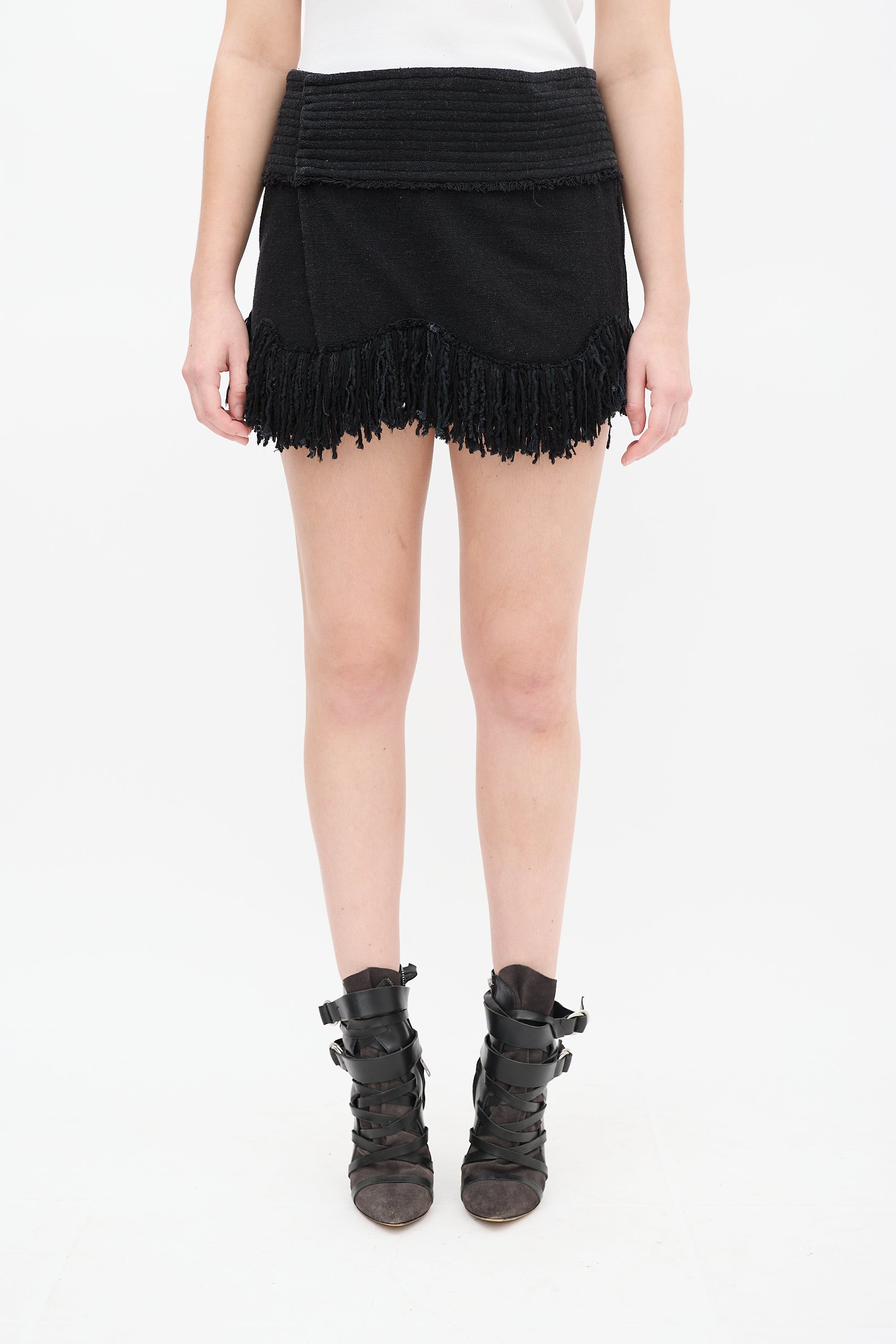 Pre-owned Isabel Marant black silk skirt featuring a scalloped fringe hem, and wrap front with snap button closure.