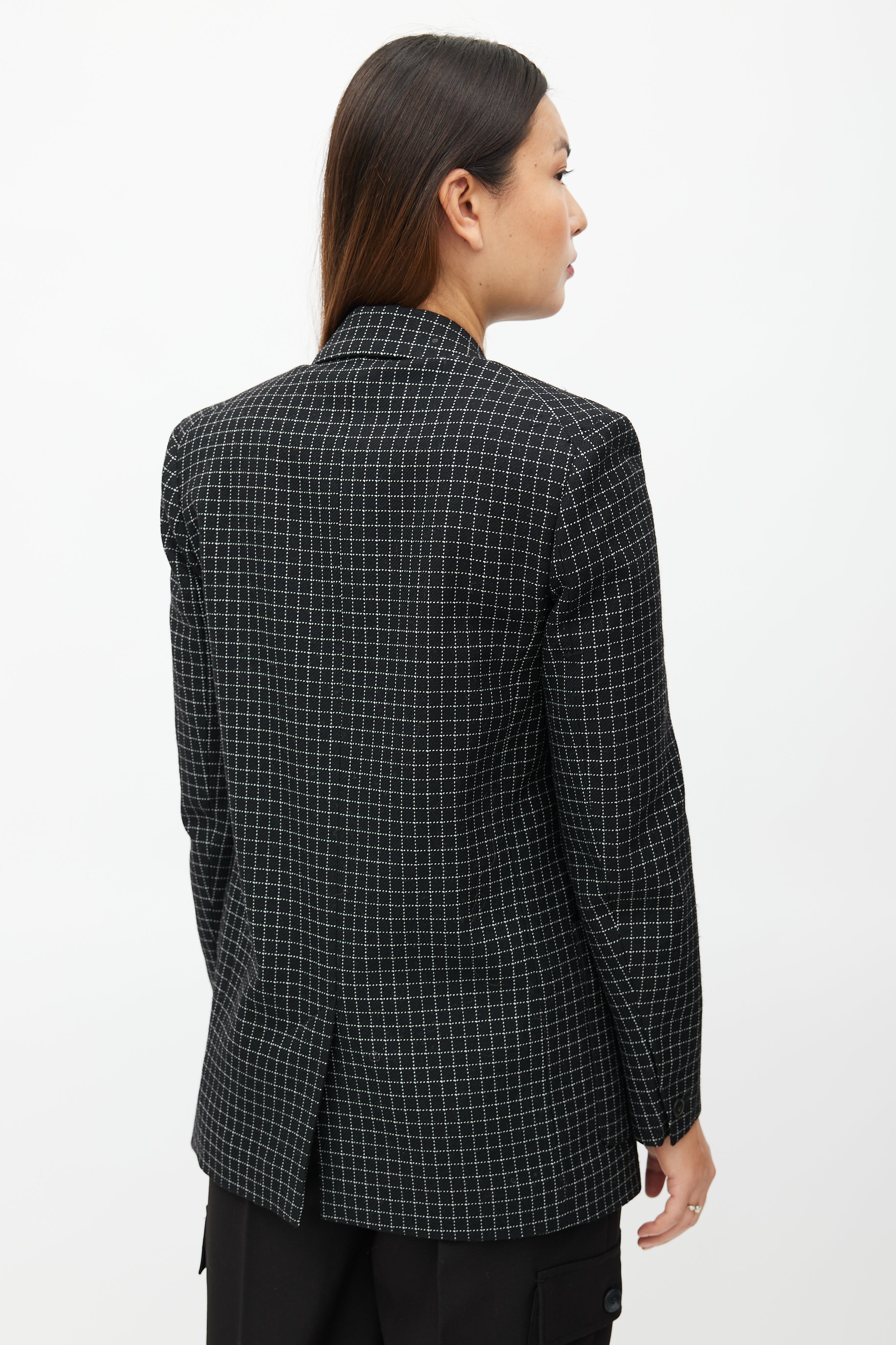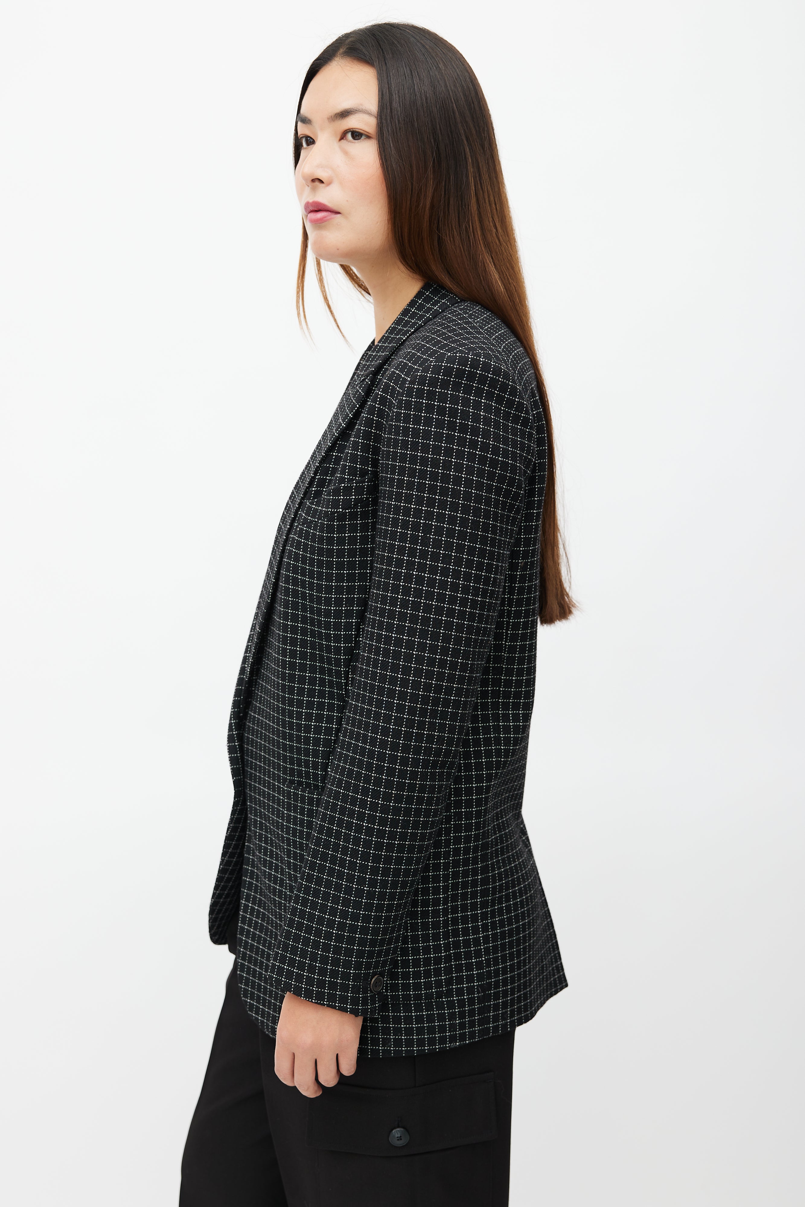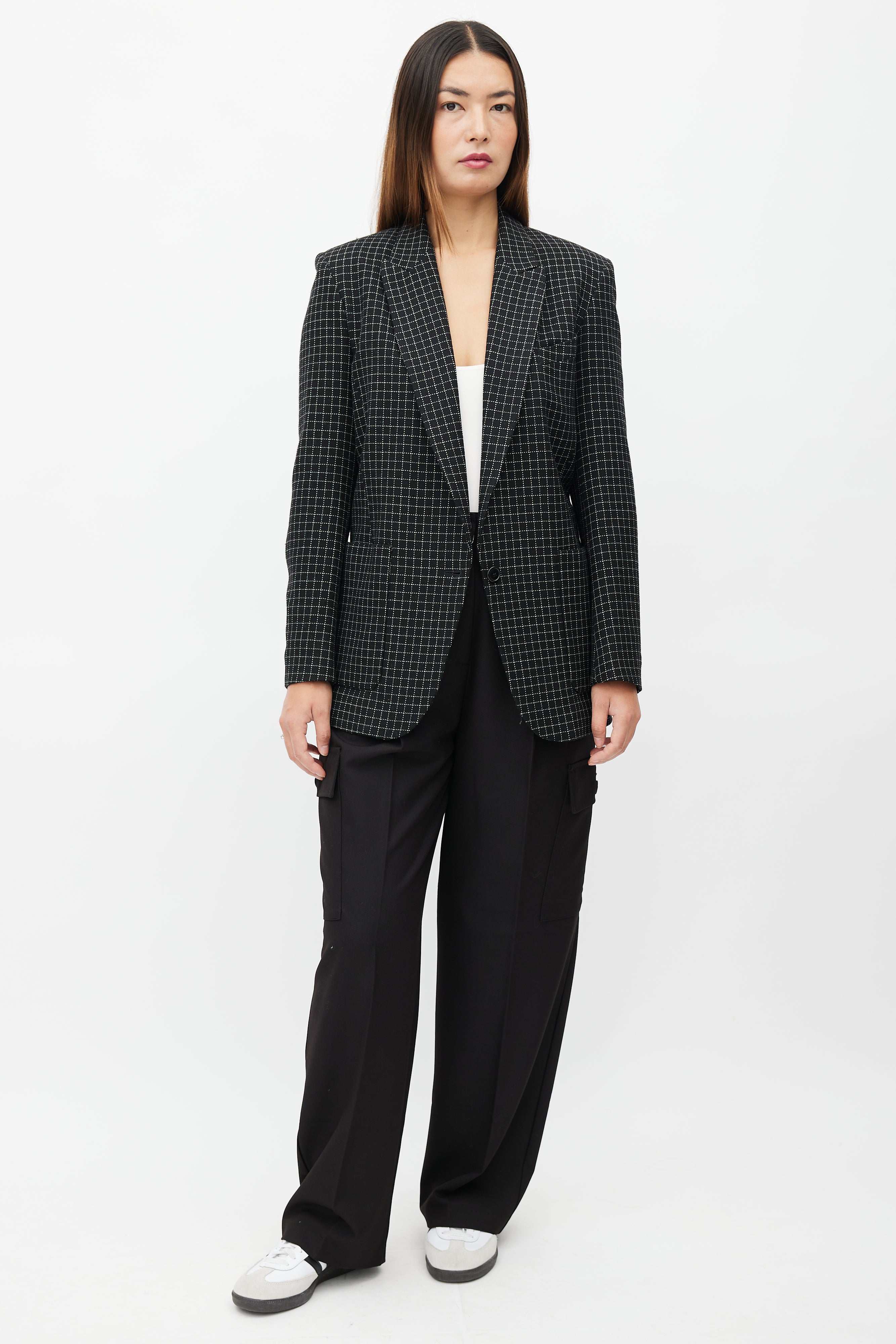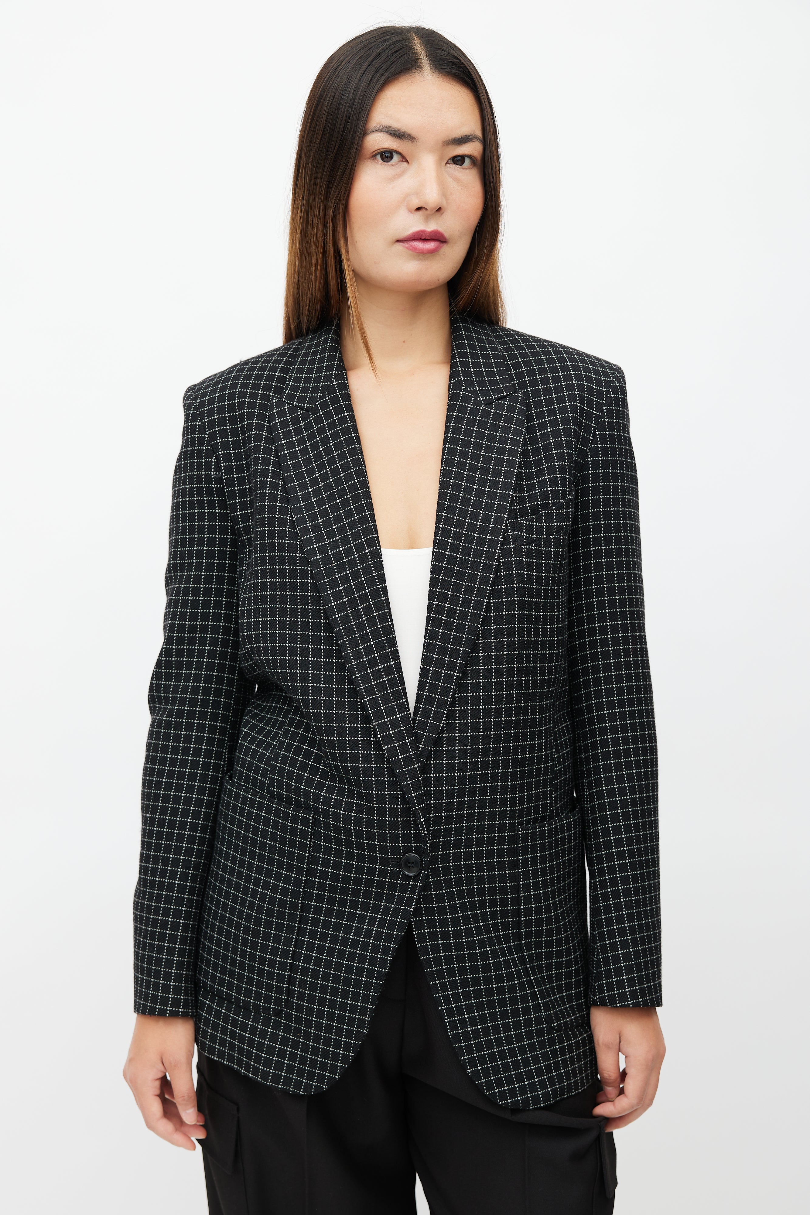 Pre-owned Isabel Marant black blazer featuring white check print, single button closure, slight peak lapel, two patch pockets at hips, back vent, and buttoned cuffs.
