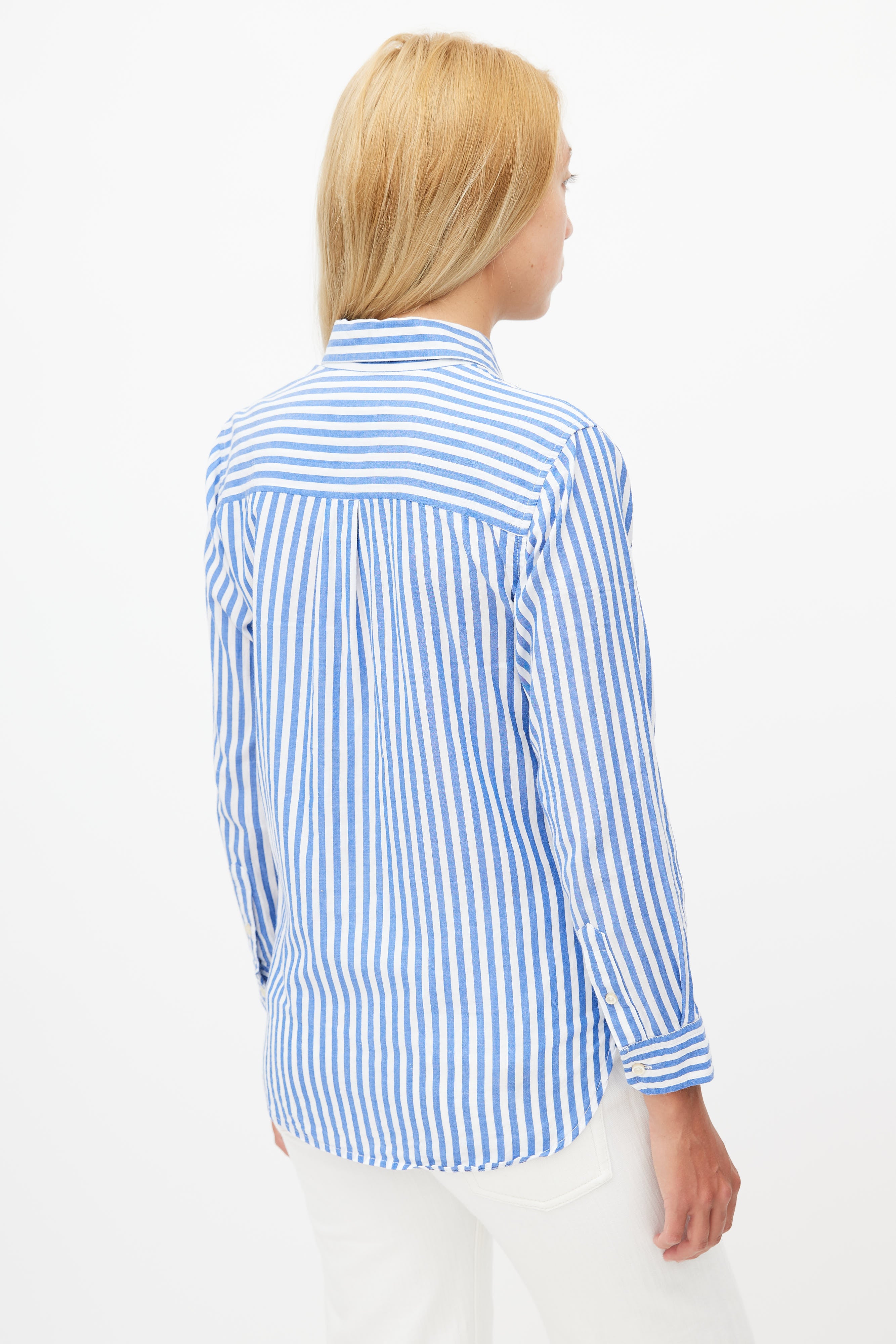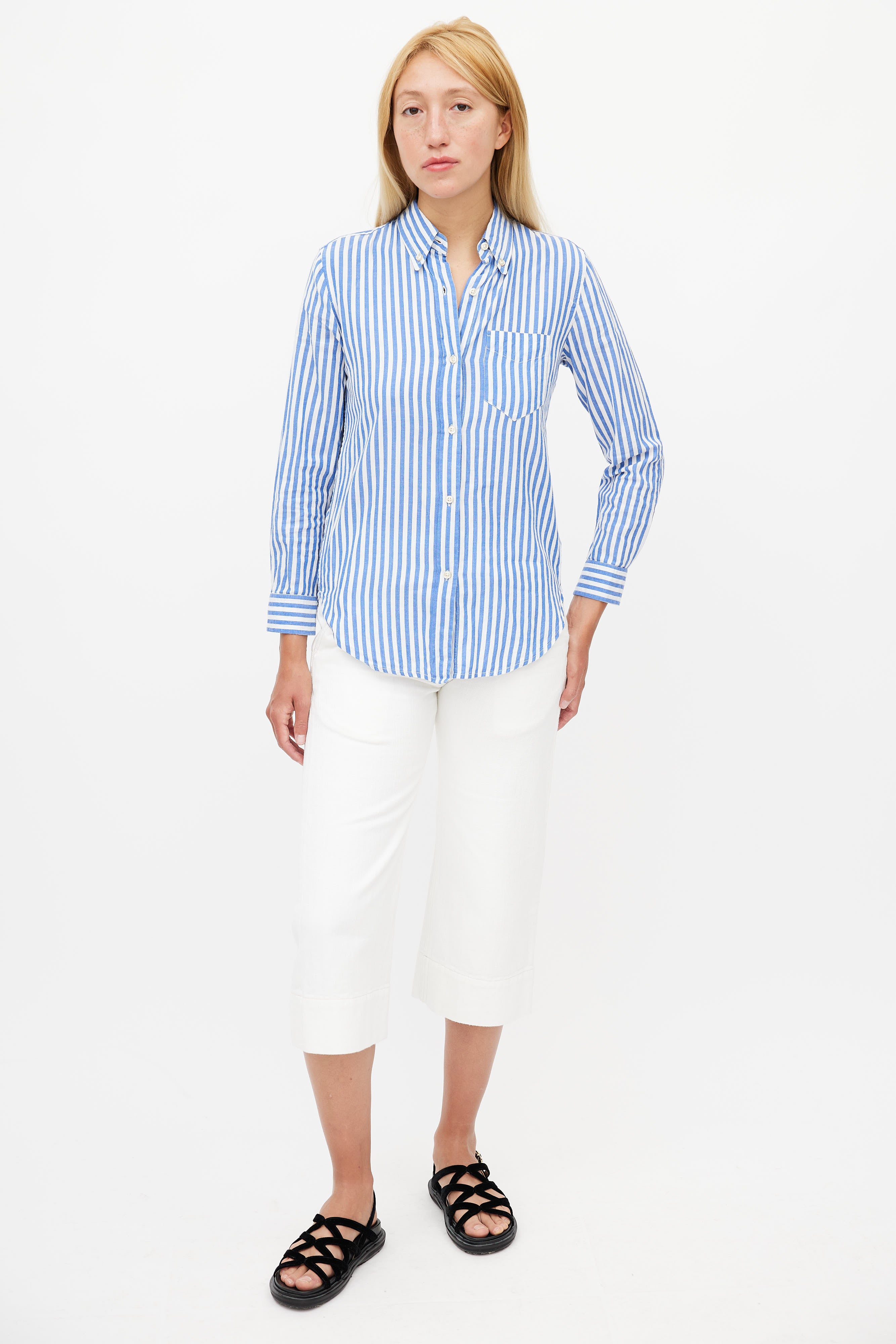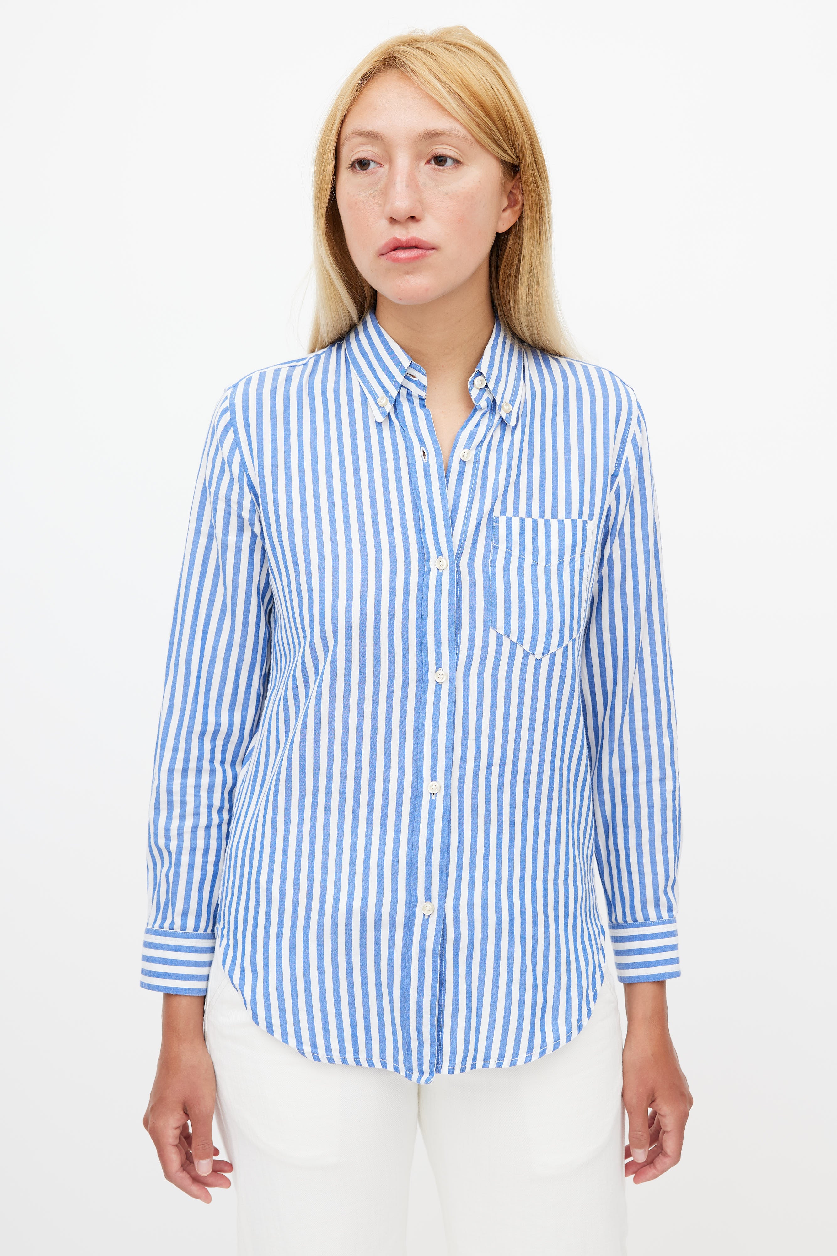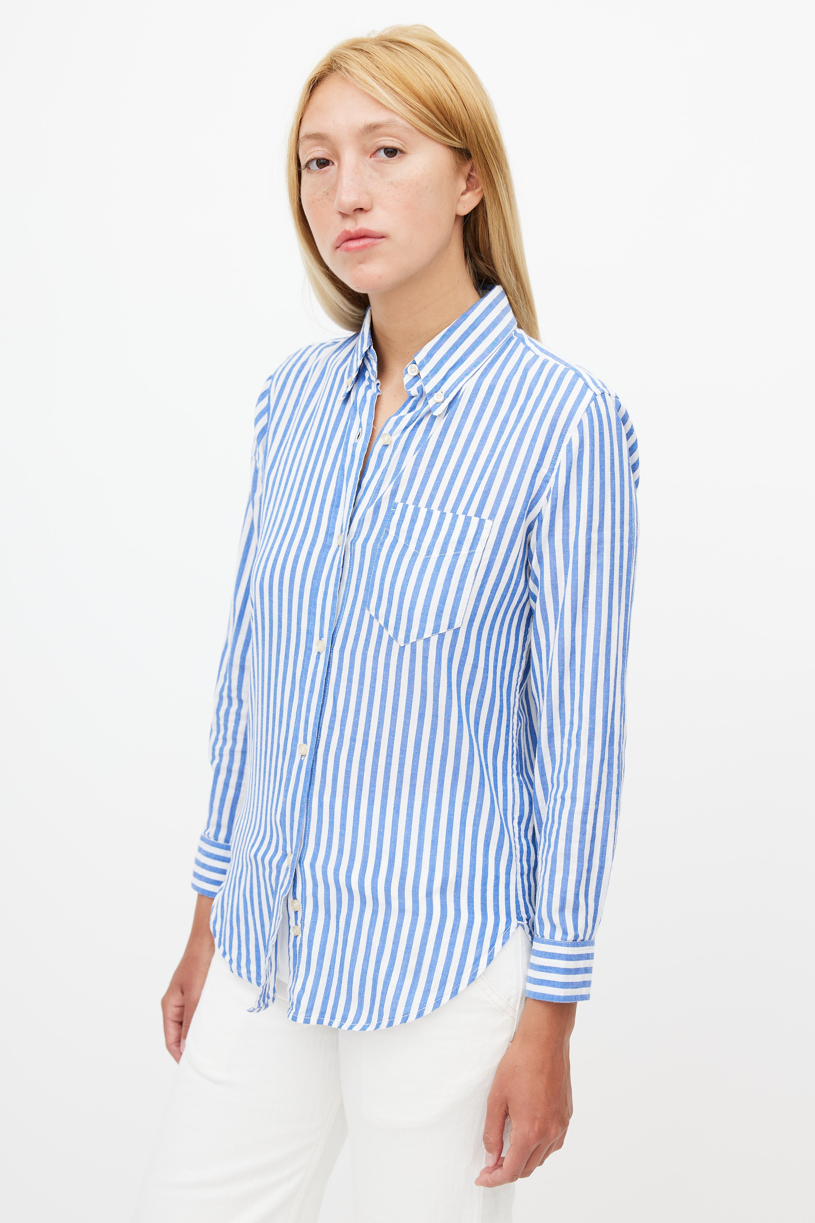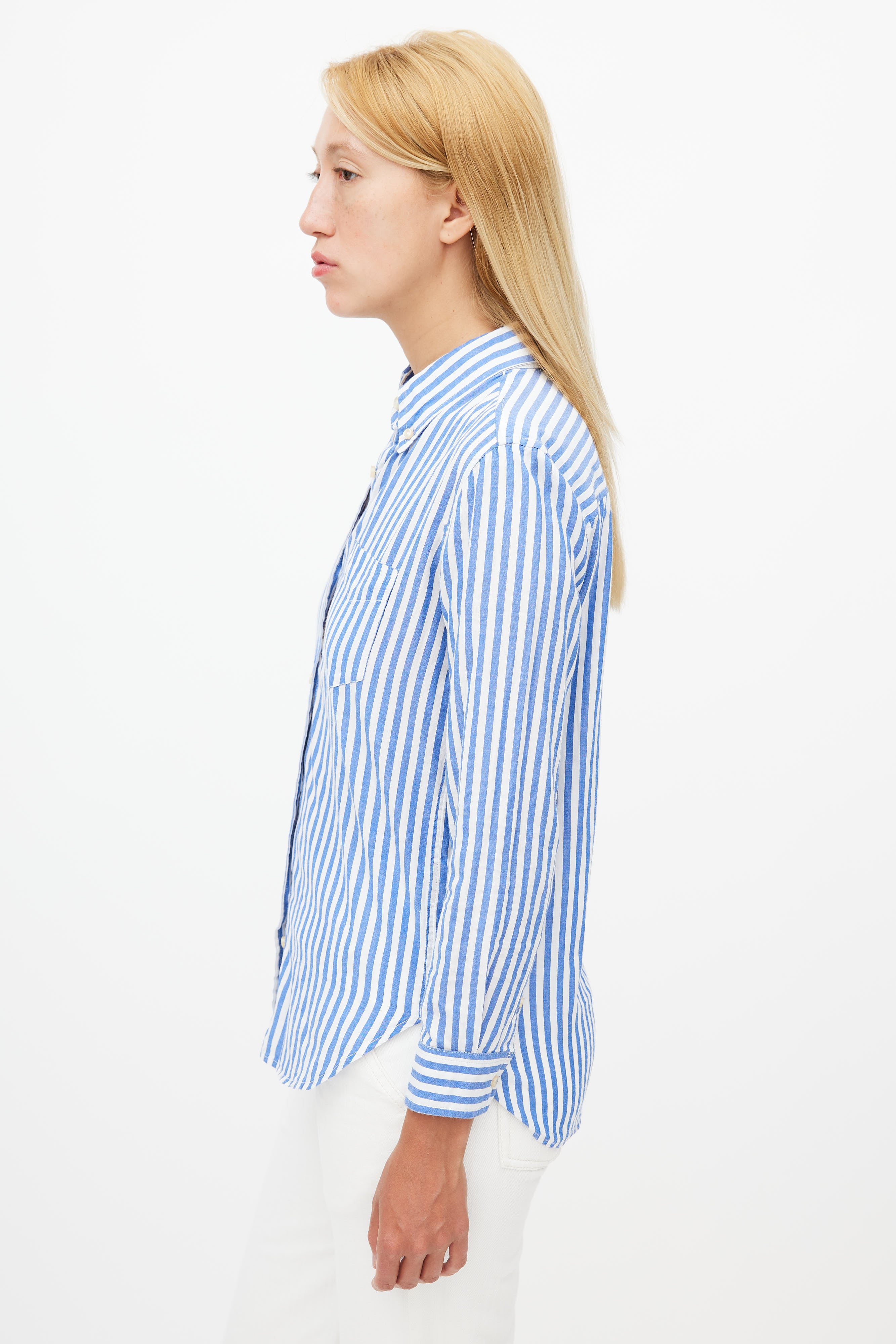 Pre-owned Isabel Marant blue shirt featuring a white striped pattern, pointed collar, long sleeves with buttoned cuffs, one patch pocket at chest, and button up front.