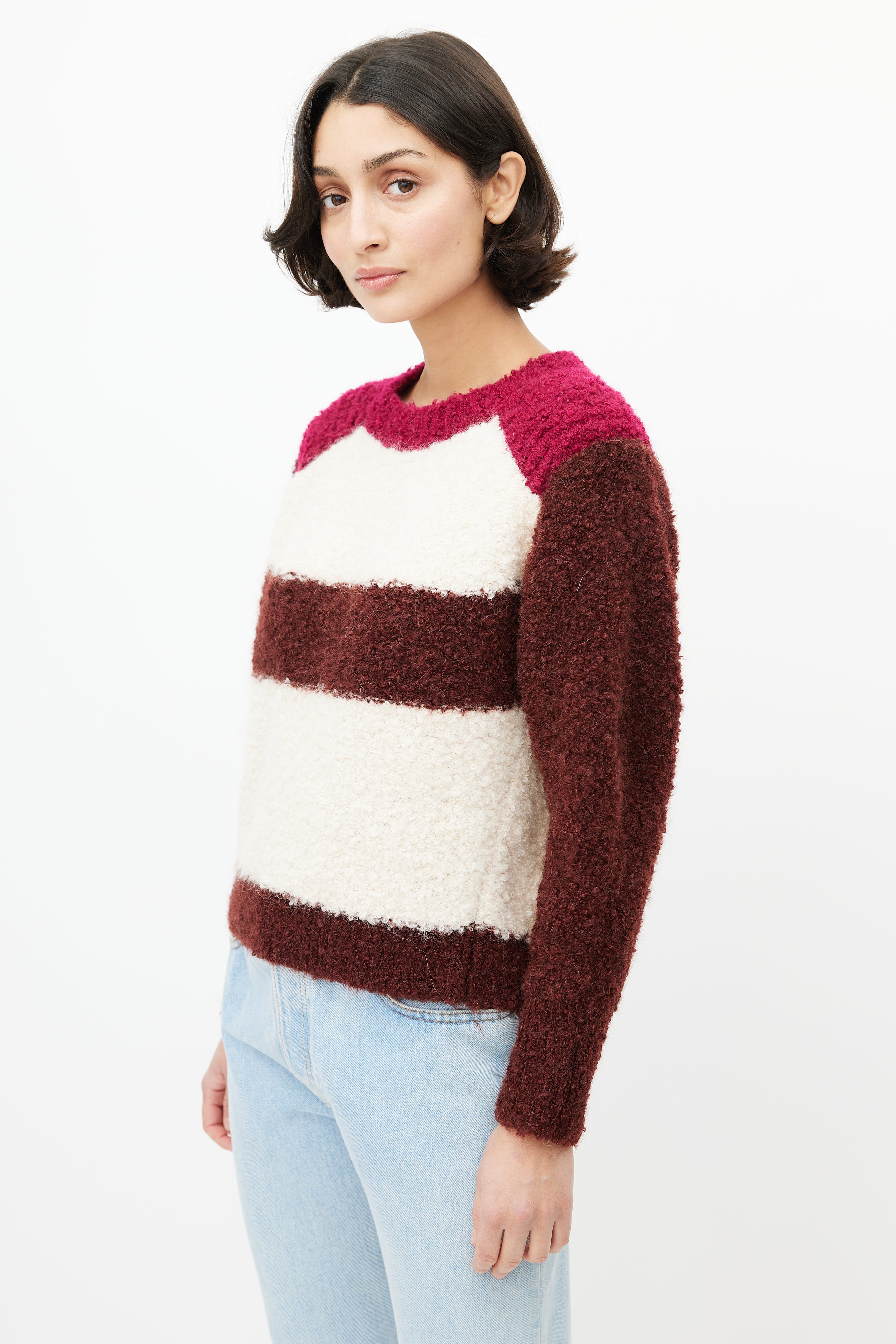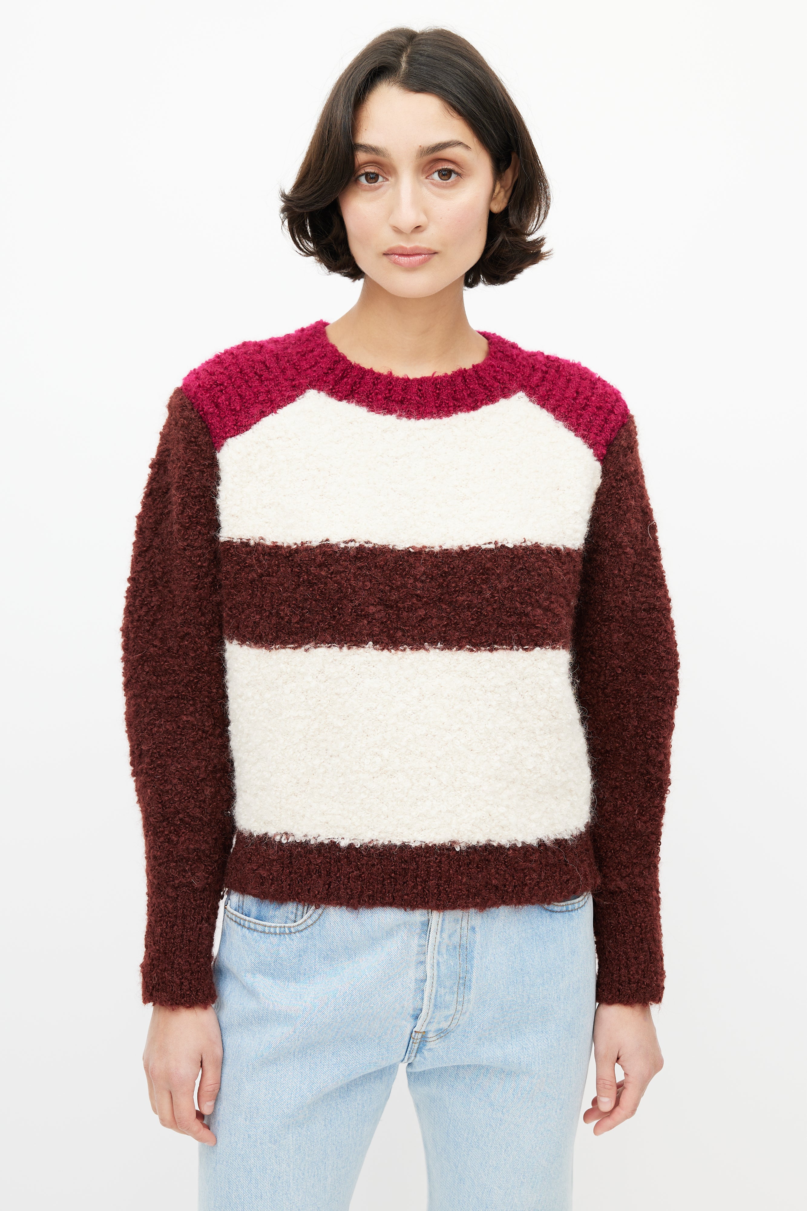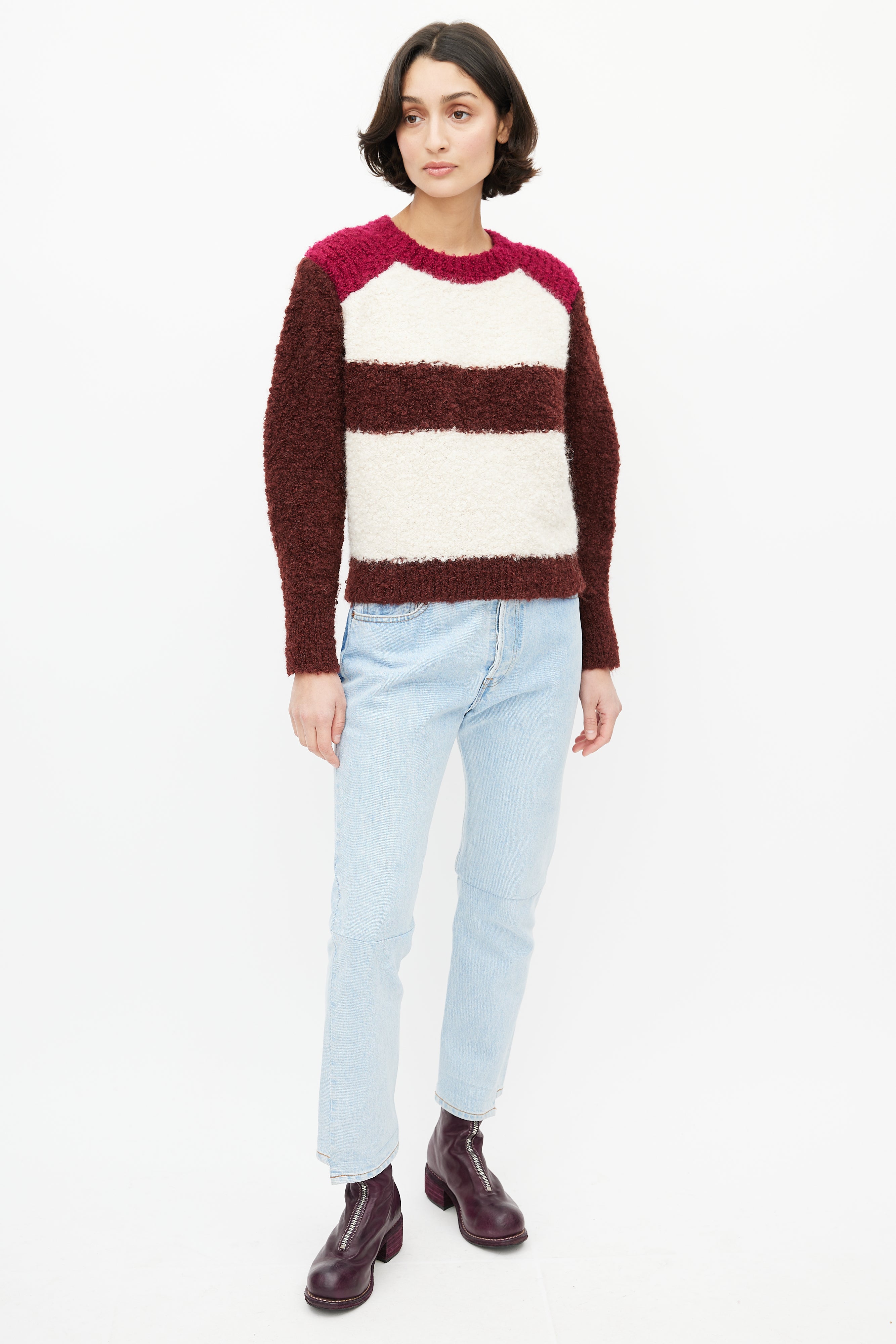 Pre-owned Isabel Marant cream mohair knit sweater featuring a burgundy stripe knit at front, round neckline, and ribbed hem.