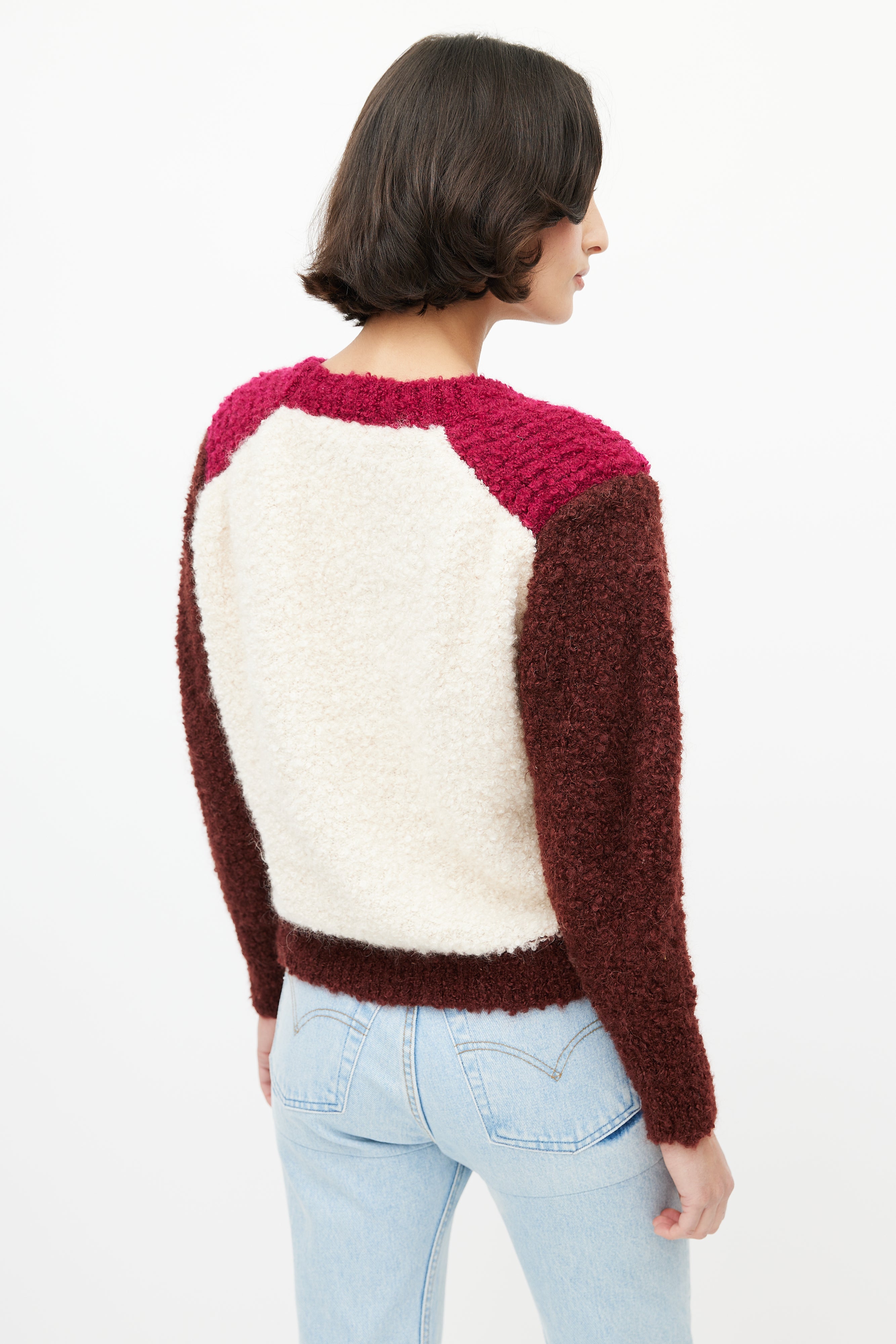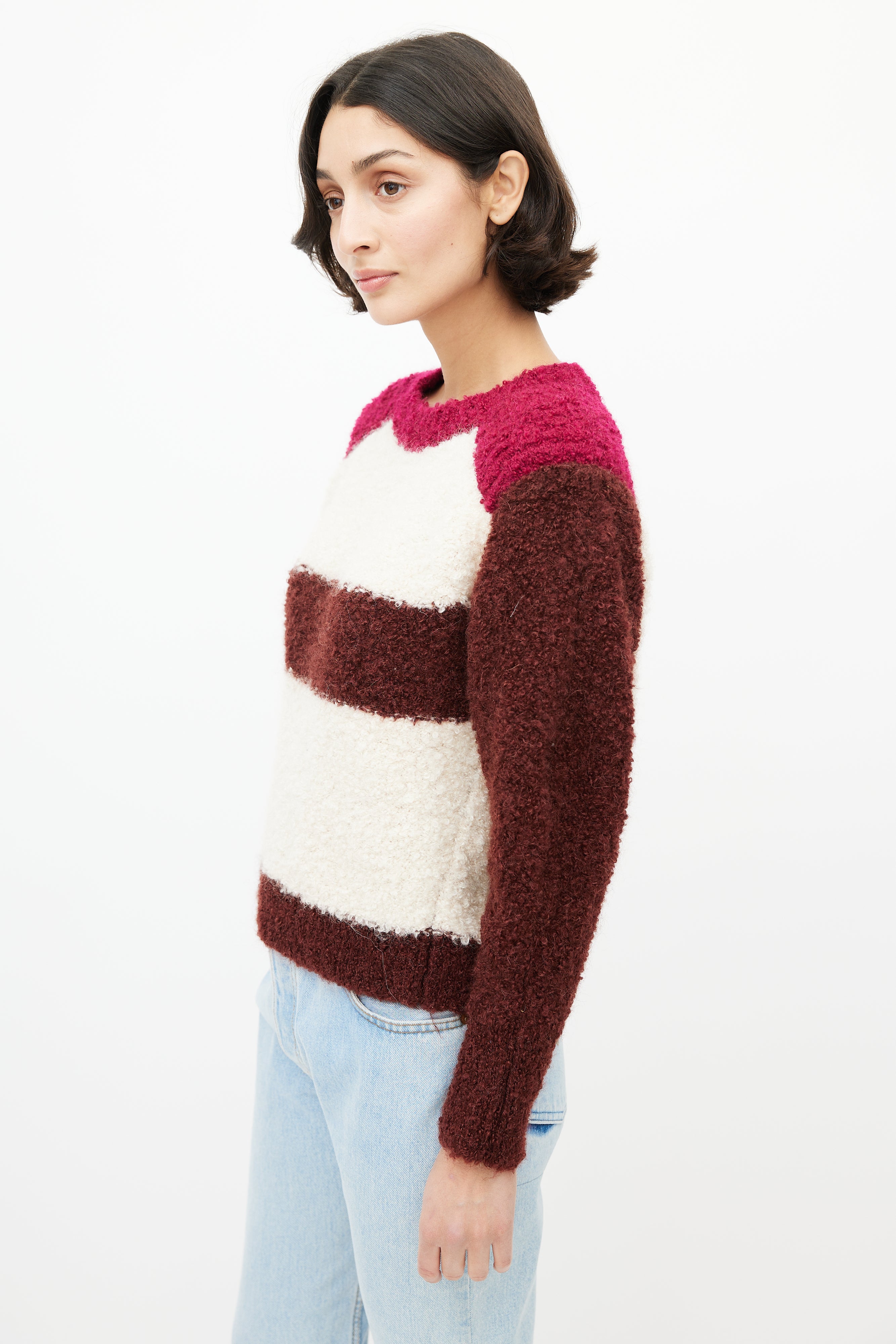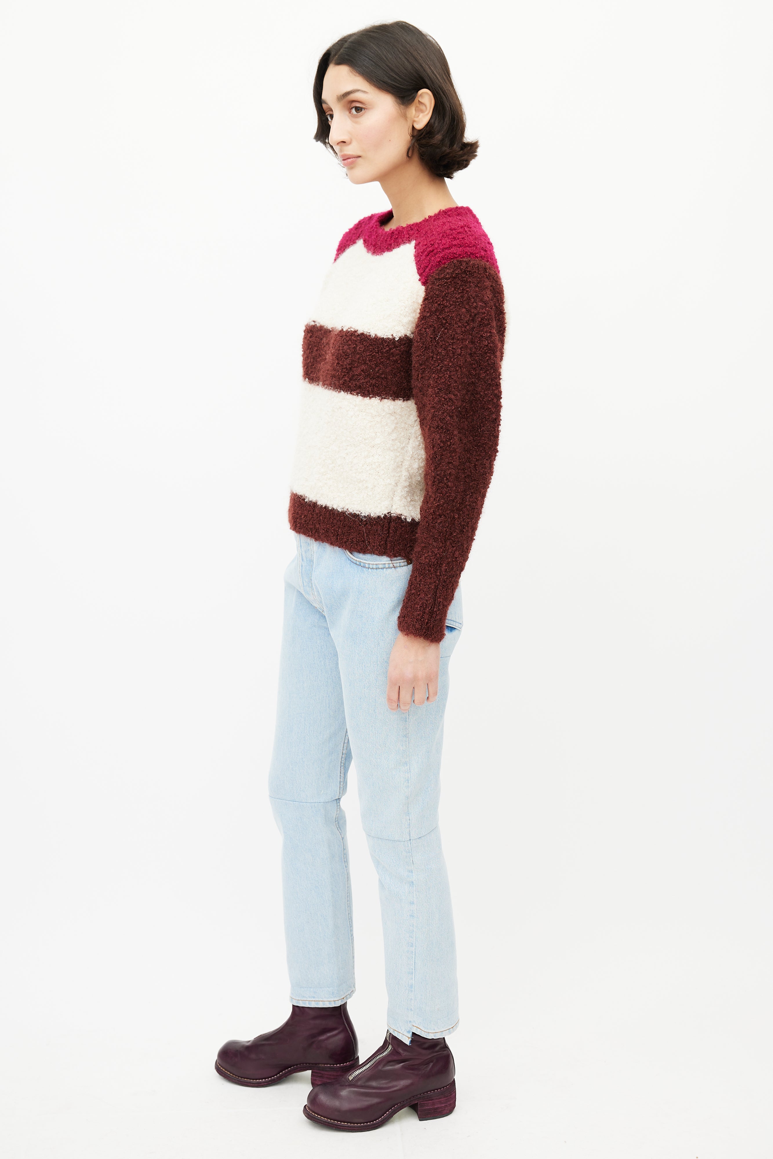 Pre-owned Isabel Marant cream mohair knit sweater featuring a burgundy stripe knit at front, round neckline, and ribbed hem.