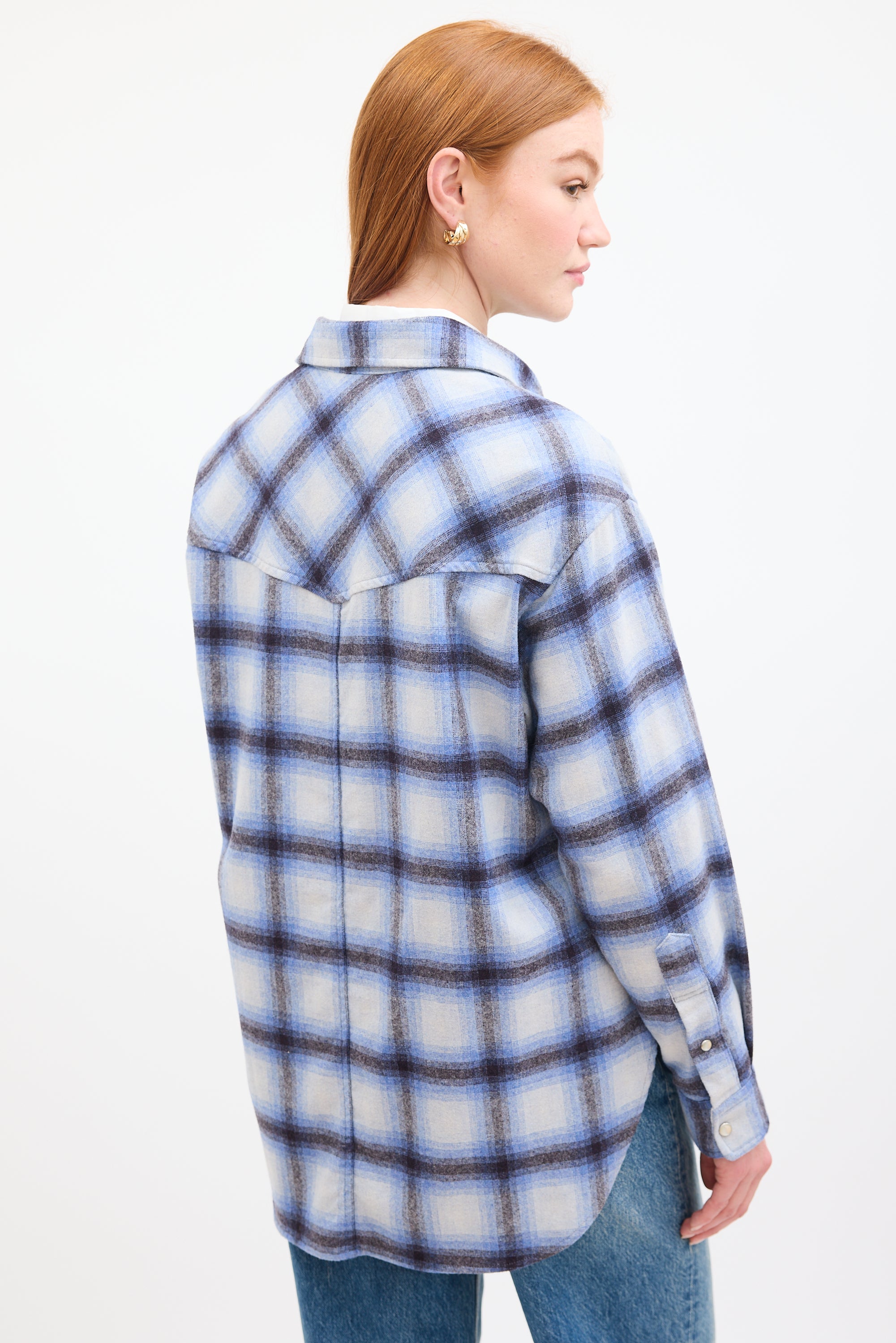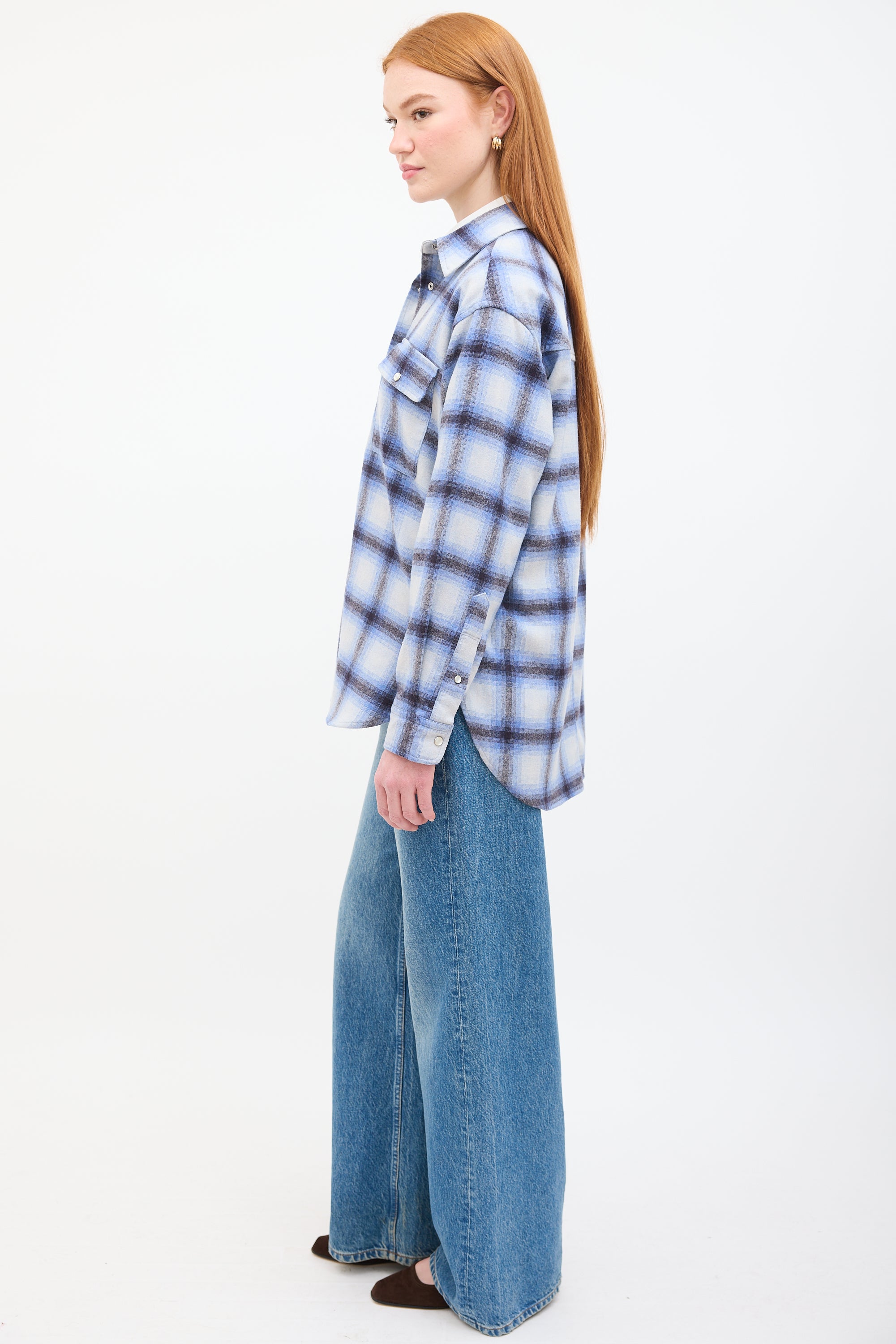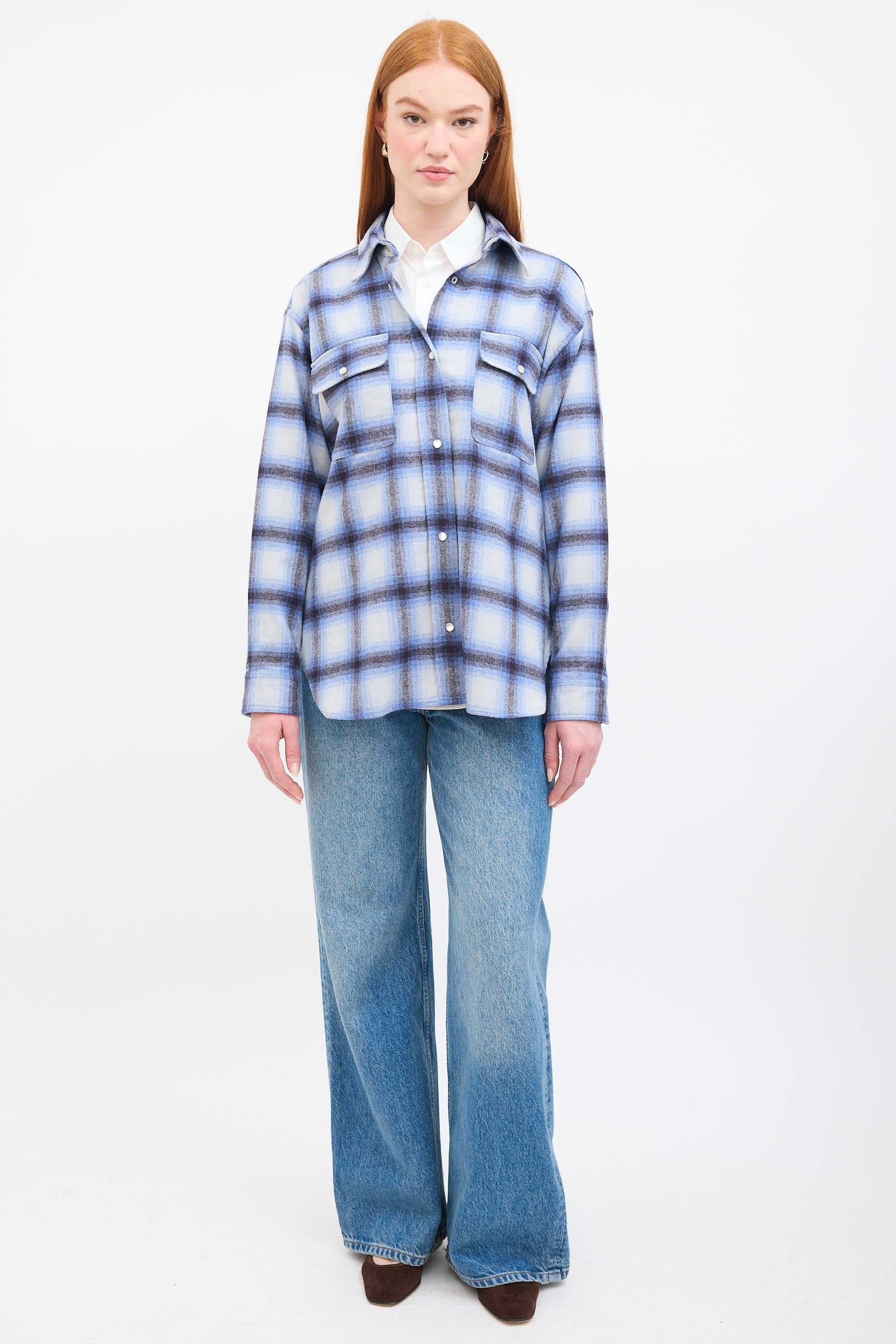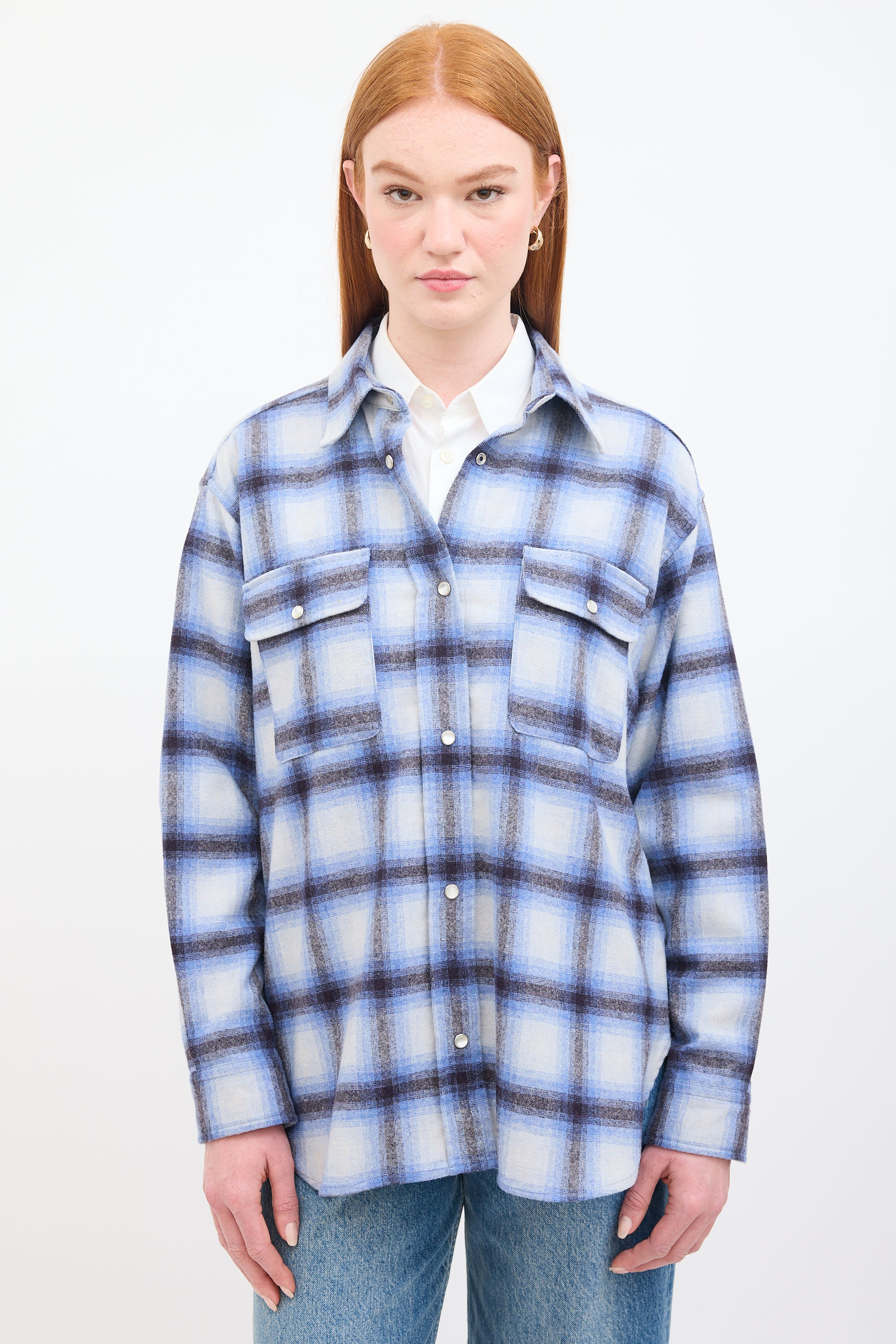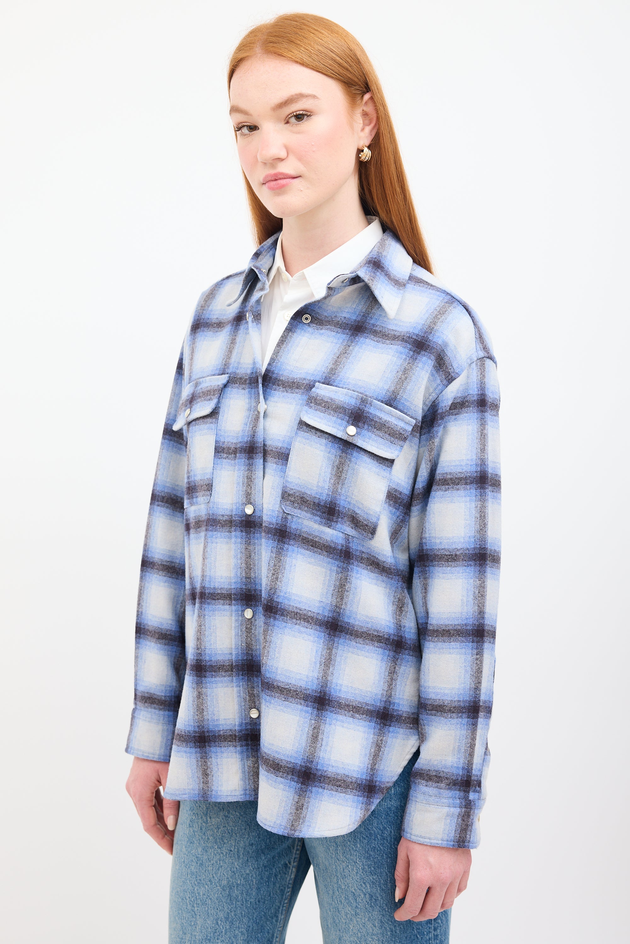 Pre-owned Isabel Marant Étoile blue and black wool plaid Marcela shirt featuring pointed collar, flap patch pockets at chest, snap button up front, and scoop hem.
