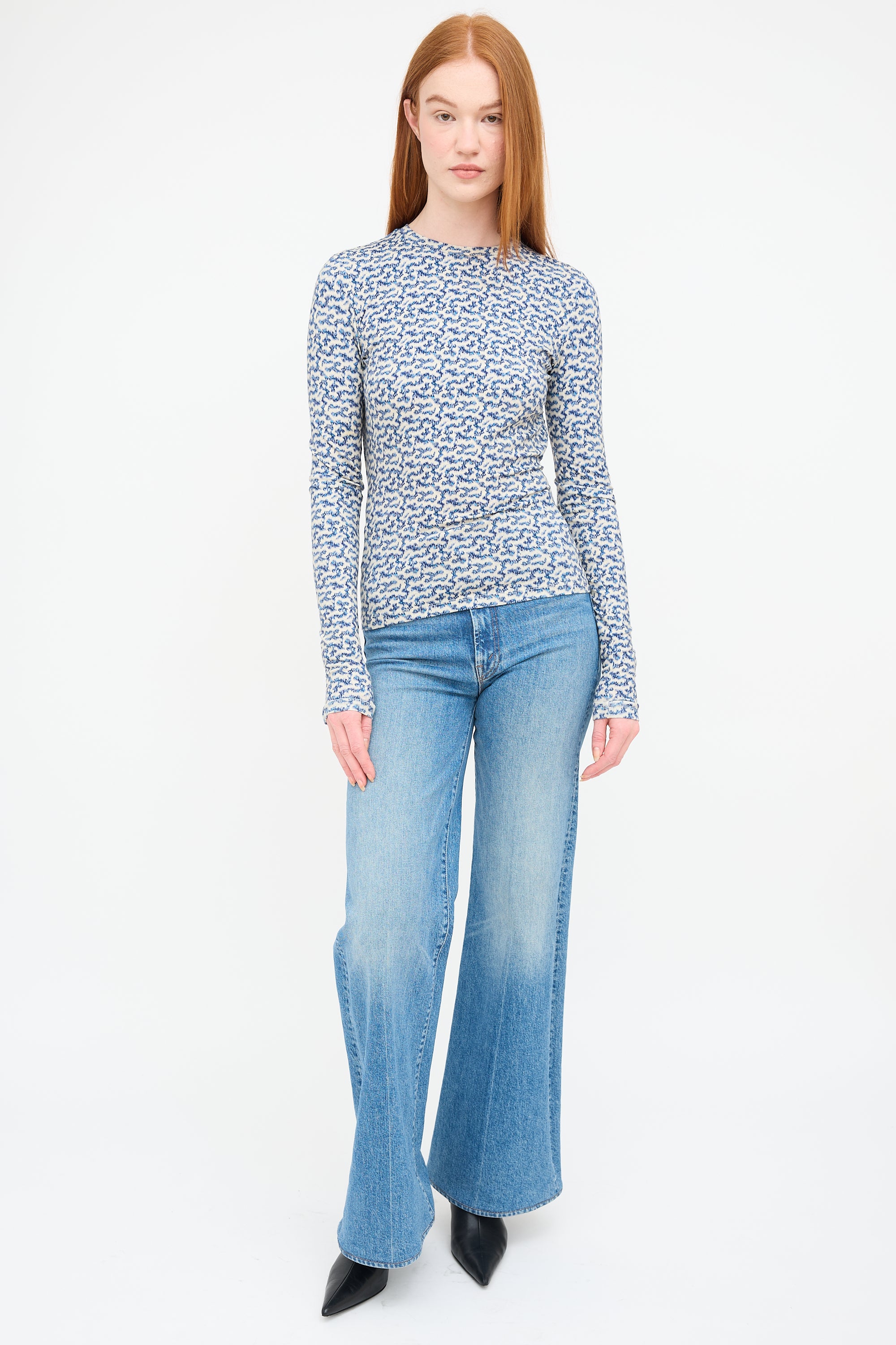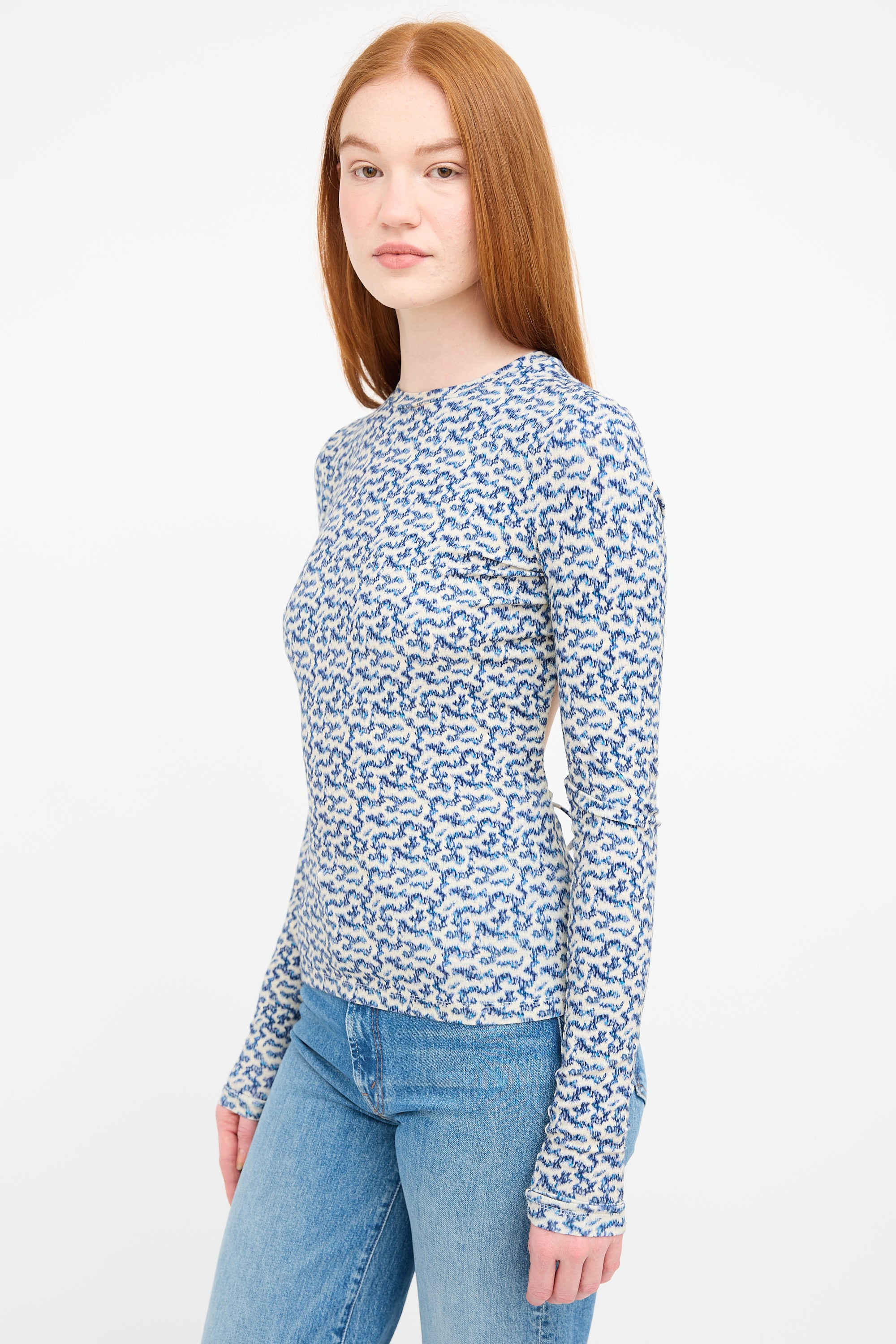Pre-owned Isabel Marant Étoile blue and cream Leonio Printed Stretch top featuring crew neckline and back cut out with waist tie.