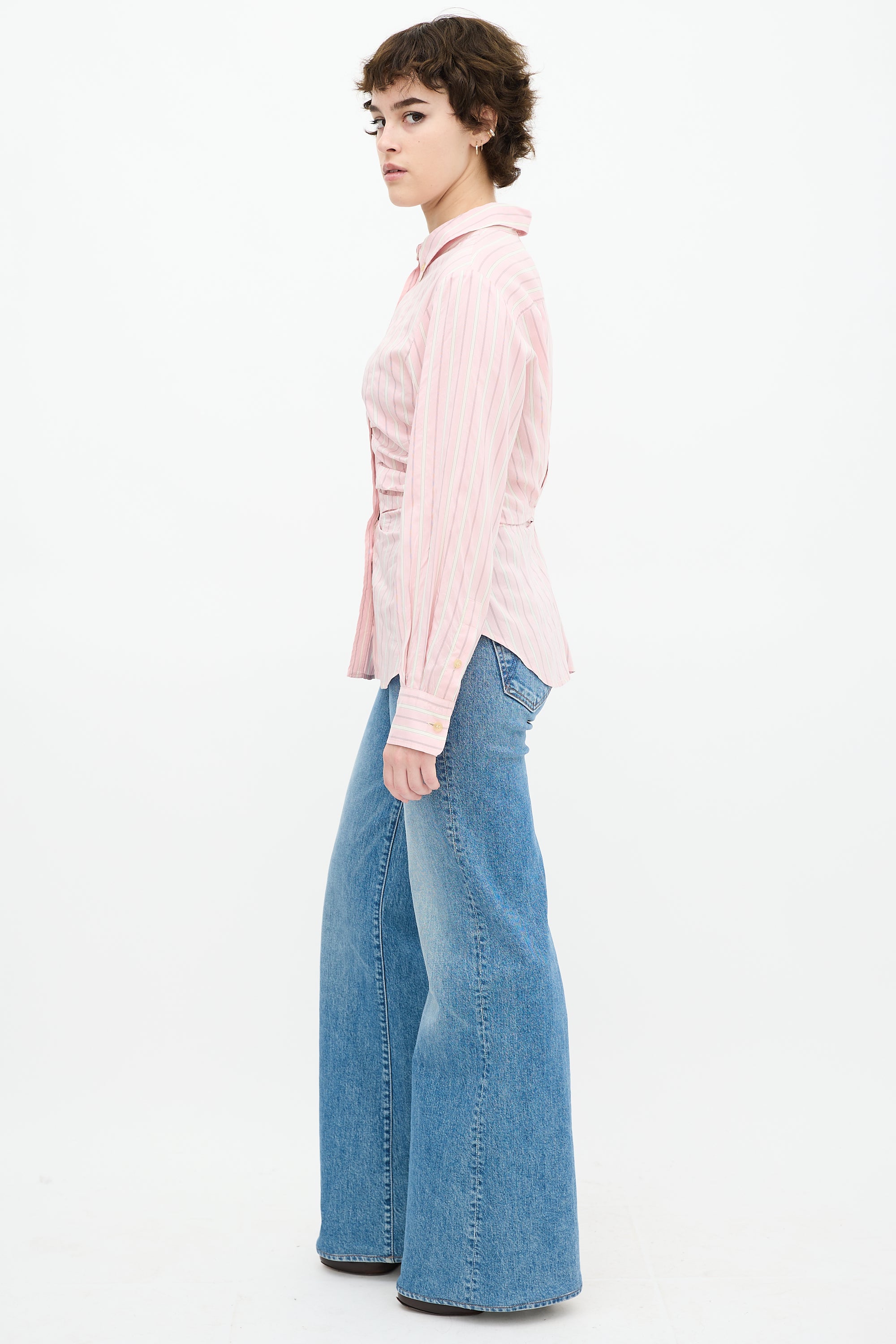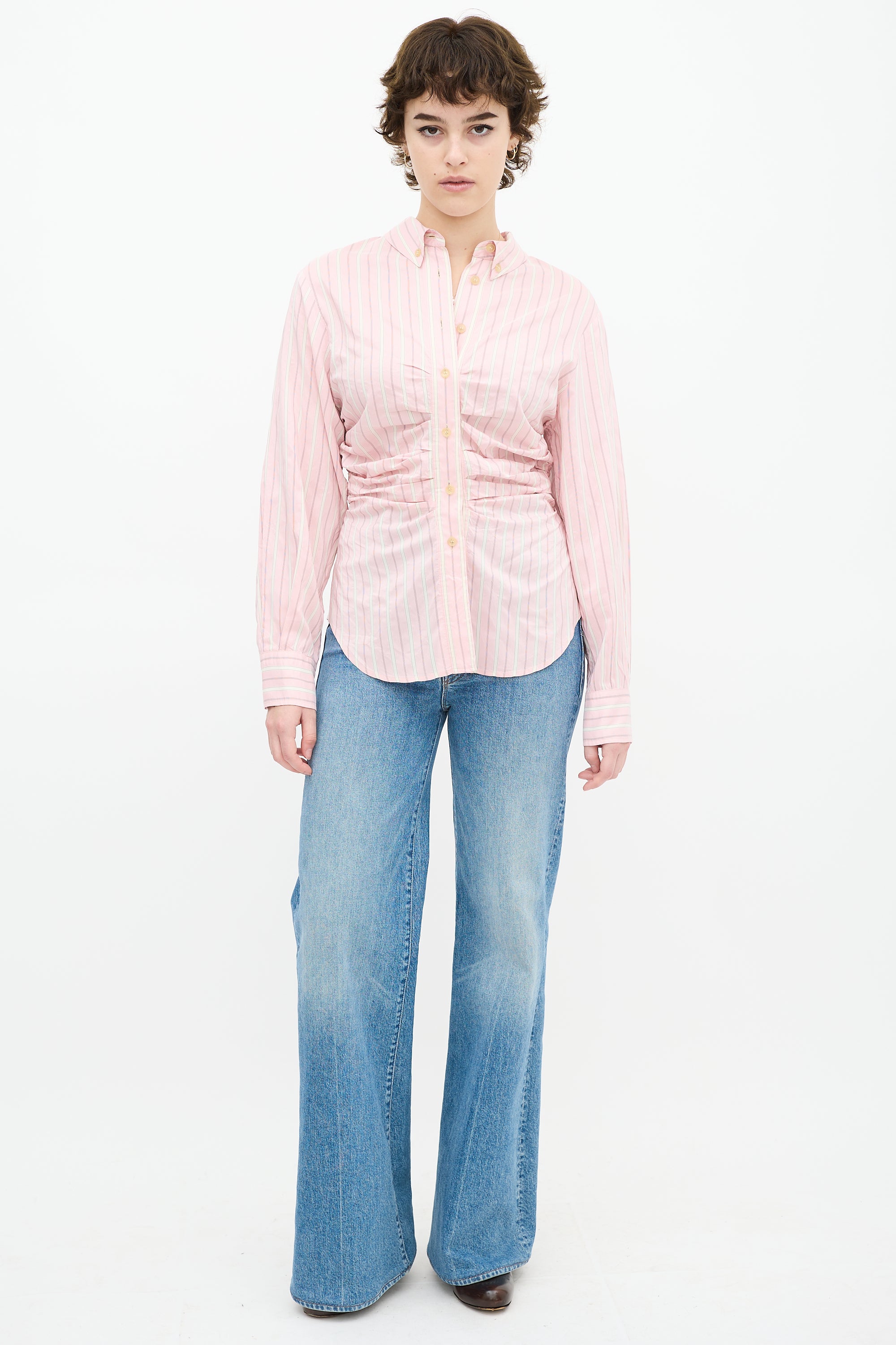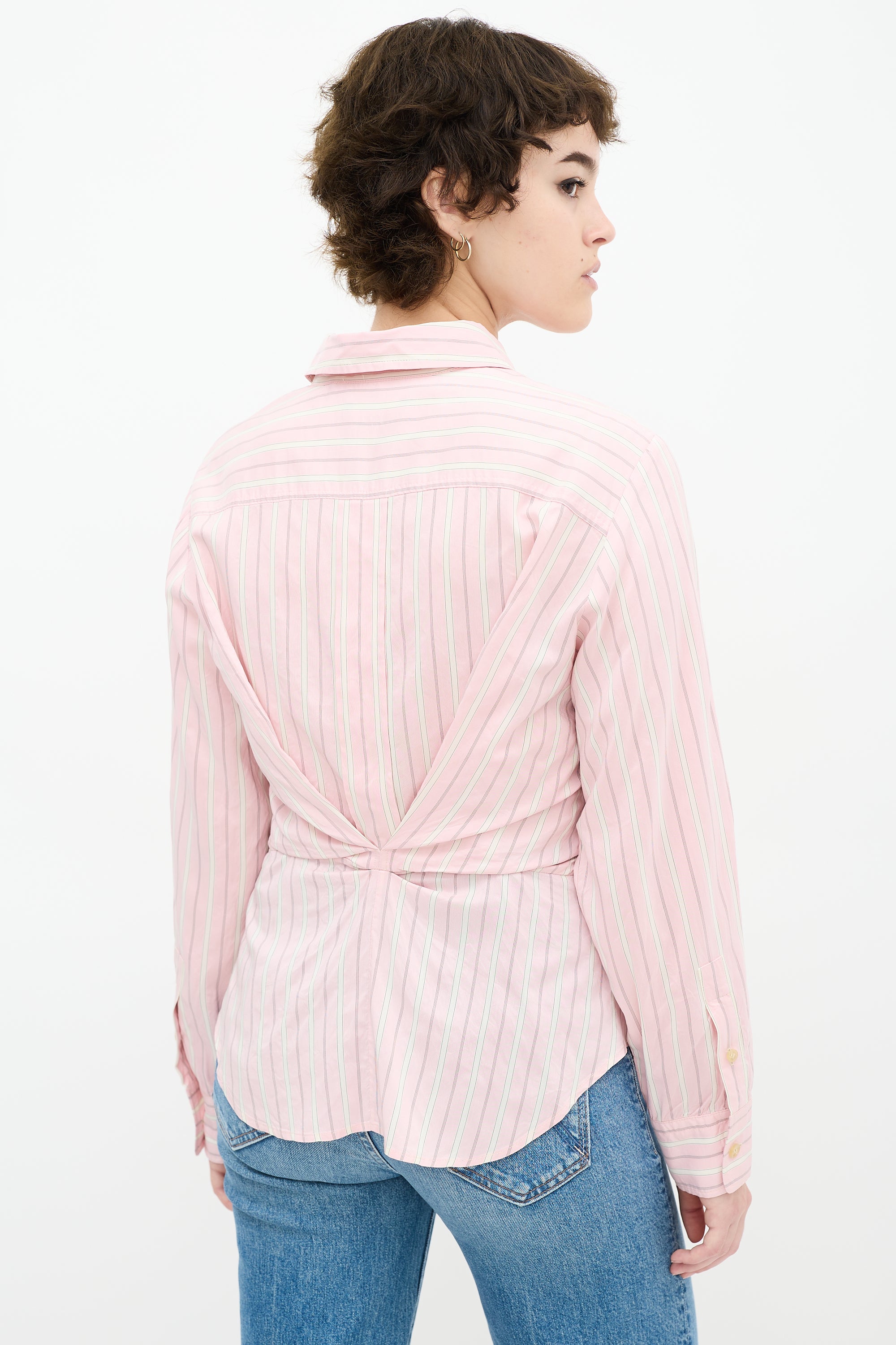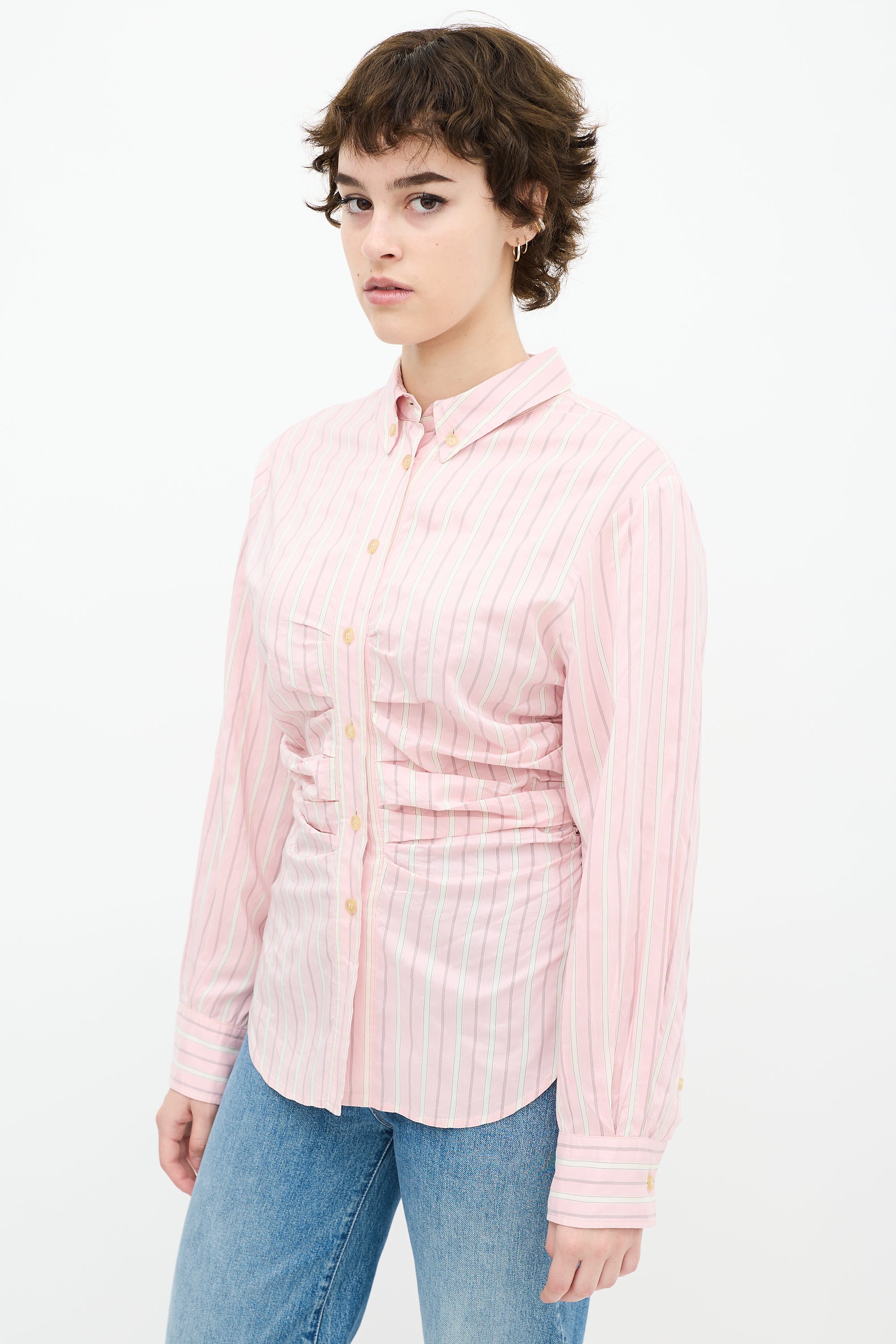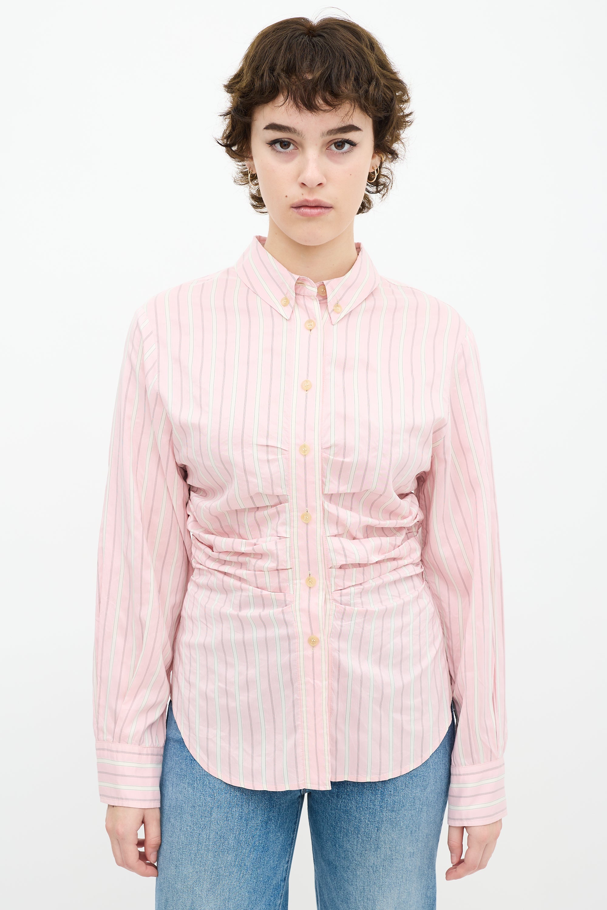 Pre-owned Isabel Marant pink silk shirt featuring a white striped pattern throughout, pointed button down collar, long sleeves with buttoned cuffs, pleated bust, and button up closure. Lined.
