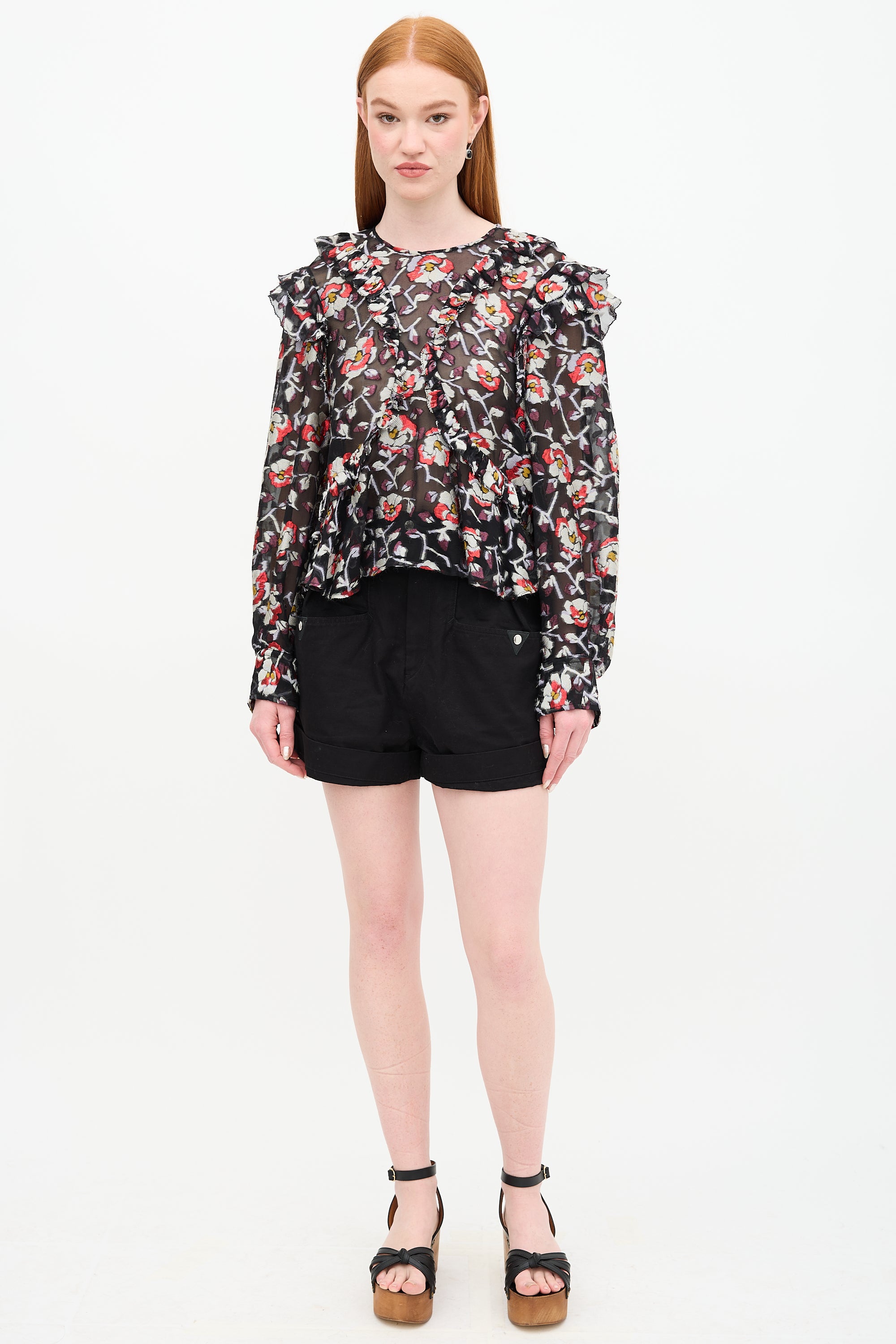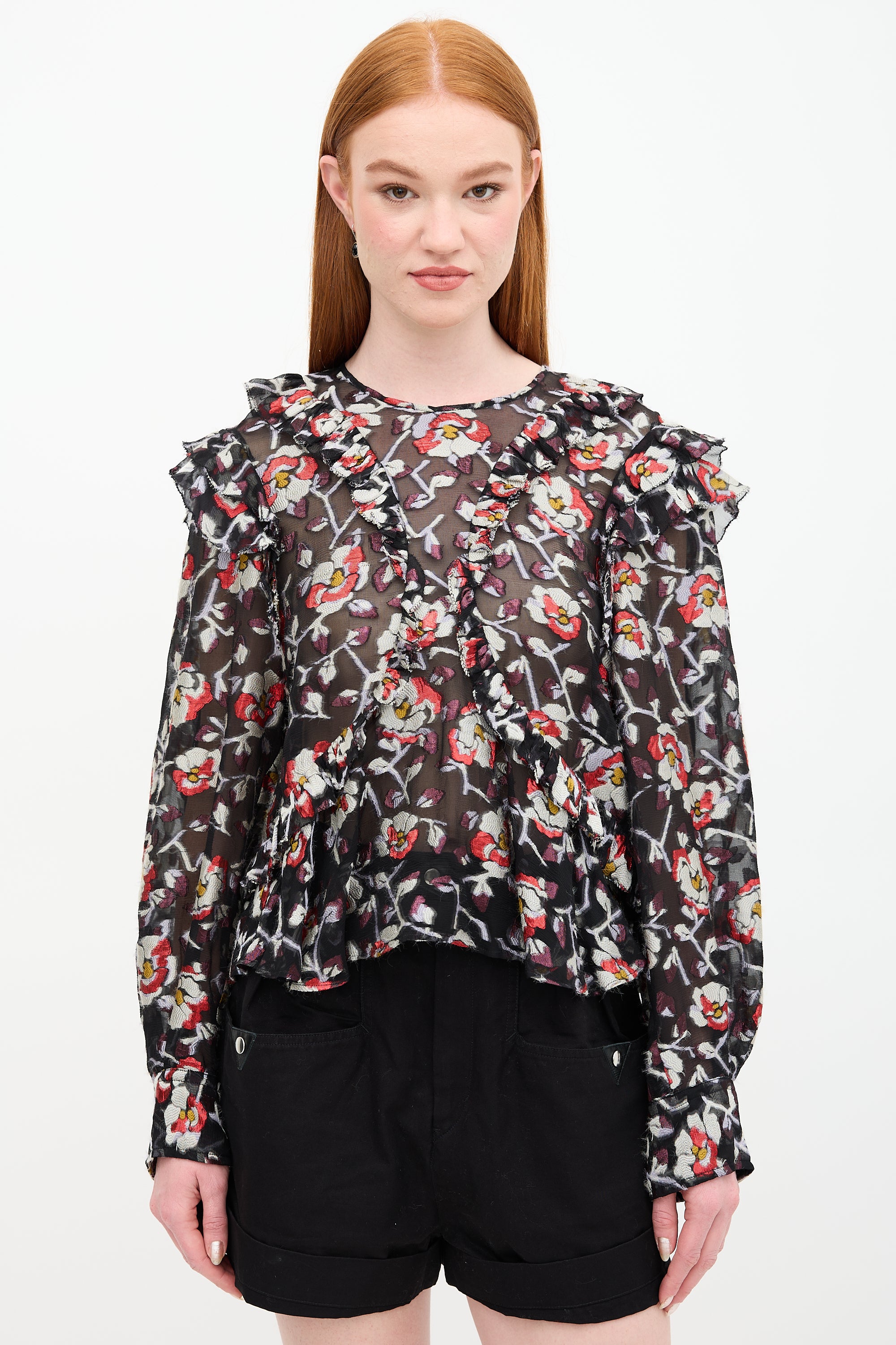 Pre-owned Isabel Marant black sheer blouse featuring multicolour metallic floral embroidery, round neckline, ruffle front, back, and shoulders, back cut out, puff sleeve, and back neck hook and eye closure. Unlined.