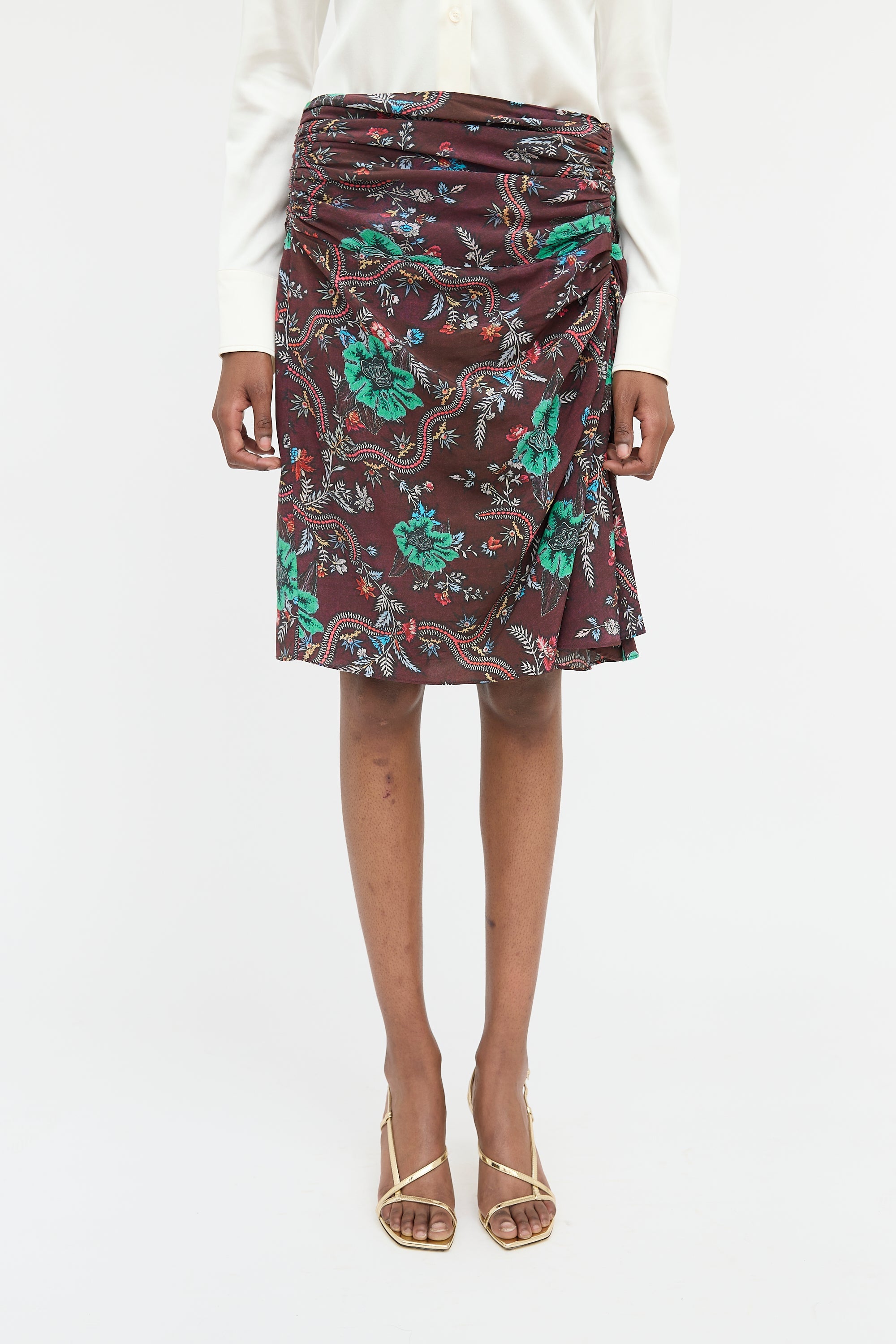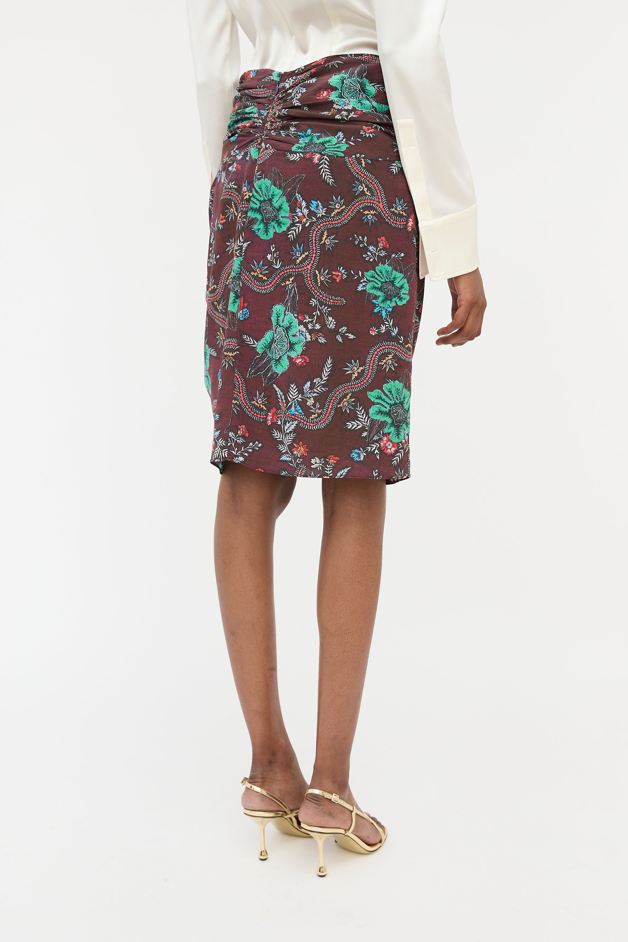 Pre-owned Isabel Marant burgundy silk blend skirt featuring multicolour floral print, ruched sides and back, and concealed back zip. Lined.