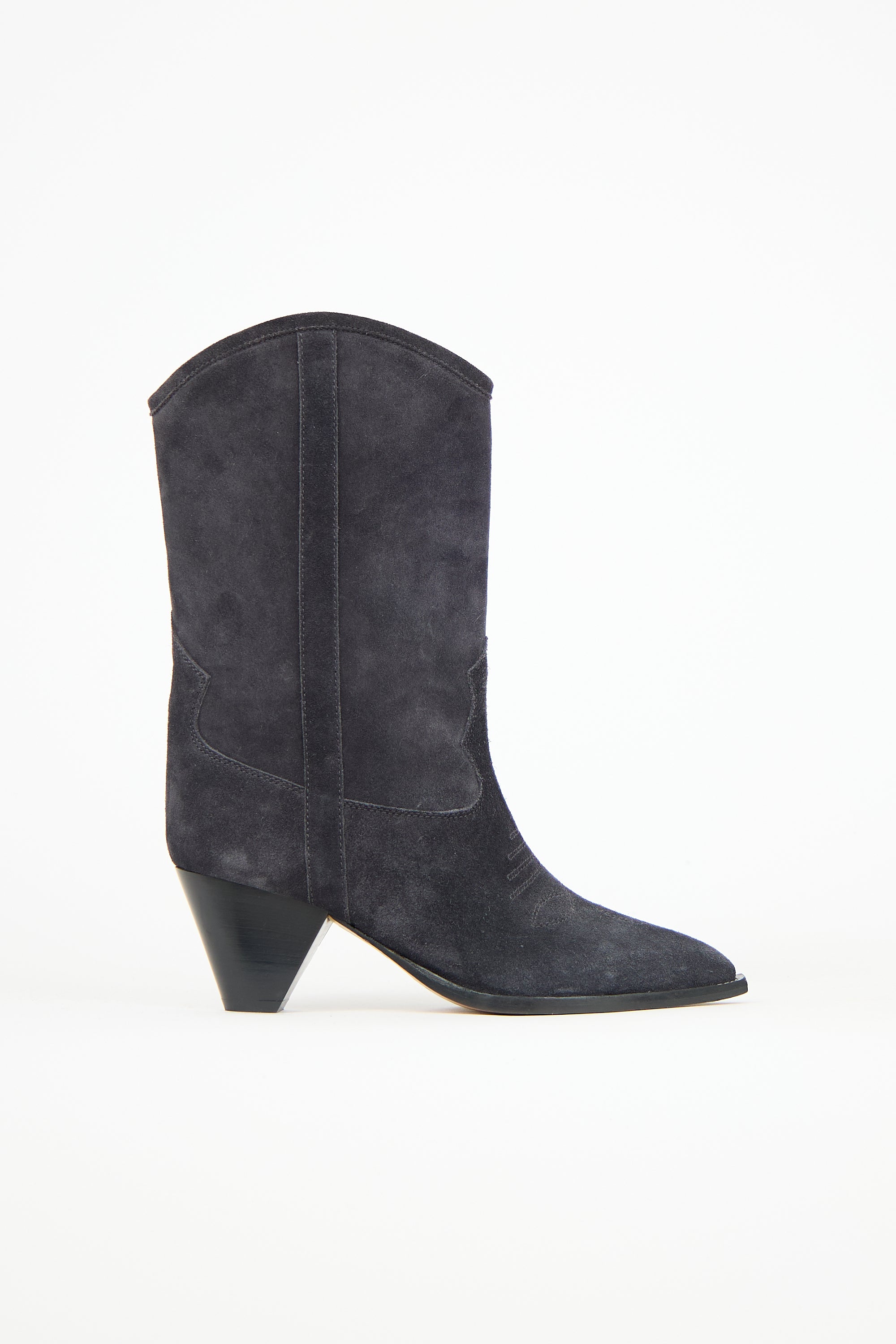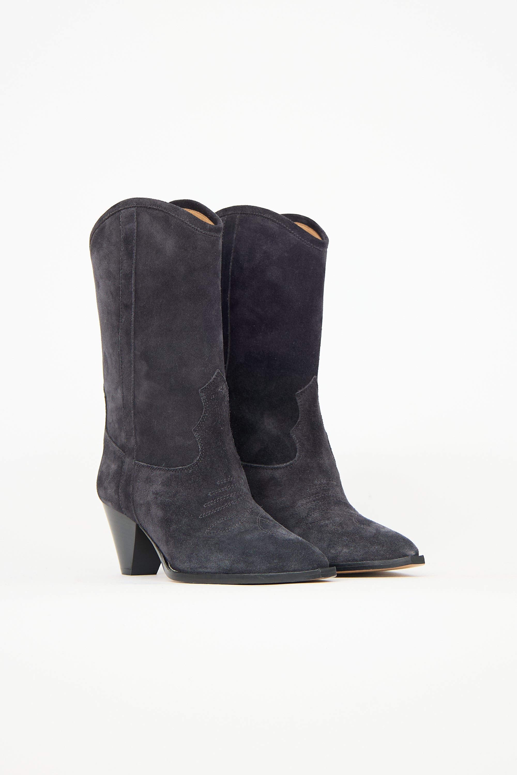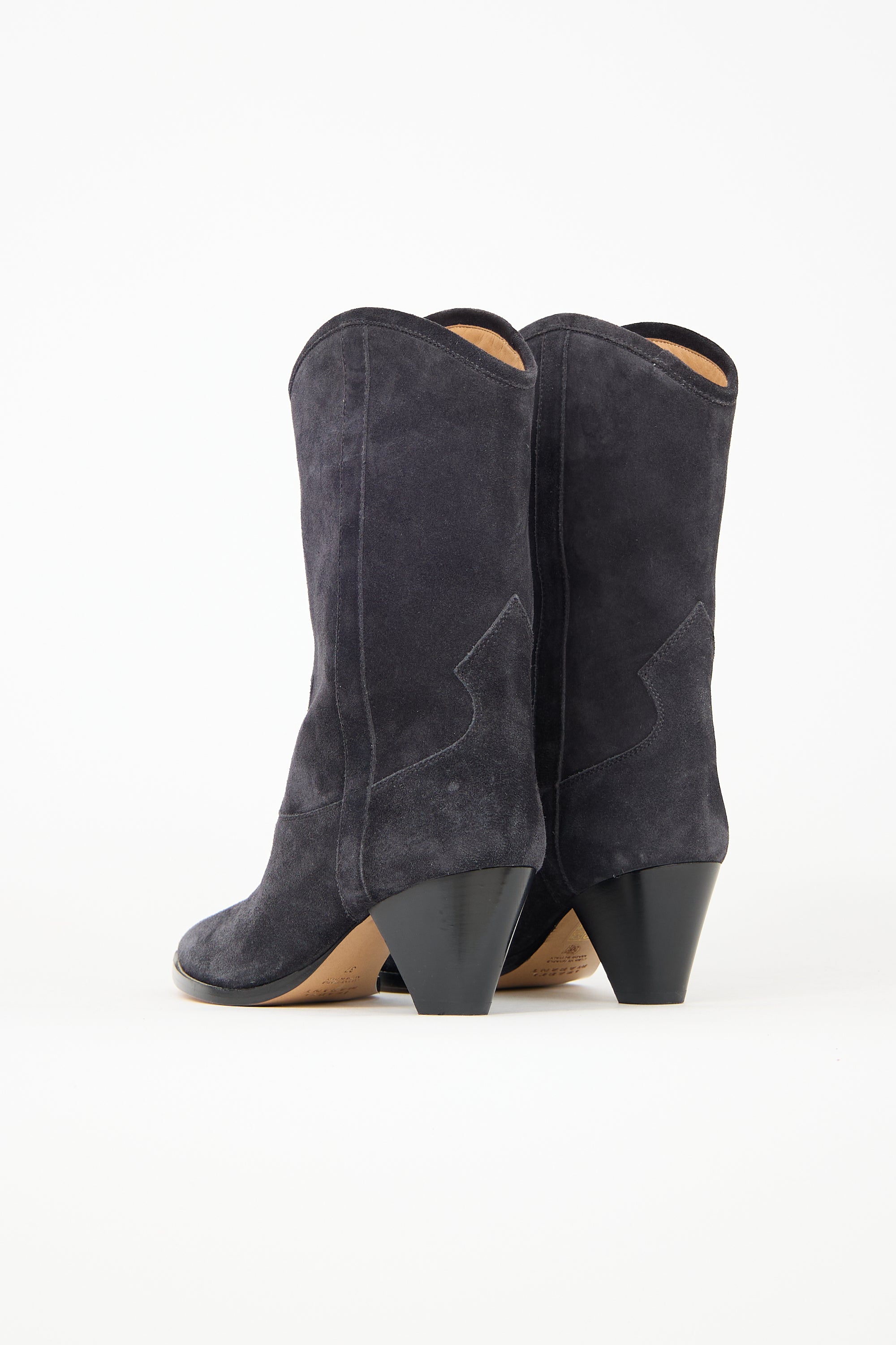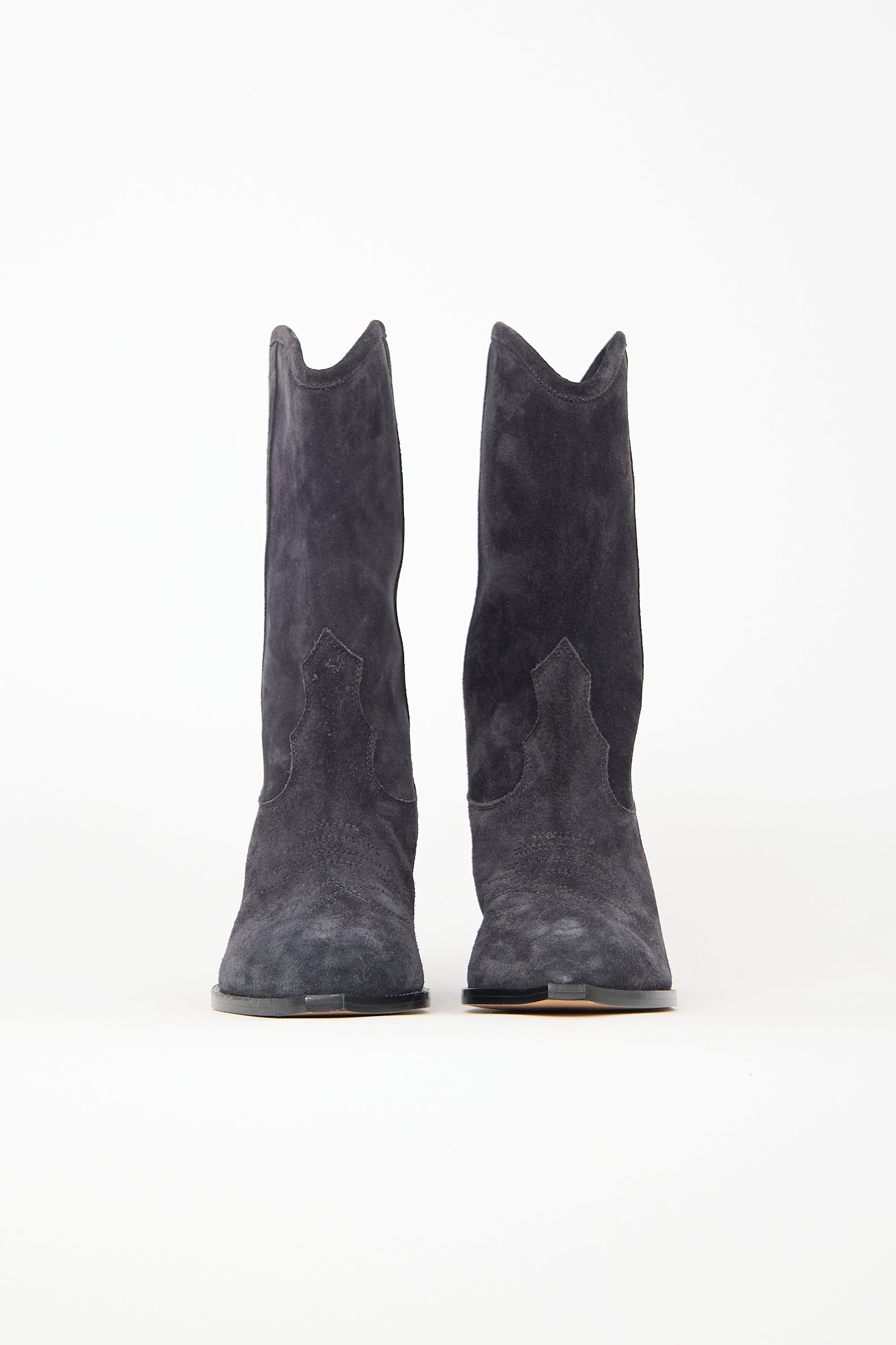 Pre-owned Isabel Marant navy suede Duerto boots featuring pointed toe, western embroidery at vamp, pull on entry, and stacked block heel.