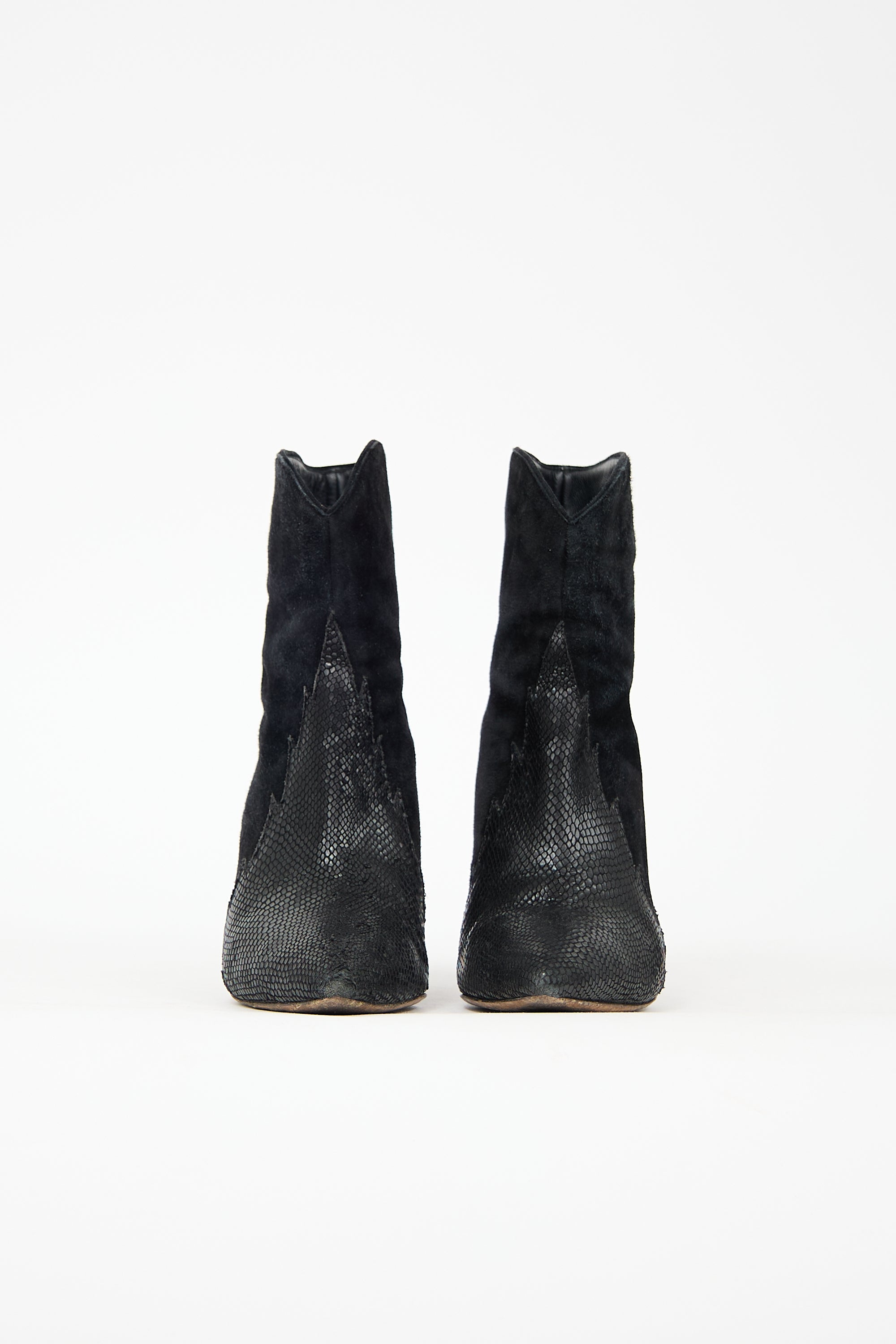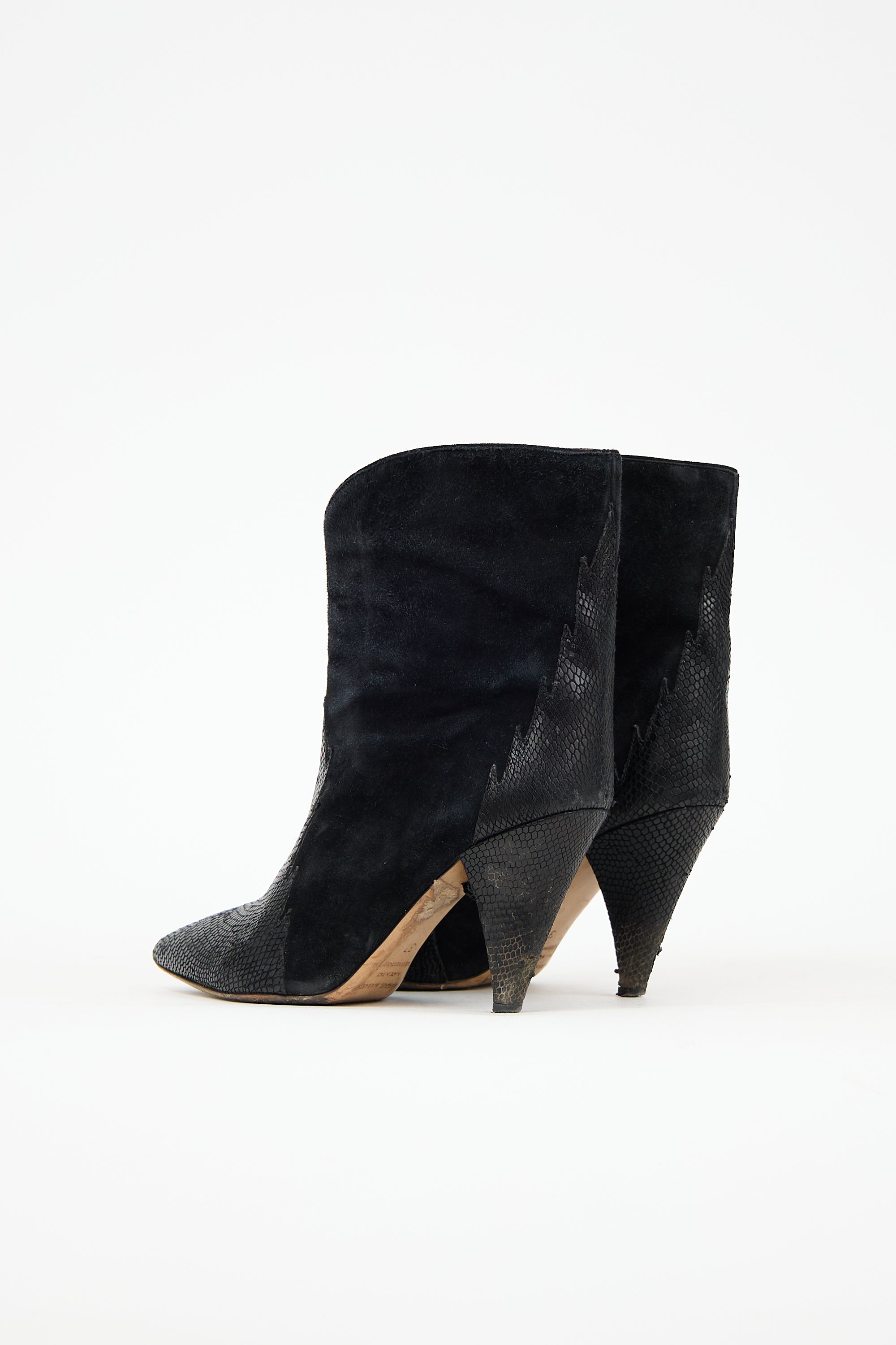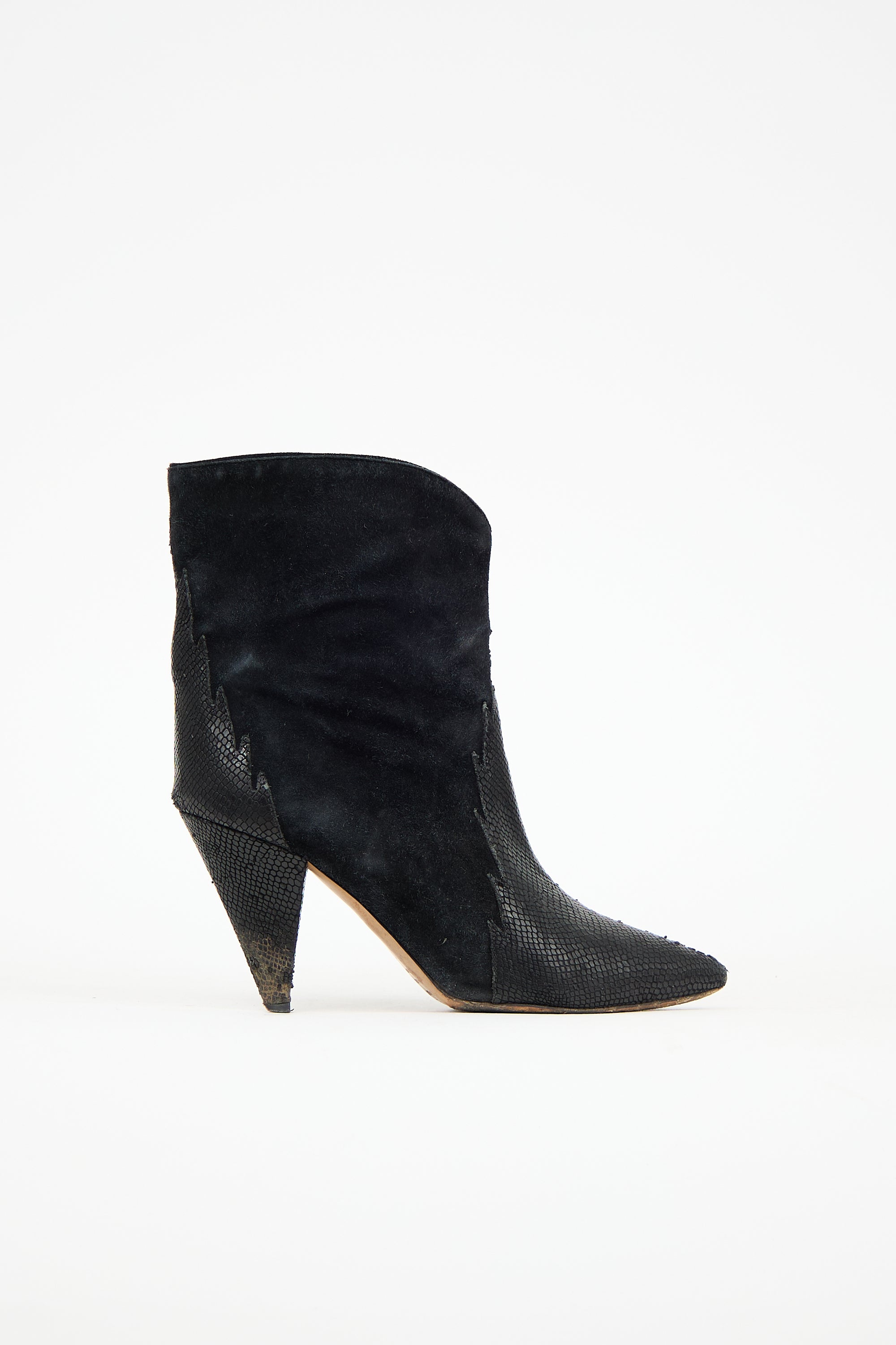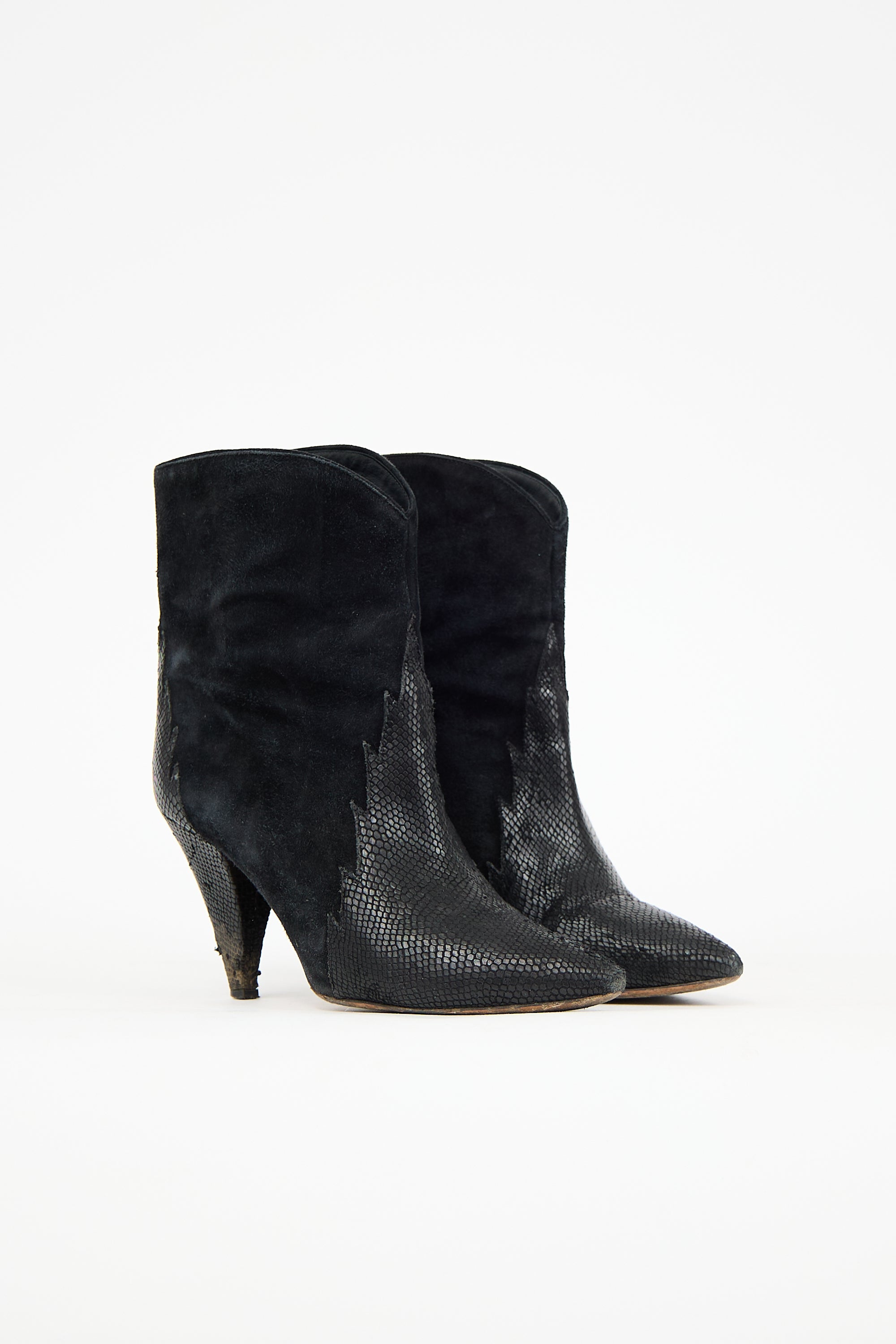 Pre-owned Isabel Marant black suede Leider boots featuring a pointed toe, western style embossed leather croc panel at vamp and counter, slip on entry, and a covered heel.