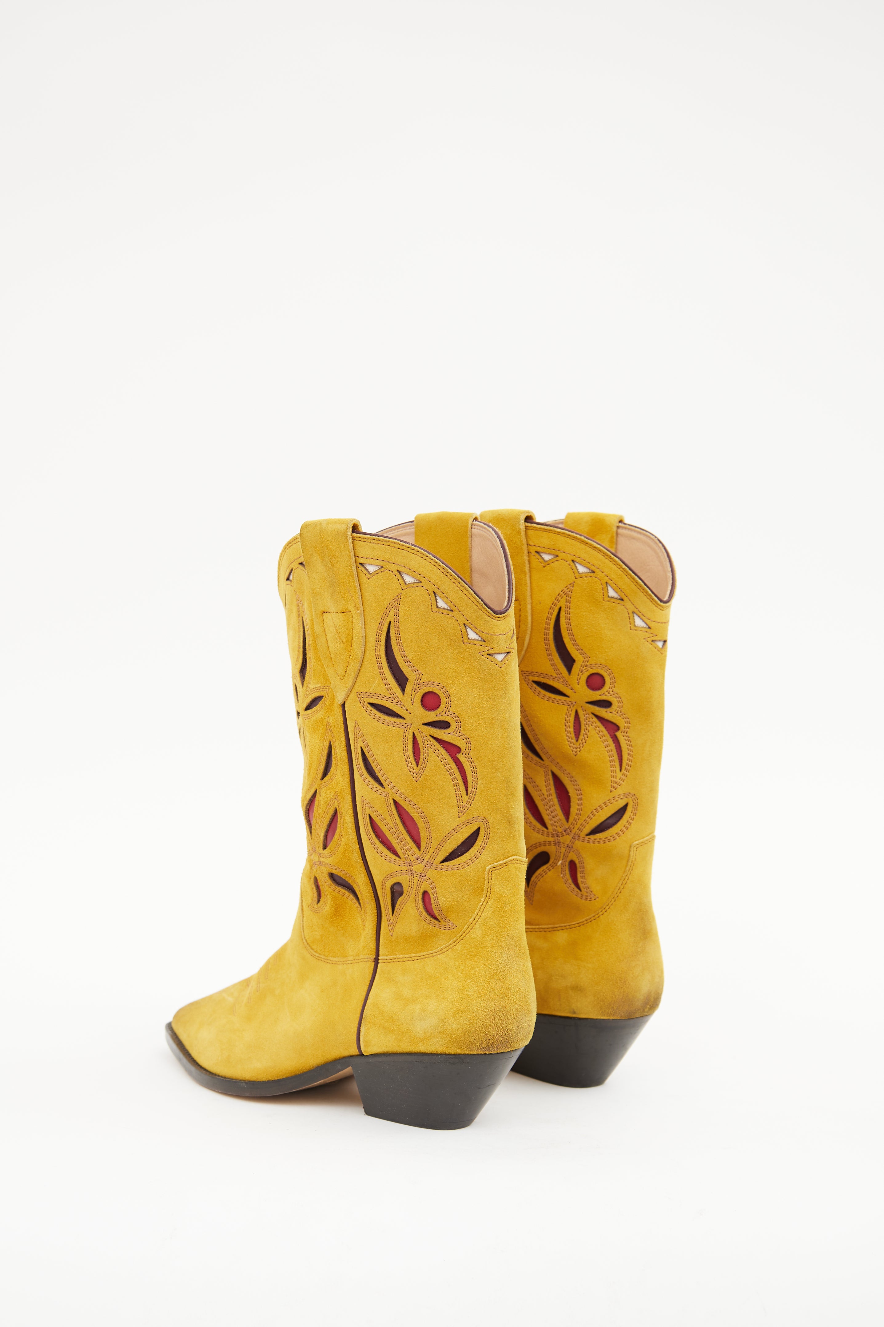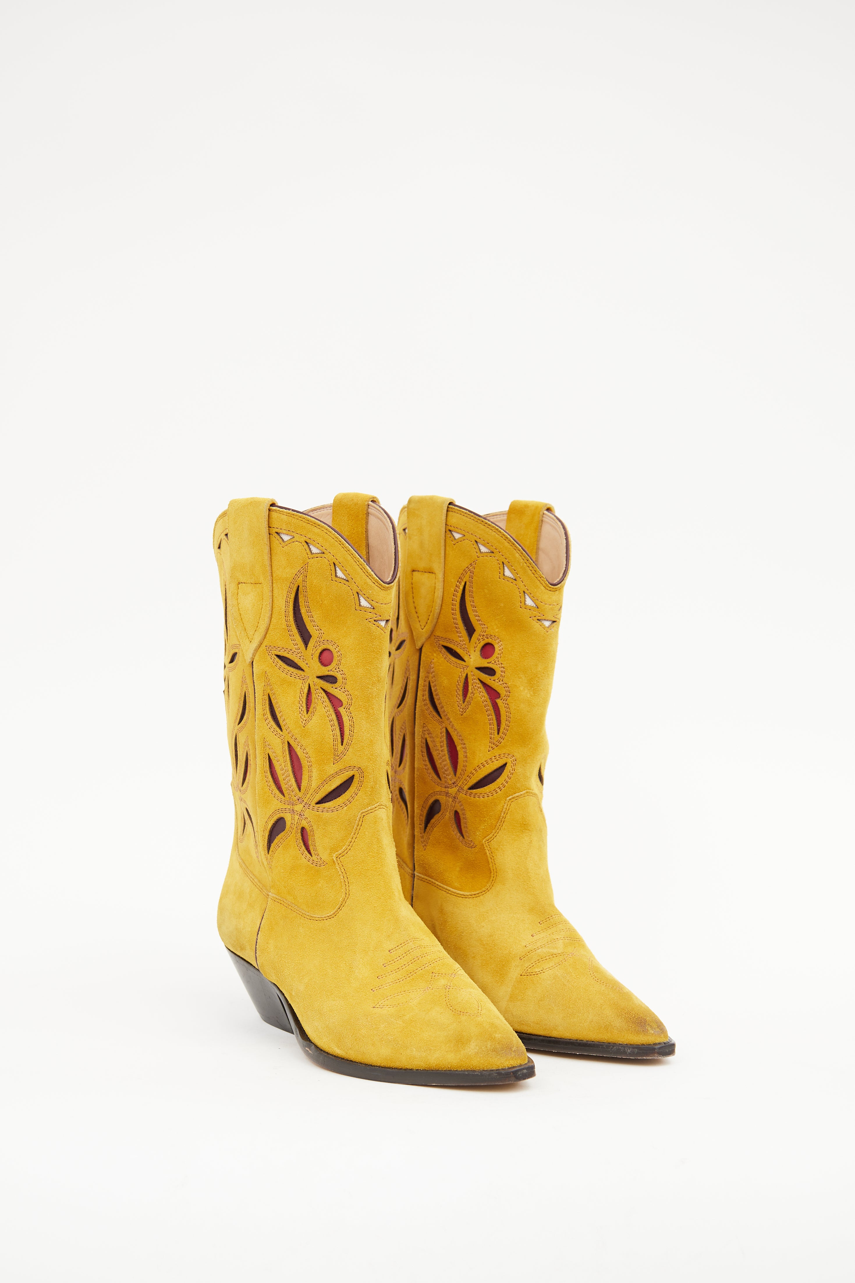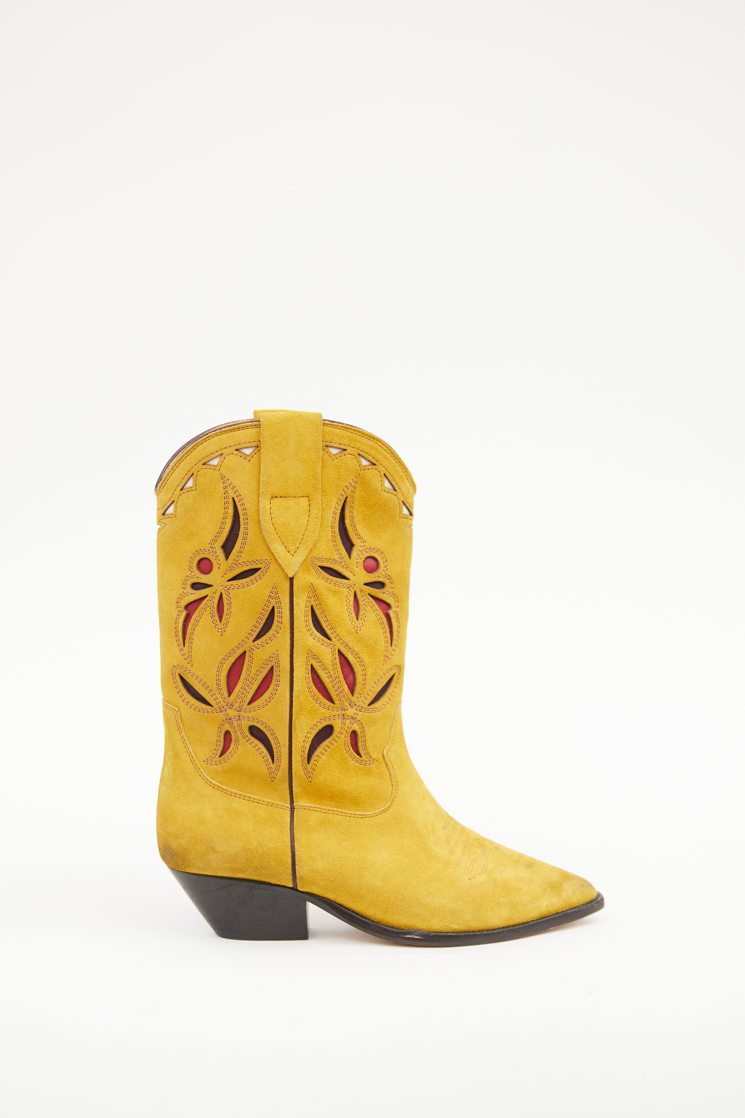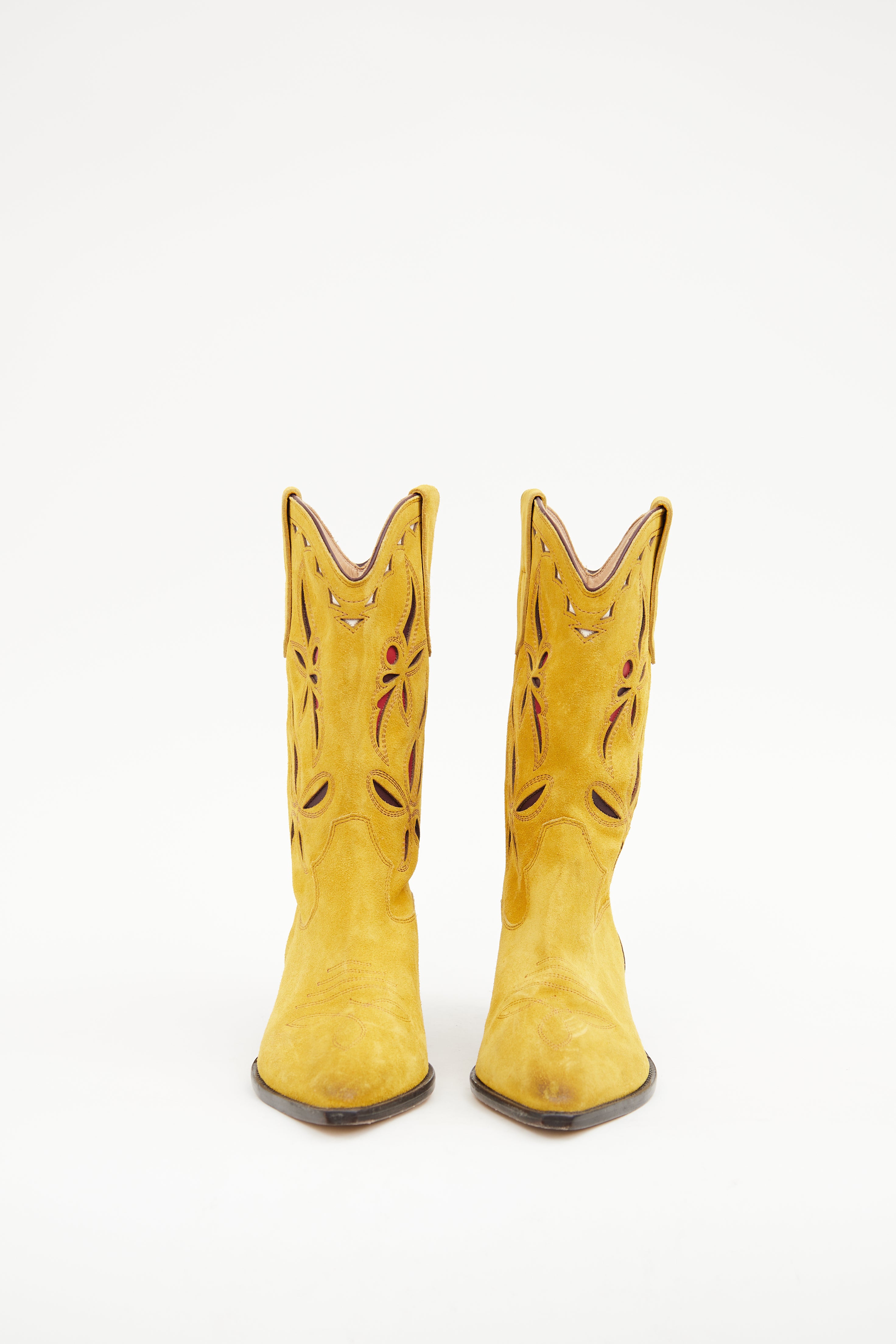 Pre-owned Isabel Marant yellow and red suede cowboy boots featuring pointed toe, western styling with cut out detail, dual pull tabs on entry and covered block heel.