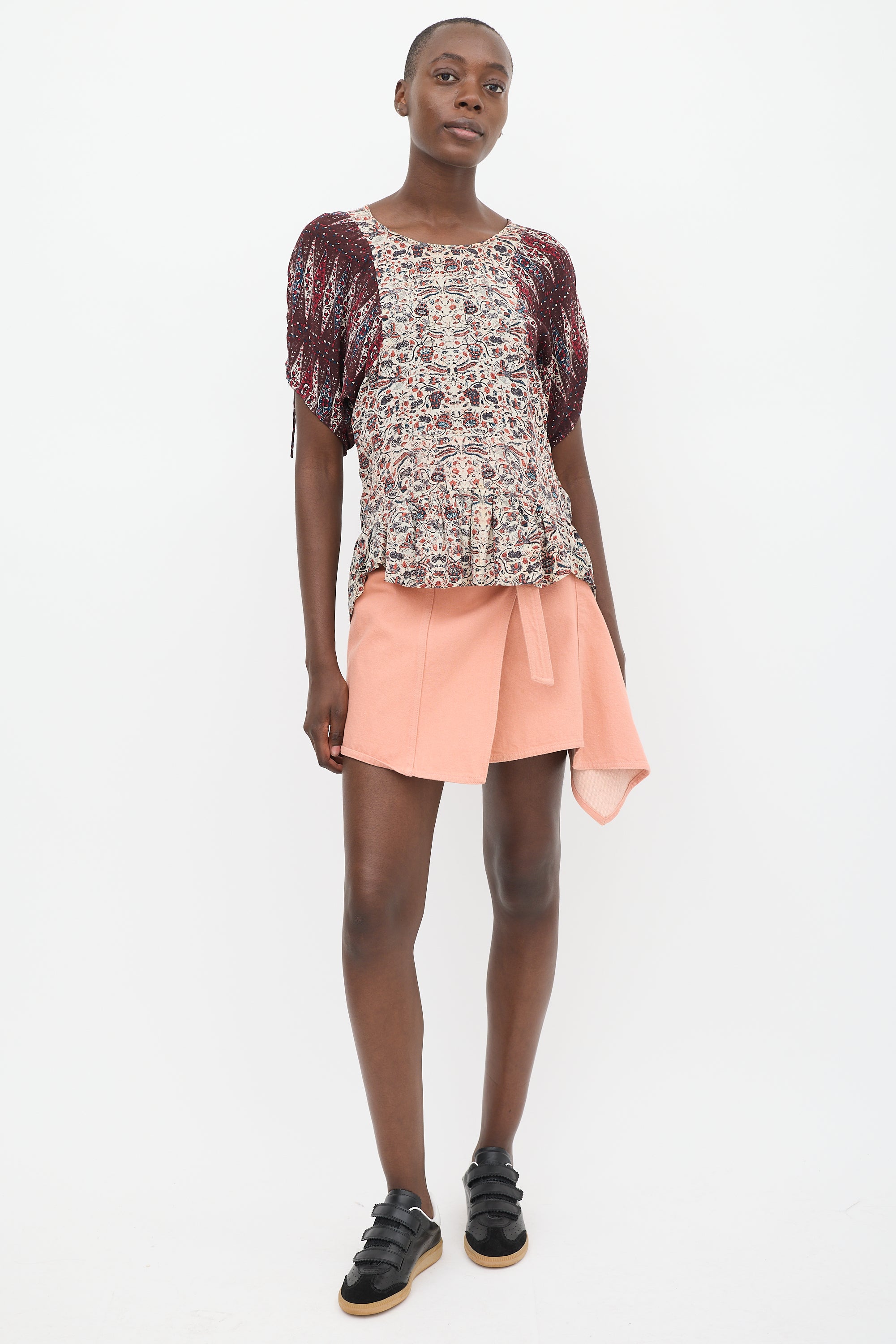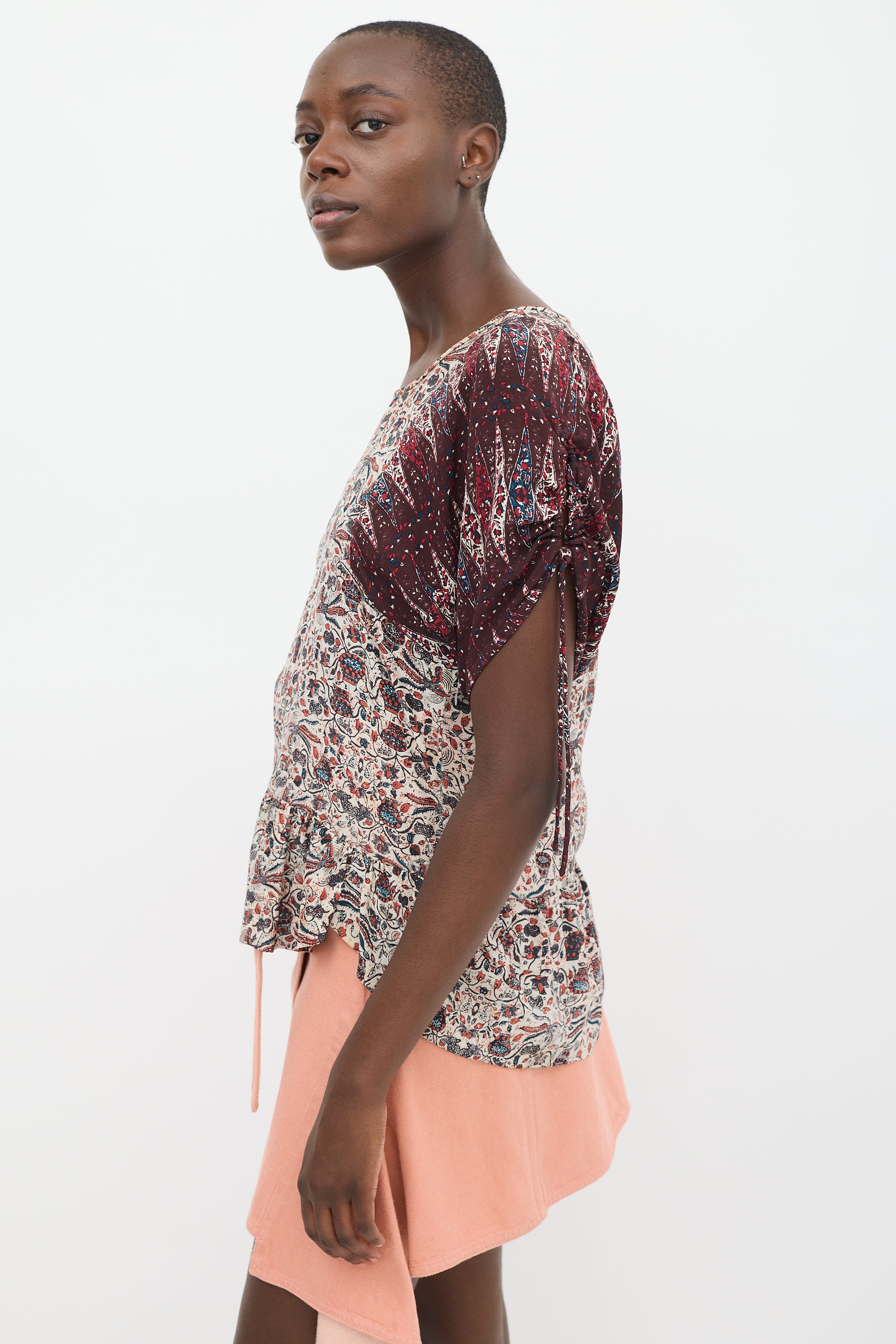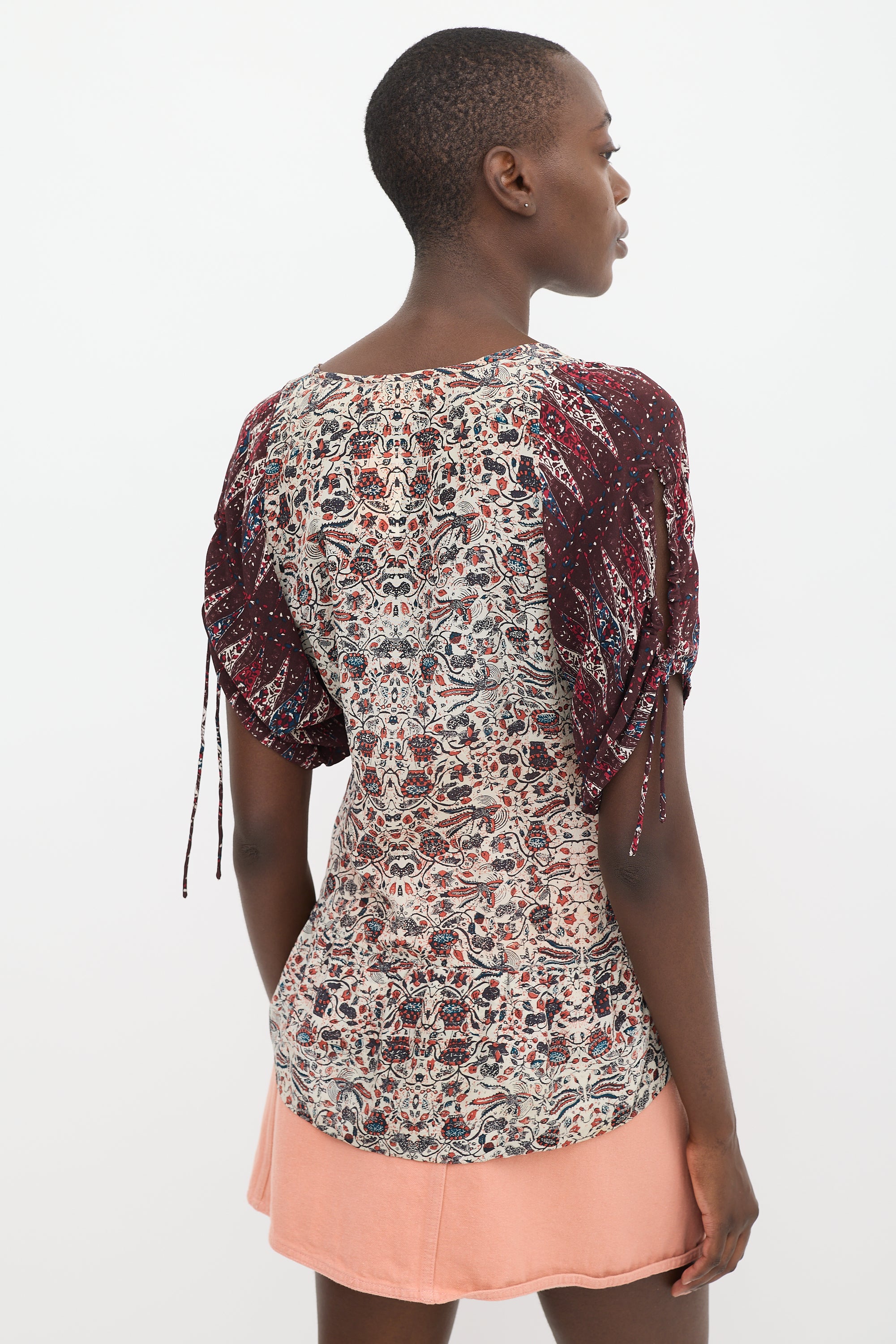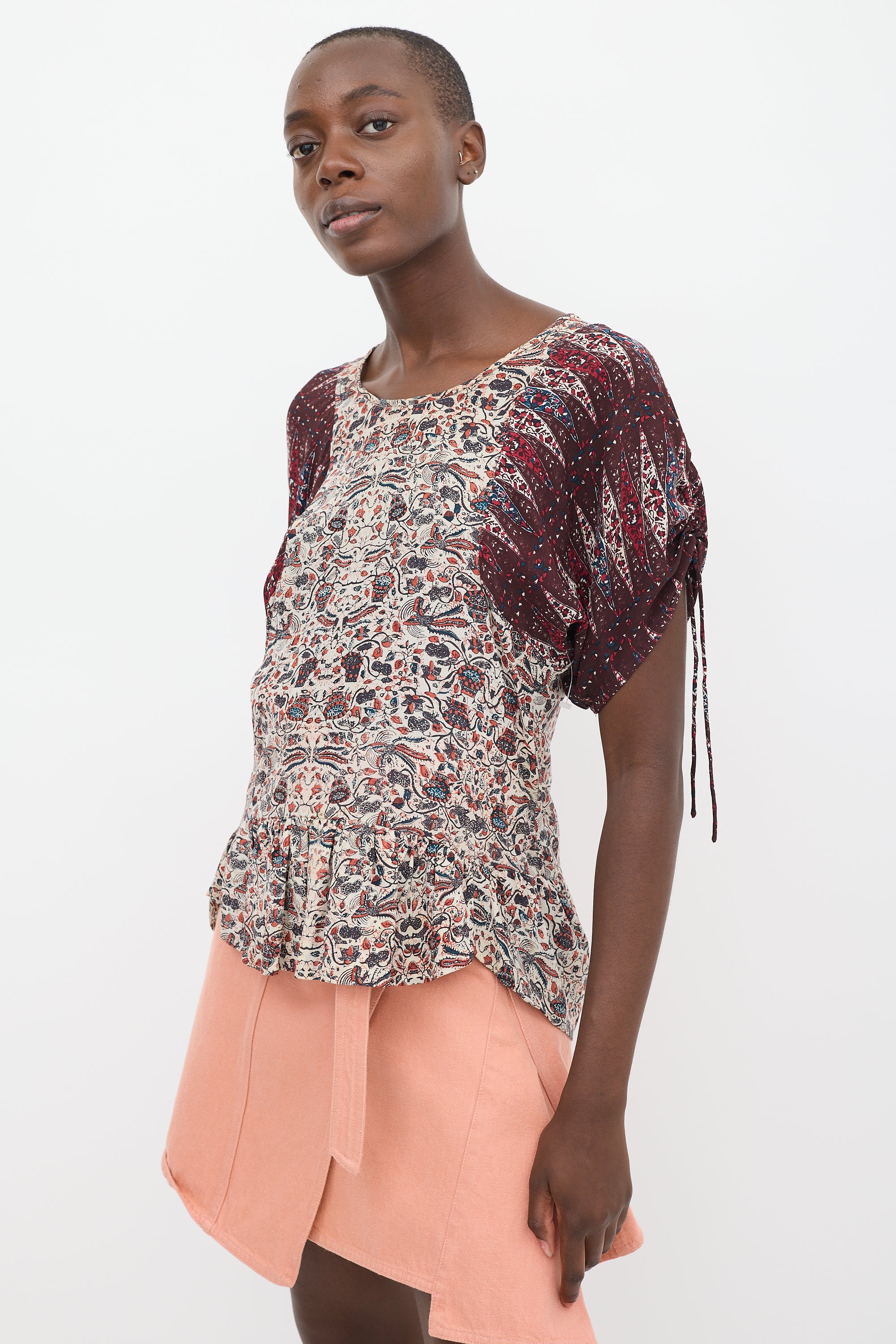 Pre-owned Isabel Marant Étoile beige and burgundy top featuring a round neckline, floral print throughout, high low flounce hem, and short contrast puff sleeves with split and self tie cuffs.