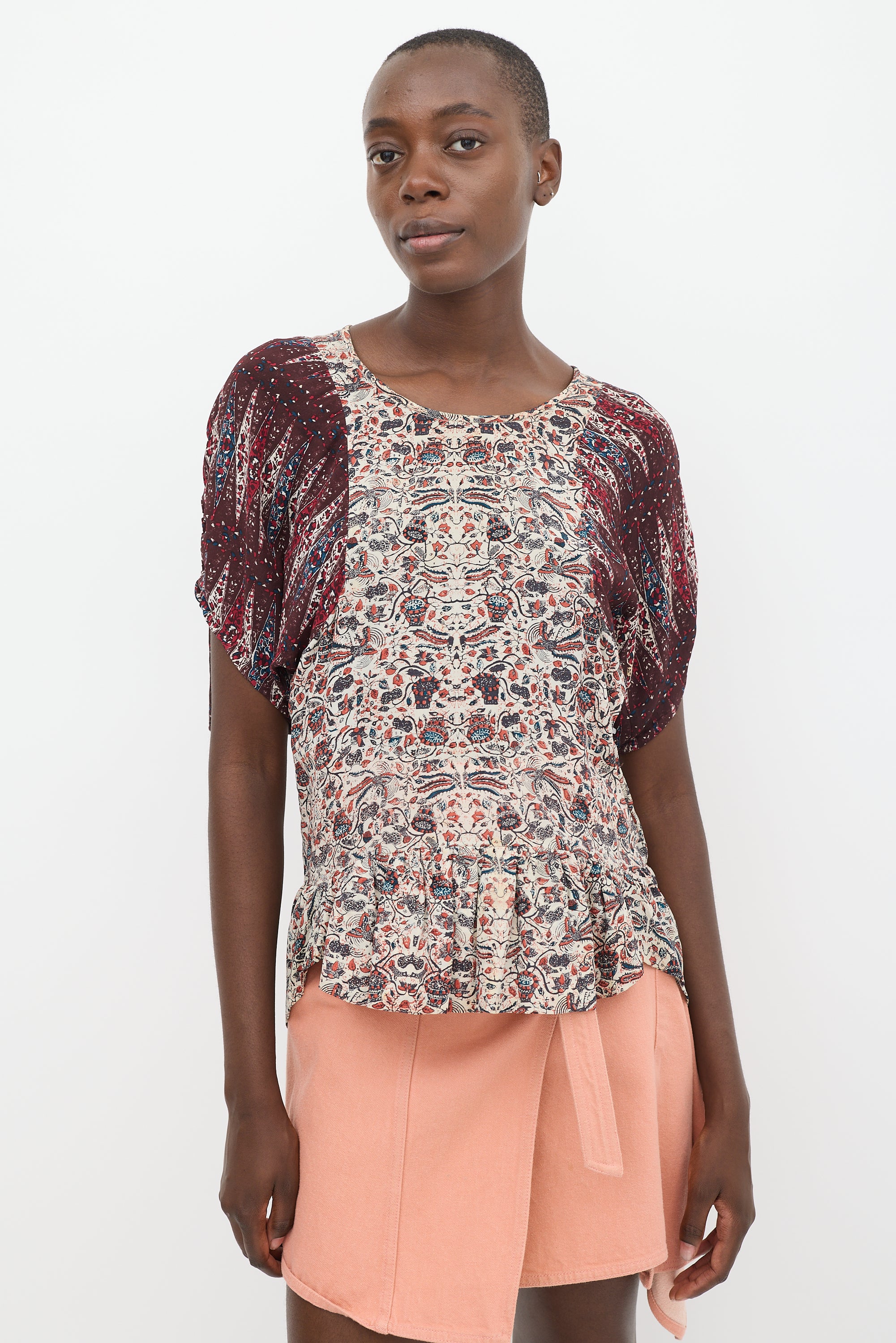 Beige & Burgundy Silk Floral Contrast Sleeve Top Small Size Guide