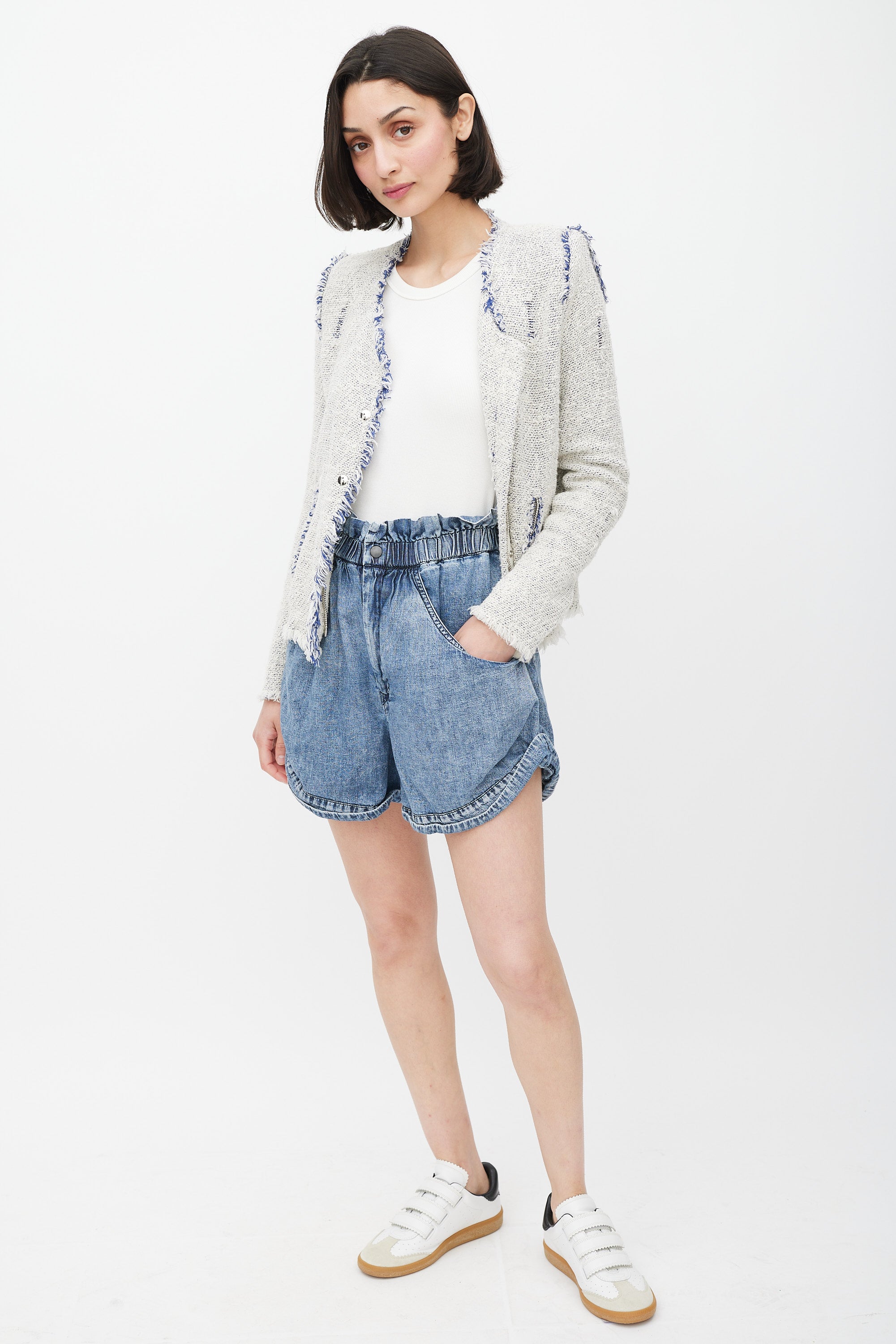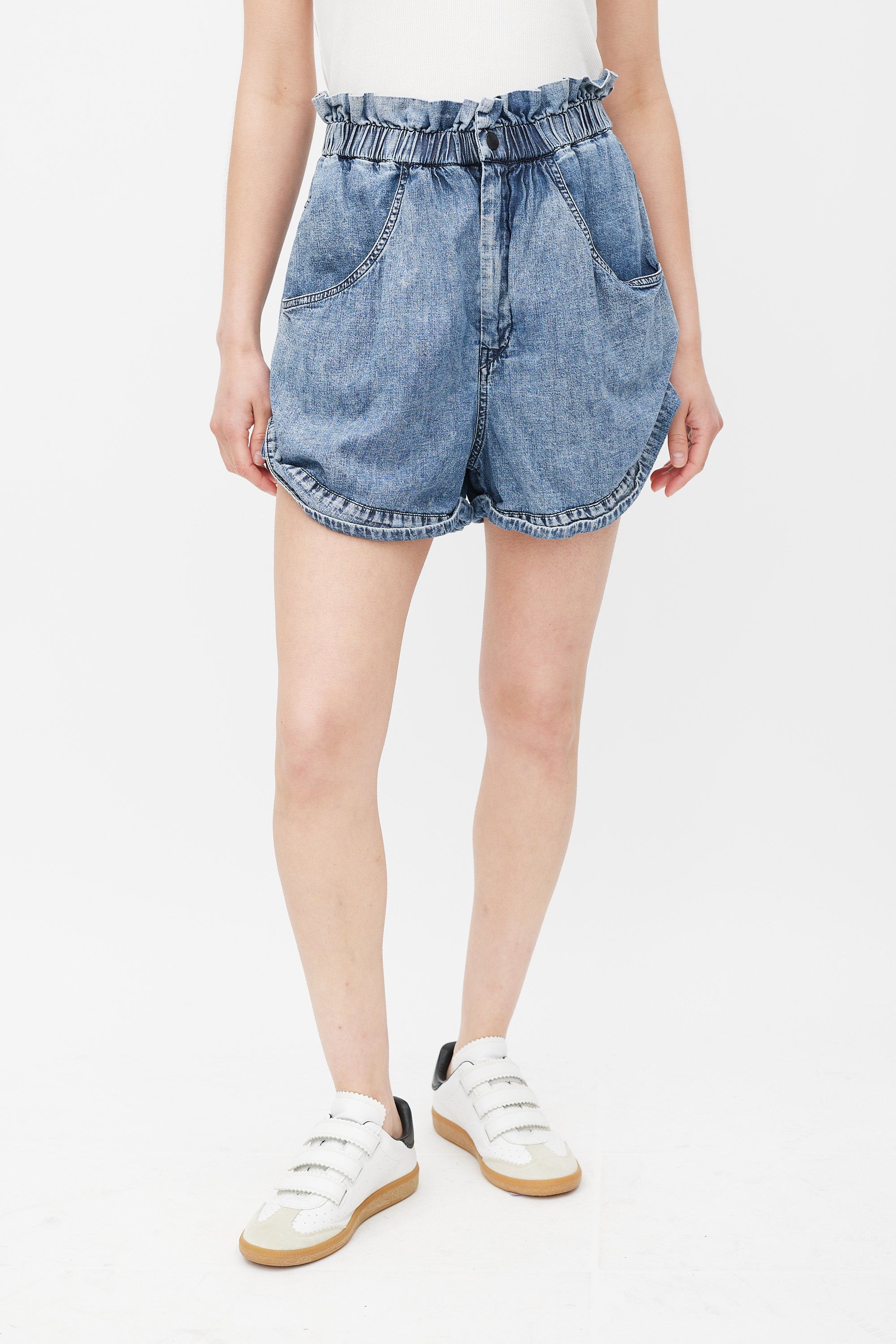 Pre-owned Isabel Marant medium wash denim shorts featuring an elasticized ruffled waist, two slip pockets at hip, two patch pockets at back, wide leg, cuffed hem, and zip fly with snap button closure.
