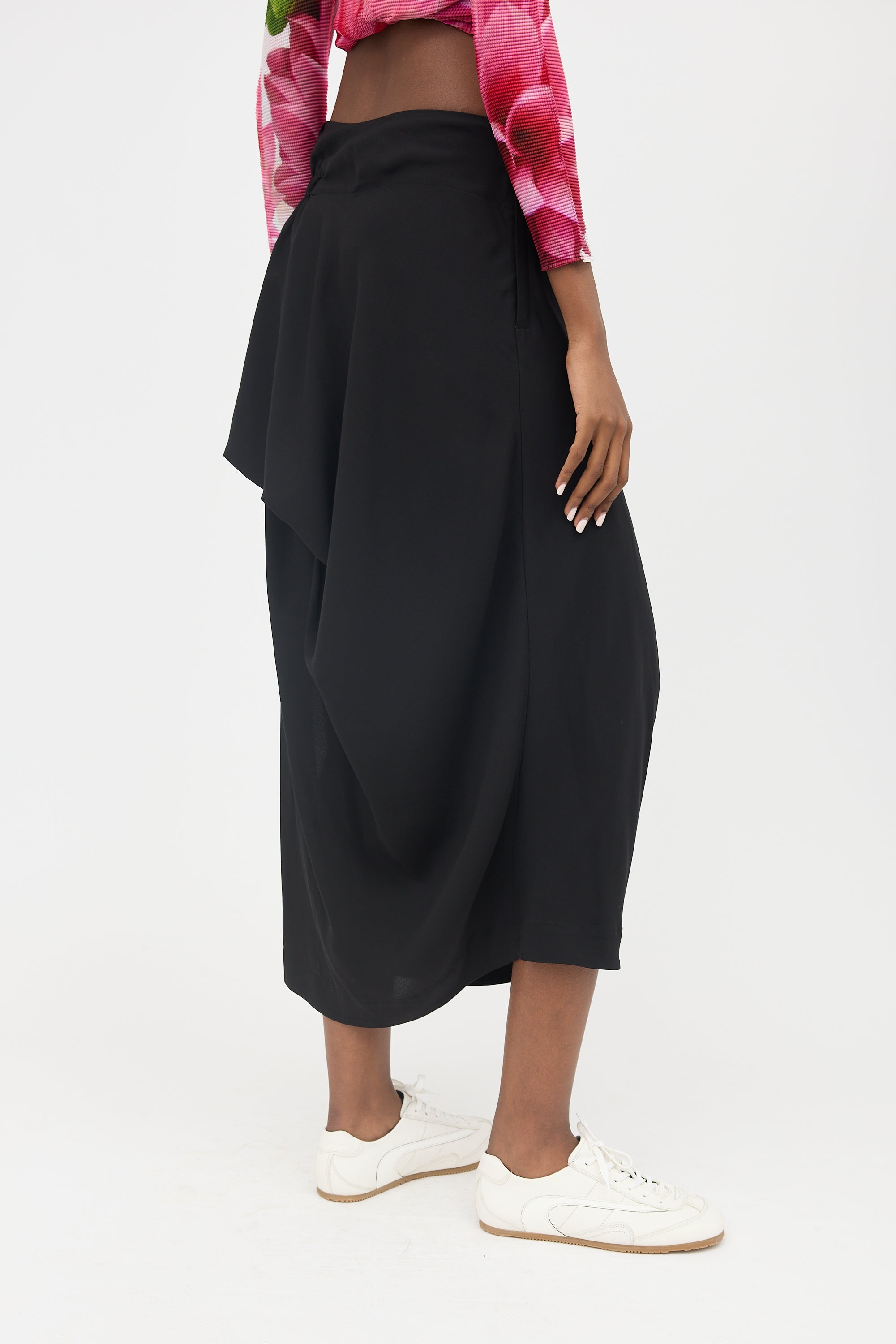 Pre-owned Issey Miyake black midi skirt featuring an asymmetrical draped design, elasticized right waistband, layered right hip, right vent, and concealed left side zip. Lined.
