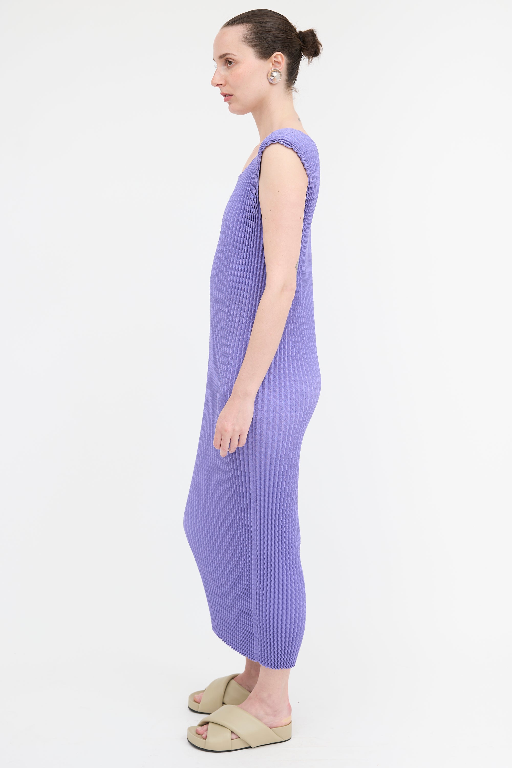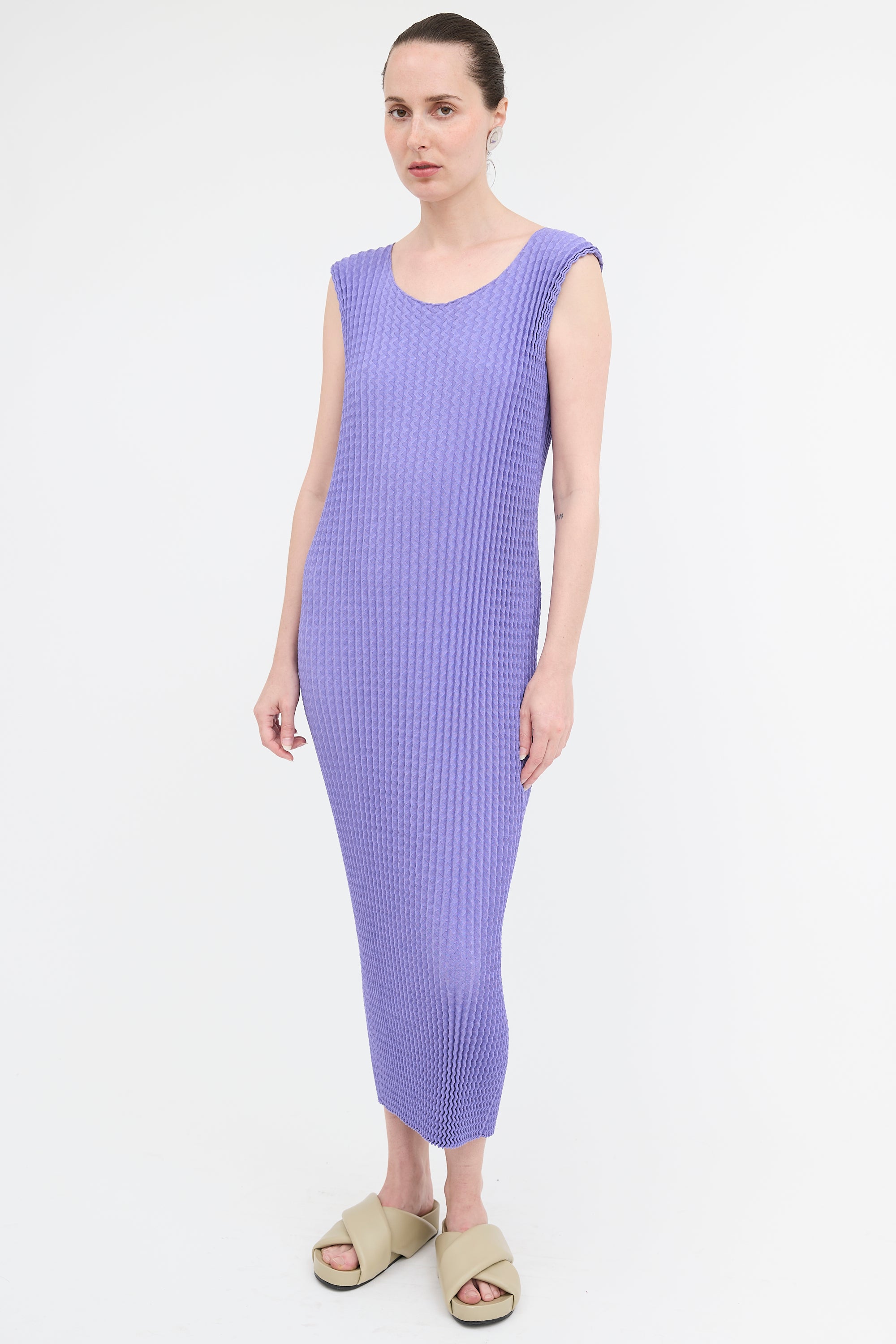 Pre-owned Issey Miyake purple knit dress featuring zig zag pleats, round neckline, and finished hem.