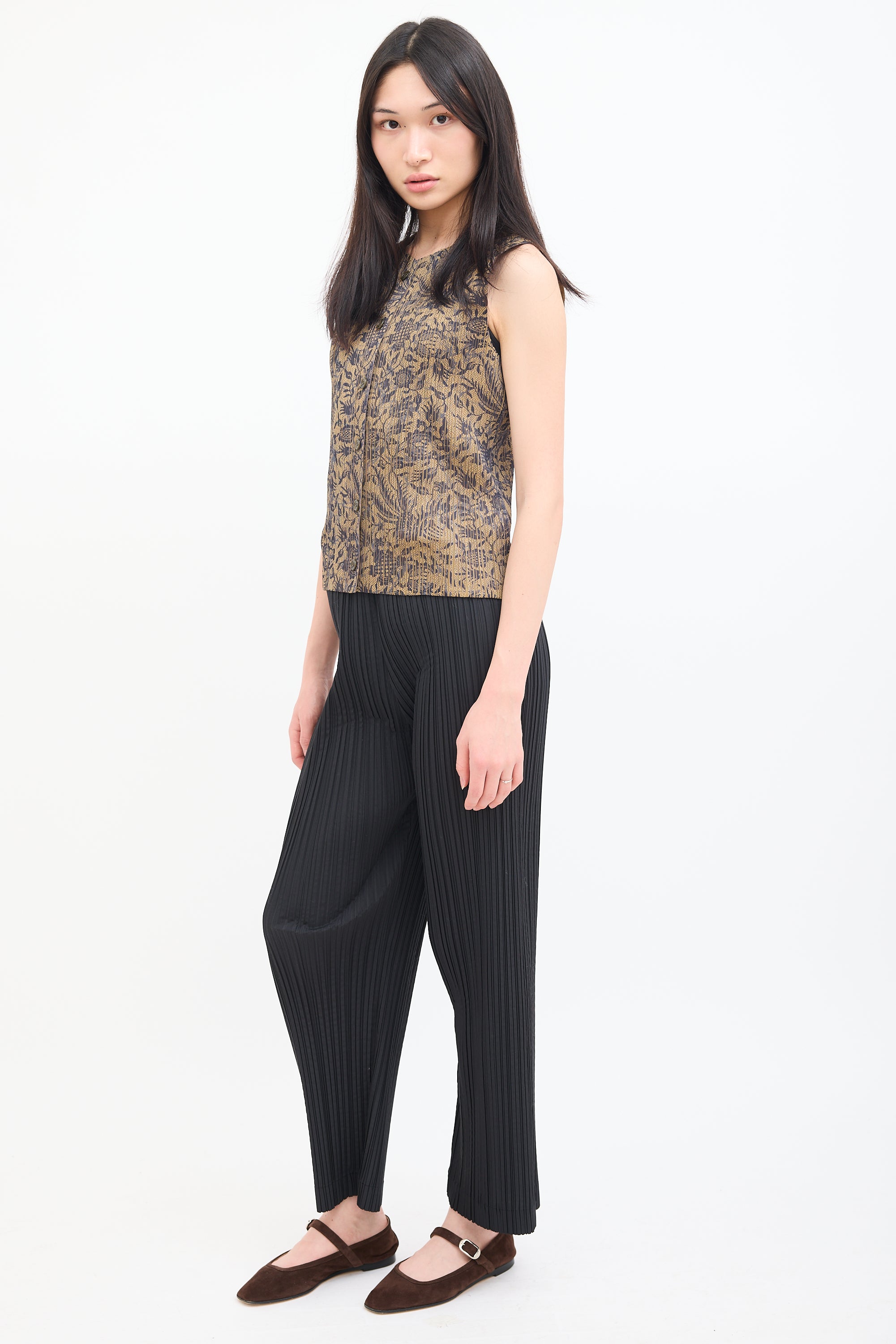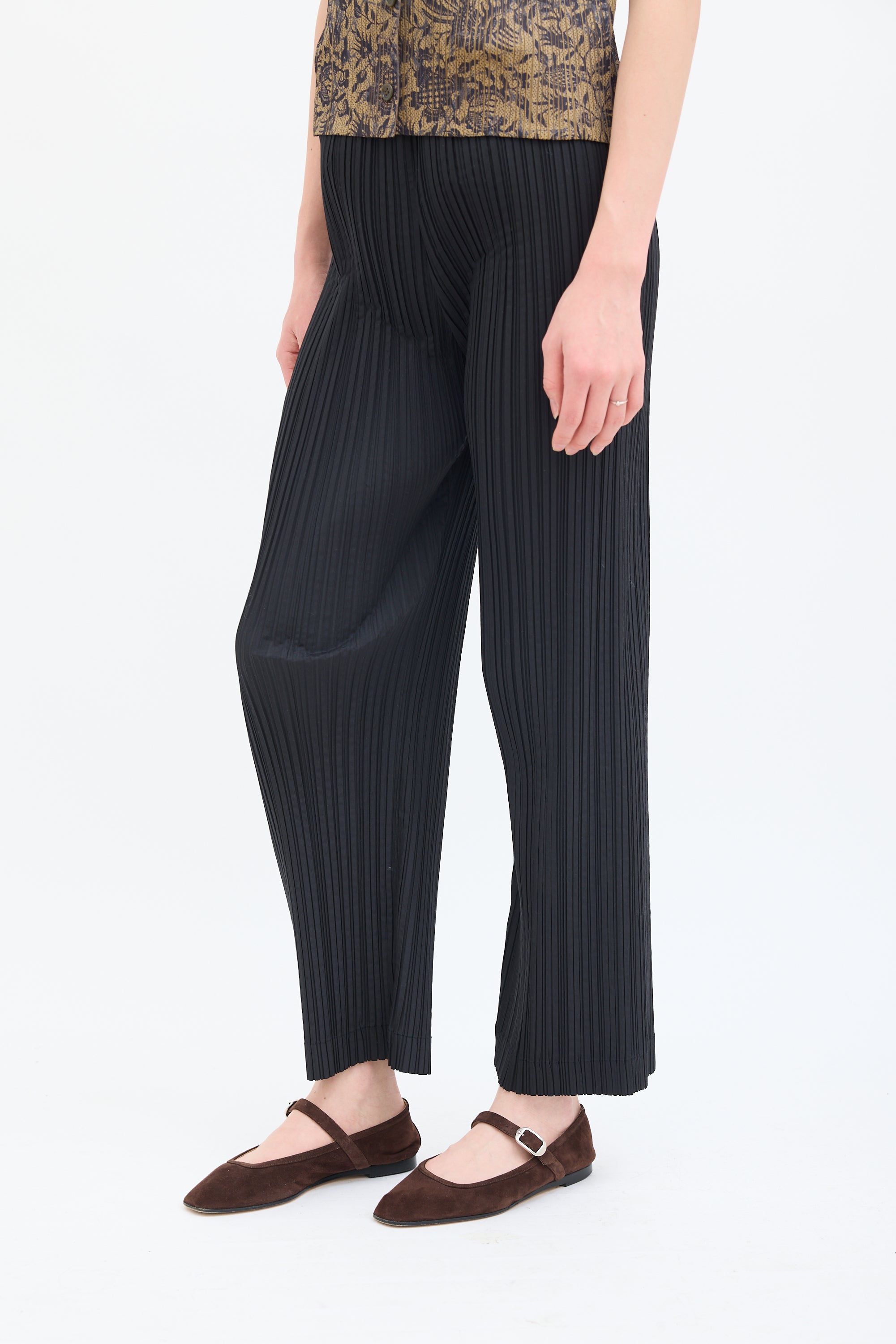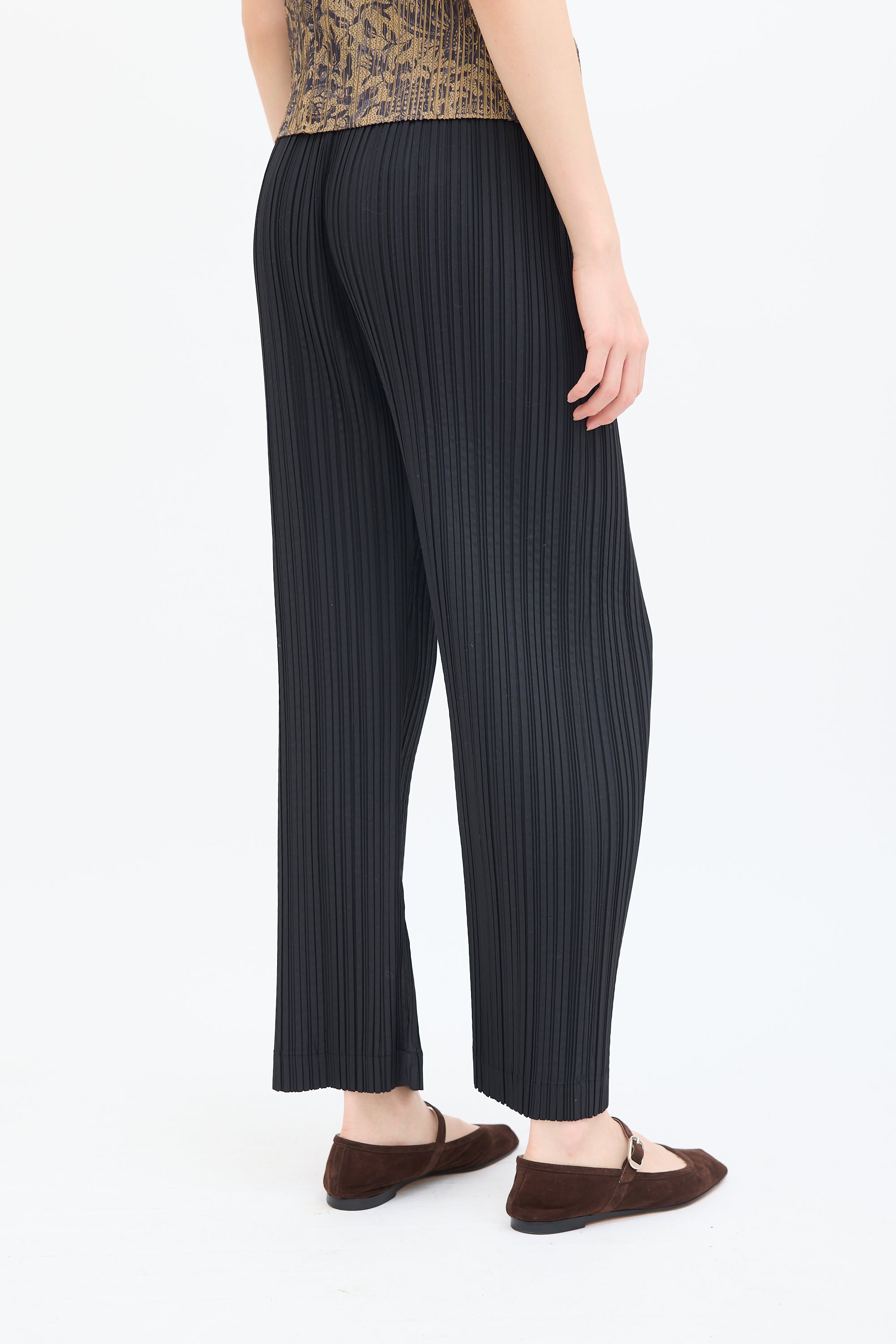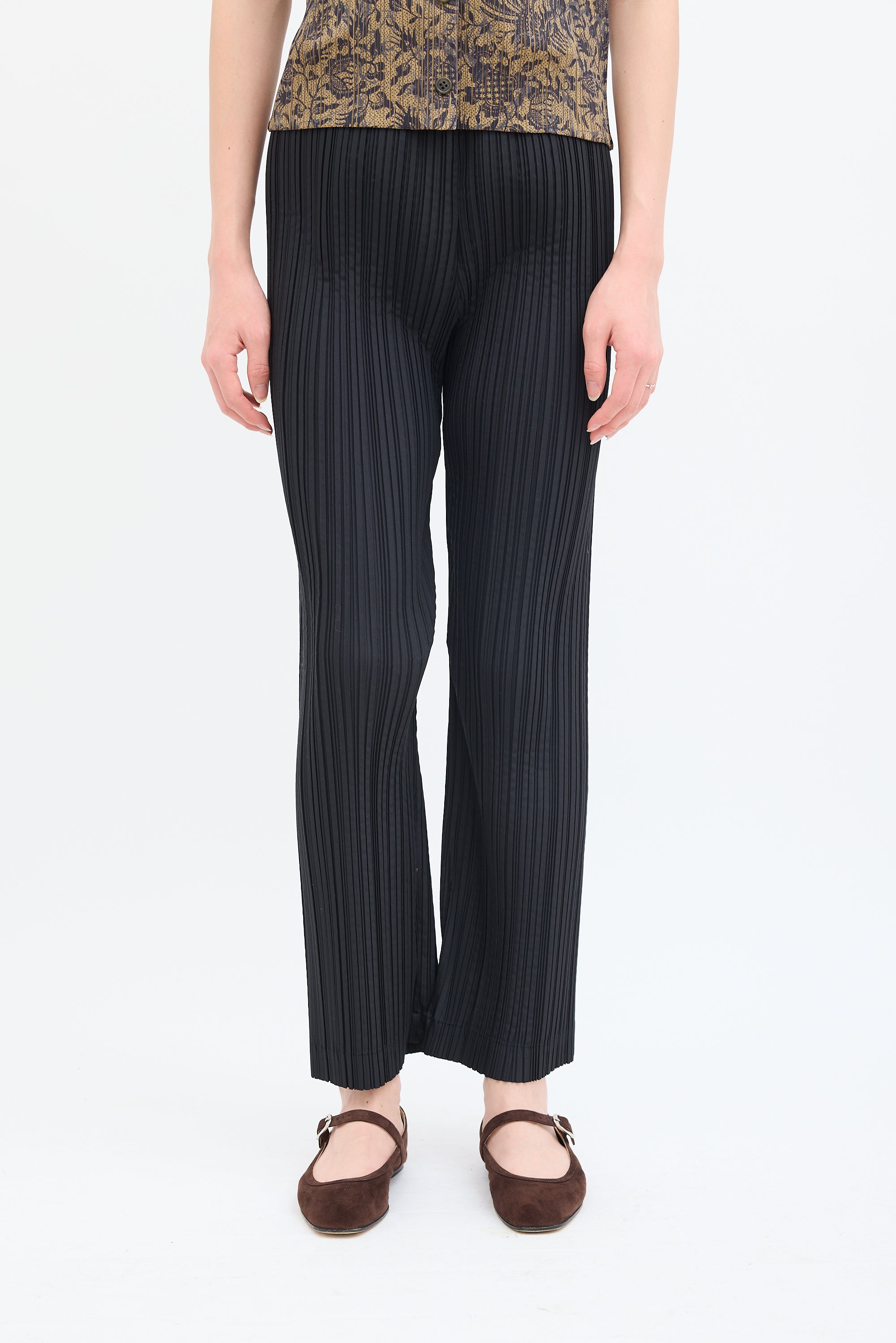 Pre-owned Issey Miyake vintage black trousers featuring a high waist, straight leg, concealed side zip closure with single button fastening, and signature pleats throughout. c. 1990s