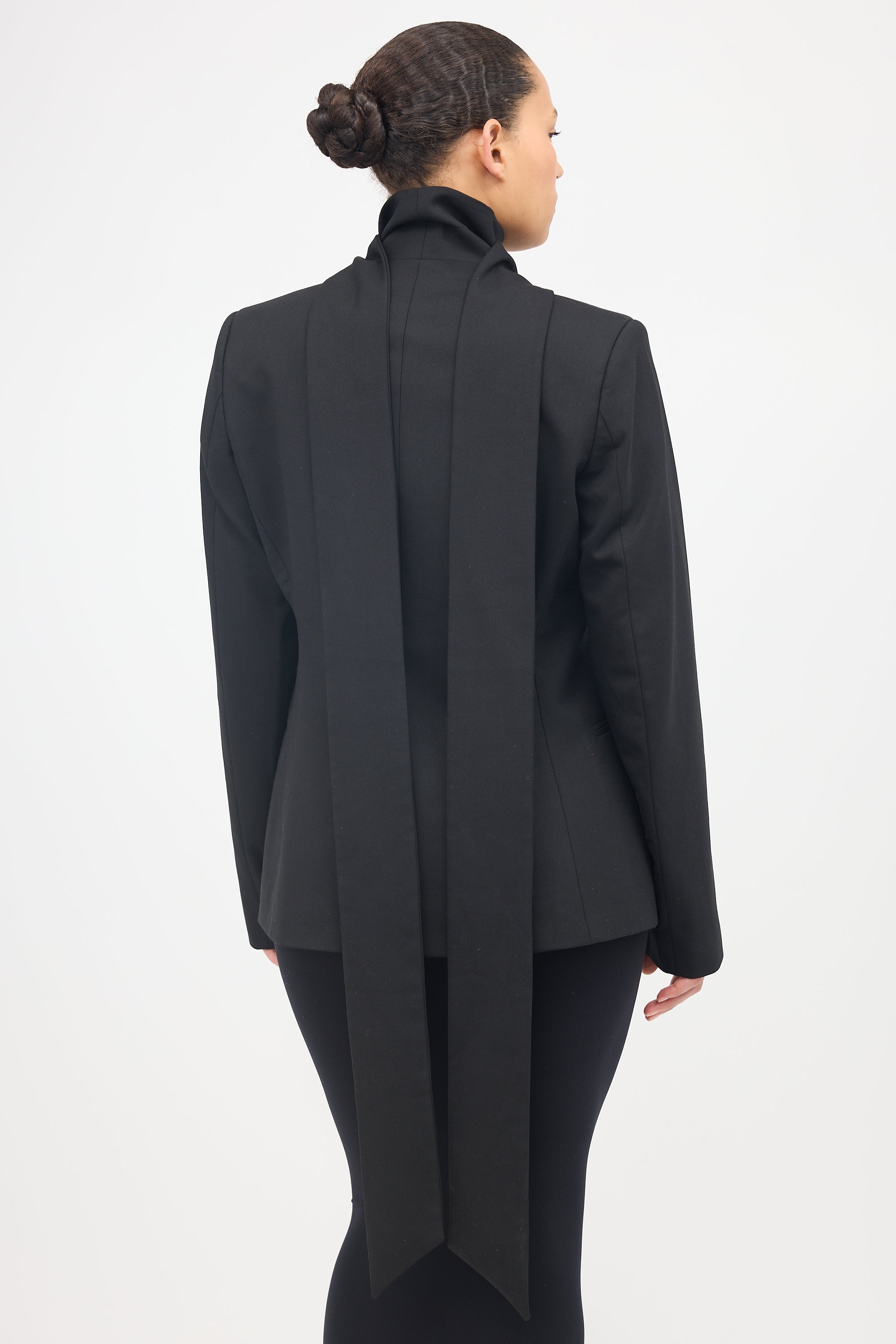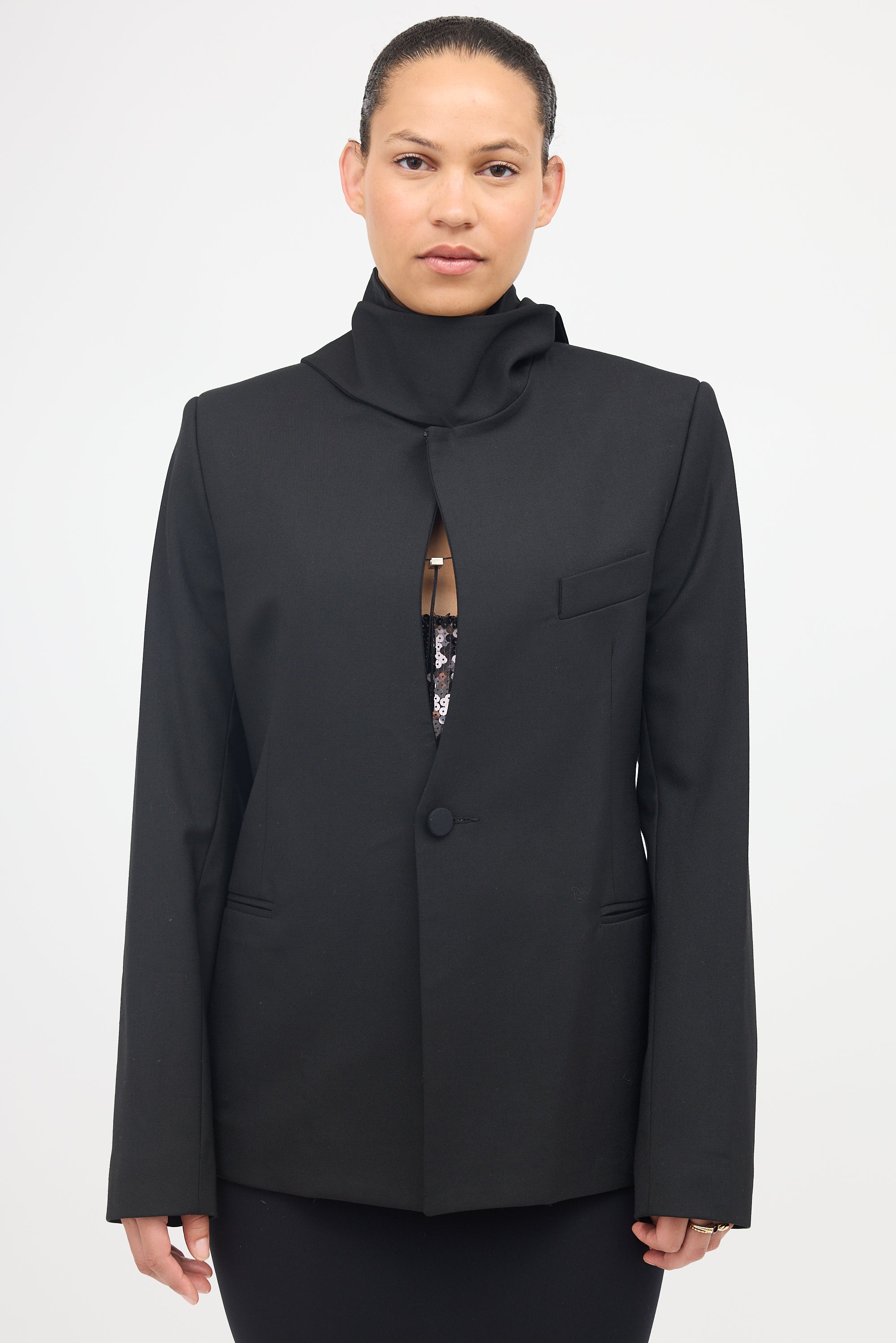 Pre-owned Aaron Esh black wool Keyhole jacket featuring a stand collar with self-tie scarf detail, hook at collar with keyhole chest, padded shoulders, single button closure, and three welt pockets. Lined.