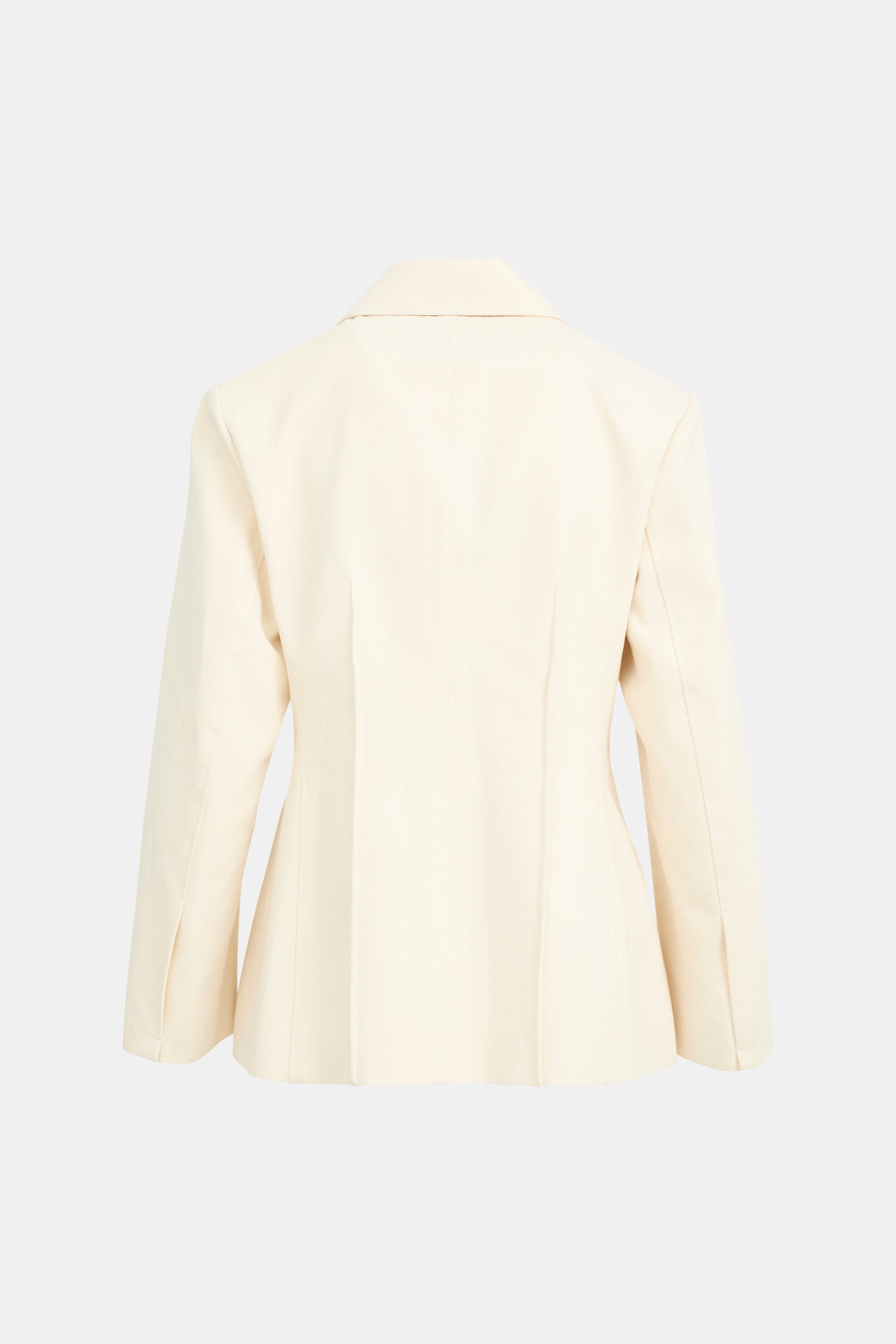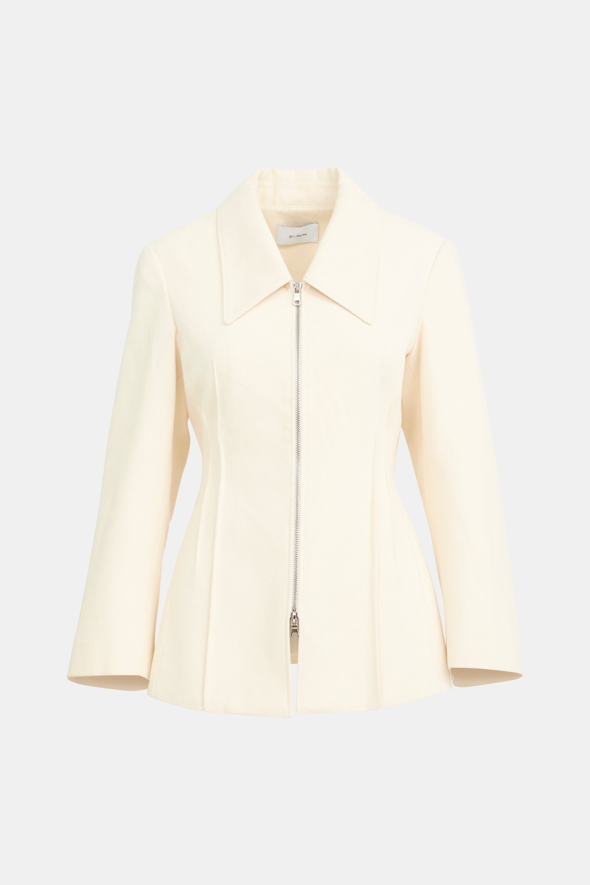 Pre-owned Gu_deres cream denim jacket featuring pointed collar, double zip up front, pintucks, two front slip pockets, padded shoulders, and tacked cuffs. Lined.