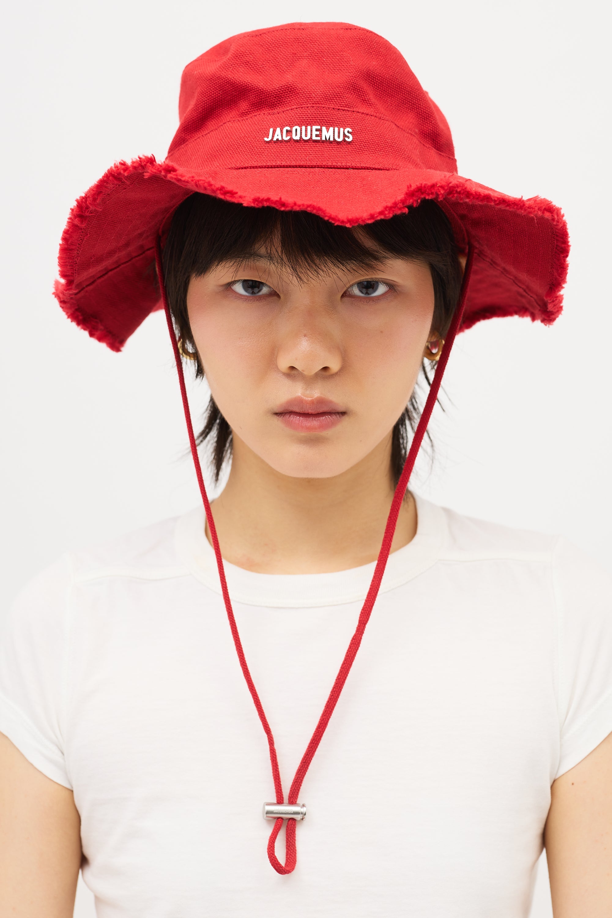 Pre-owned Jacquemus red canvas Le Bob Artichaut bucket hat featuring tonal stitching, brushed silver tone logo hardware at front, drawstring detail with toggle fastening at back, brim with tonal topstitching and raw edge, grosgrain brim lining, and chin strap with toggle fastening. Lined.