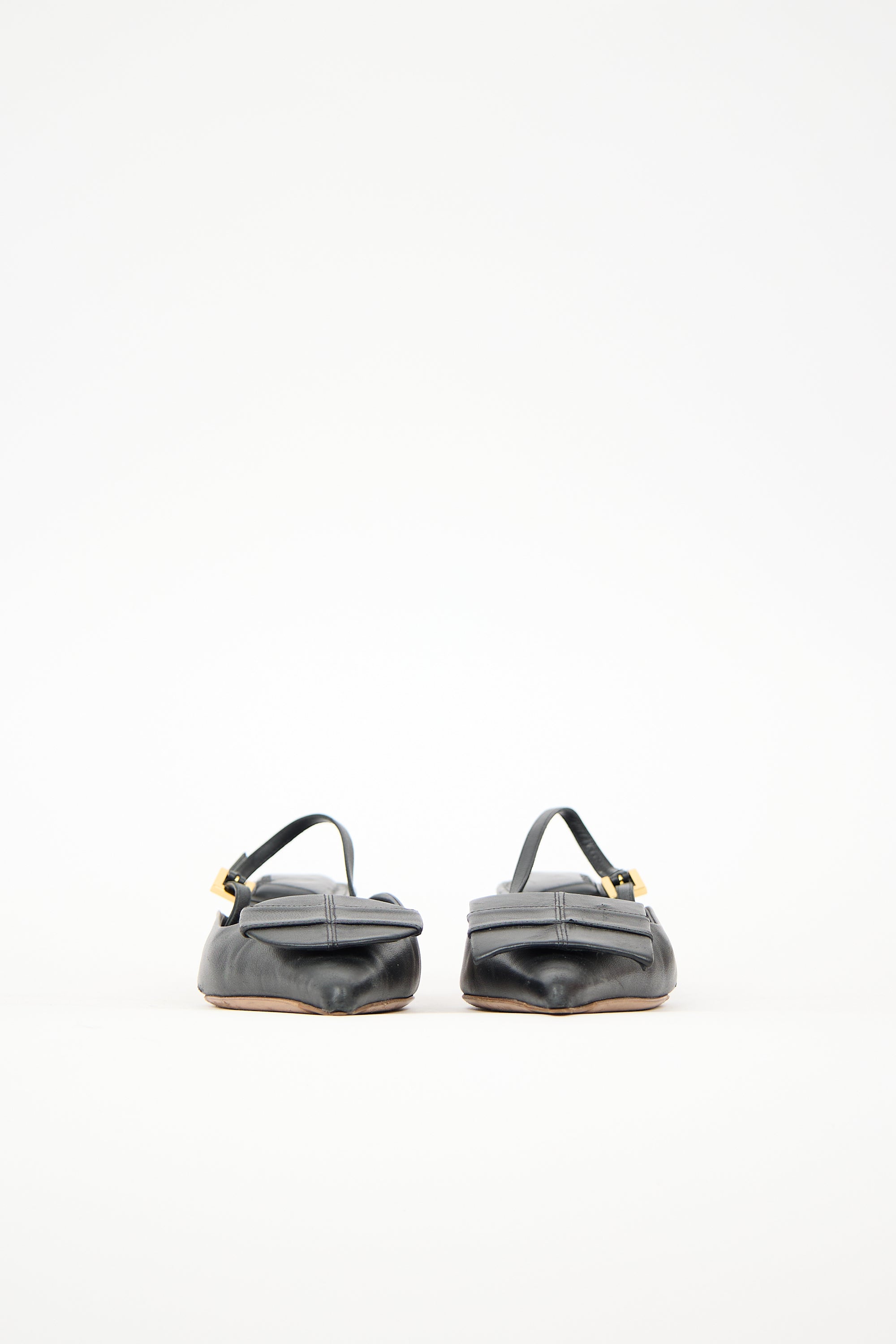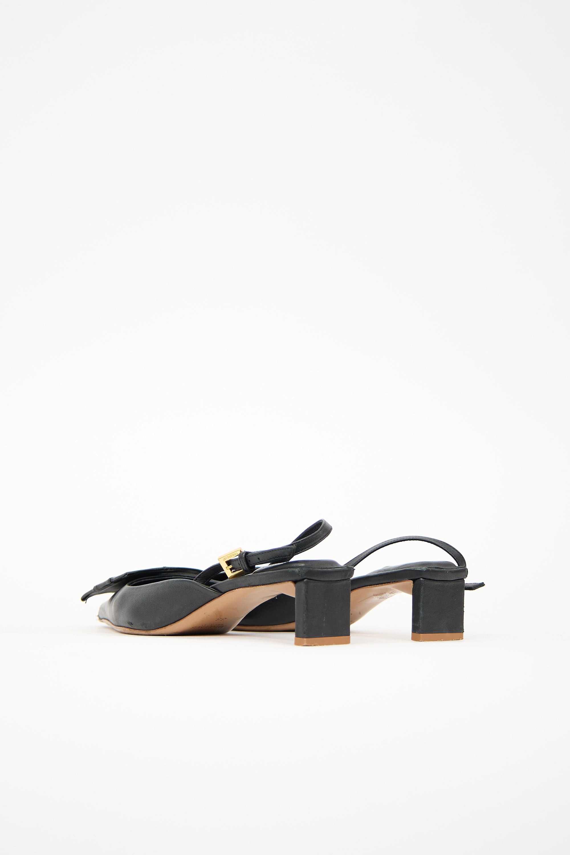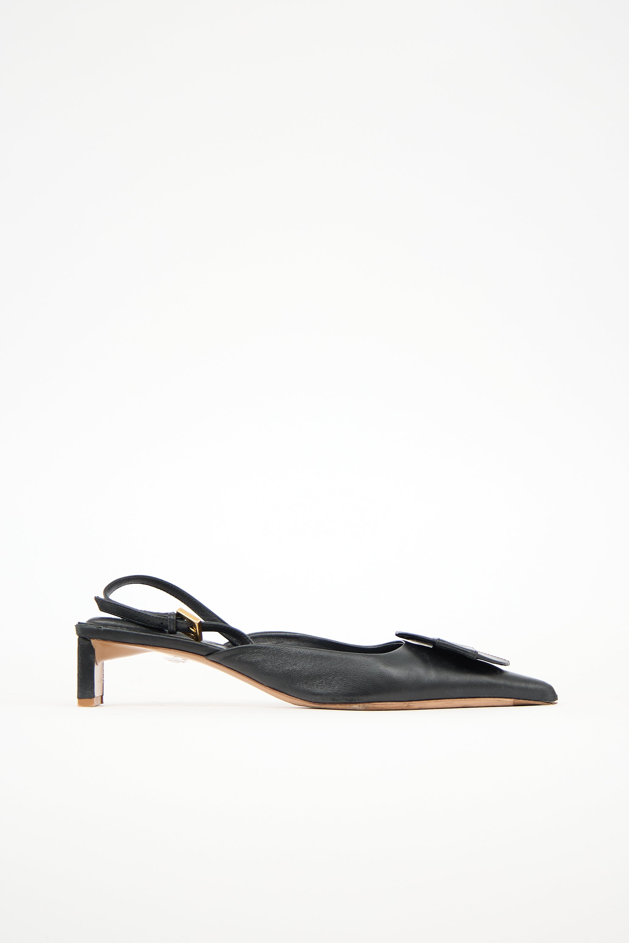 Pre-owned Jacquemus black leather Duelo pumps featuring pointed toe, mismatched geometric applique at vamp, adjustable slingback strap, and covered flat kitten heel.