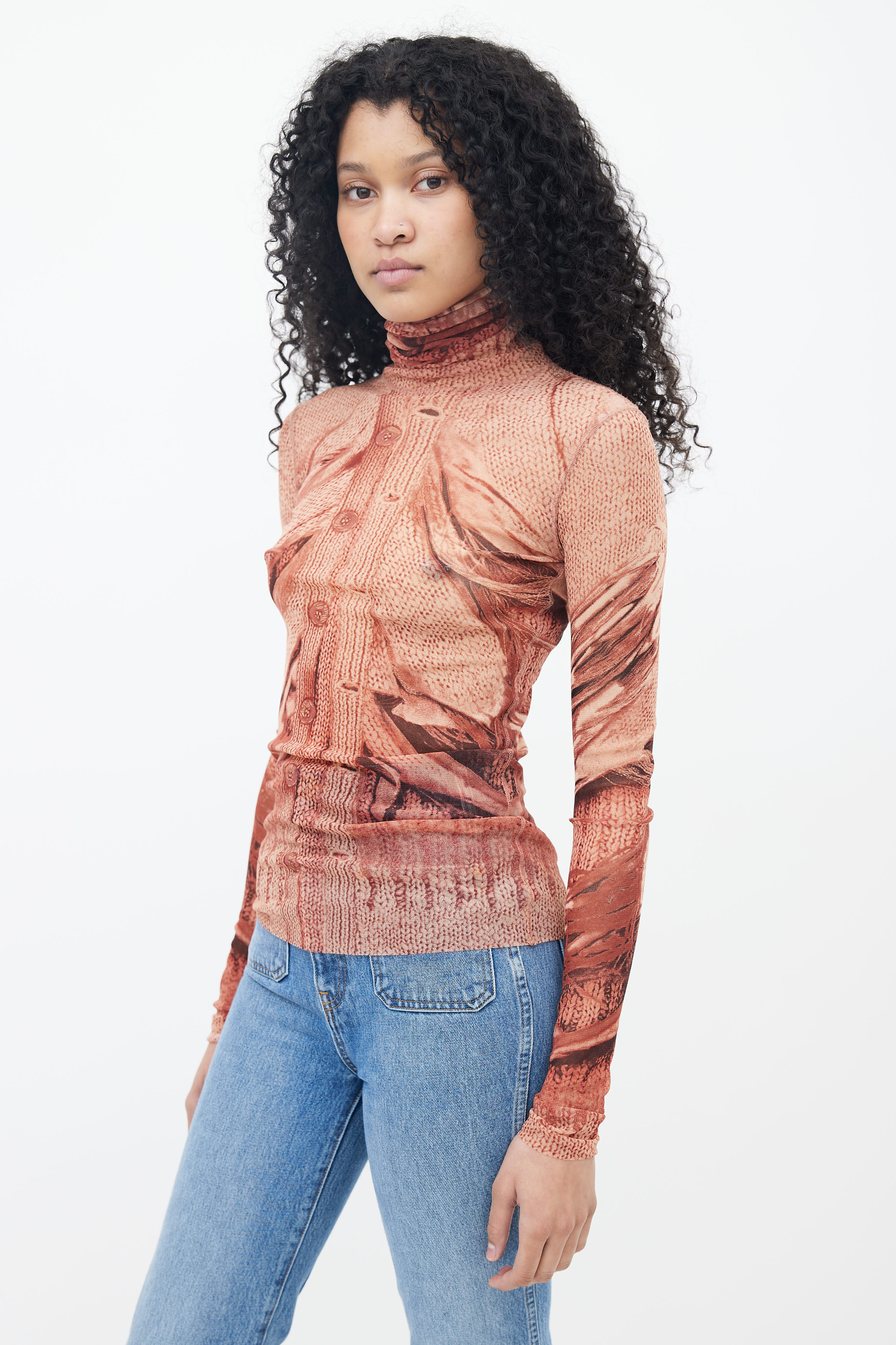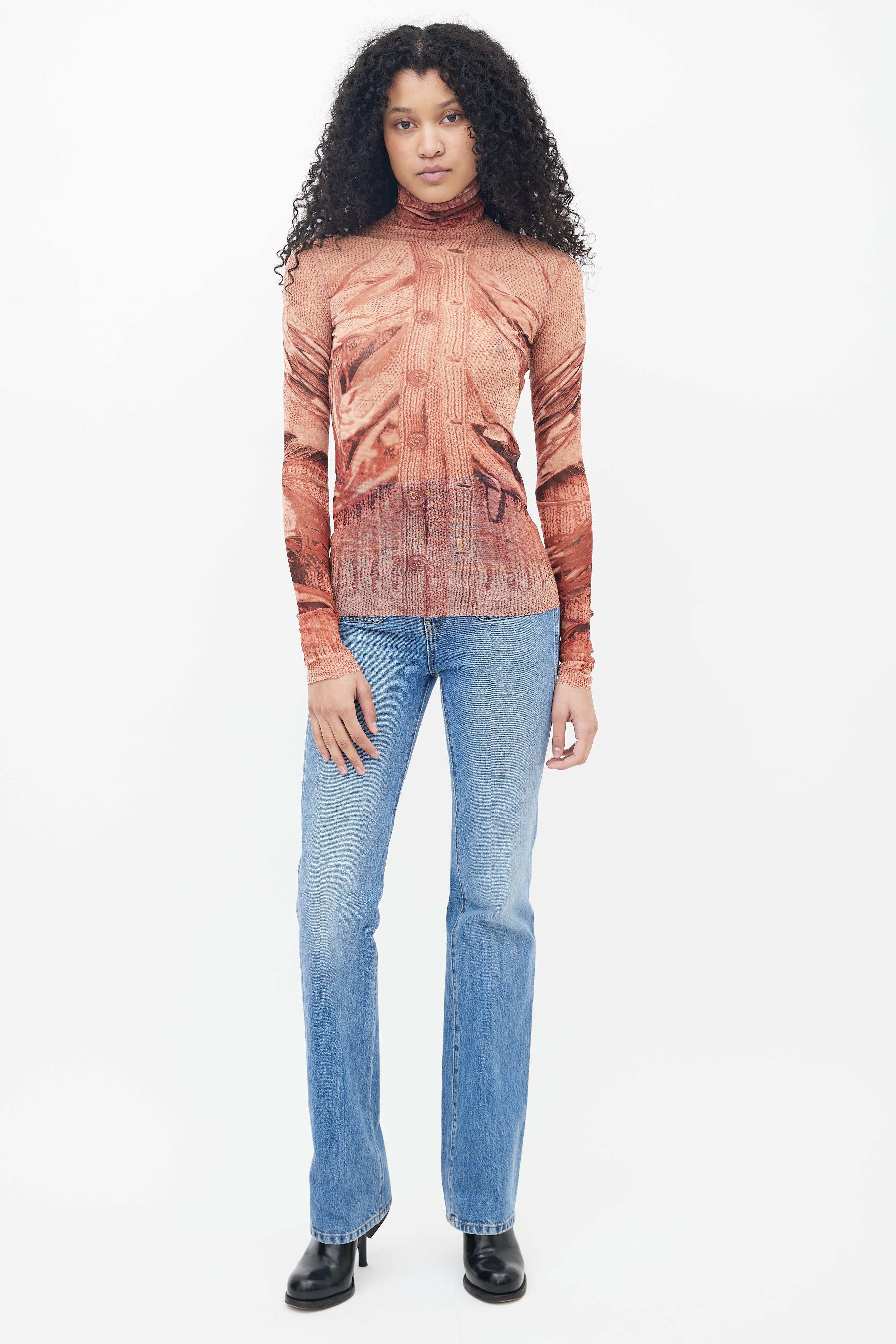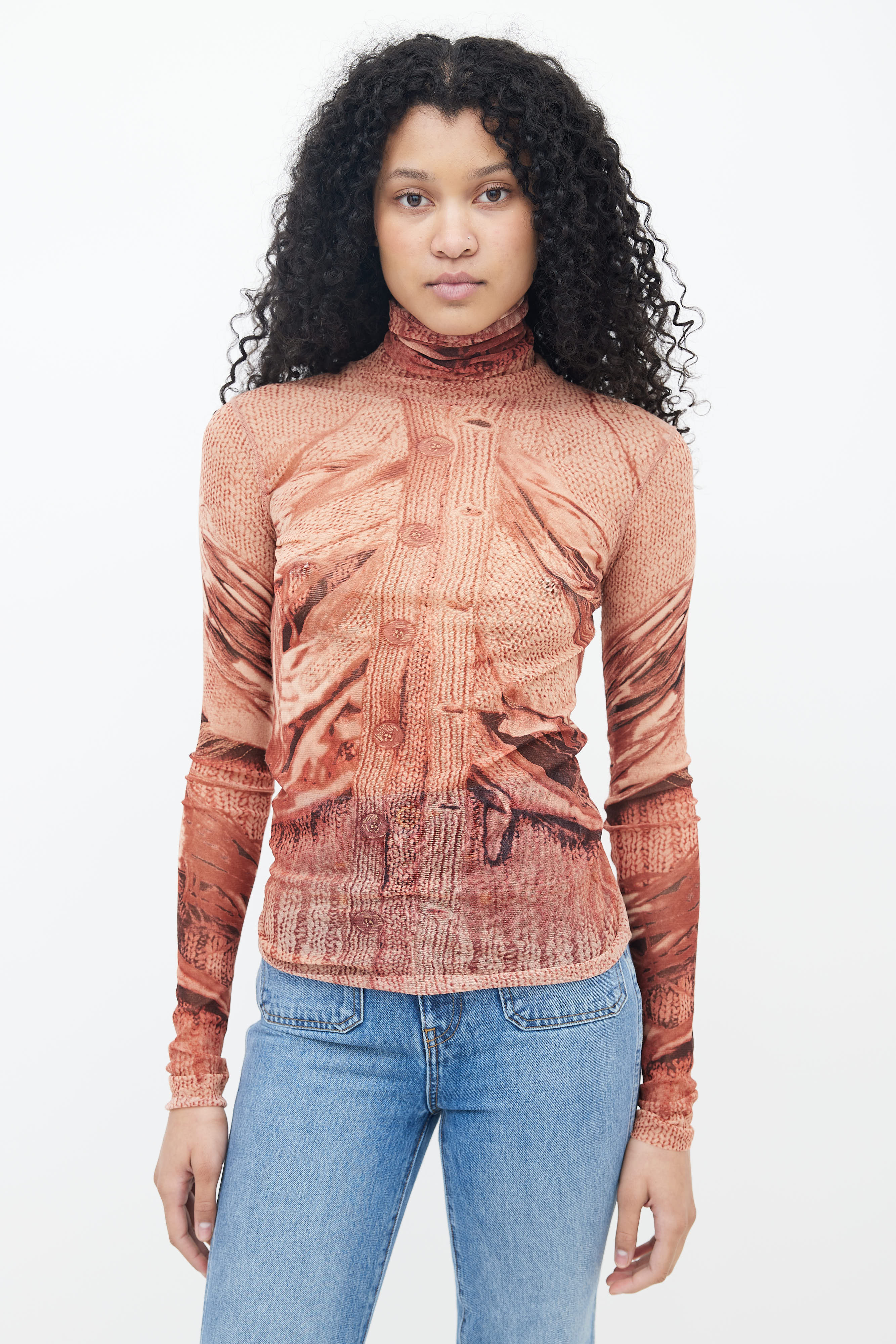 Pre-owned Jean Paul Gaultier 1999 Maille Femme top in brown featuring sweater trompe l'oeil print throughout, turtleneck, raw hem, hang tab at back, and long sleeves.