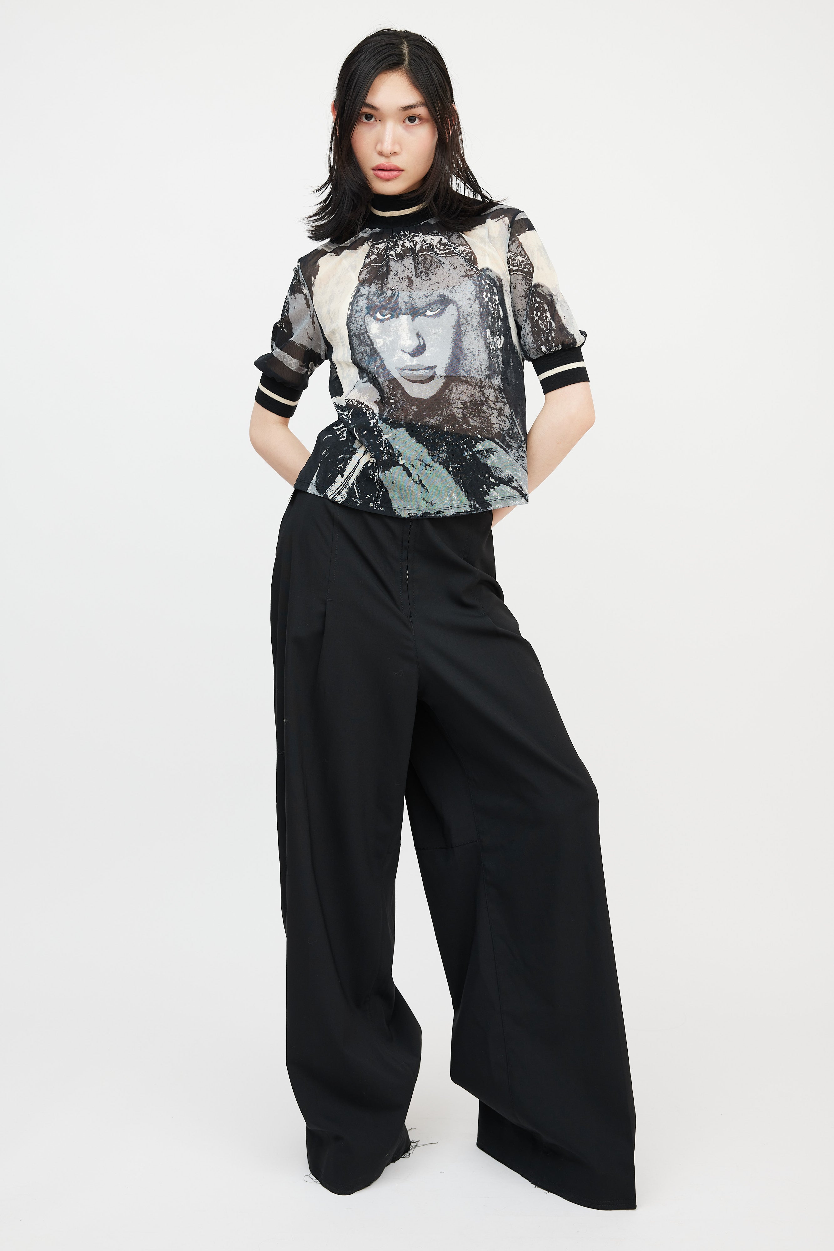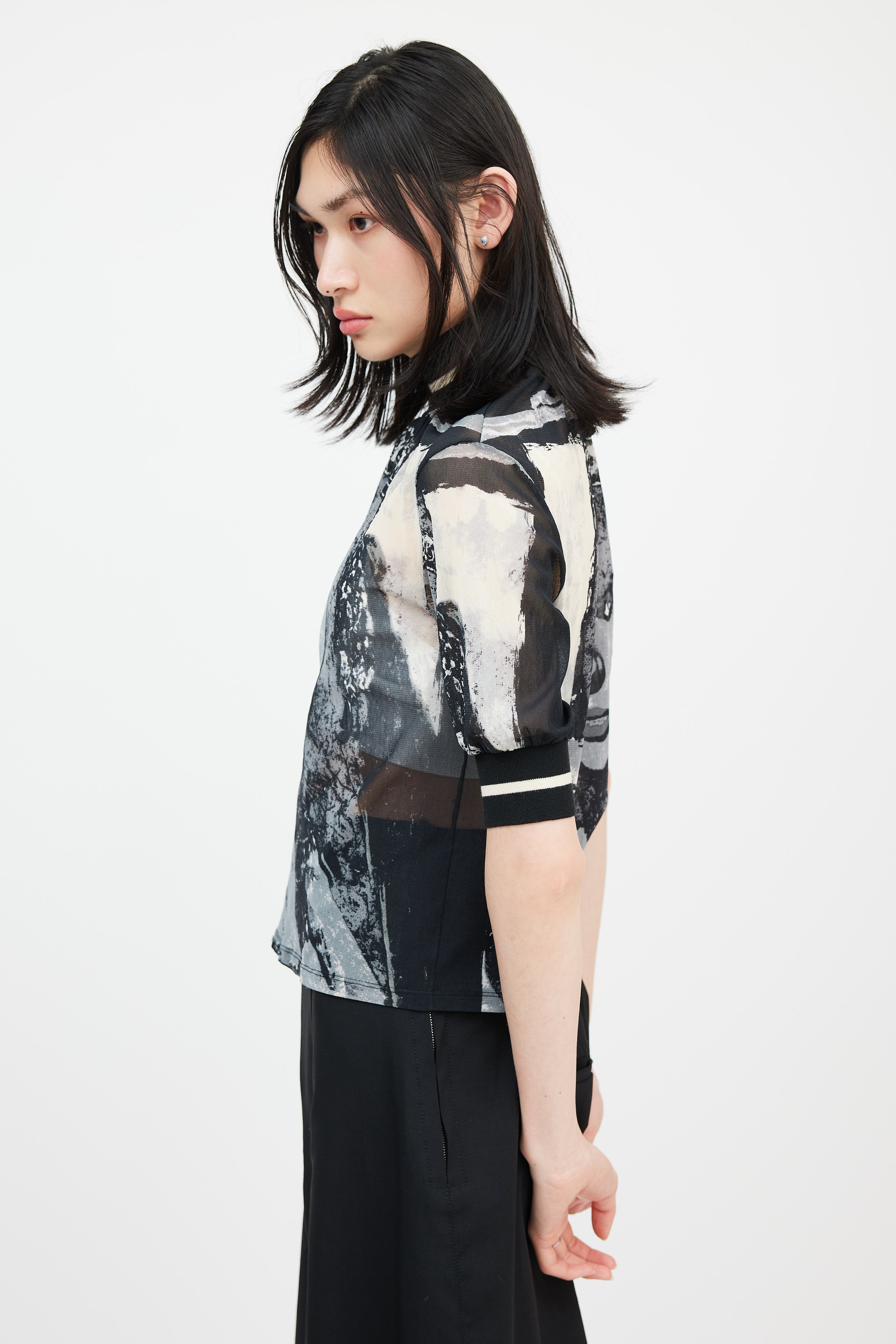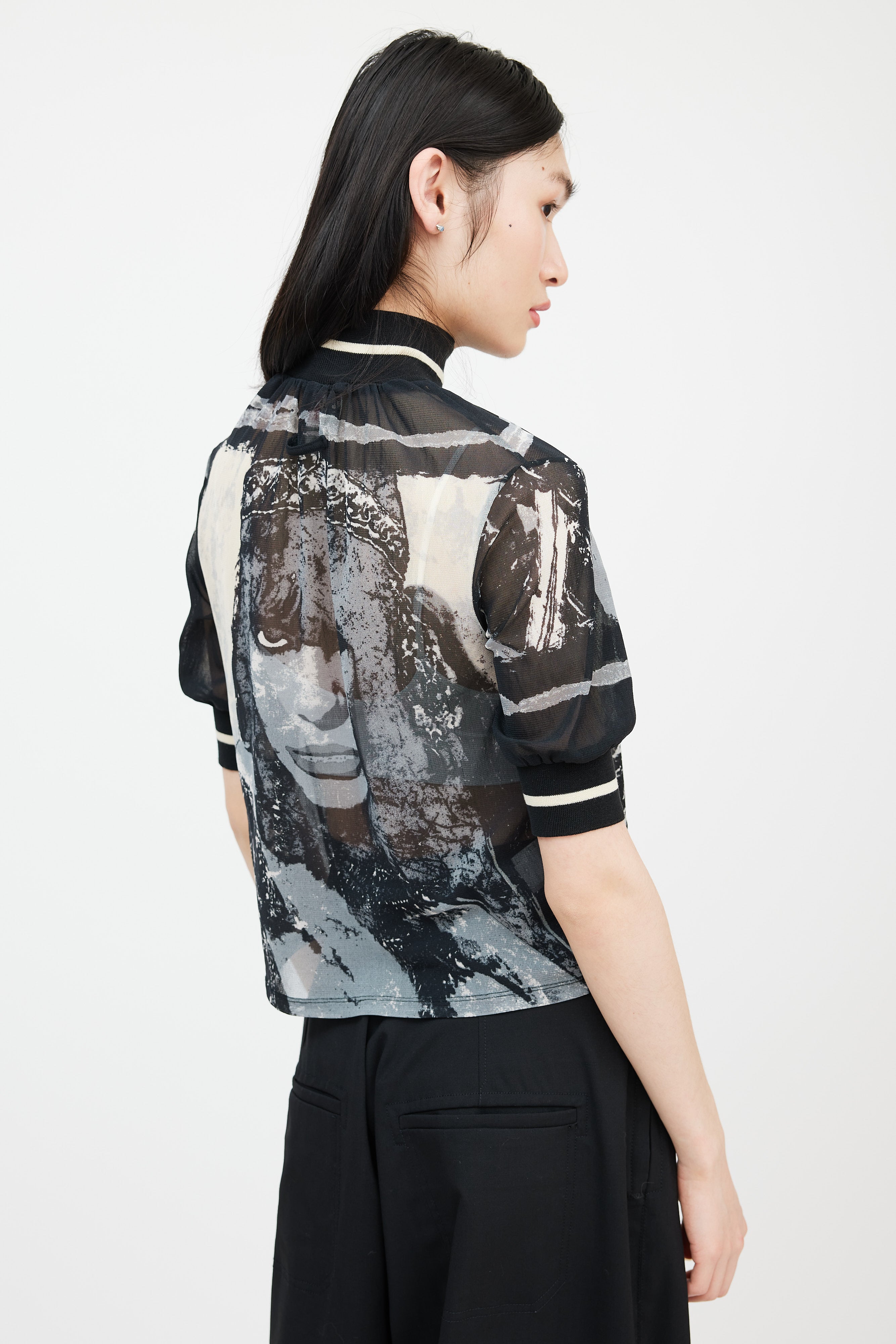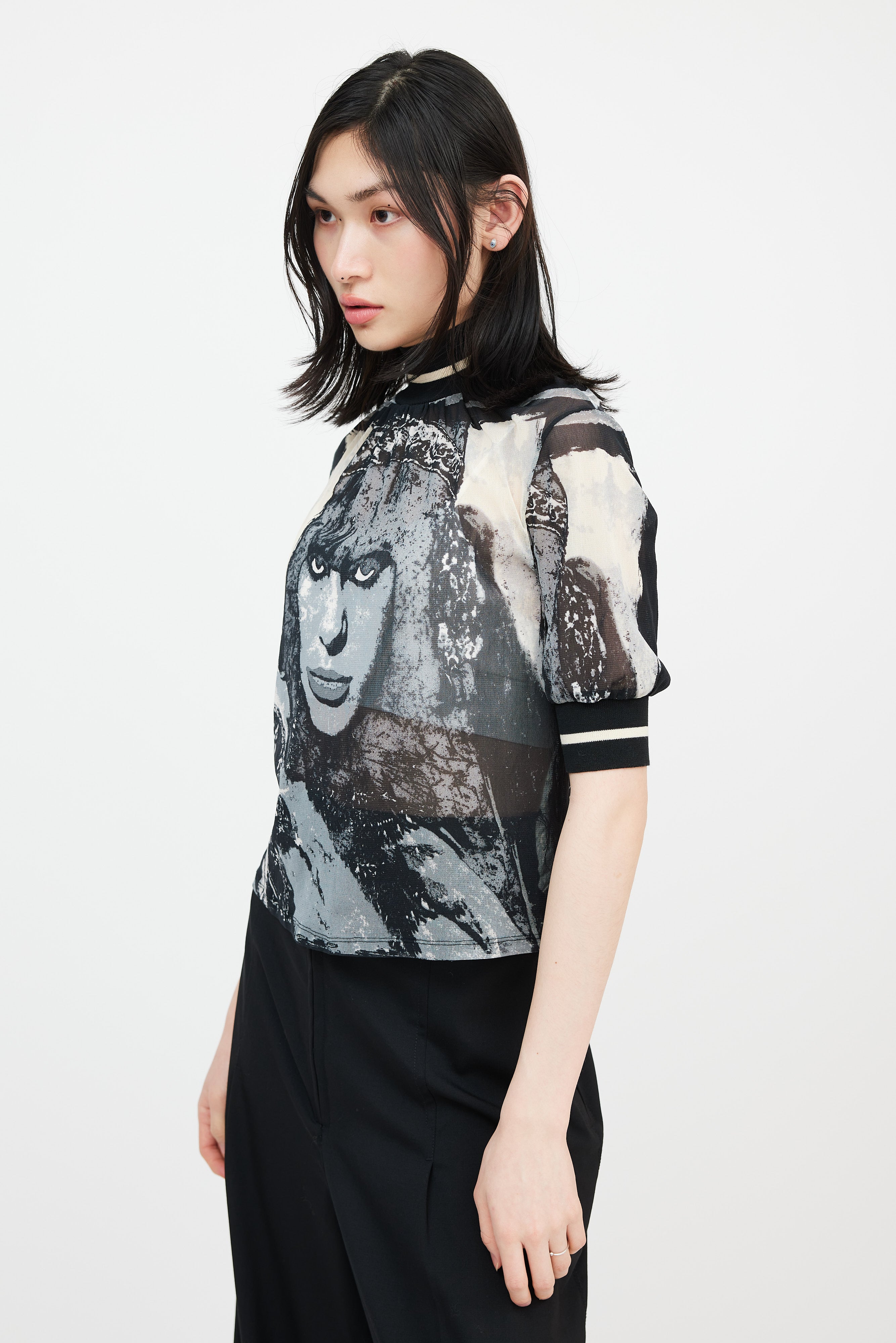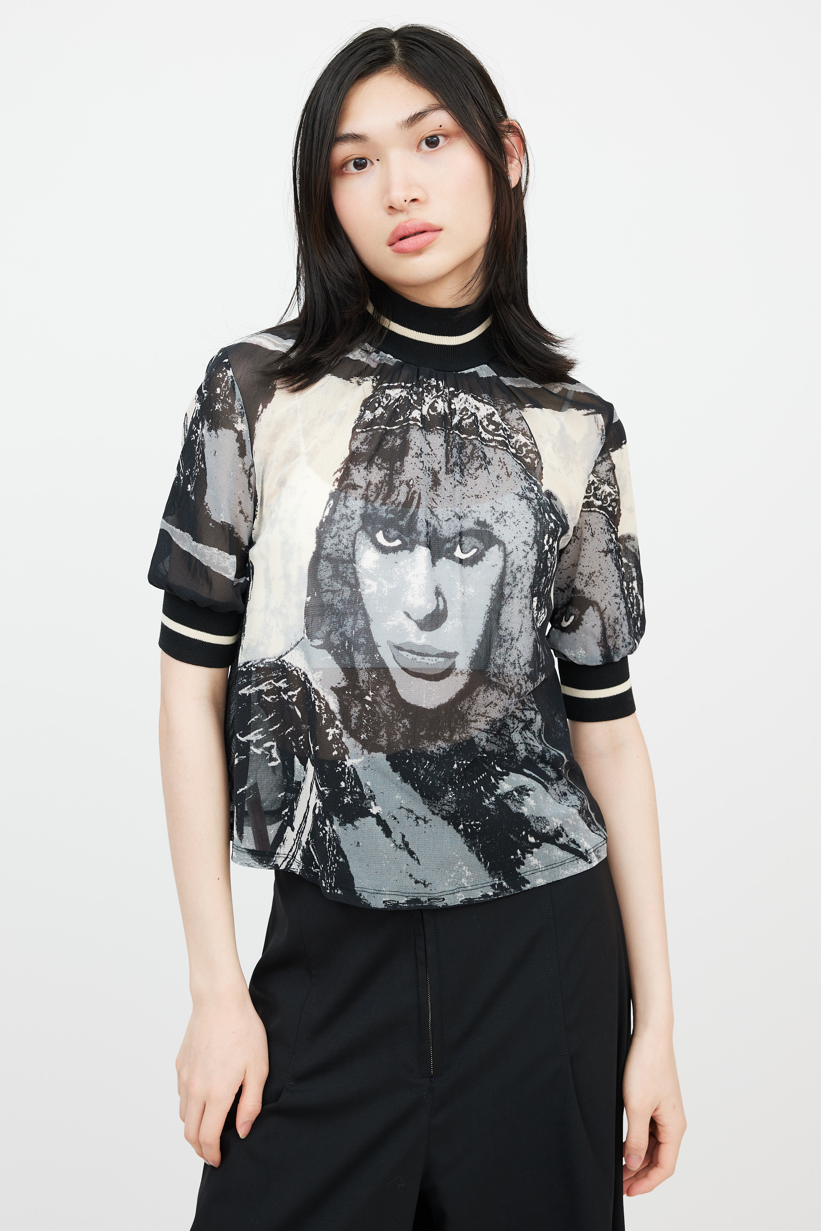 Pre-owned Jean Paul Gaultier black, cream, and grey mesh top featuring a ribbed mock neck, "The Fifth Element" Milla Jovovich graphic throughout front and back bodice, and short sleeves with ribbed cuffs.