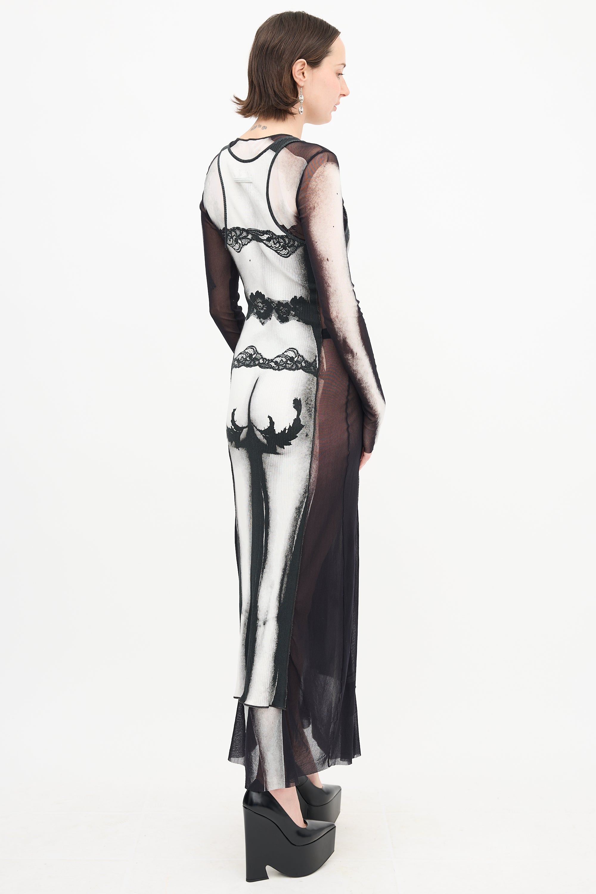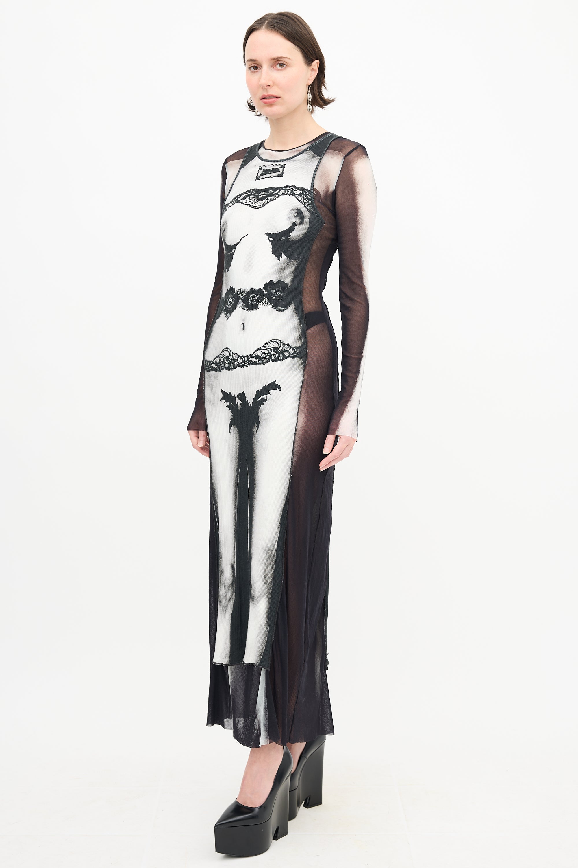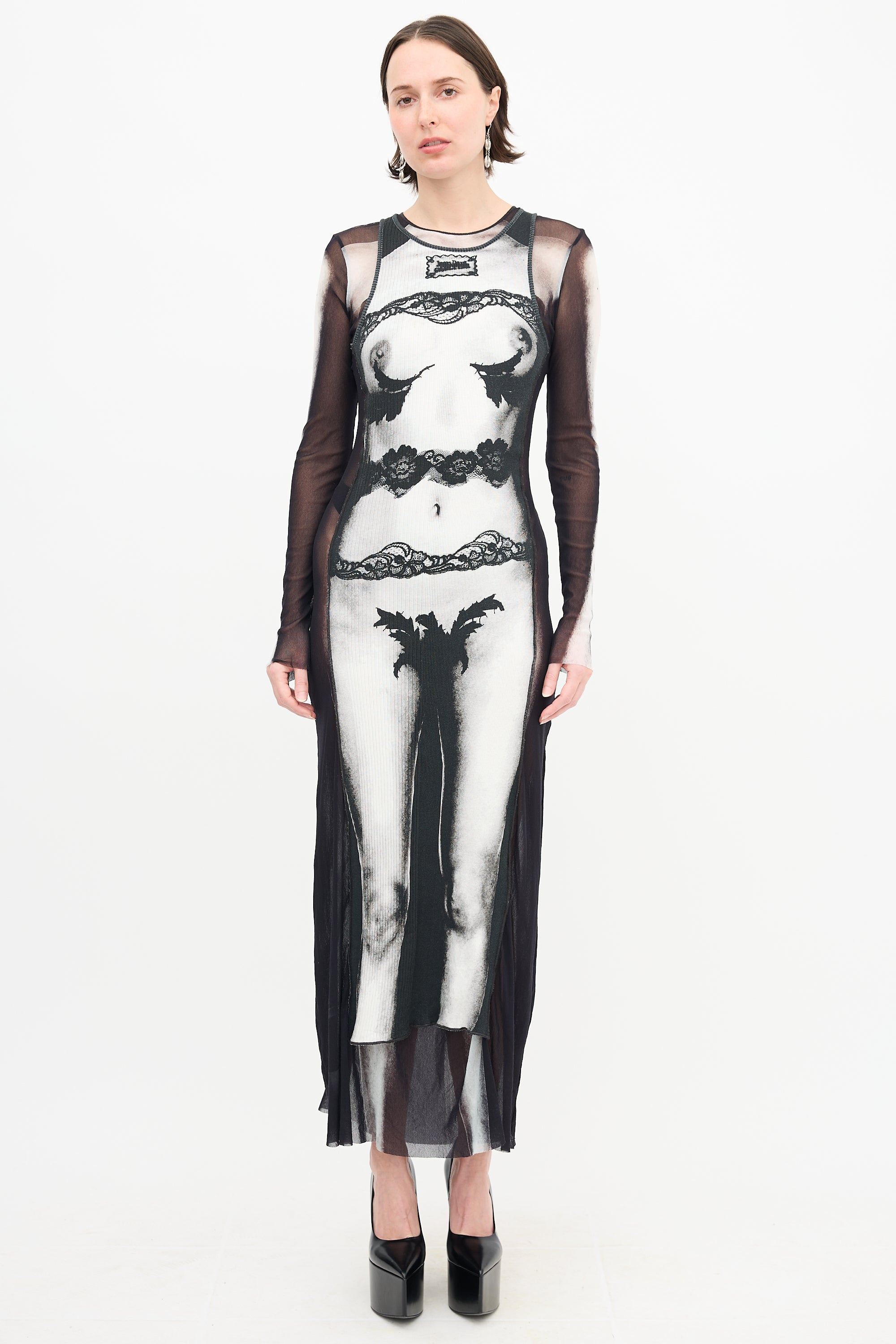 Pre-owned Jean Paul Gaultier black and grey maxi dress featuring a crew neckline, trompe l'oeil body print, mesh paneling, and a logo printed at chest. Unlined.