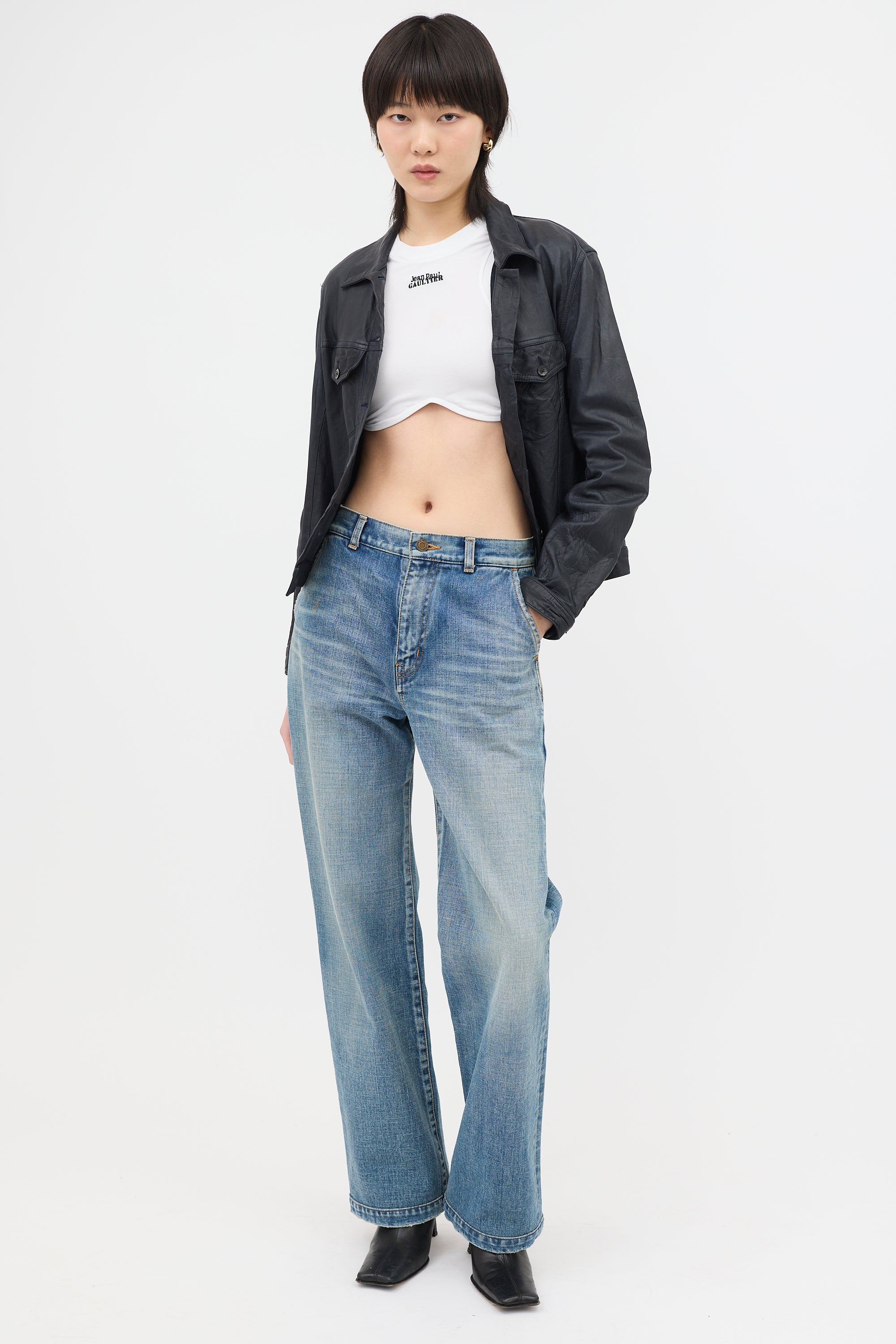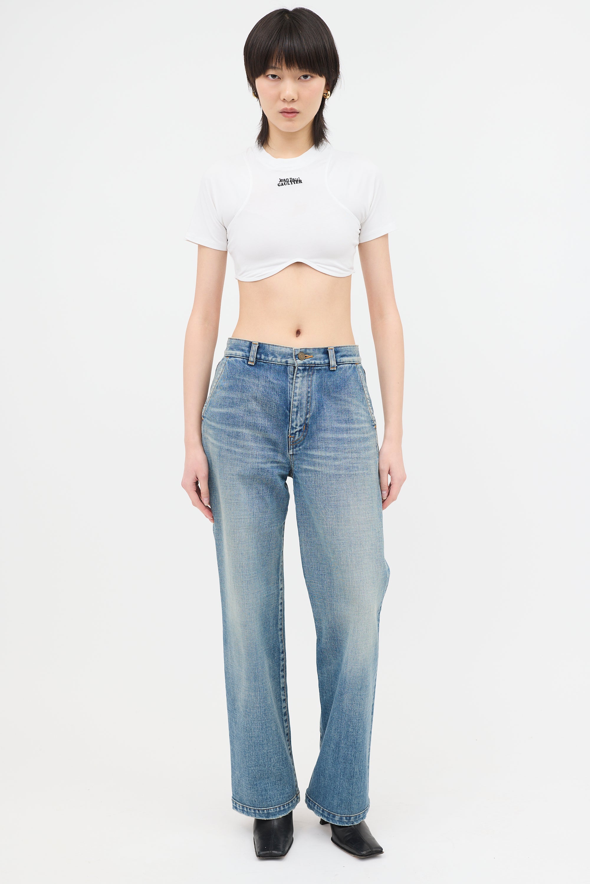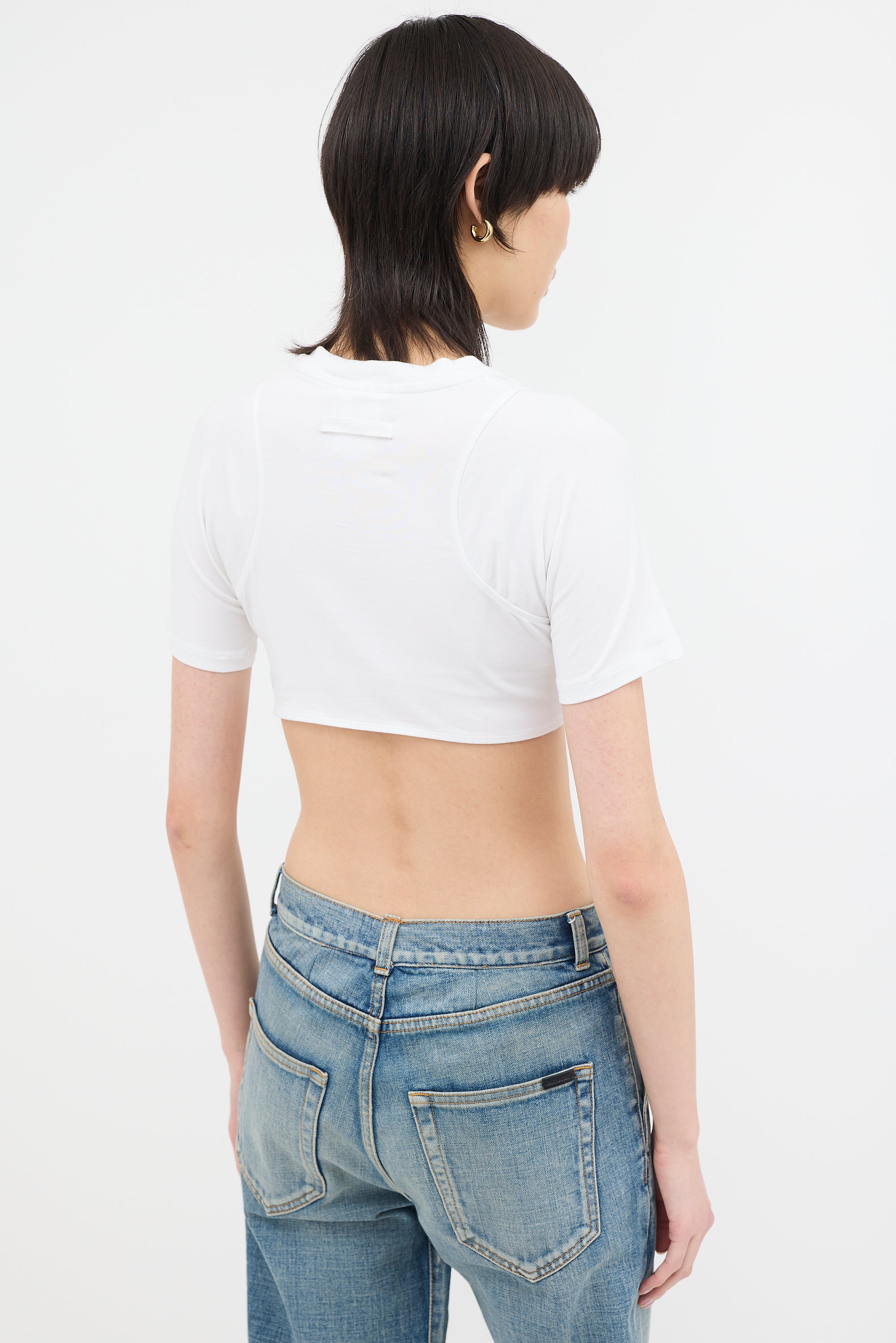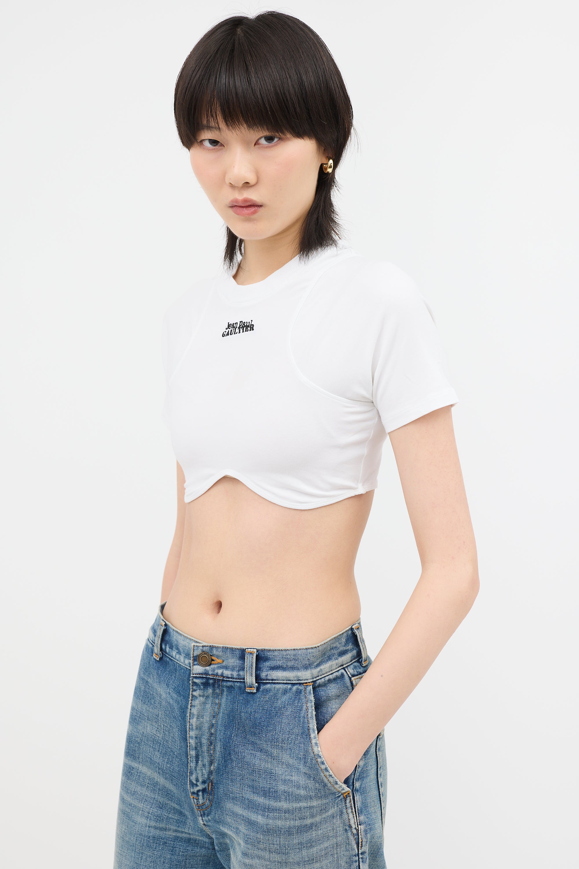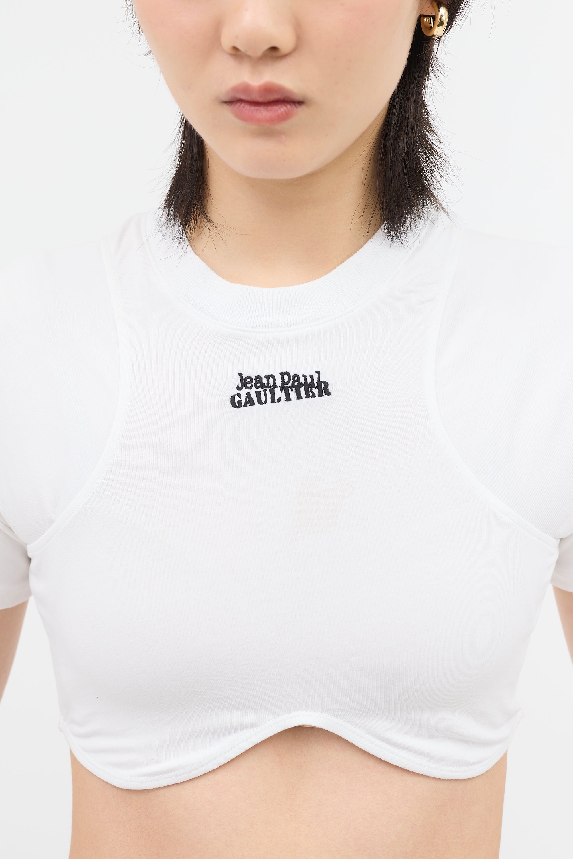 Pre-owned Jean Paul Gaultier white cropped T-shirt featuring ribbed round neckline, black embroidered logo at chest, and curved hem.