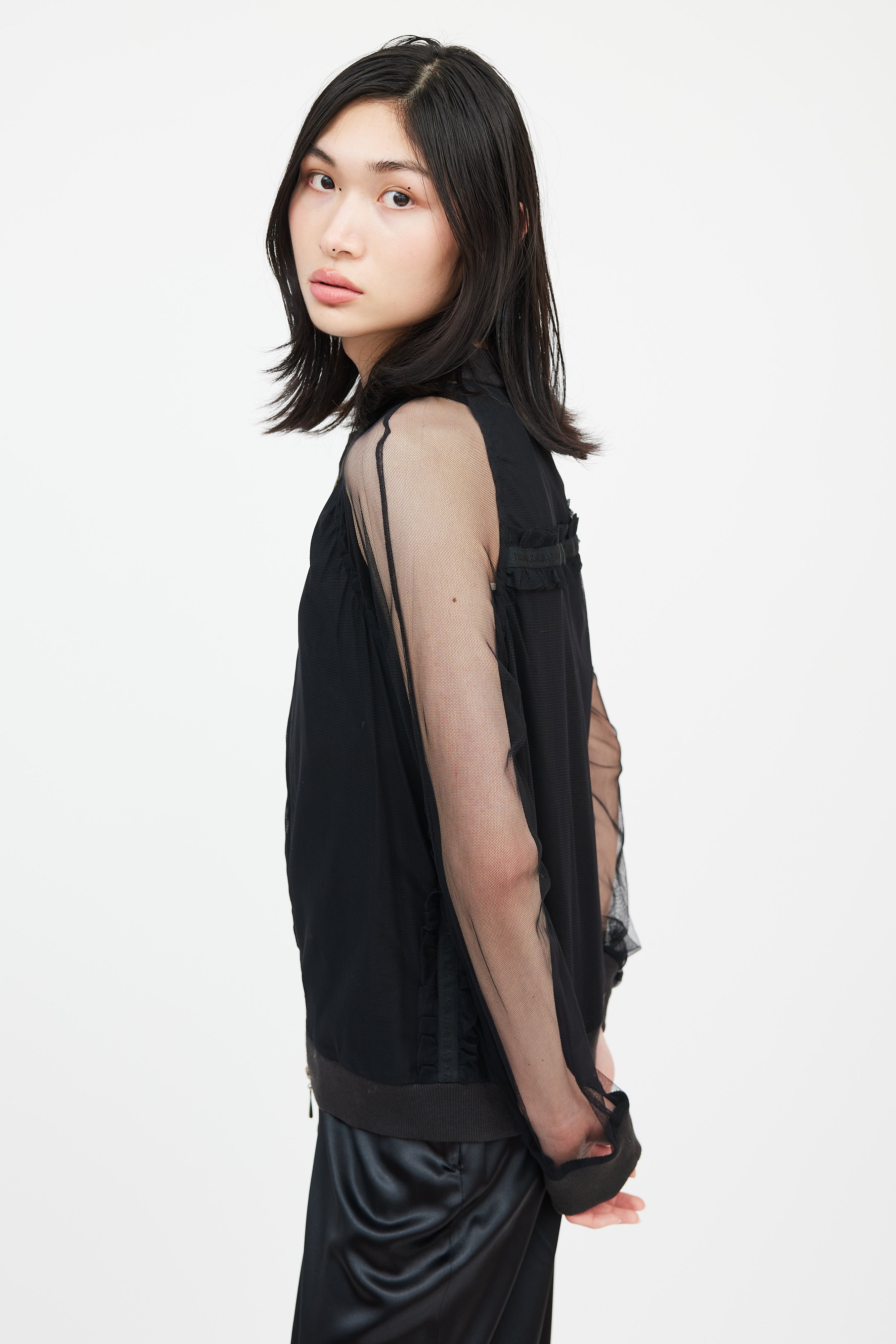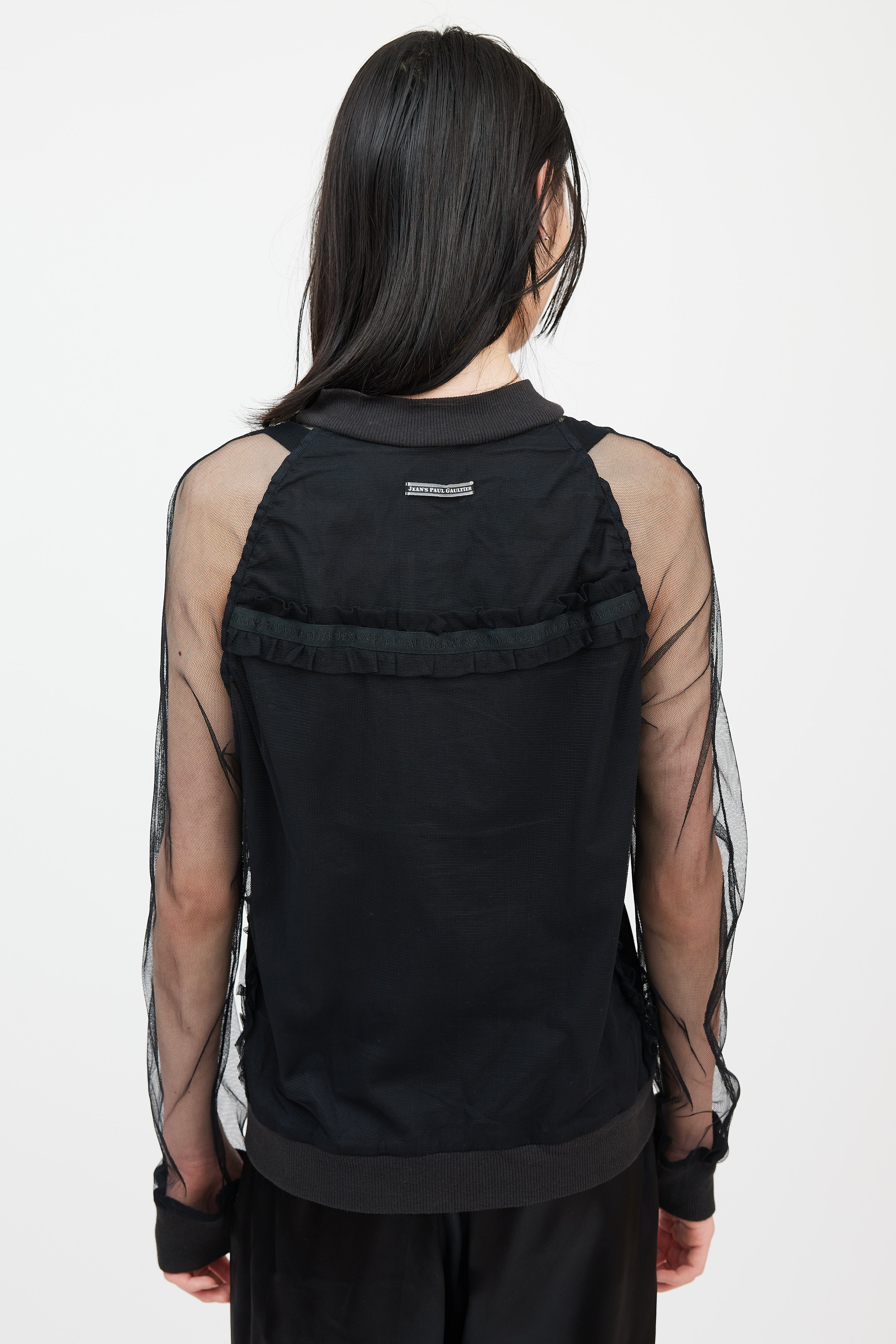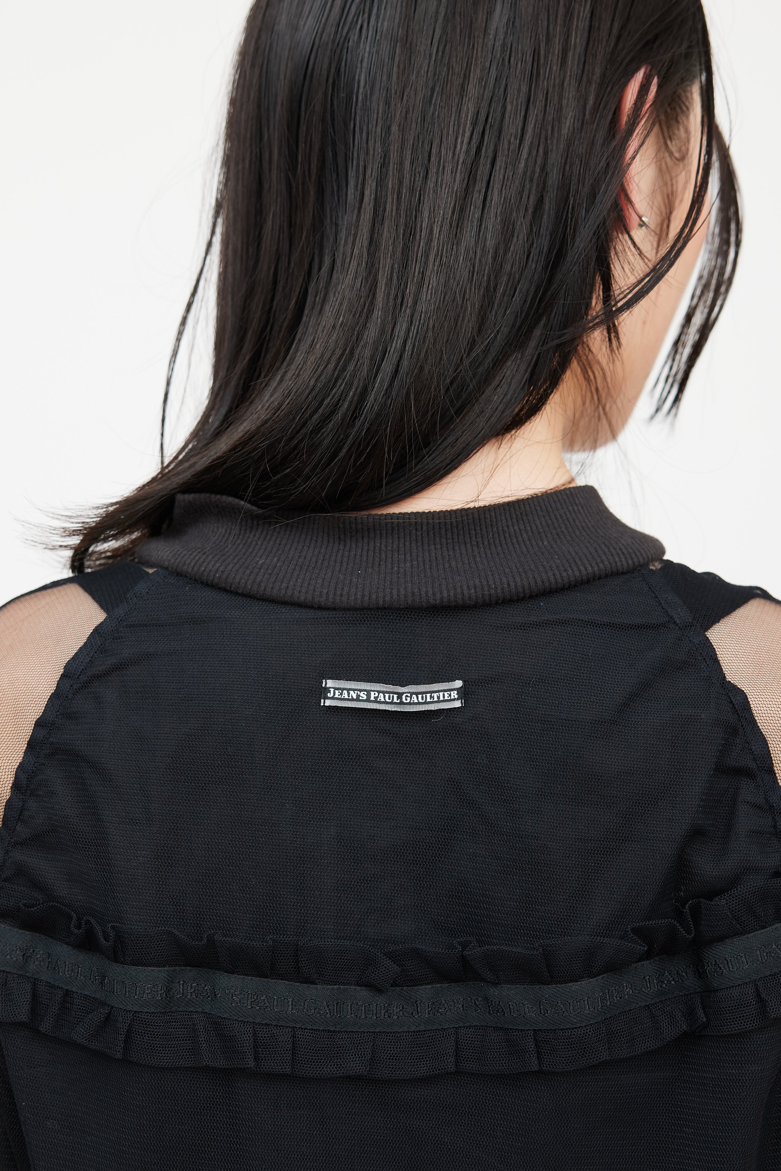 Pre-owned Jean Paul Gaultier Jean's black bomber jacket featuring a round neckline, mesh bodice, front double zip, logo label tag at upper back, logo embroidered ribbon and ruffle trim at back and sides, mesh sleeves, and ribbing at neck, hem, and cuffs. Partially lined.