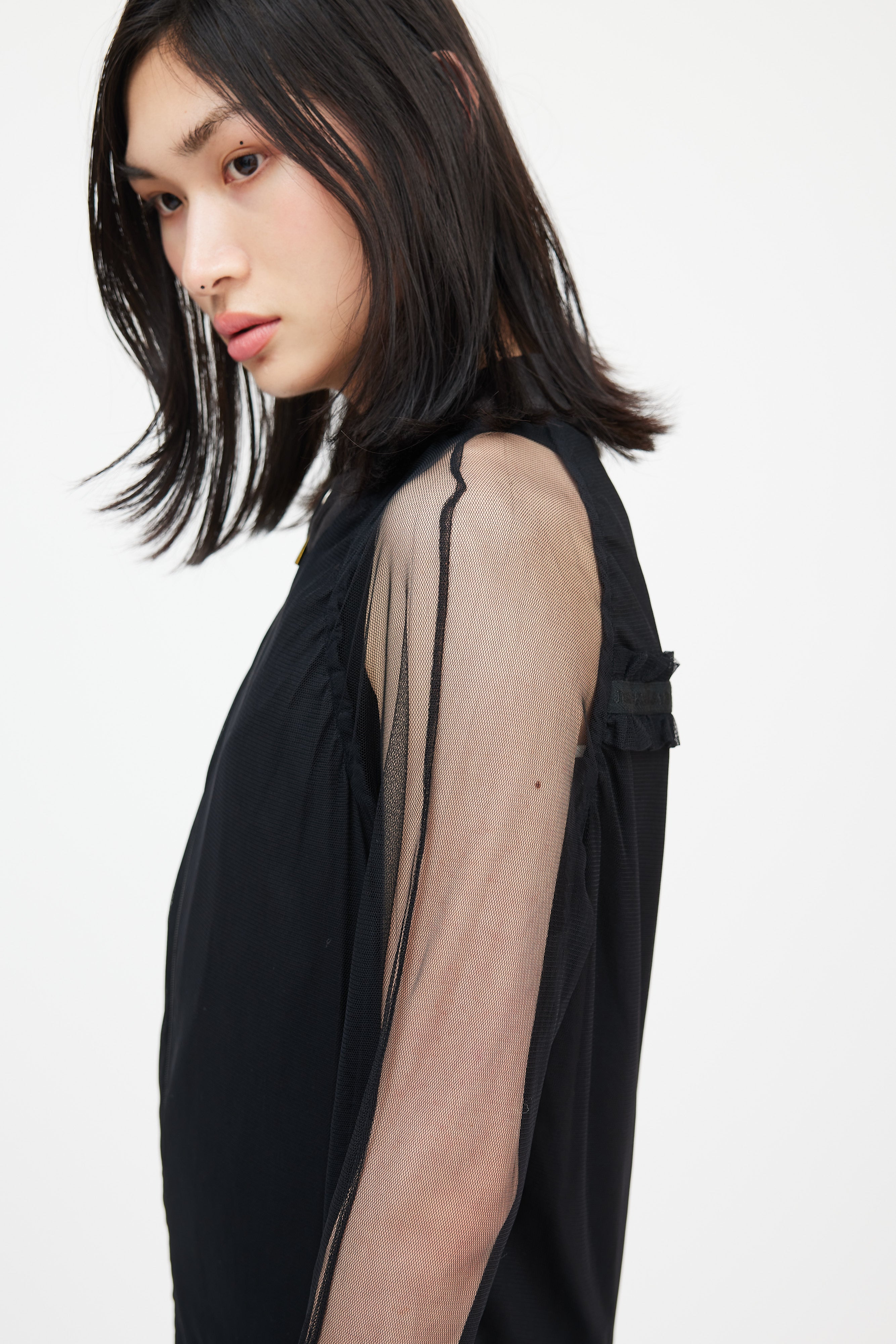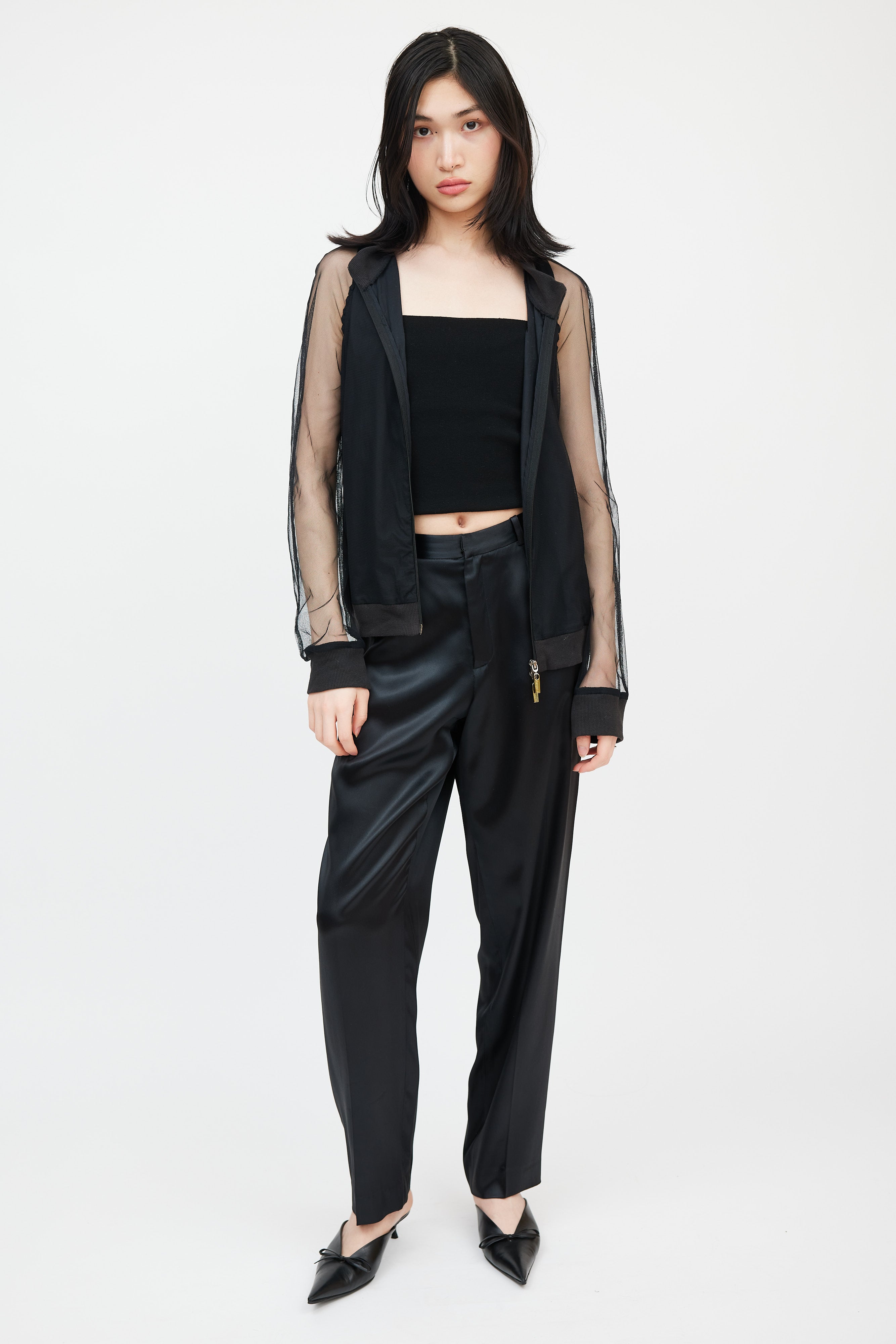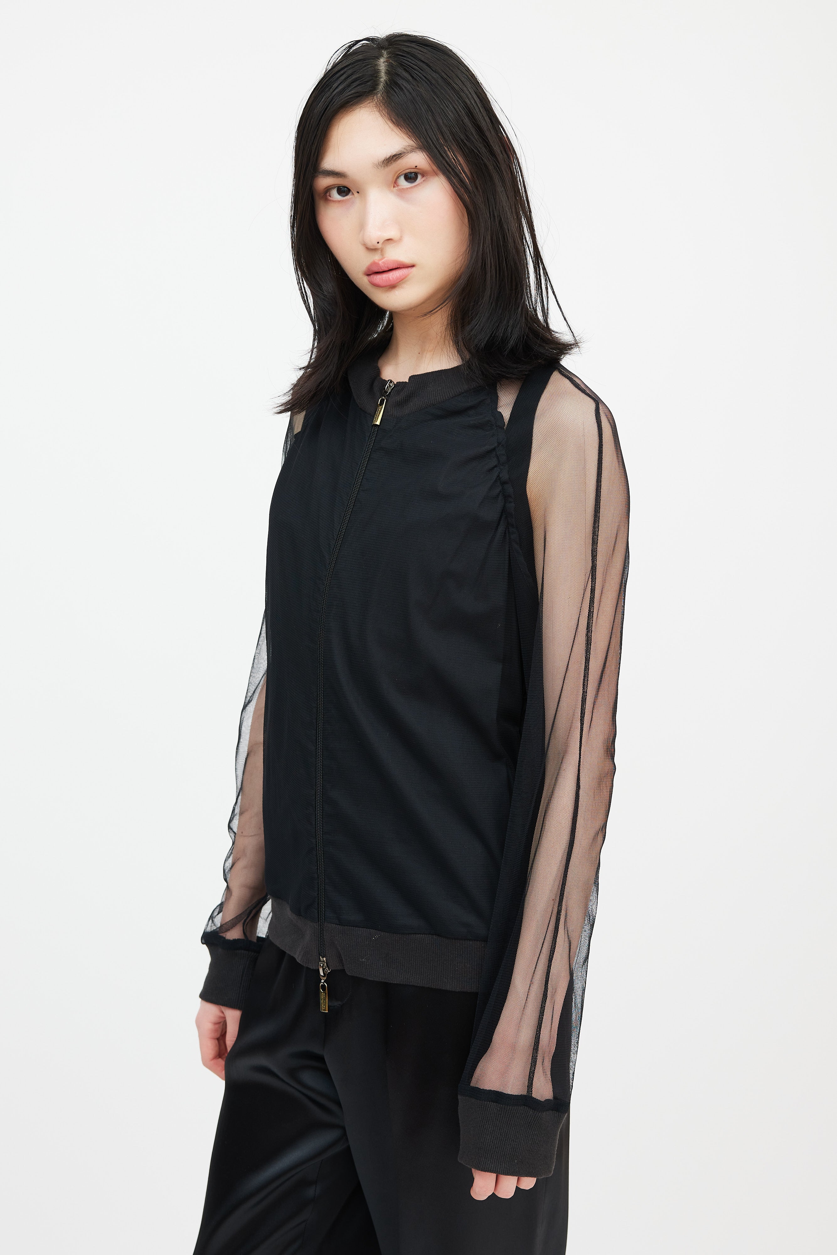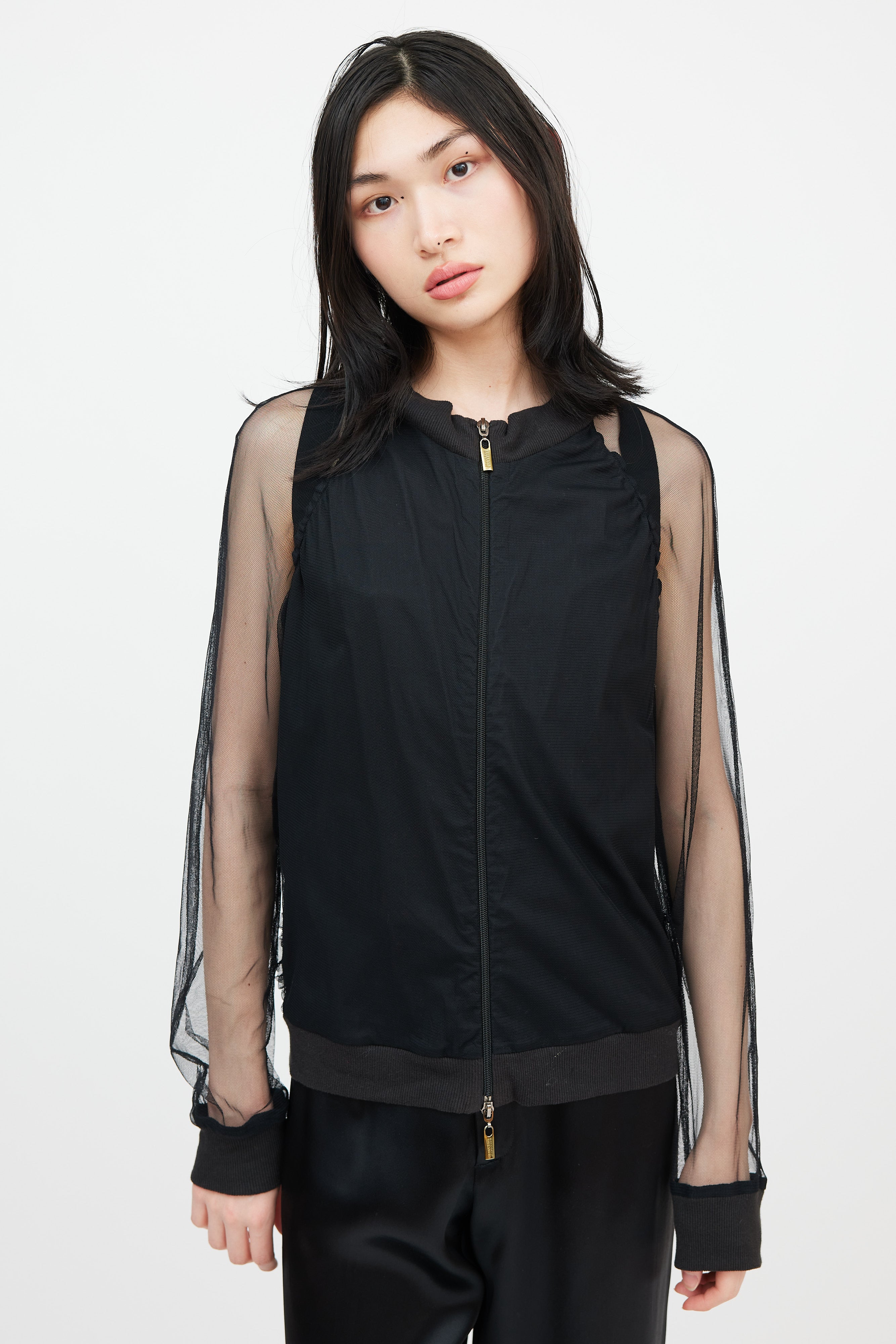 Pre-owned Jean Paul Gaultier Jean's black bomber jacket featuring a round neckline, mesh bodice, front double zip, logo label tag at upper back, logo embroidered ribbon and ruffle trim at back and sides, mesh sleeves, and ribbing at neck, hem, and cuffs. Partially lined.
