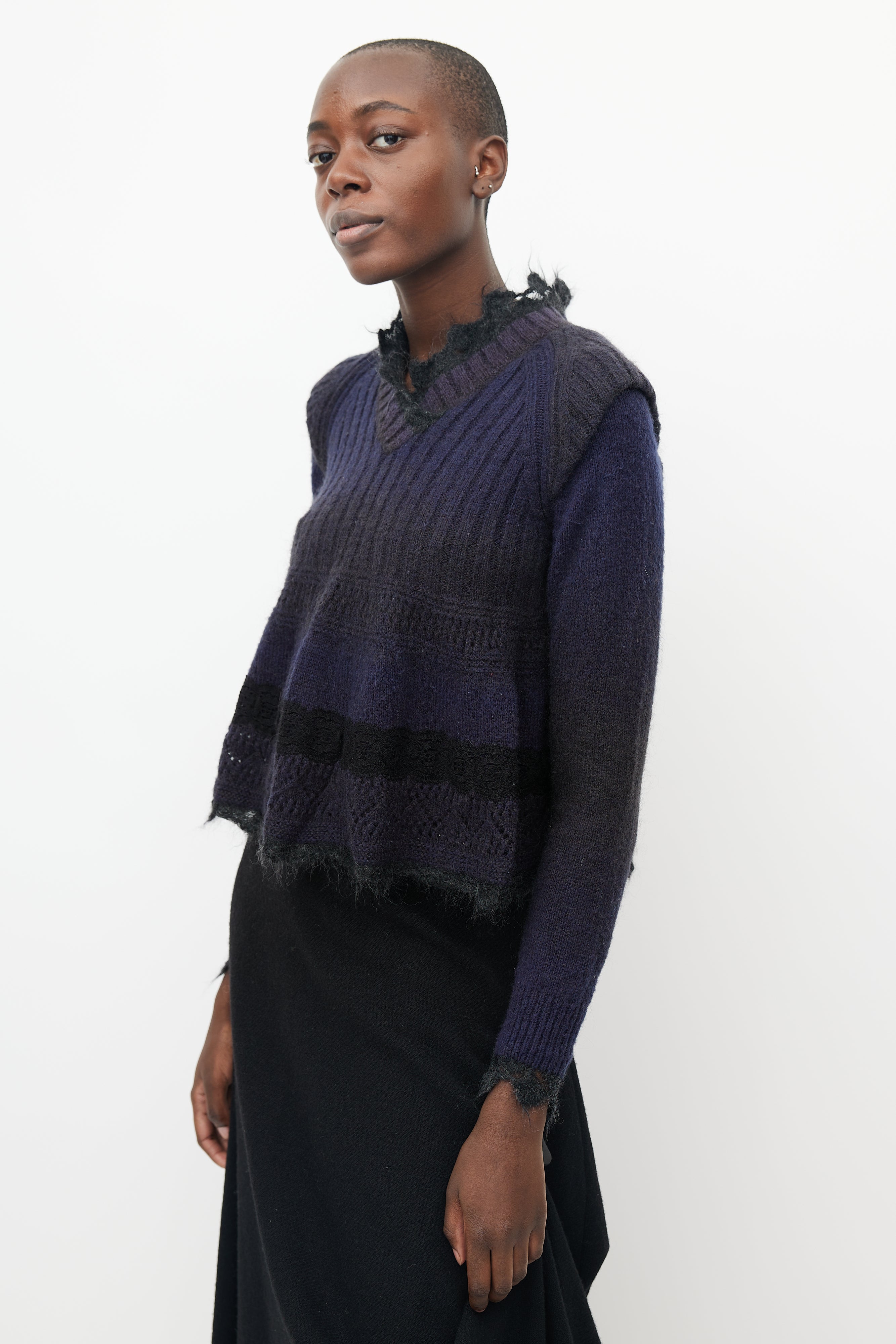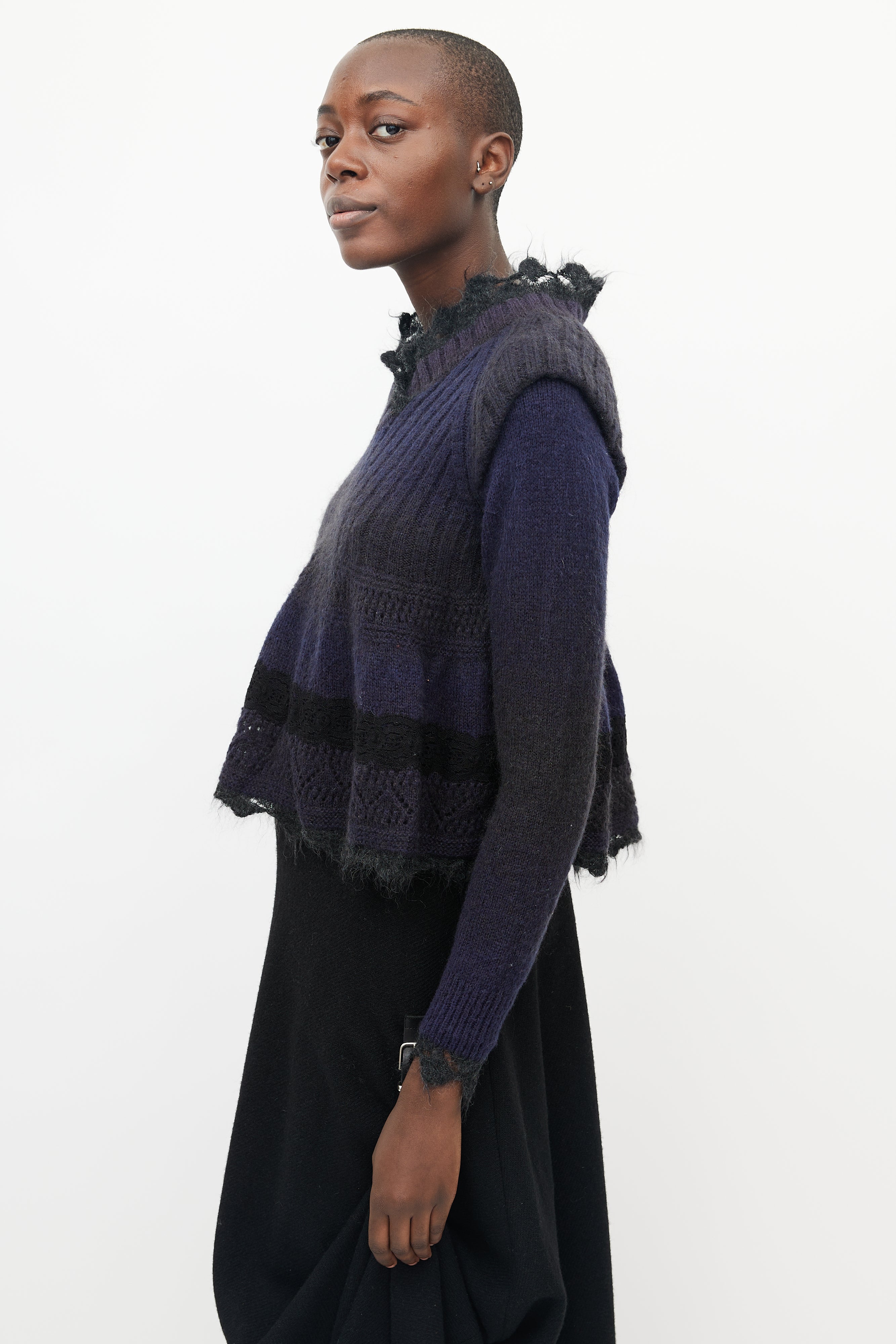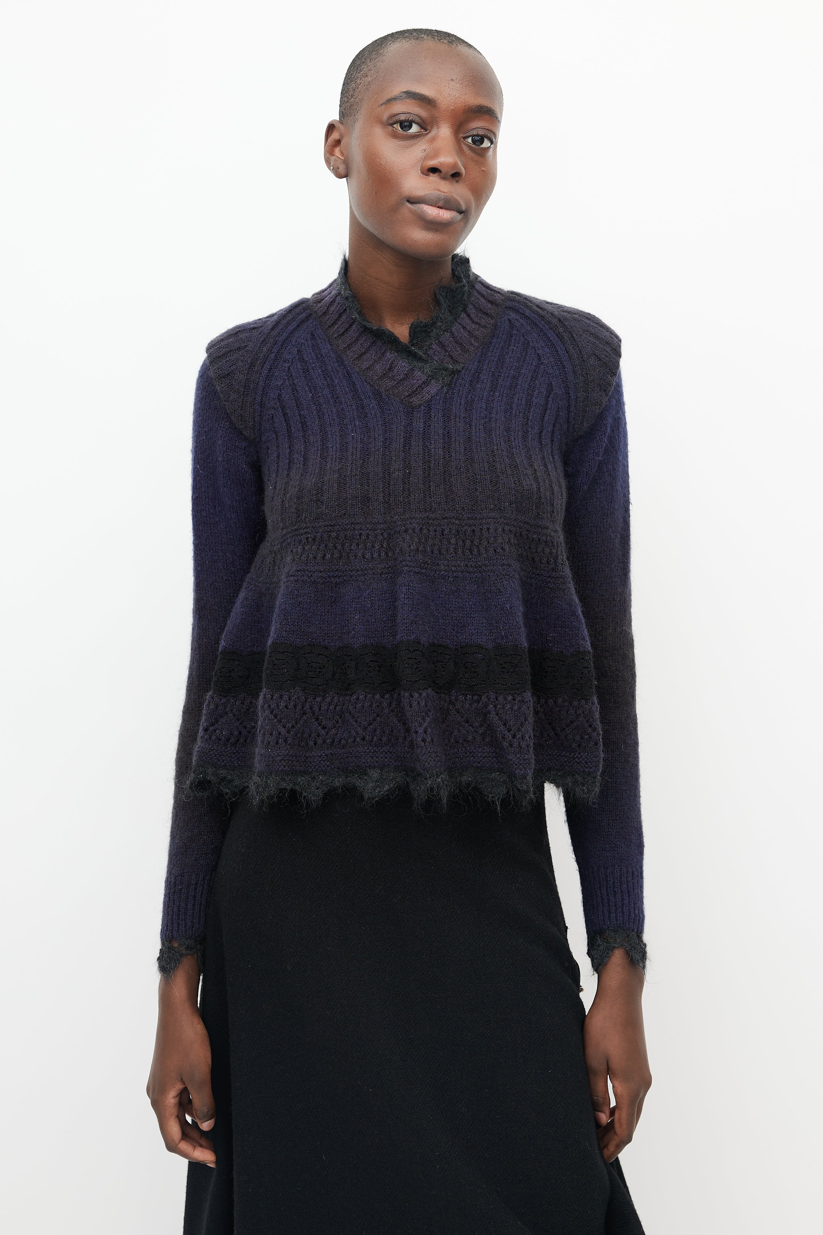 Pre-owned Jean Paul Gaultier sweater featuring ribbed knit cap sleeve detail at shoulder, black mohair lace trim at neck, bottom hem and wrist cuff, ribbed V-neck and lace knitted detail at peplum.