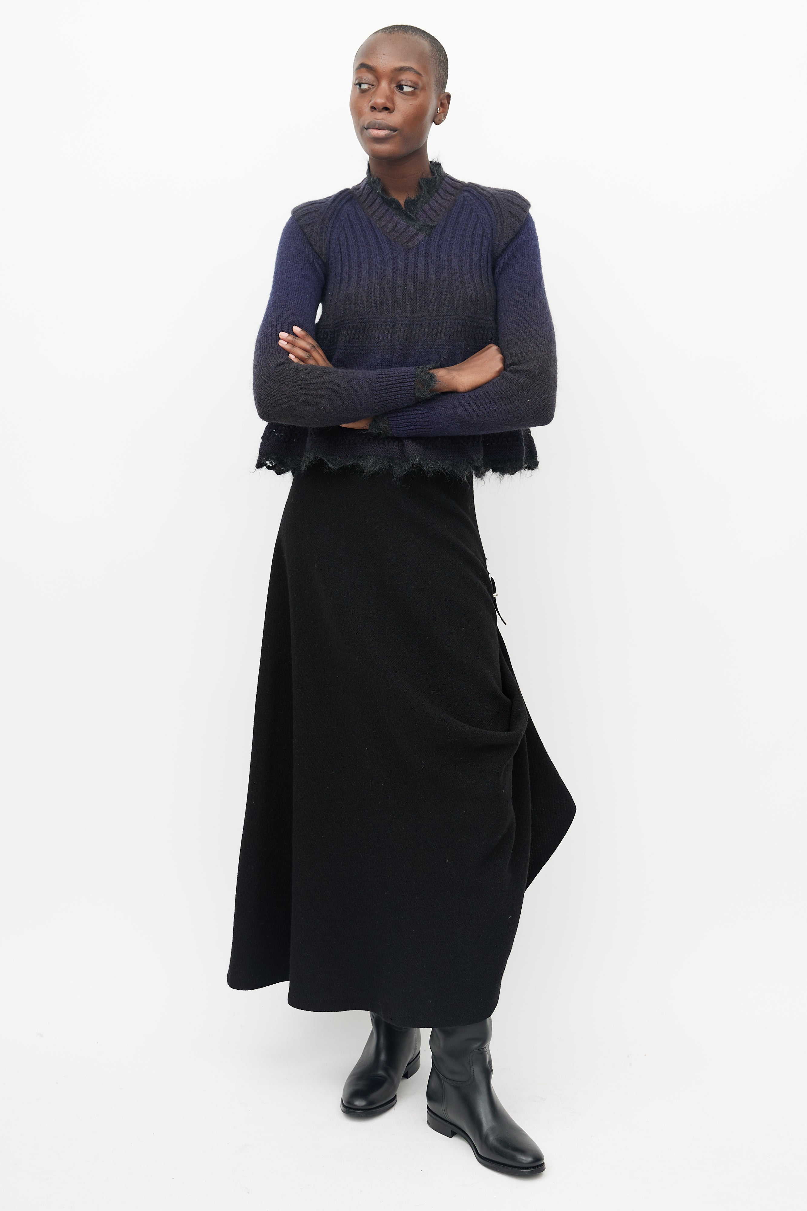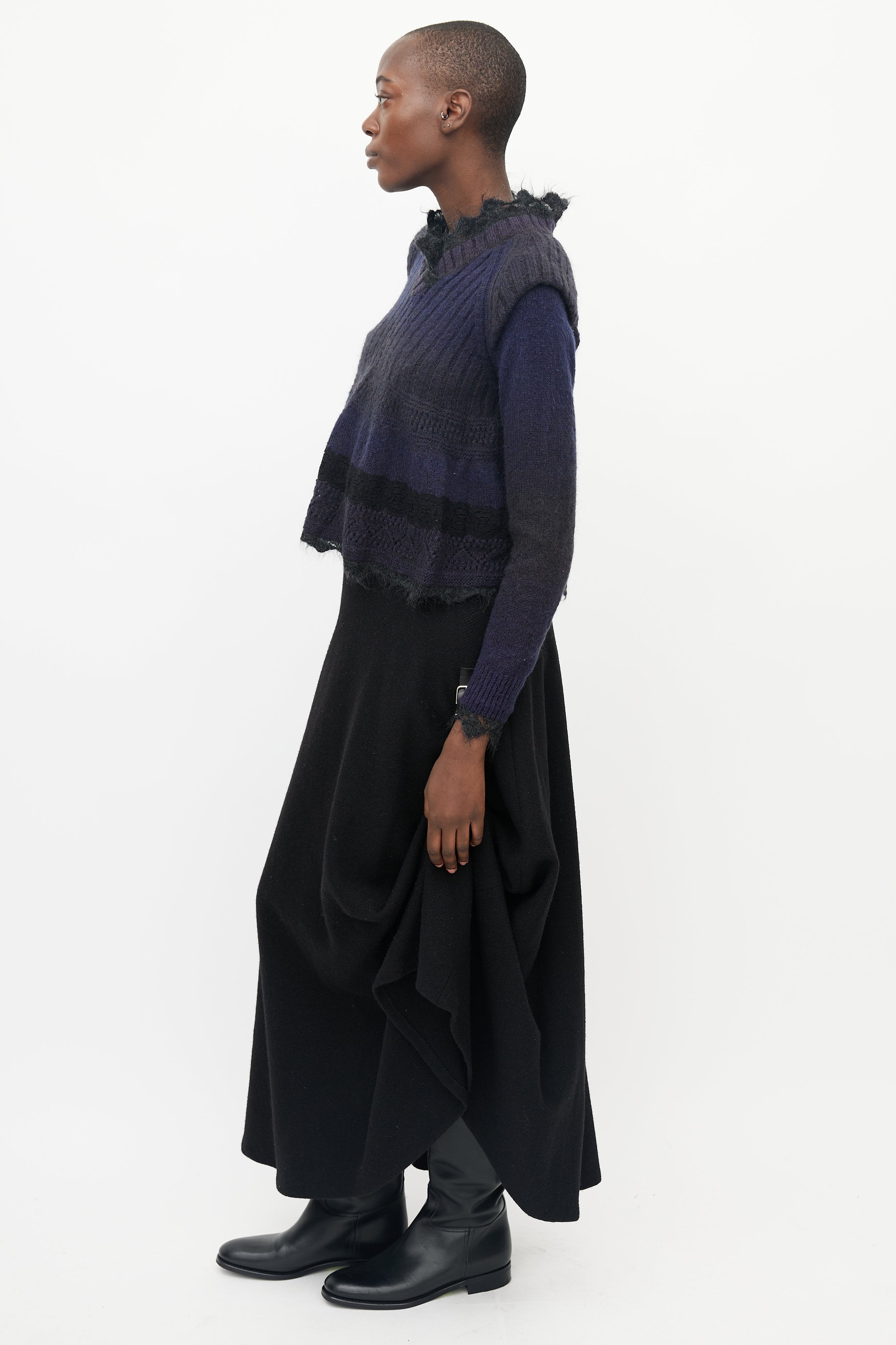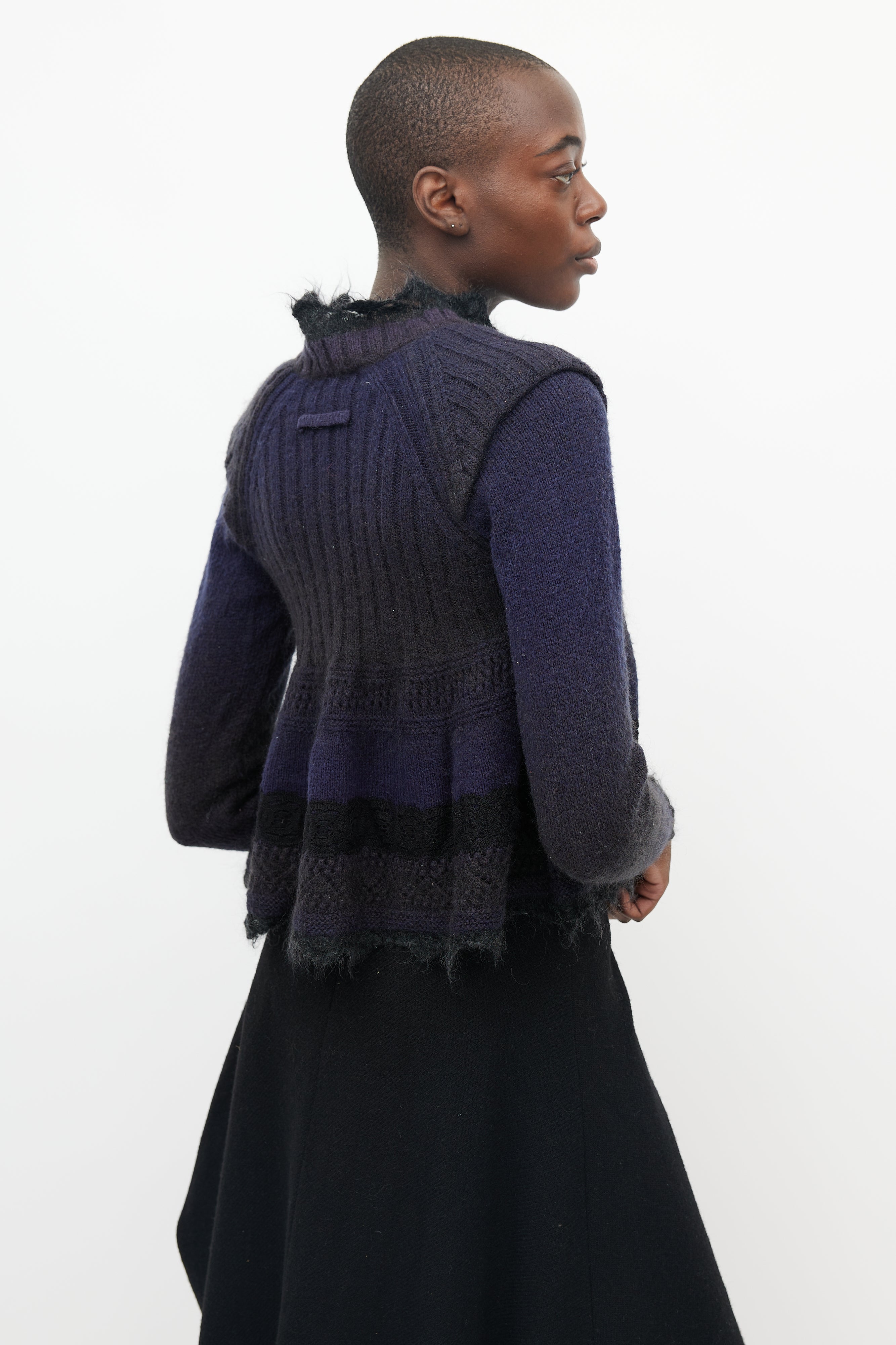 Pre-owned Jean Paul Gaultier sweater featuring ribbed knit cap sleeve detail at shoulder, black mohair lace trim at neck, bottom hem and wrist cuff, ribbed V-neck and lace knitted detail at peplum.