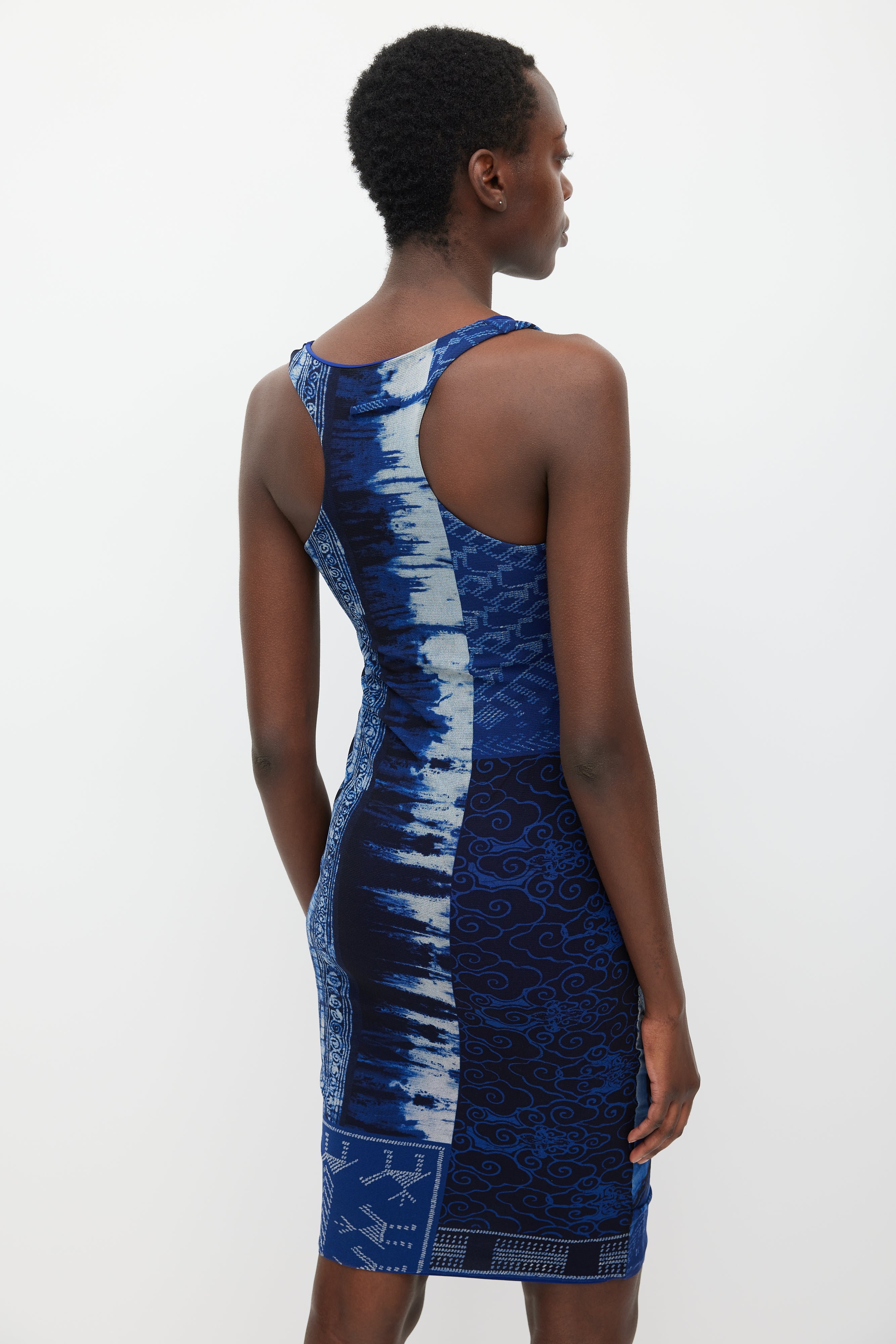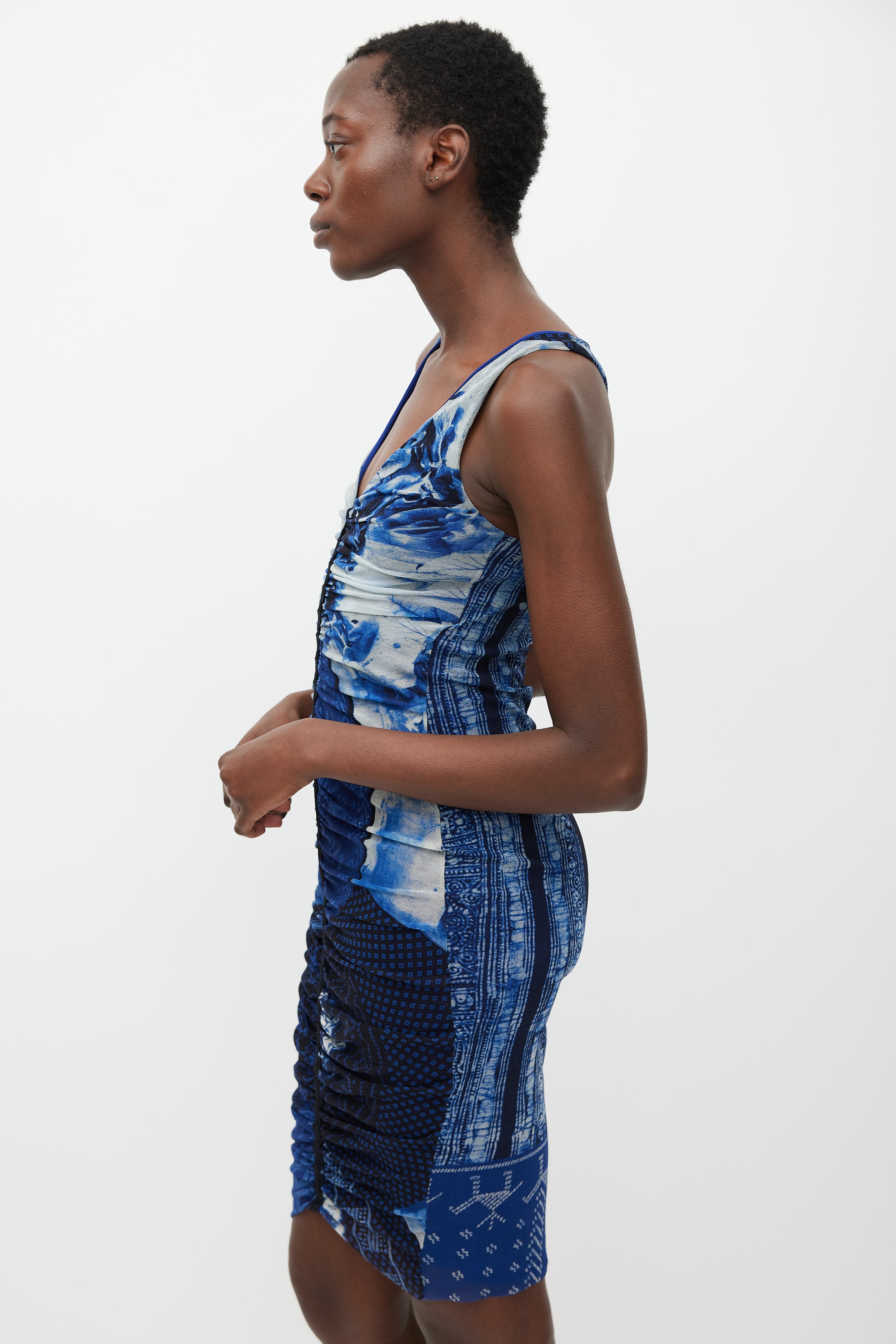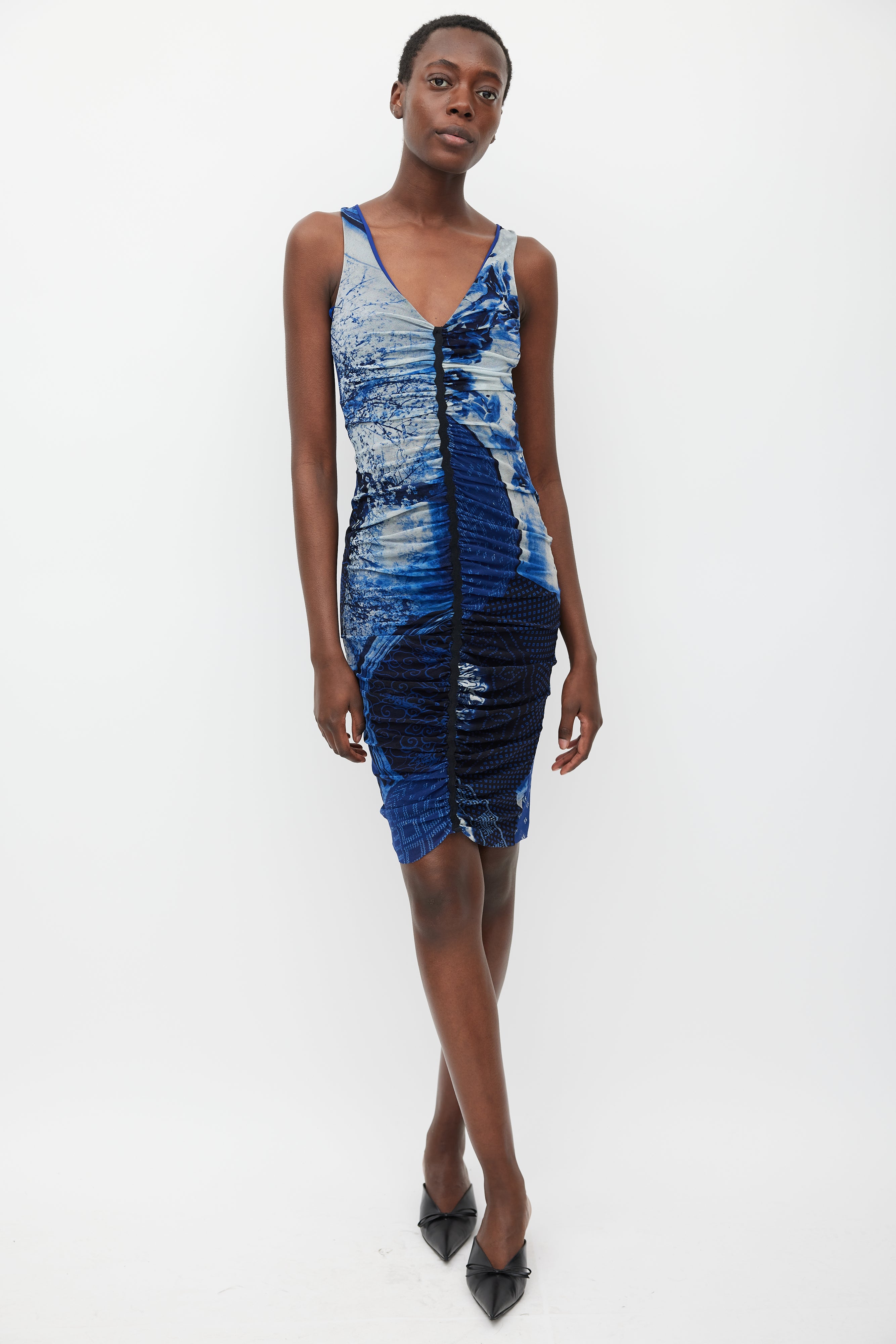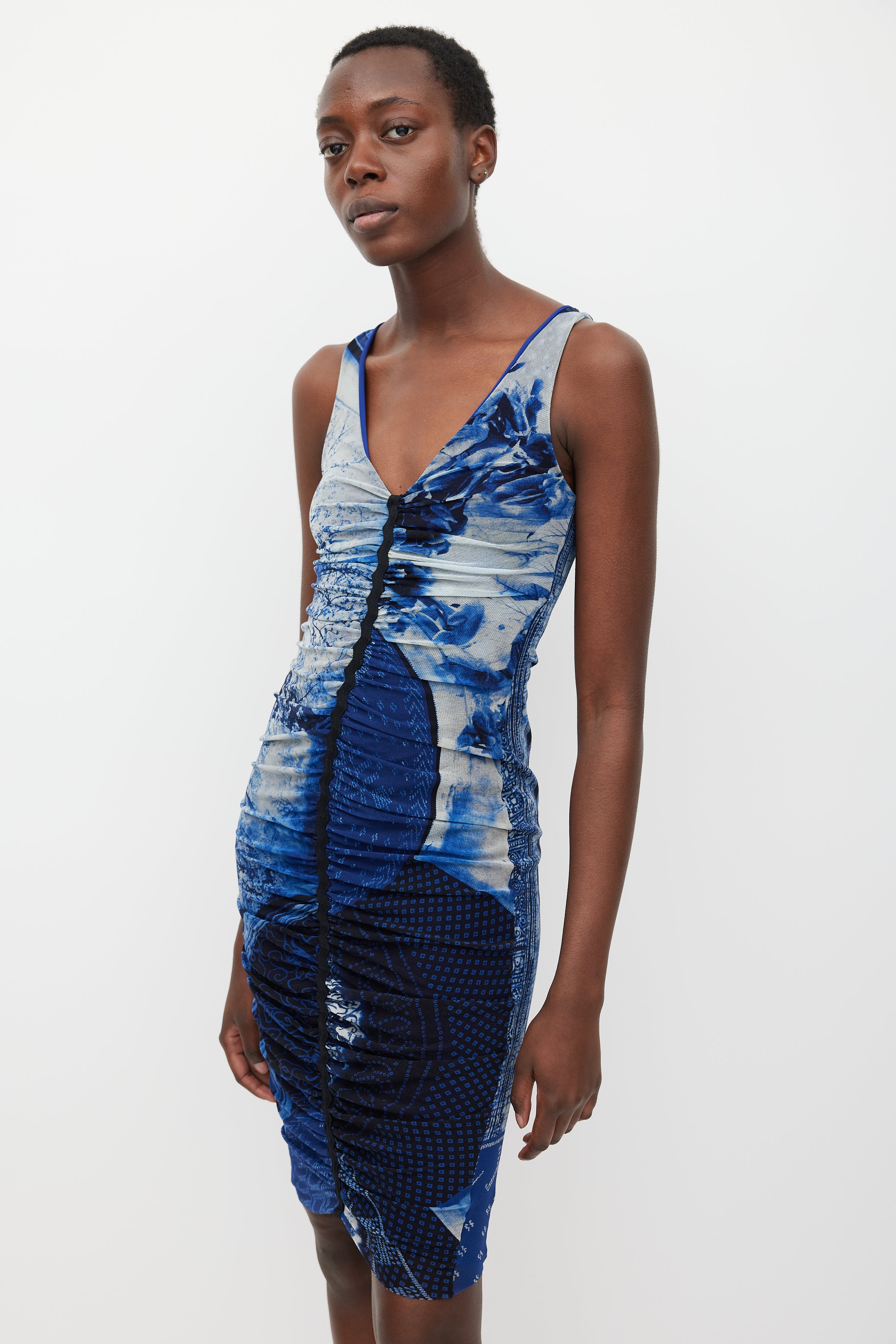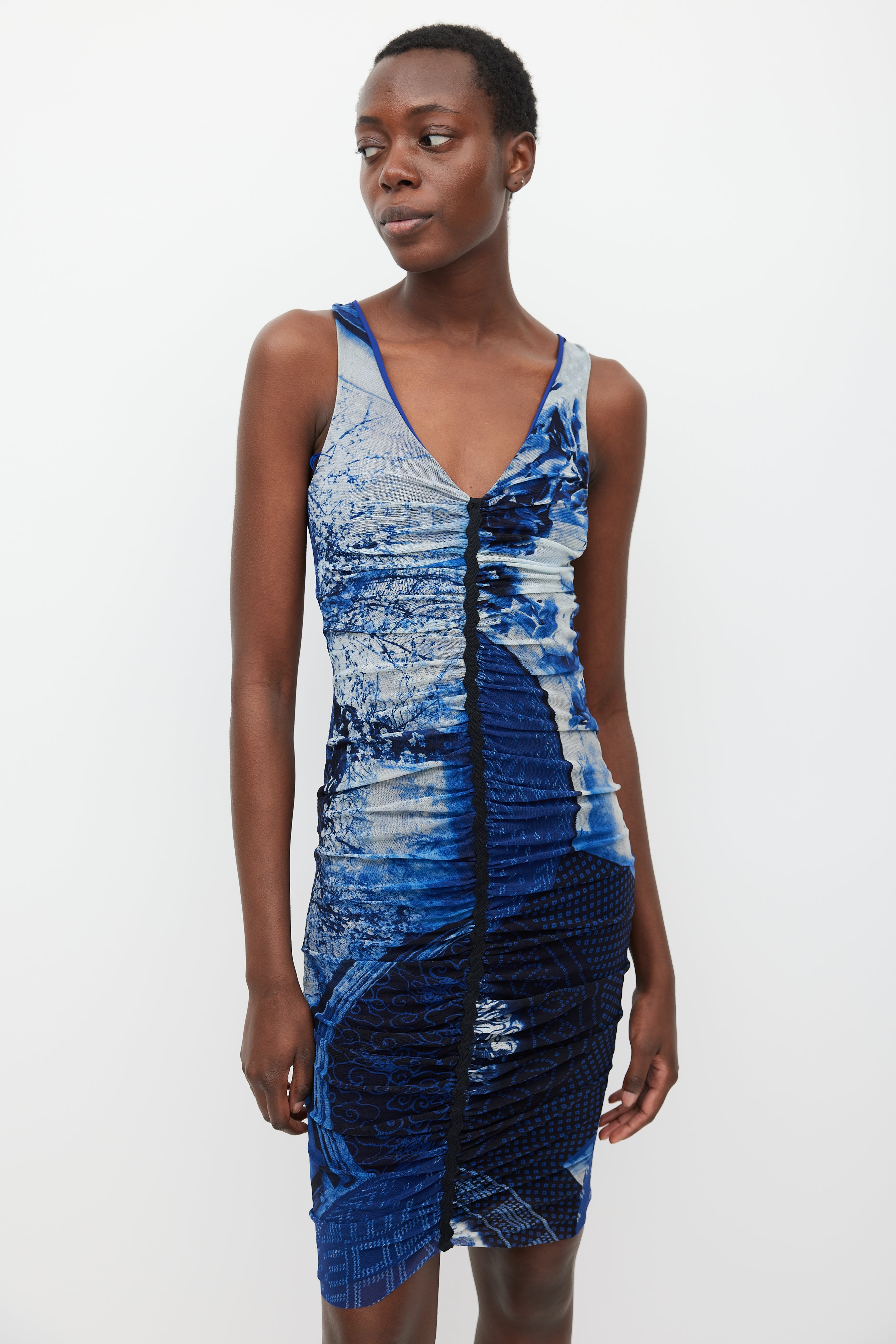 Pre-owned Jean Paul Gaultier Soleil blue and black sleeveless mesh midi dress featuring patchwork effect print throughout, V-neckline, centre front ruching, and raw hem. Lined.
