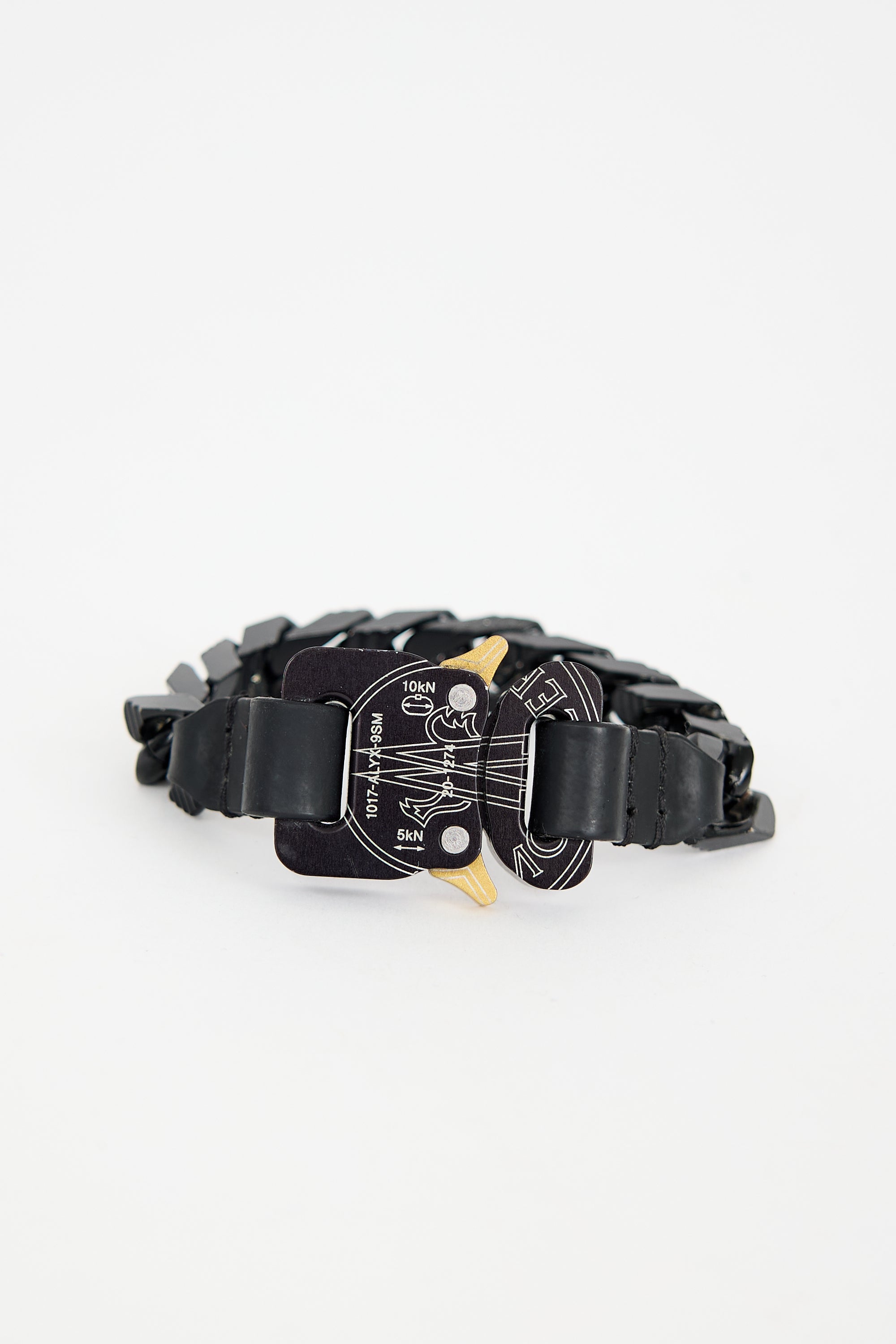 Pre-owned 1018 Alyx 9SM X Moncler black bracelet featuring textured chunky chain and signature quick release buckle closure with printed logo.