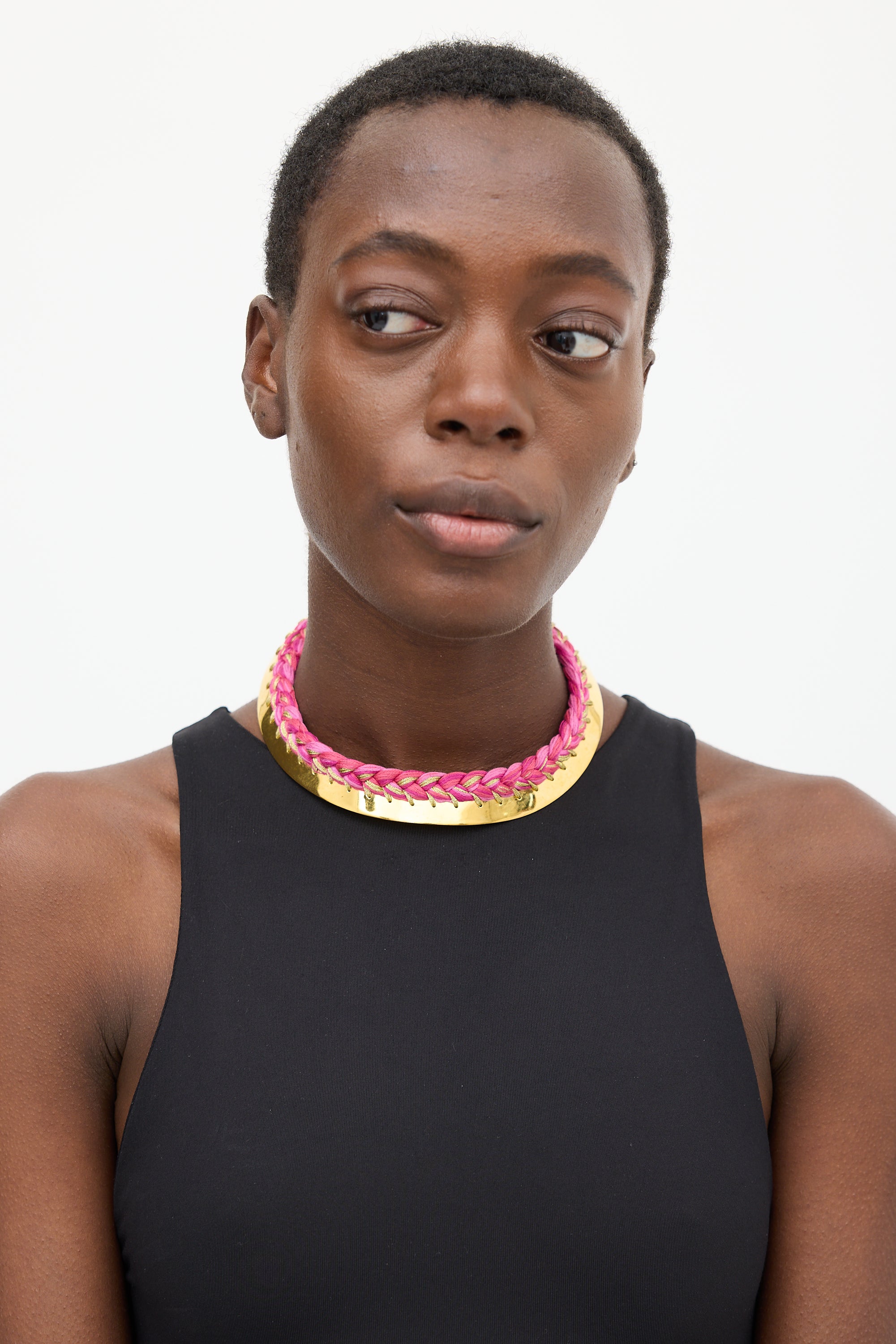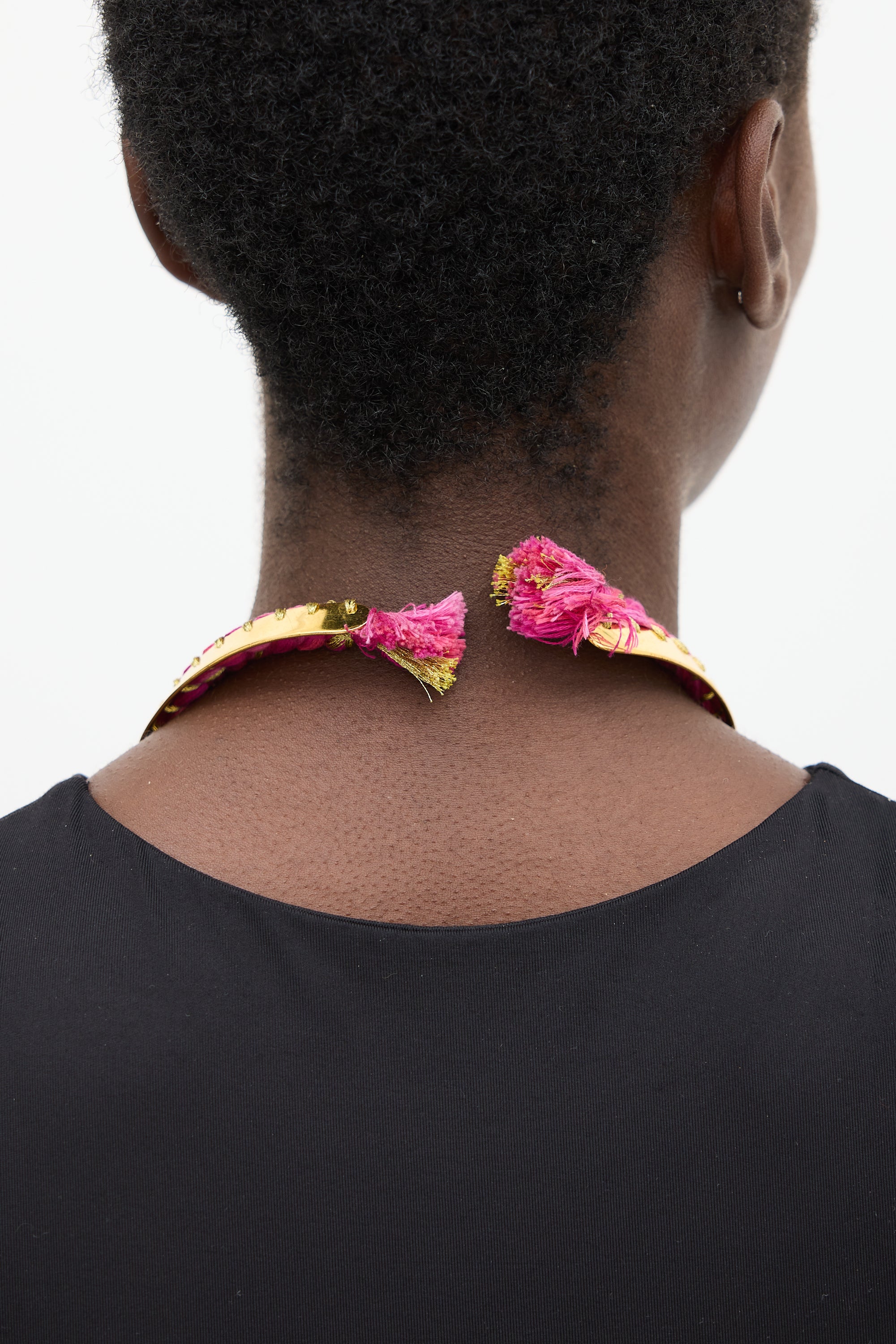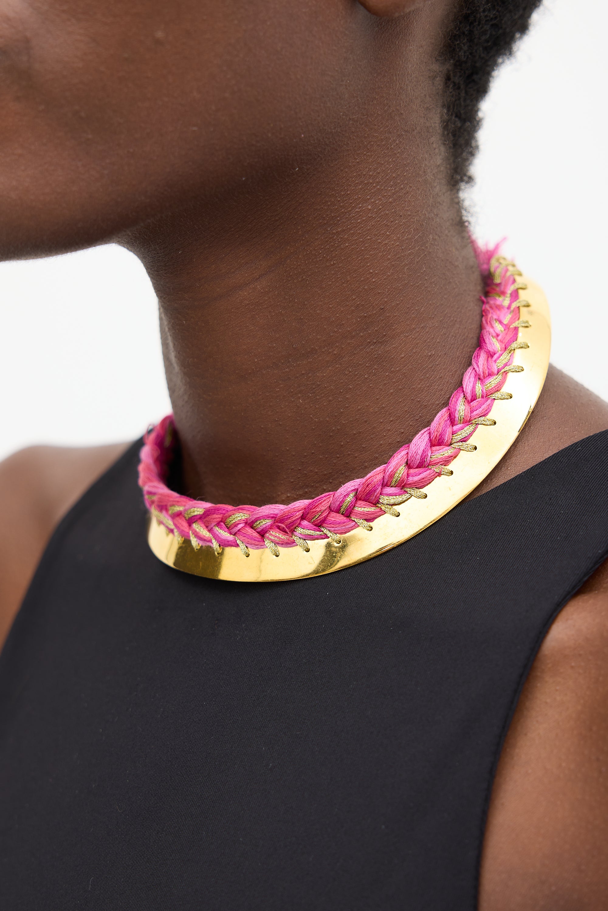 Pre-owned Aurélie Bidermann gold tone choker featuring pink braided trim, and stamped logo at interior.