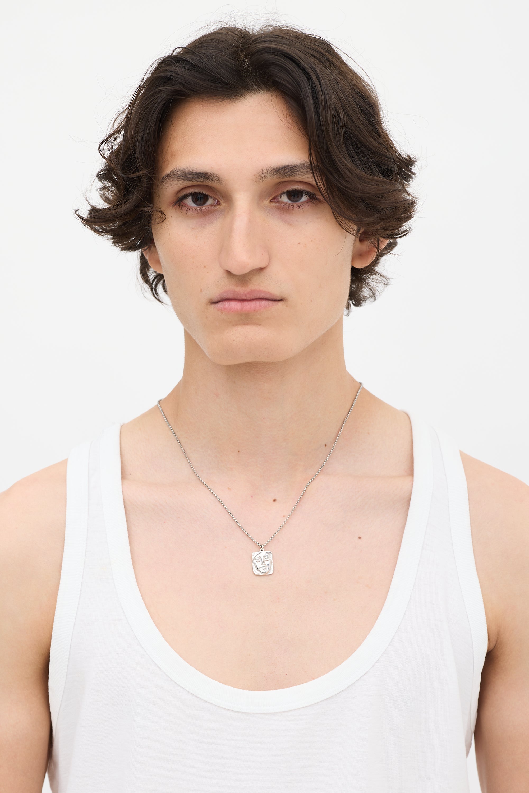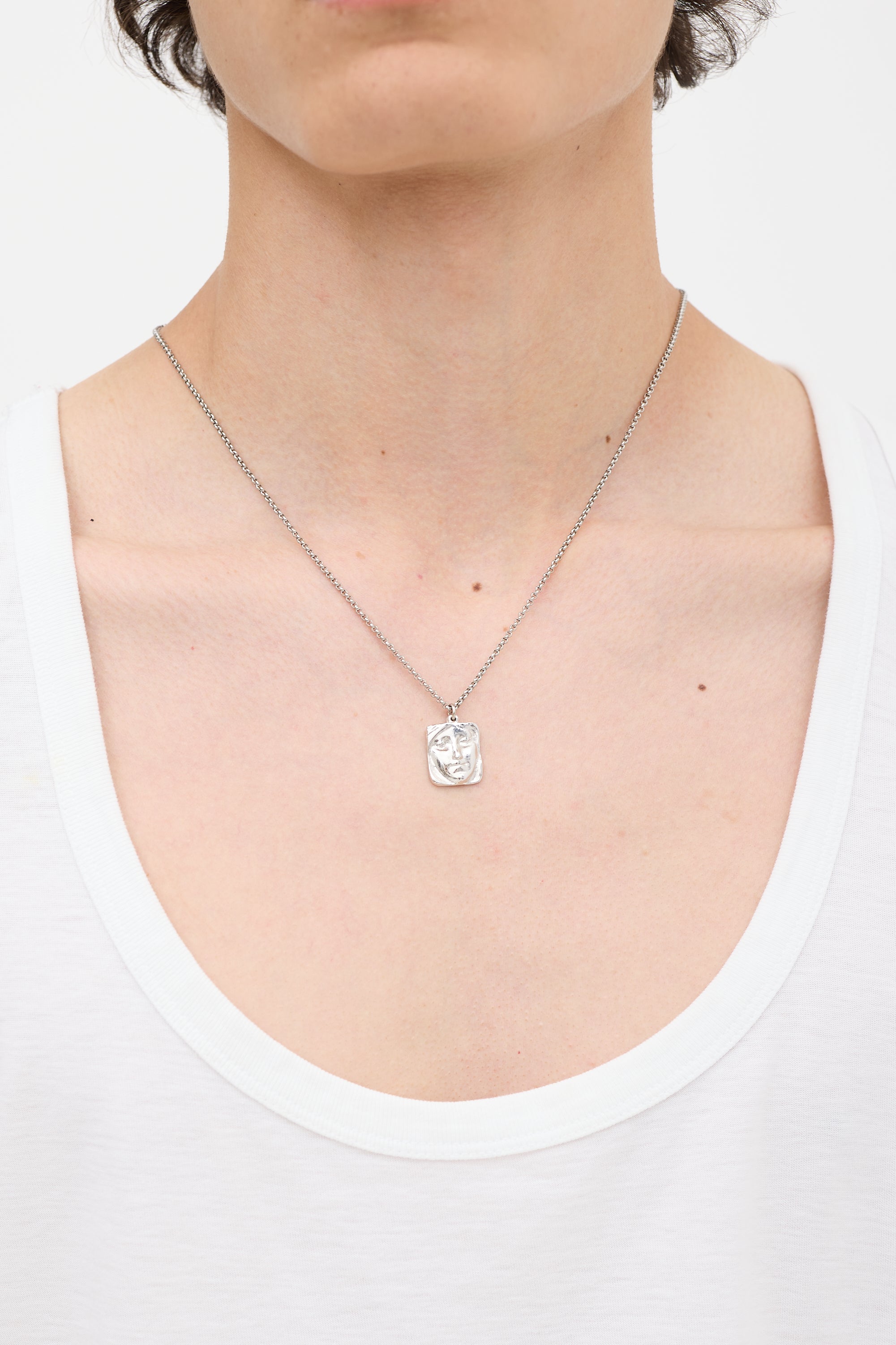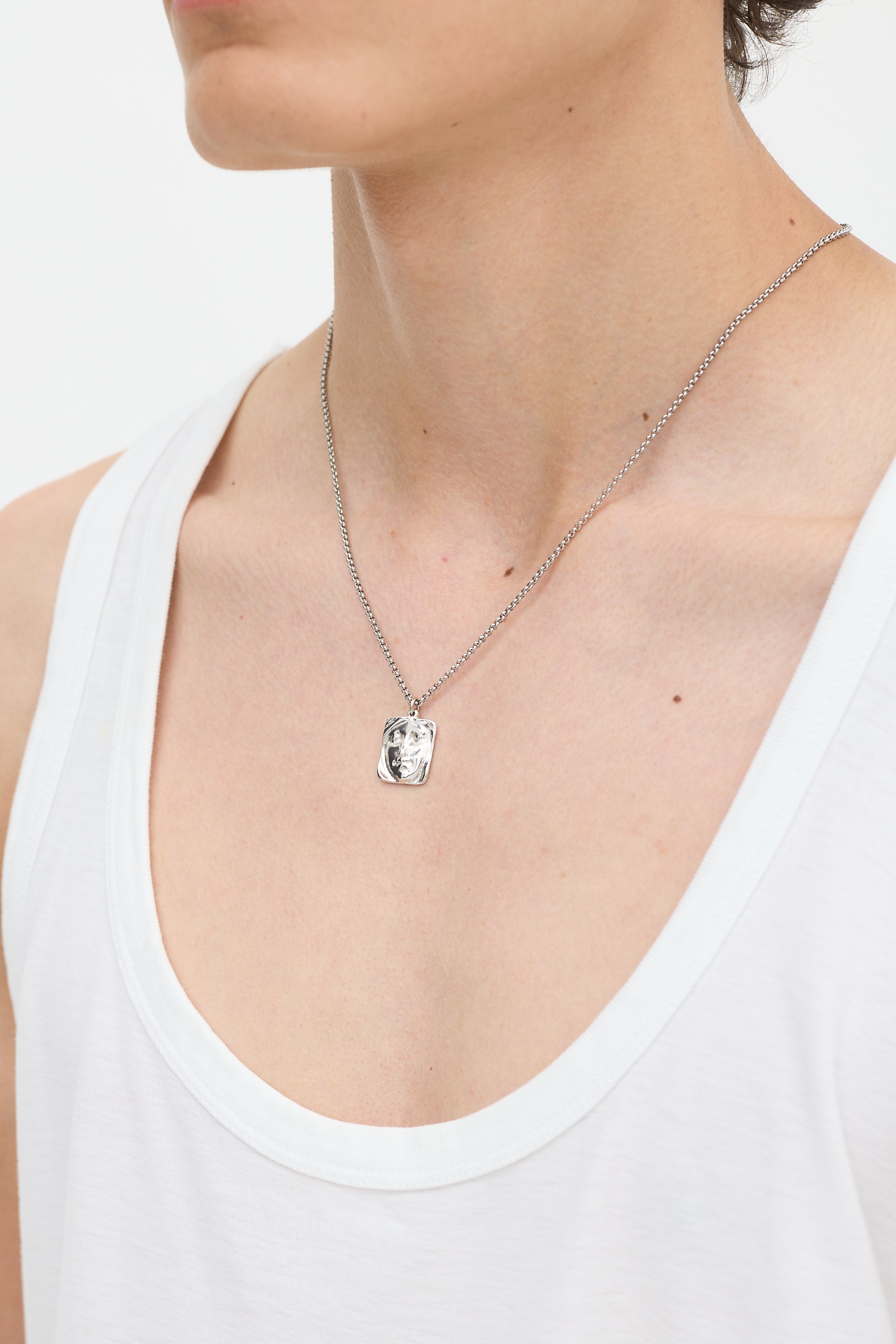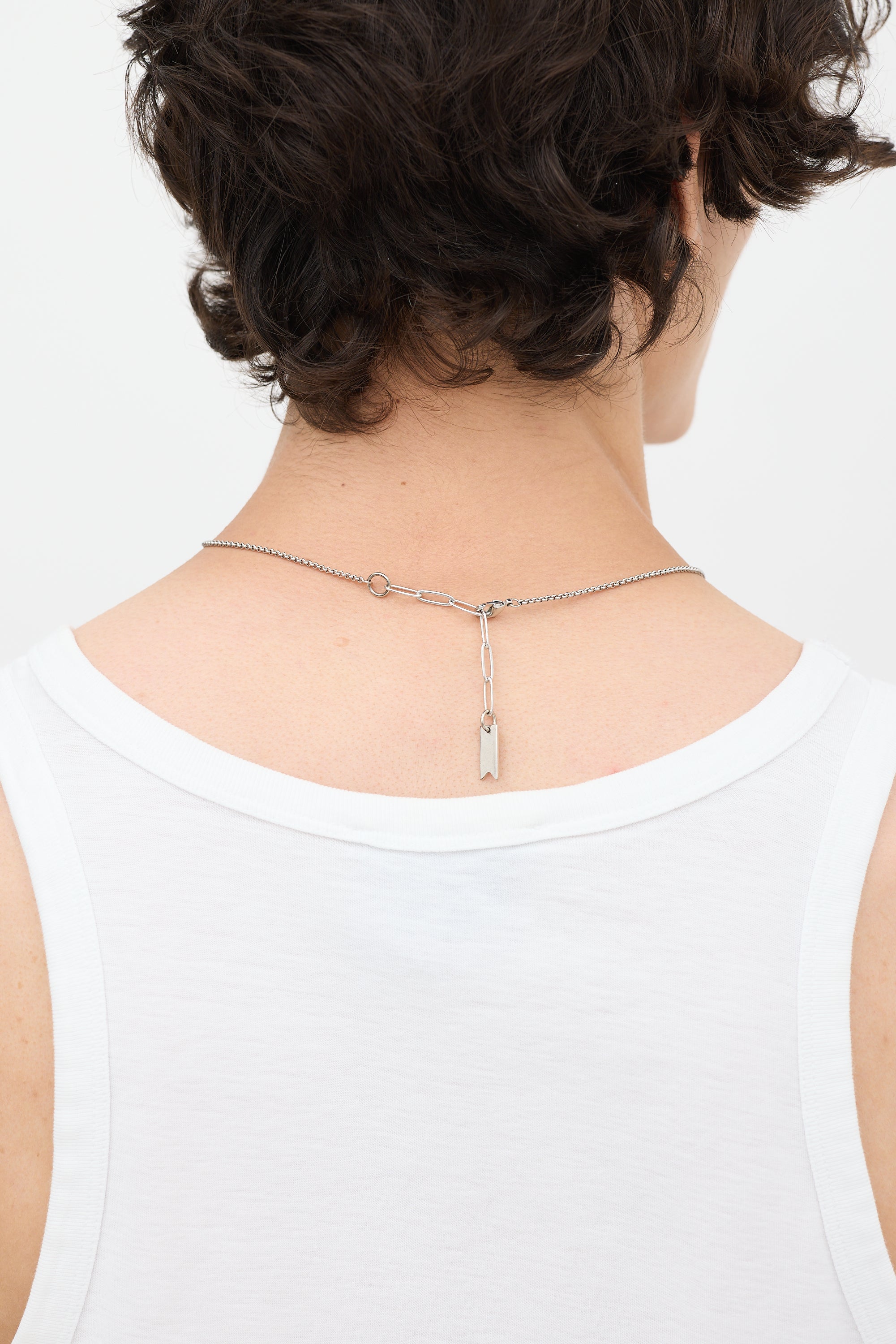 Pre-owned Biko silver tone necklace featuring a rolo chain with extension and debossed logo charm at end, lobster clasp, and square face motif pendant.