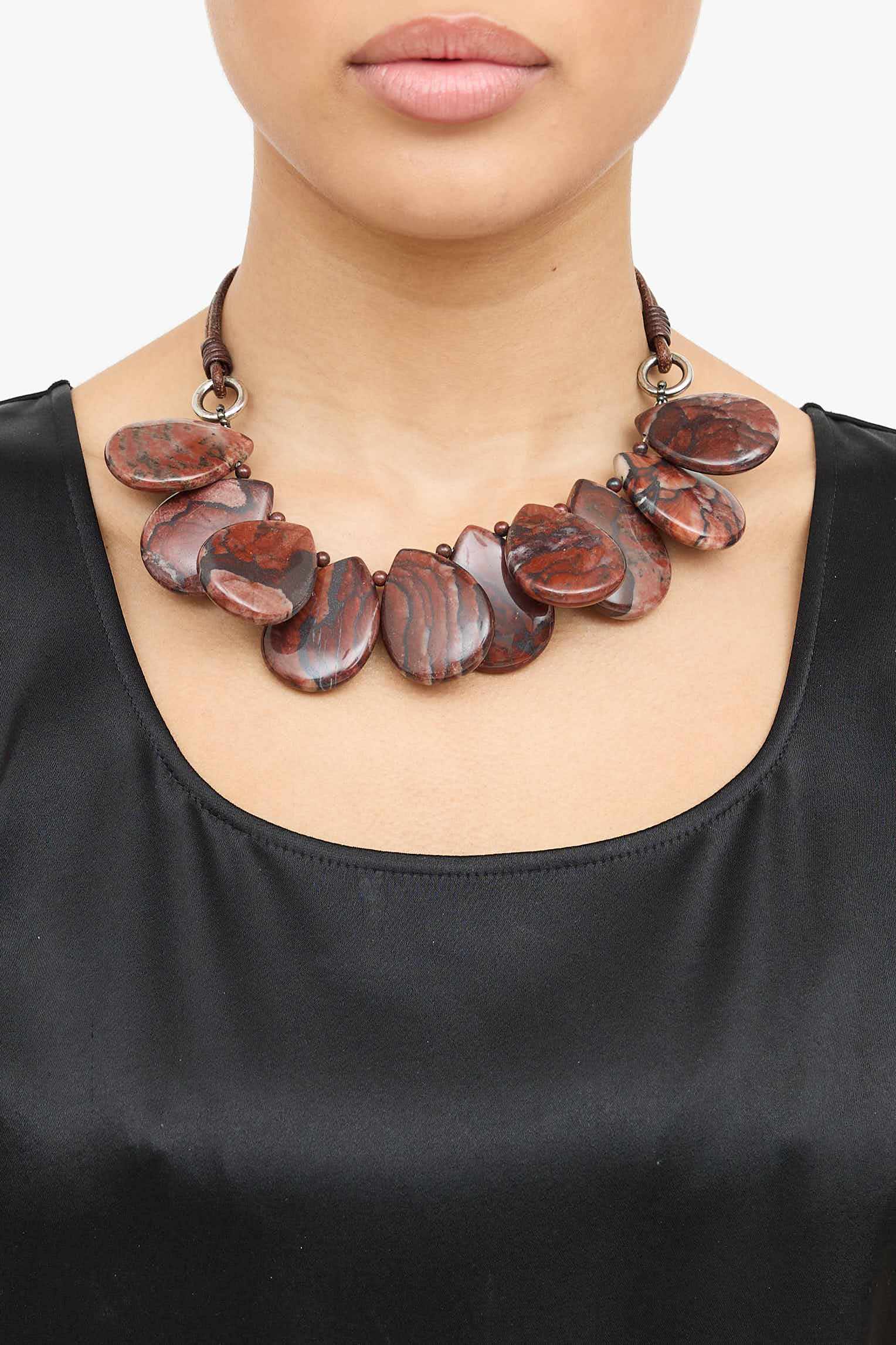 Pre-owned Brunello Cucinelli collar necklace featuring red teardrop Jasper beads, silver tone hardware, brown leather cord, and toggle closure.