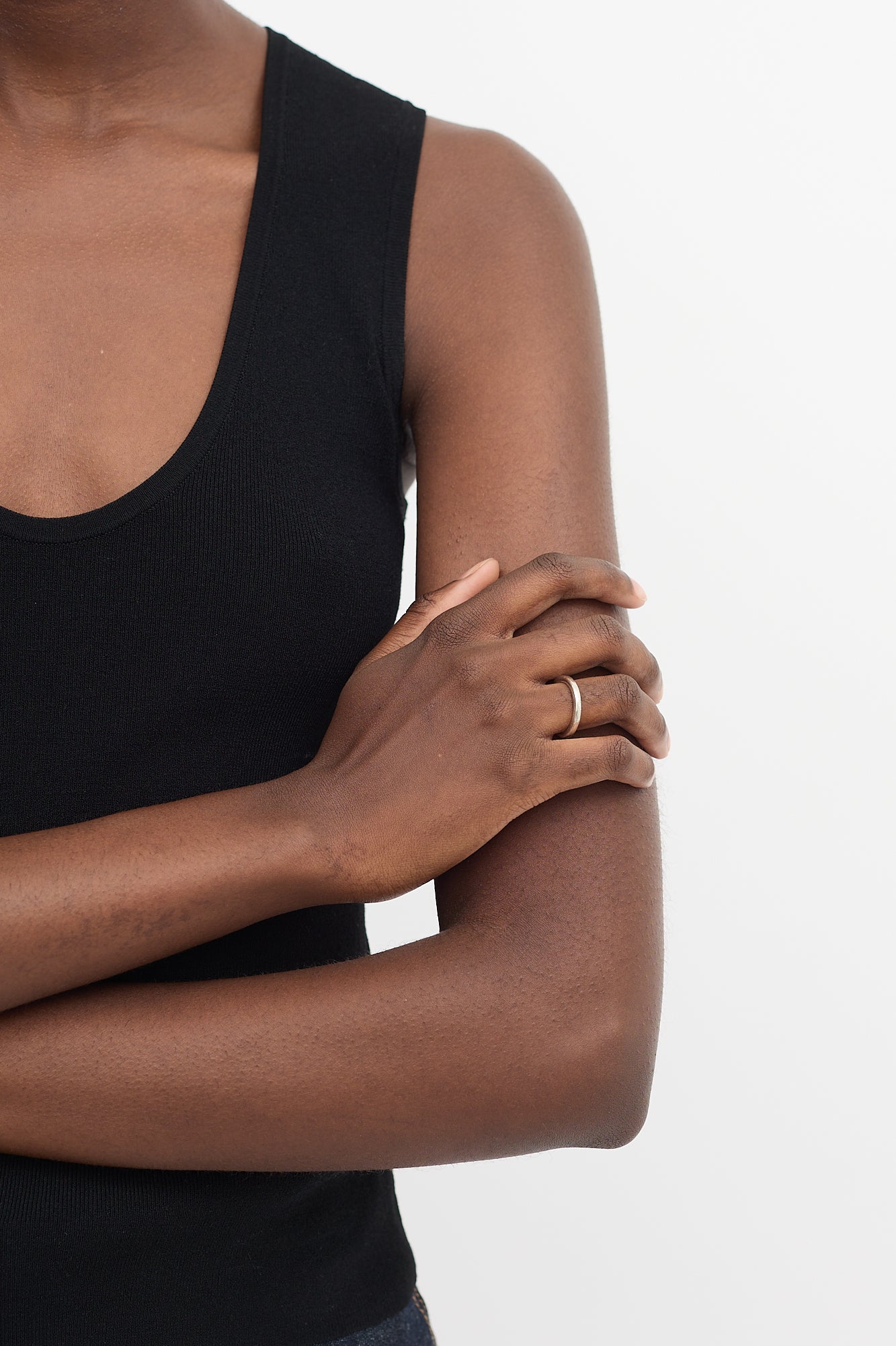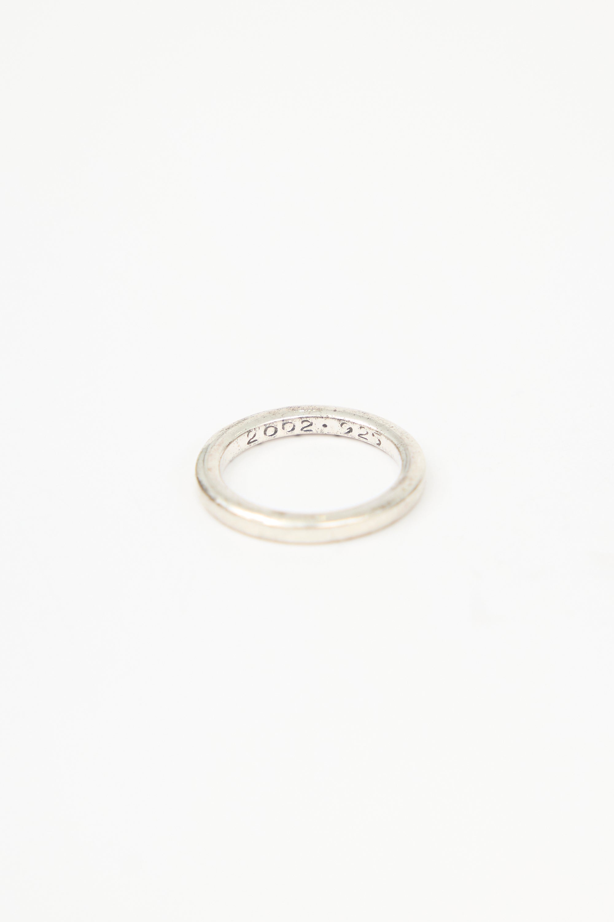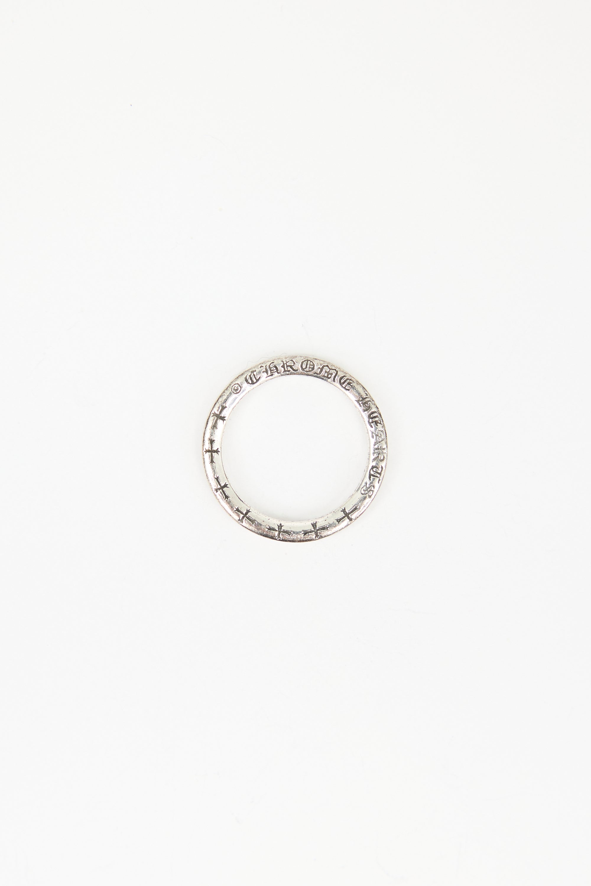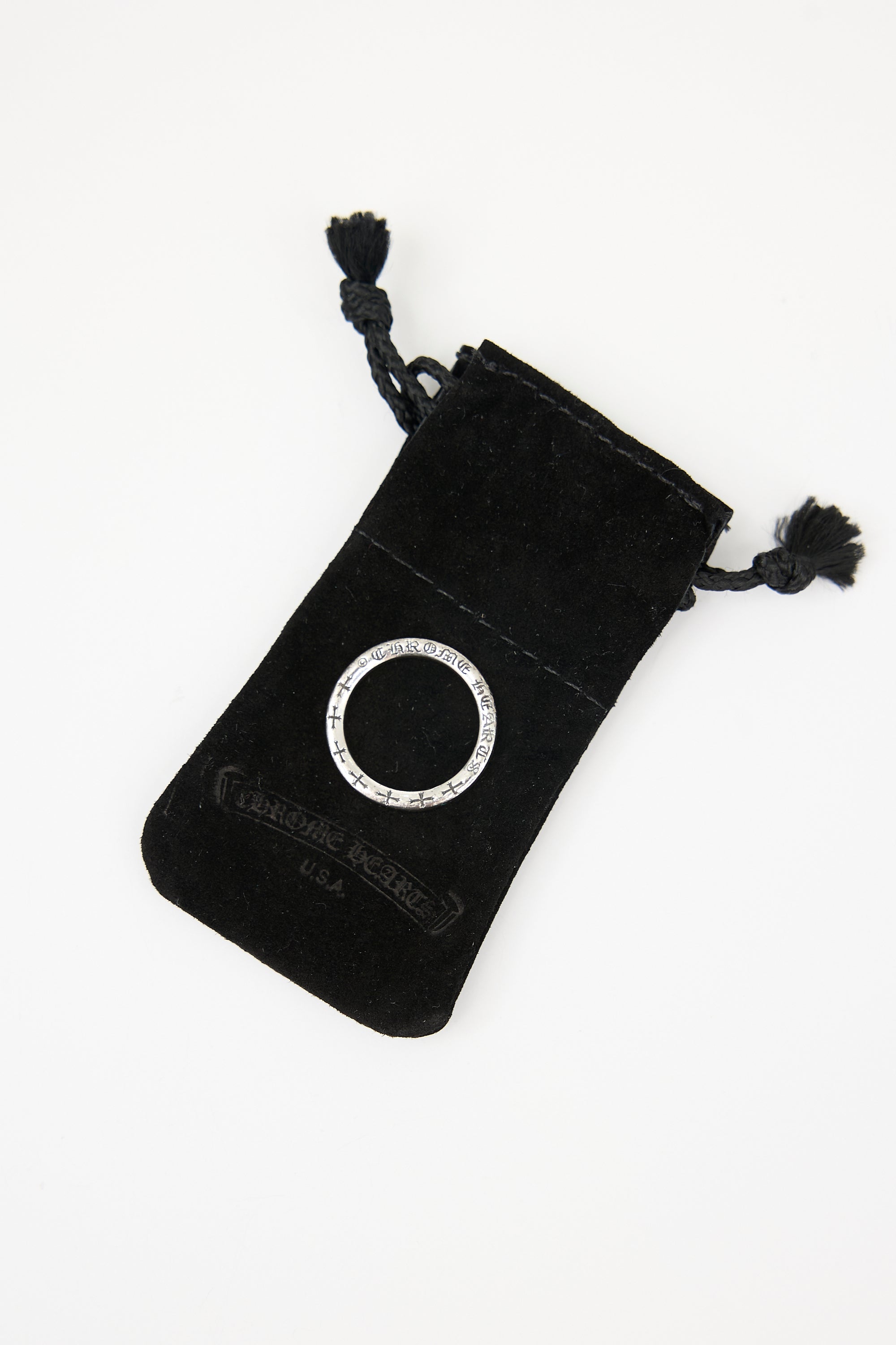 Pre-owned Chrome Hearts sterling silver ring featuring logo and cross engraving at bottom band. Includes original dust bag.