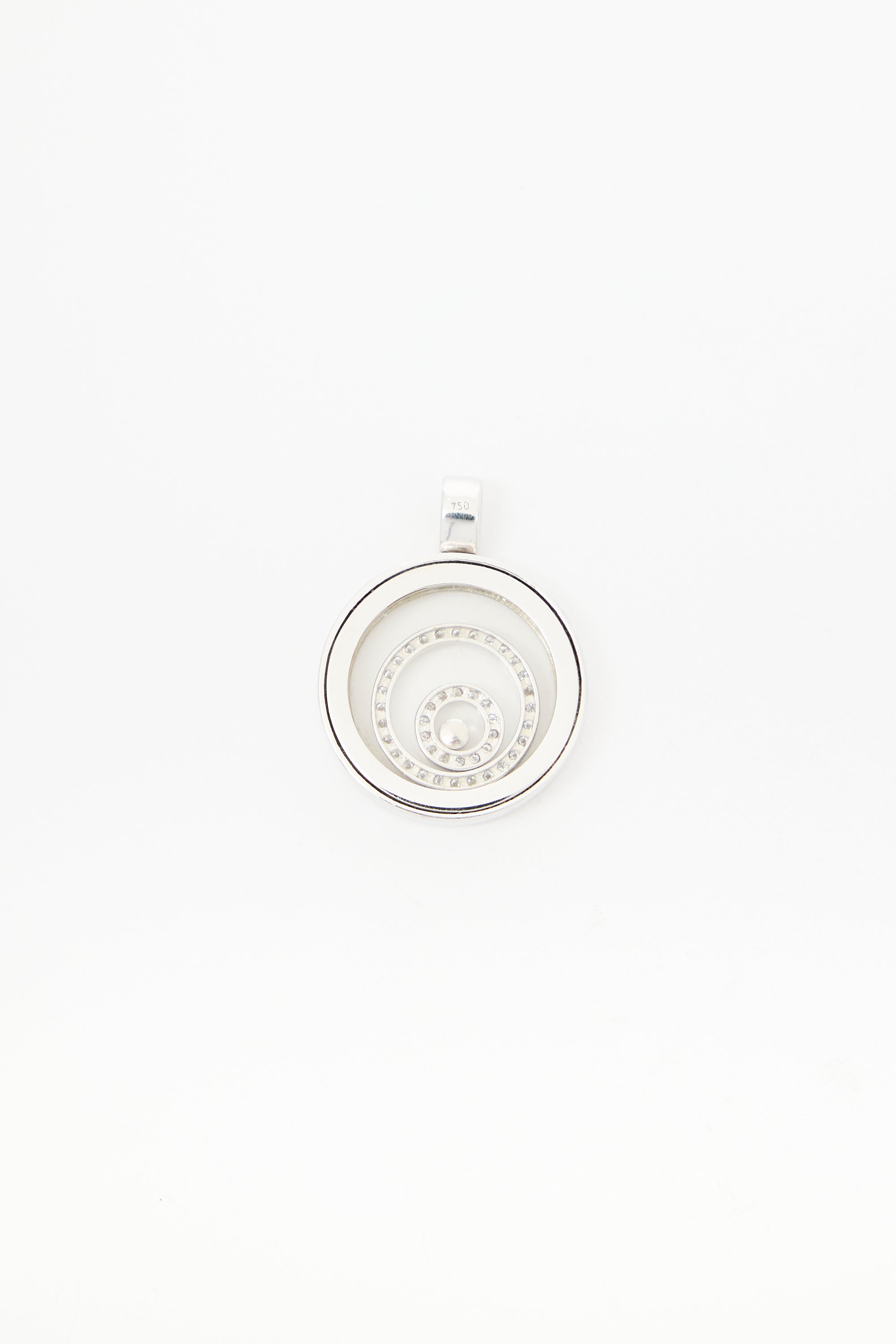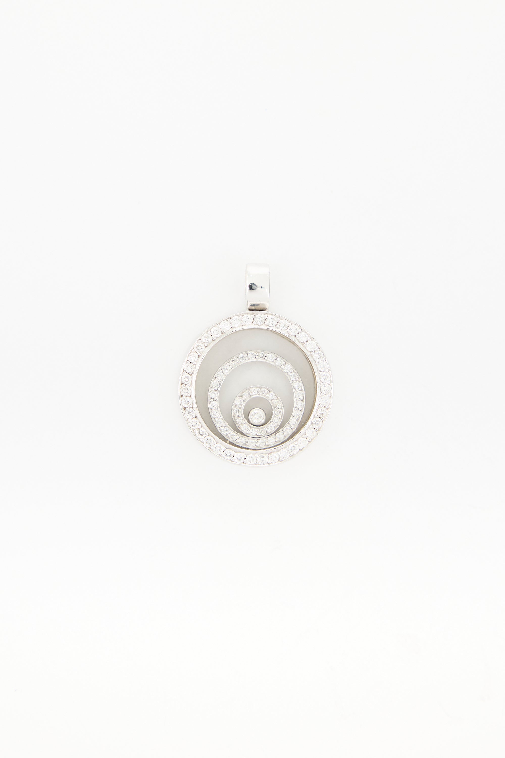 Pre-owned 18K white gold pendant featuring 80 round brilliant cut natural diamonds, pave setting, and circle motif. Includes certificate of appraisal.