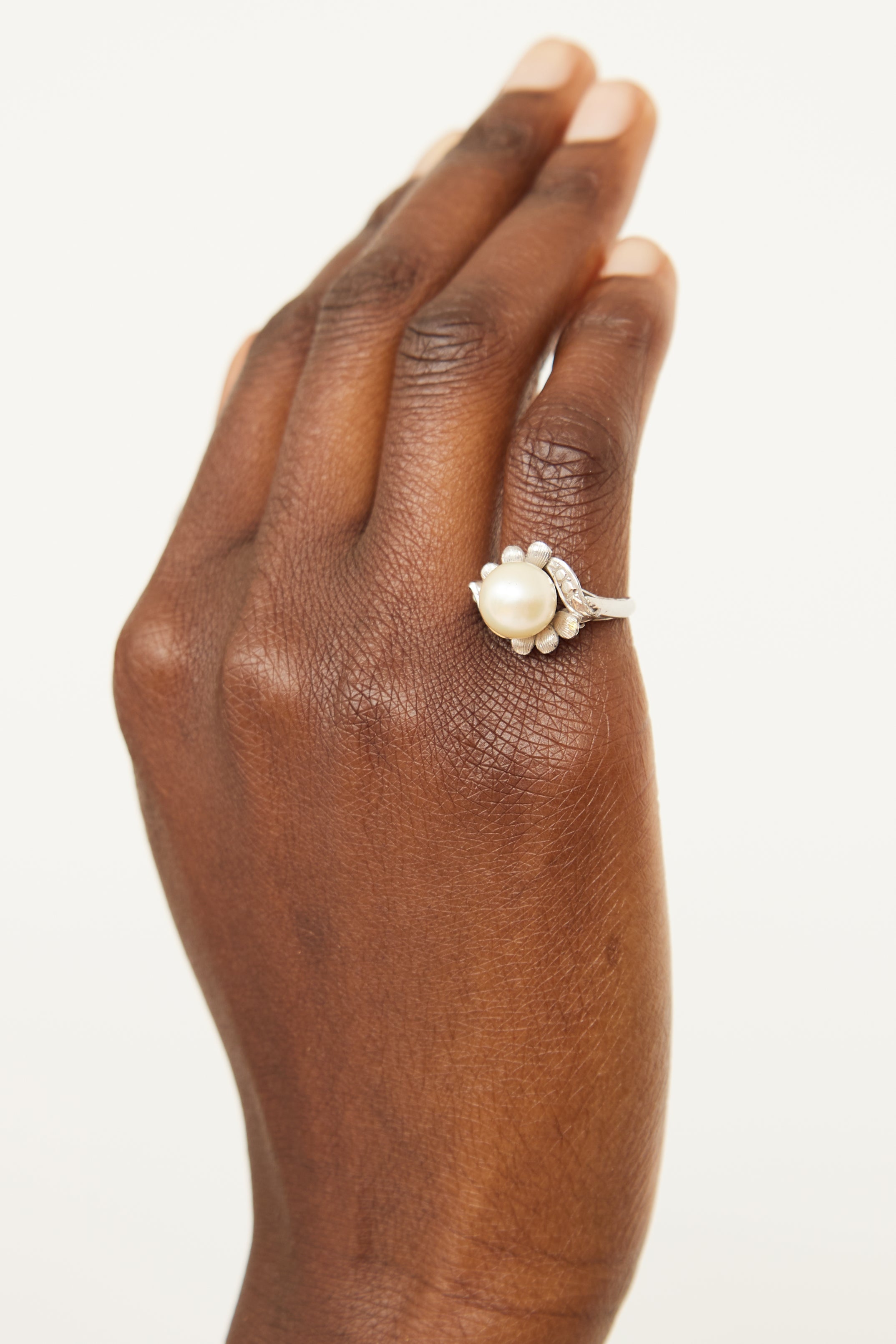 Pre-owned Fine Jewelry white gold and pearl ring featuring 18K white gold band, floral carved design at top and round Akoya Cultured pearl at centre.