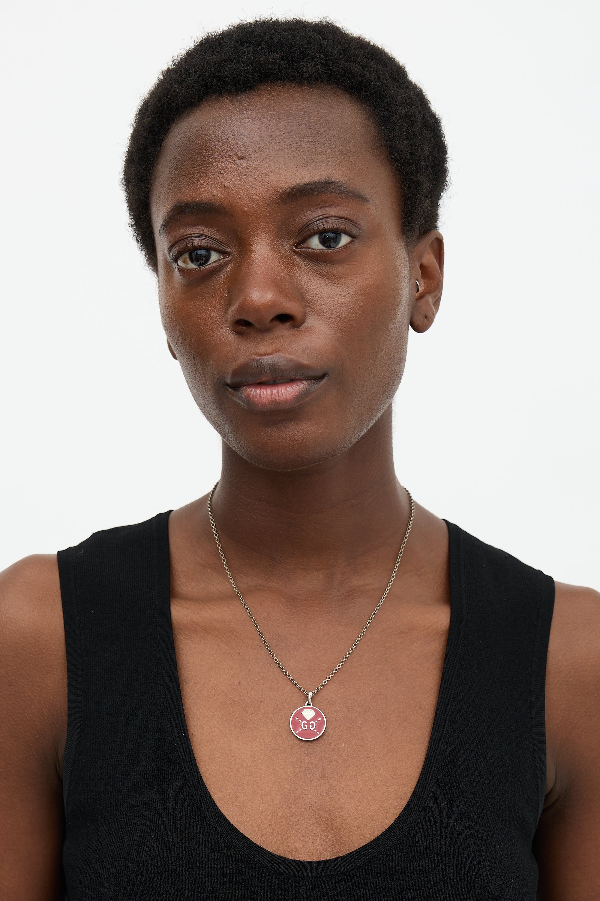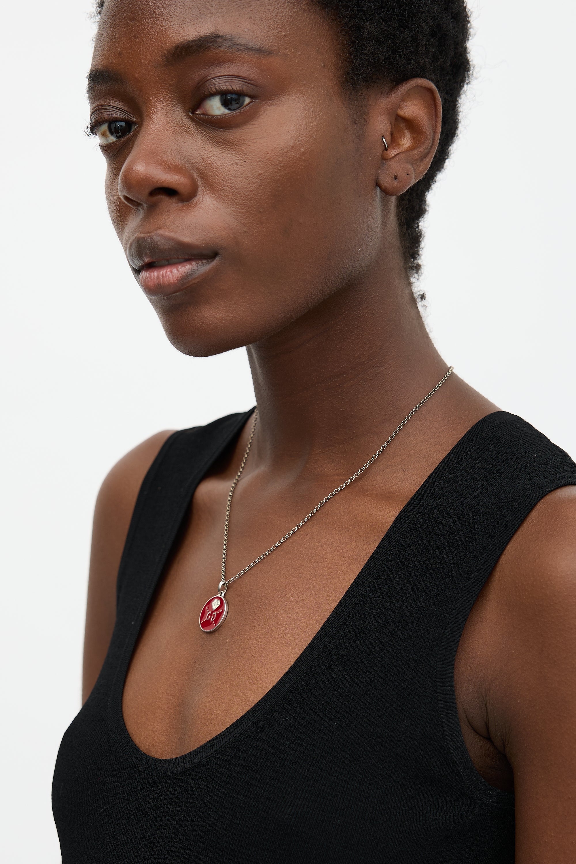 Pre-owned Gucci Ghost necklace featuring a silver tone rolo chain with lobster clasp closure and a red pendant with GG logo, diamond motif, and GG monogram reverse. Comes with original case.