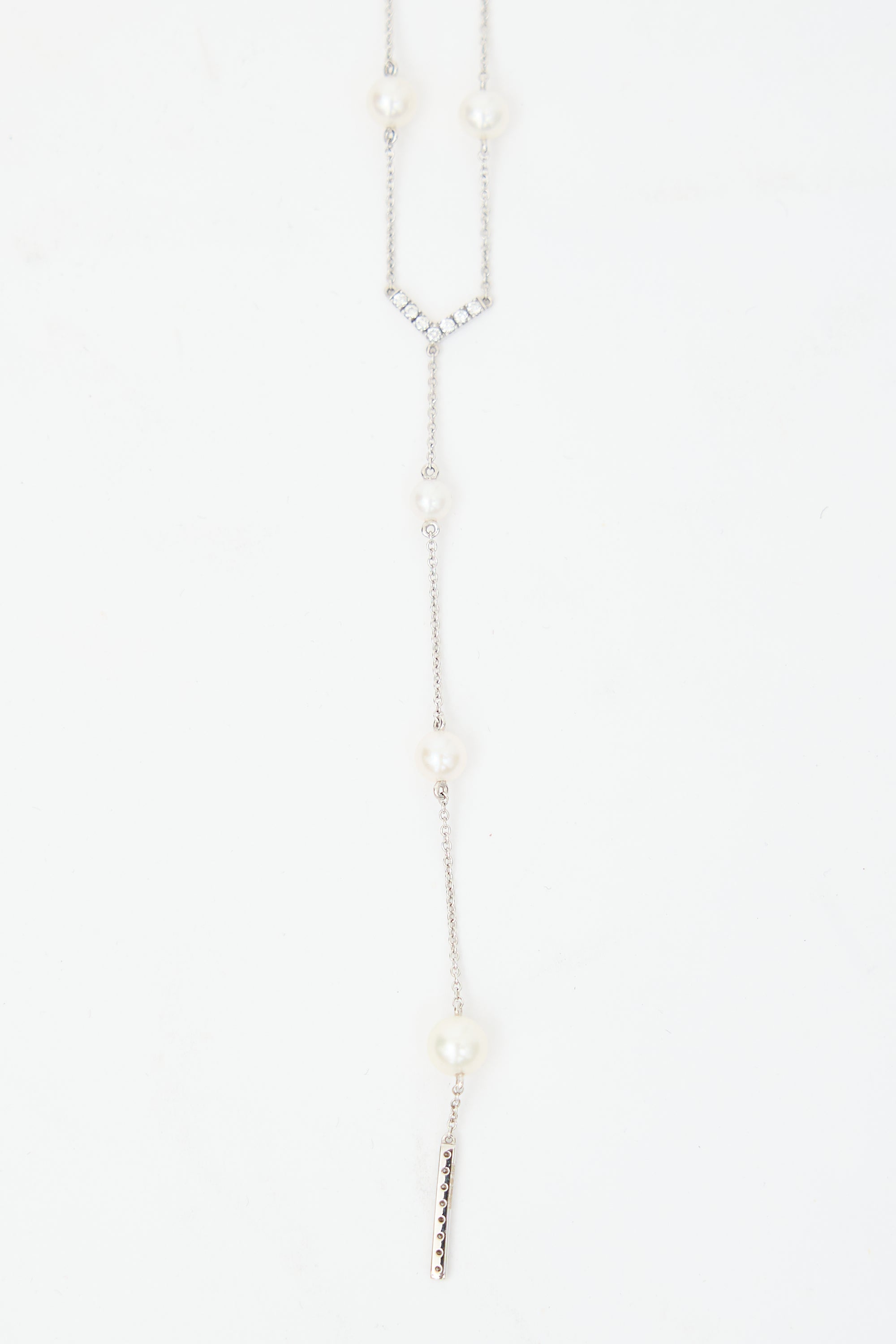 Pre-owned Yoko London V necklace featuring adjustable 18K white gold chain, drop design, eight freshwater pearls, VS diamond pavé accents, Y logo charm at one end, and lobster clasp closure. Comes with original box, wooden case, and certificate of authenticity card.