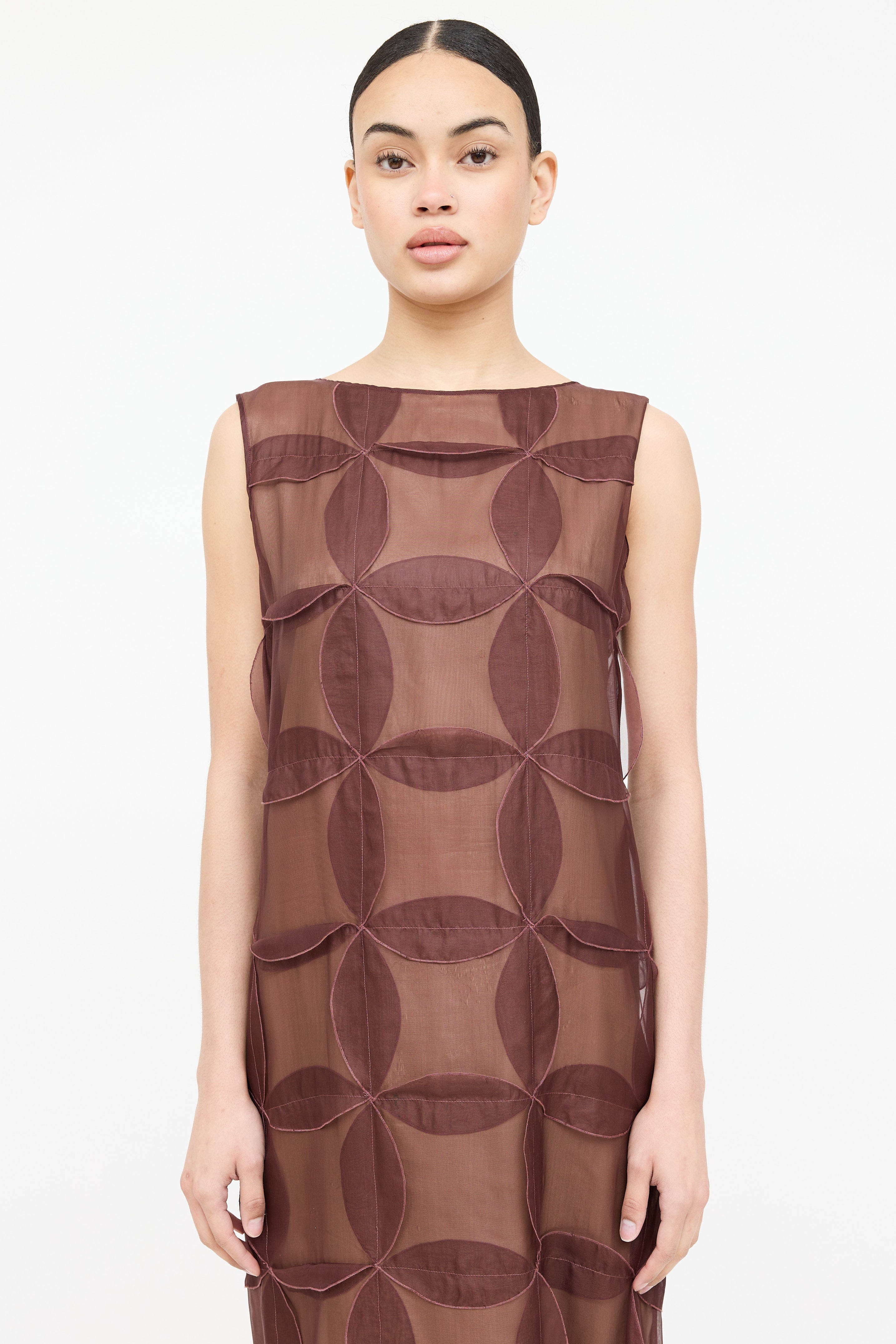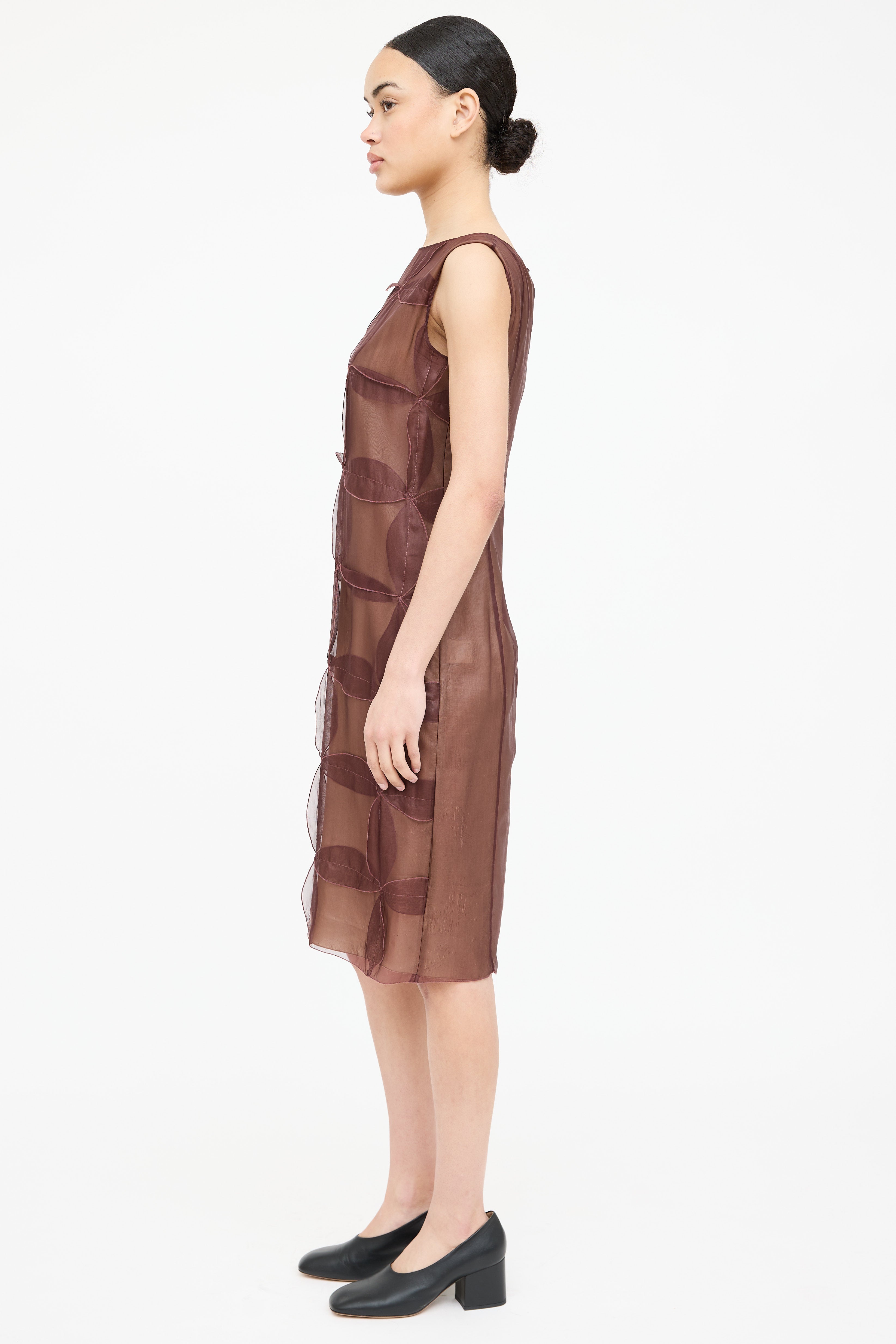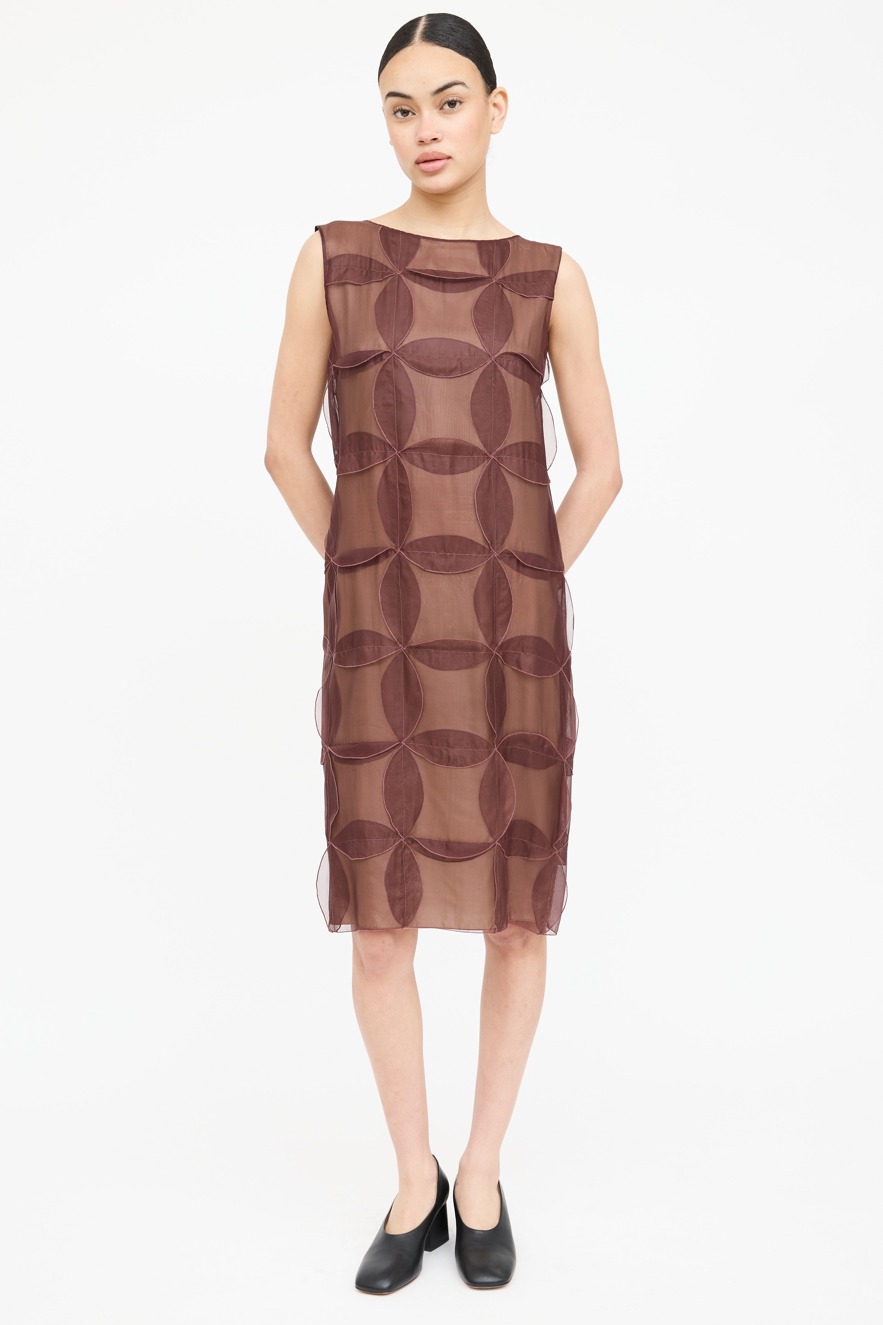 Pre-owned Jil Sander brown silk sleeveless midi dress featuring a round neckline, tonal circular applique detailing, and zip at side with hook and eye closure. Lined.